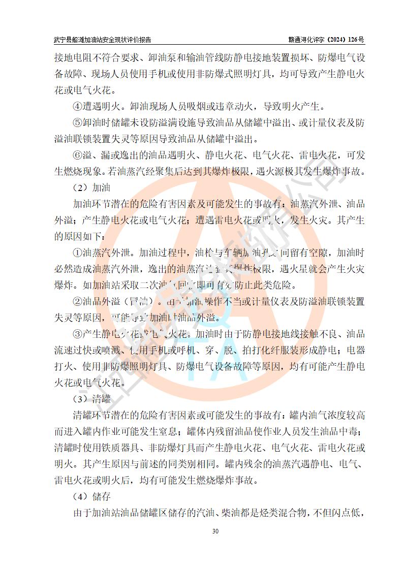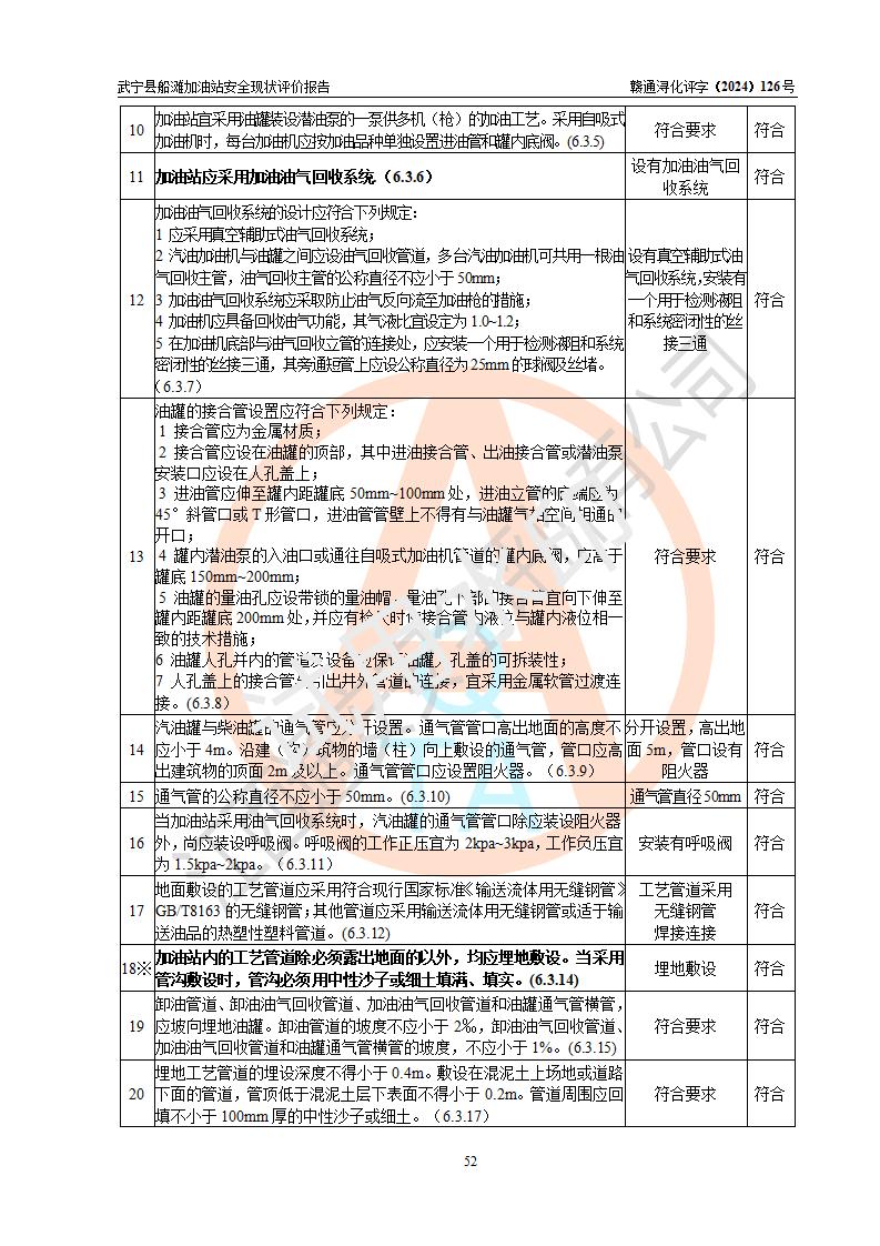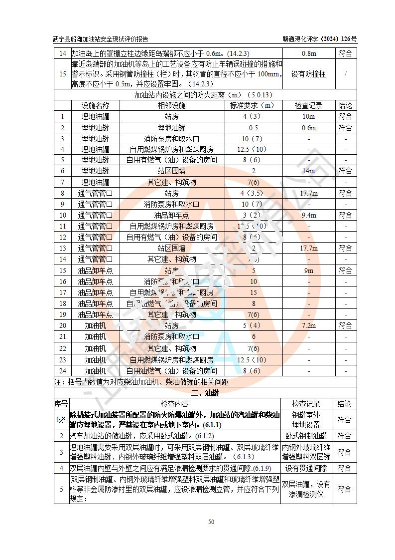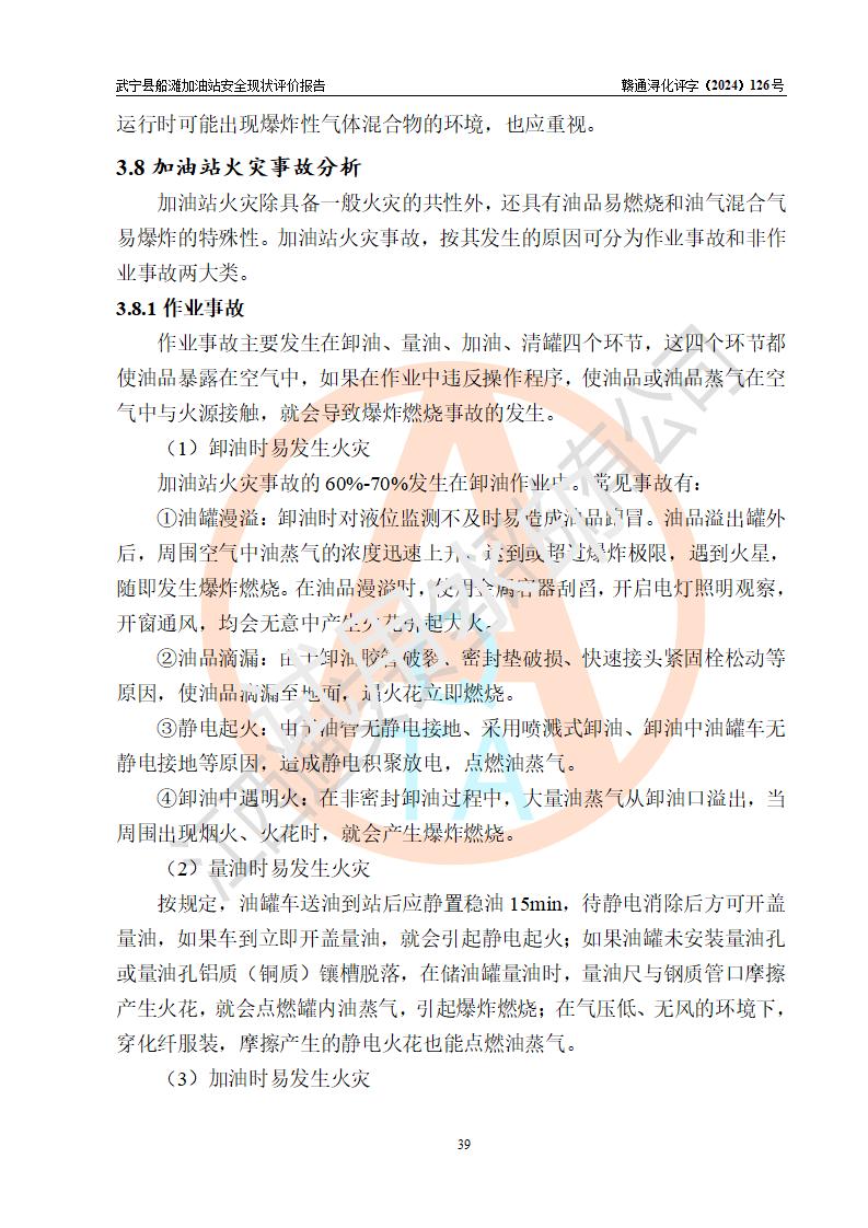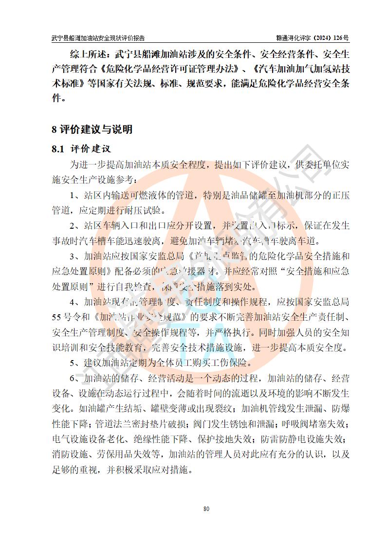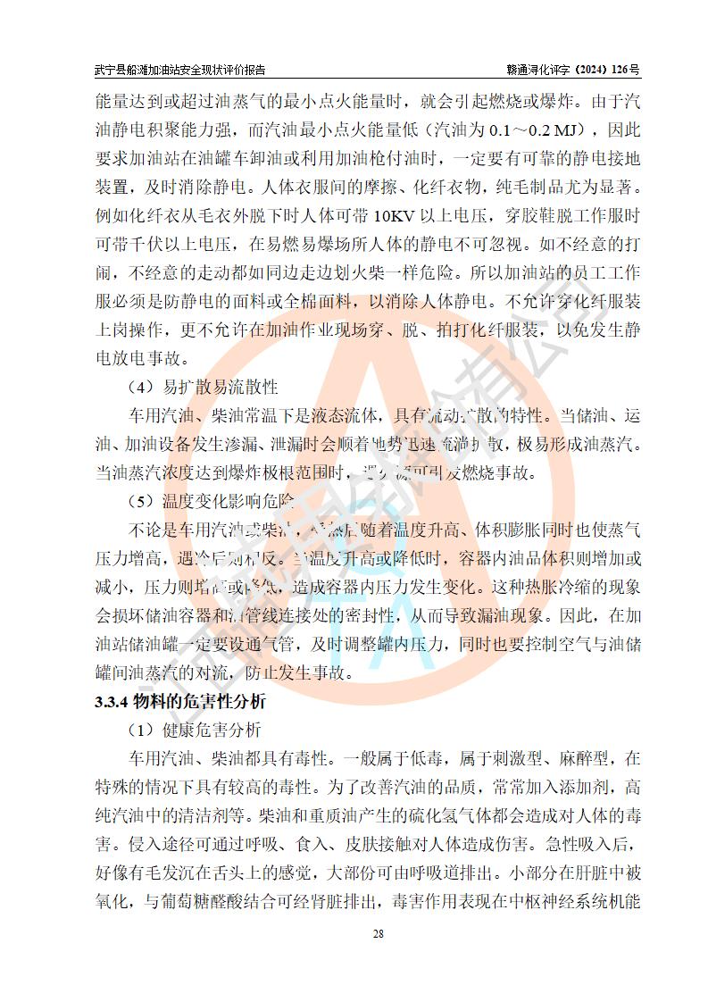 評價(jià)結(jié)論 | 武寧縣船灘加油站涉及的安全條件、安全經(jīng)營條件、安全生產(chǎn)管理符合《危險(xiǎn)化學(xué)品經(jīng)營許可證管理辦法》、《汽車加油加氣加氫站技術(shù)標(biāo)準(zhǔn)》等**有關(guān)法規(guī)、標(biāo)準(zhǔn)、規(guī)范要求,能滿足危險(xiǎn)化學(xué)品經(jīng)營安全條件。 | |||