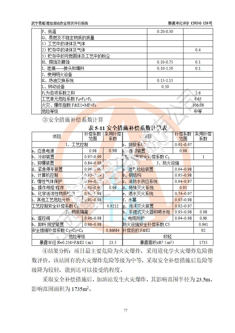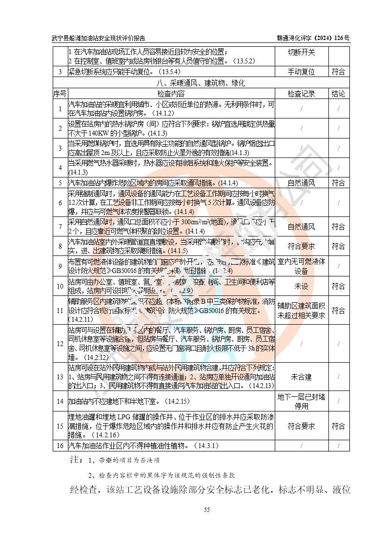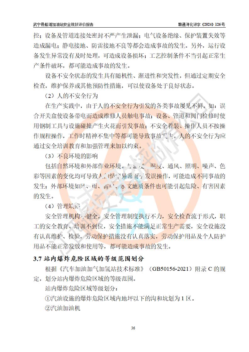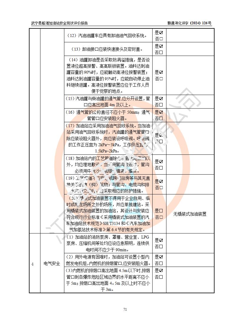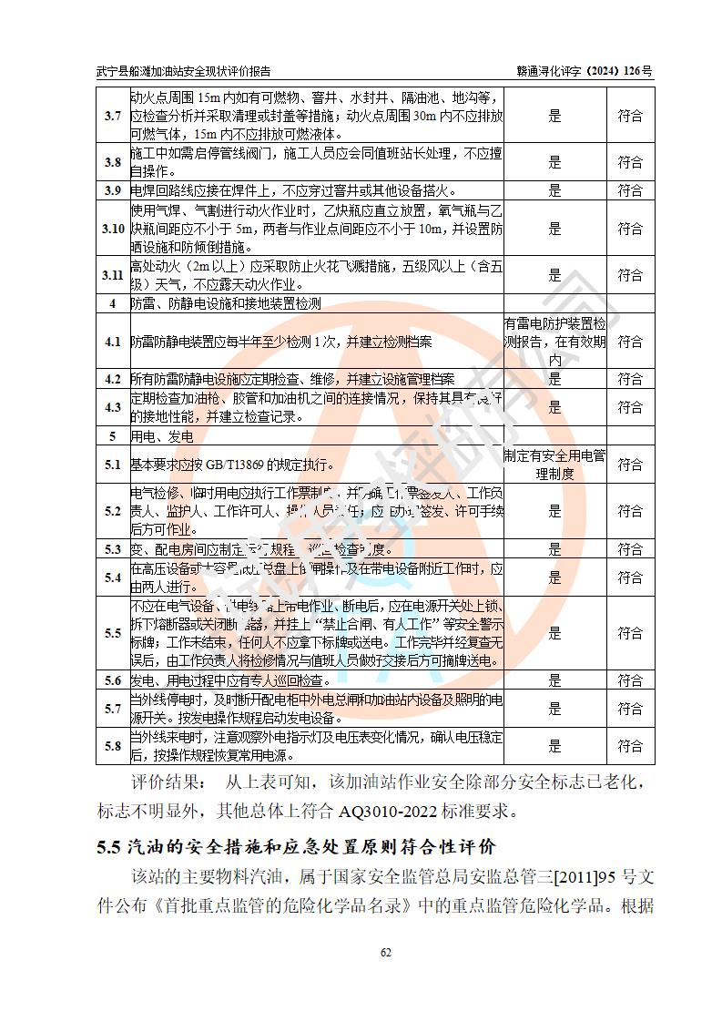 評價(jià)結(jié)論 | 武寧縣船灘加油站涉及的安全條件、安全經(jīng)營條件、安全生產(chǎn)管理符合《危險(xiǎn)化學(xué)品經(jīng)營許可證管理辦法》、《汽車加油加氣加氫站技術(shù)標(biāo)準(zhǔn)》等**有關(guān)法規(guī)、標(biāo)準(zhǔn)、規(guī)范要求,能滿足危險(xiǎn)化學(xué)品經(jīng)營安全條件。 | |||