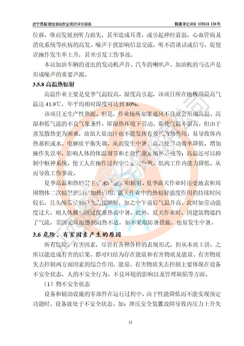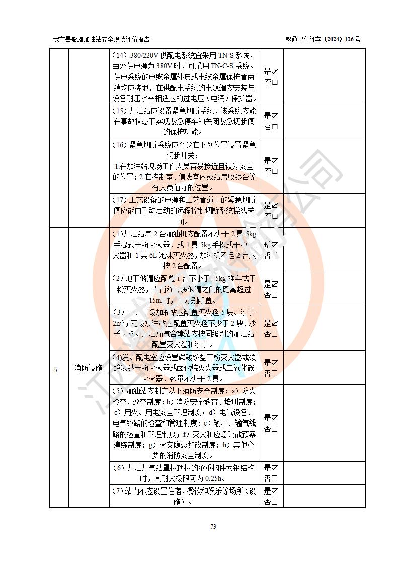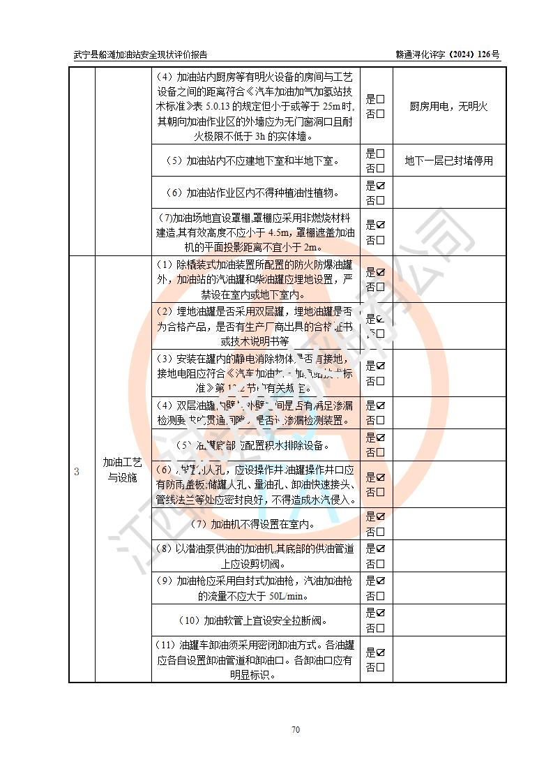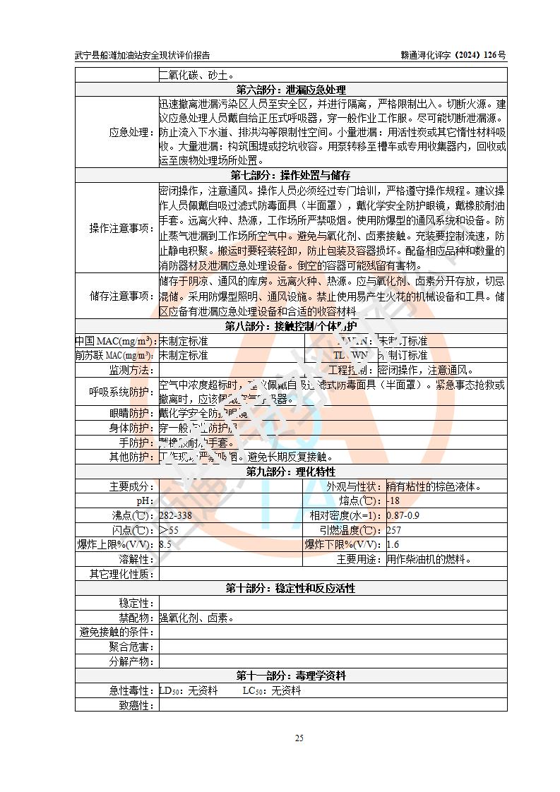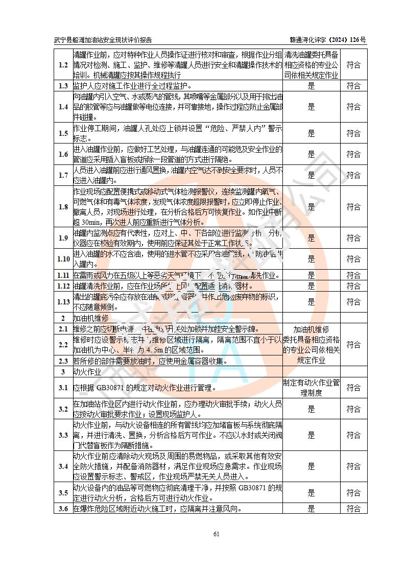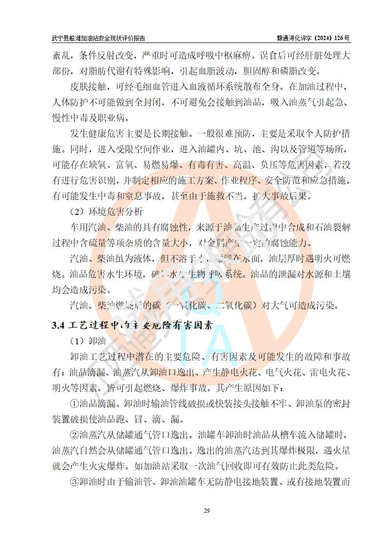 評價(jià)結(jié)論 | 武寧縣船灘加油站涉及的安全條件、安全經(jīng)營條件、安全生產(chǎn)管理符合《危險(xiǎn)化學(xué)品經(jīng)營許可證管理辦法》、《汽車加油加氣加氫站技術(shù)標(biāo)準(zhǔn)》等**有關(guān)法規(guī)、標(biāo)準(zhǔn)、規(guī)范要求,能滿足危險(xiǎn)化學(xué)品經(jīng)營安全條件。 | |||