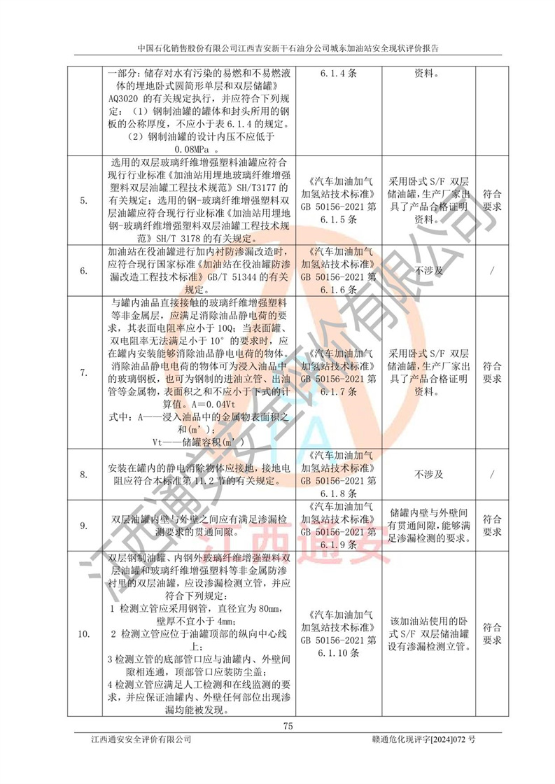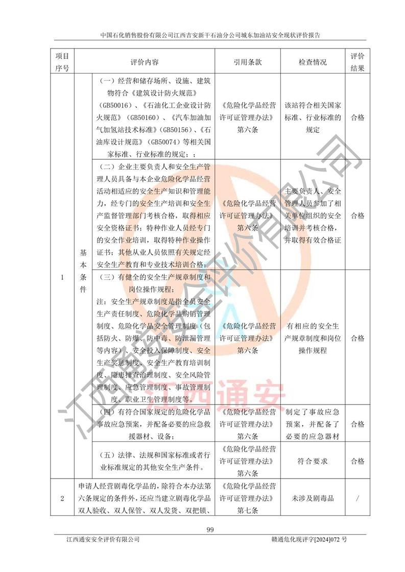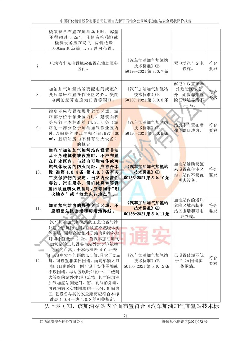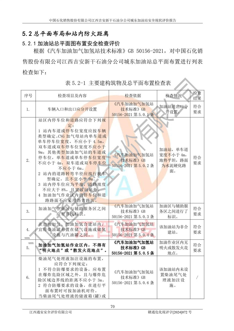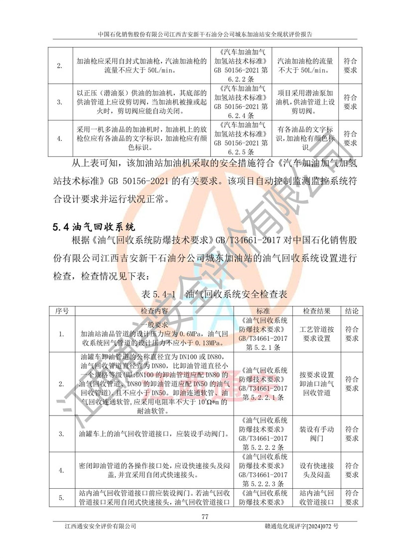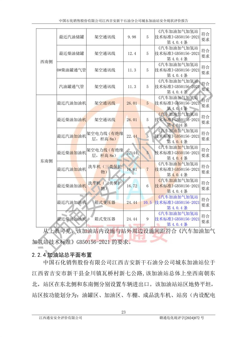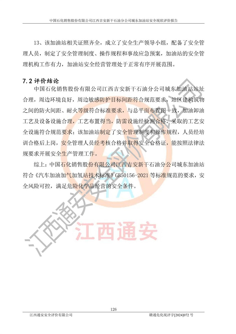 評價(jià)結(jié)論 | 中國石化銷售股份有限公司江西吉安新干石油分公司城東加油站符合《汽車加油加氣加氫站技術(shù)標(biāo)準(zhǔn)》GB50156-2021等標(biāo)準(zhǔn)規(guī)范的要求,安全風(fēng)險(xiǎn)可控,滿足危險(xiǎn)化學(xué)品經(jīng)營的安全條件。 | |||