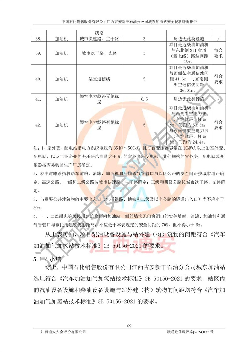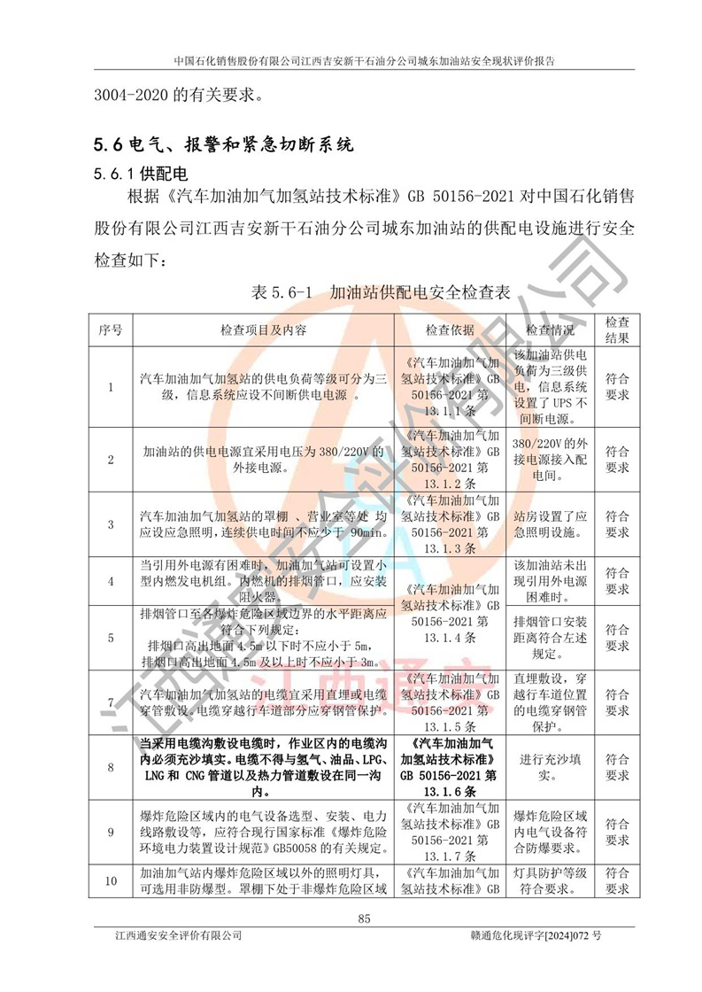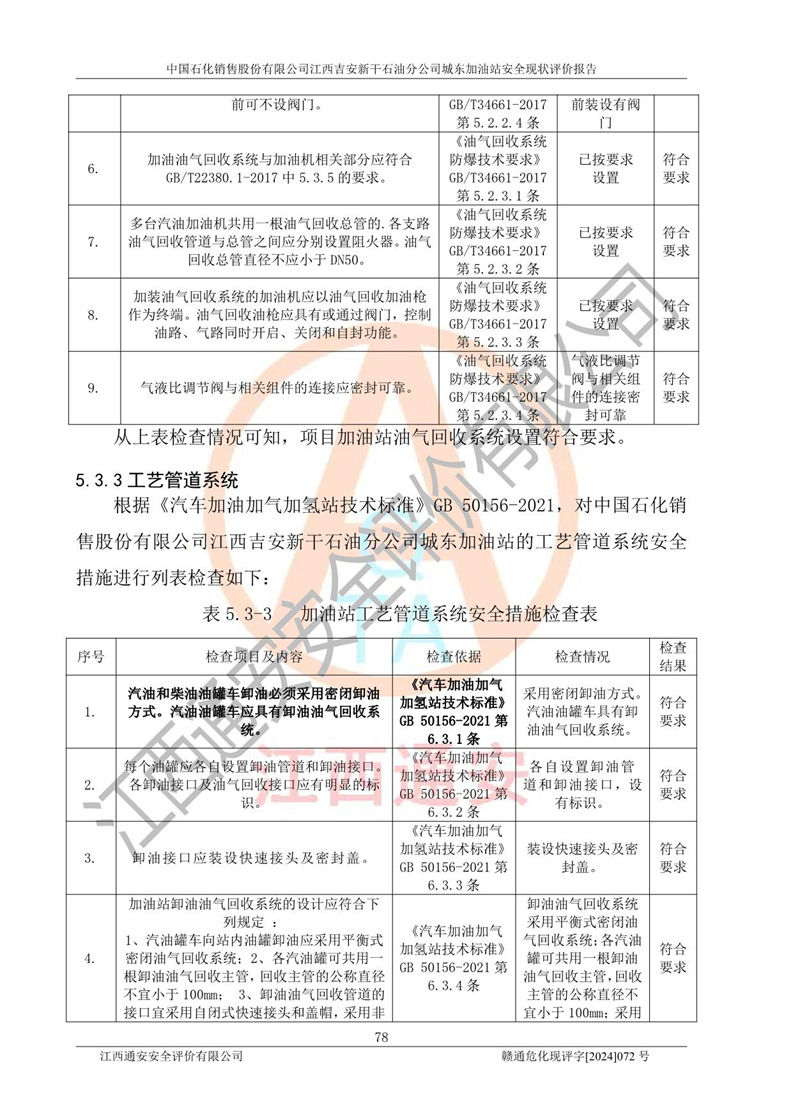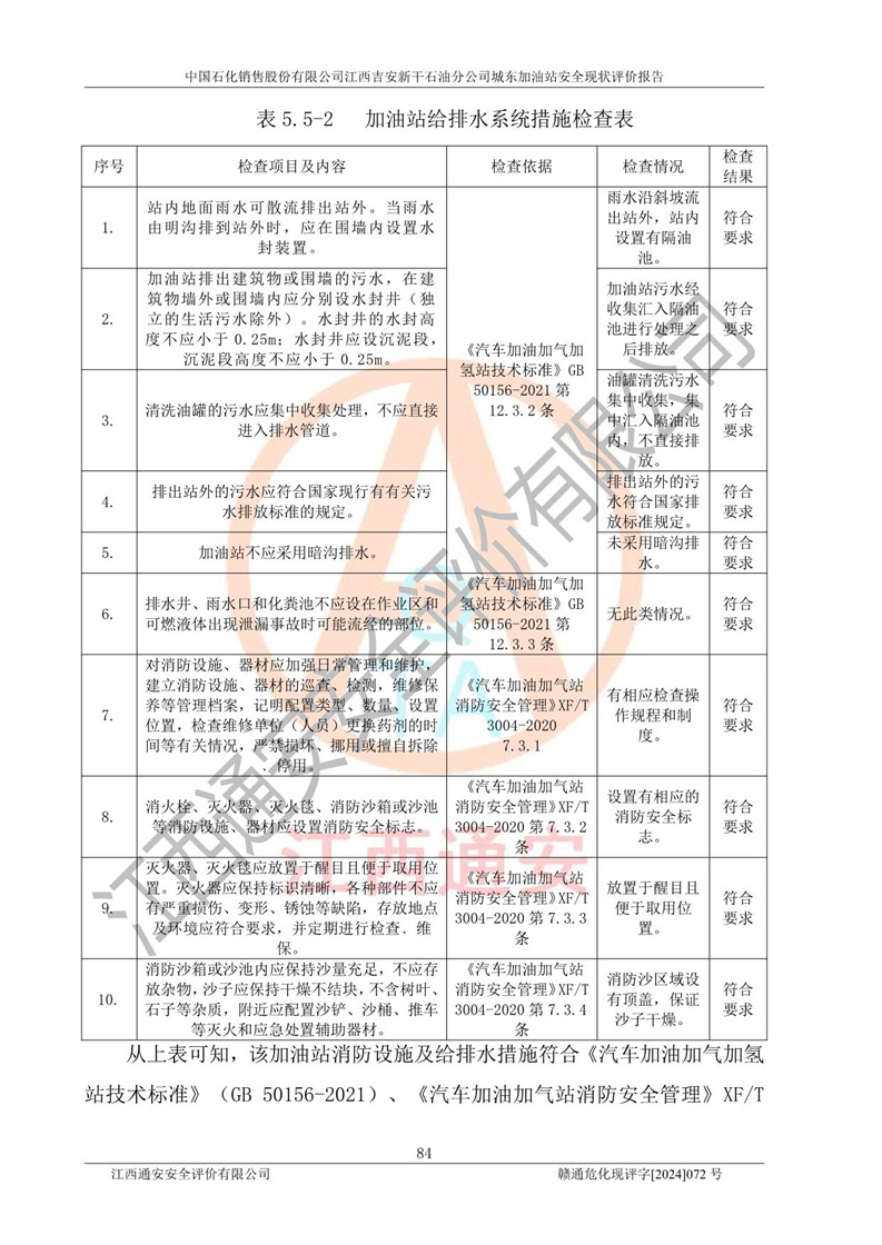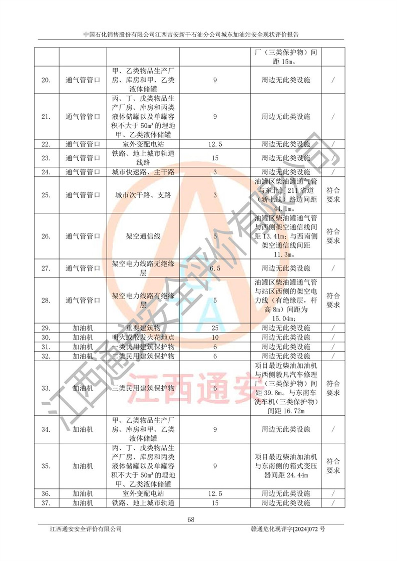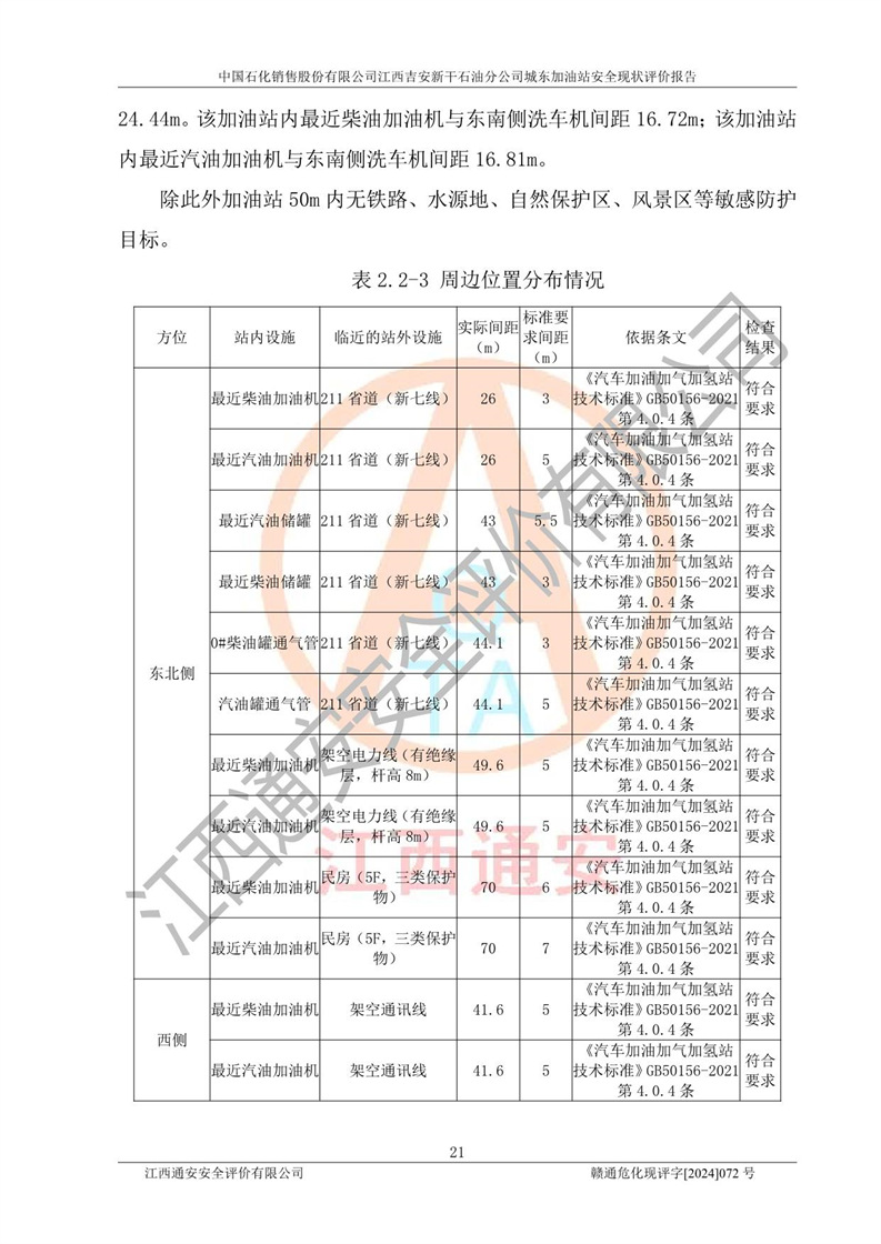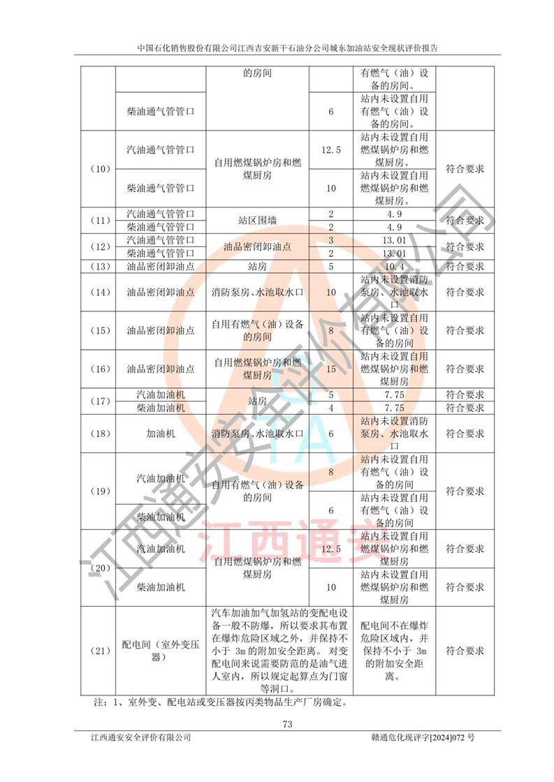 評價(jià)結(jié)論 | 中國石化銷售股份有限公司江西吉安新干石油分公司城東加油站符合《汽車加油加氣加氫站技術(shù)標(biāo)準(zhǔn)》GB50156-2021等標(biāo)準(zhǔn)規(guī)范的要求,安全風(fēng)險(xiǎn)可控,滿足危險(xiǎn)化學(xué)品經(jīng)營的安全條件。 | |||