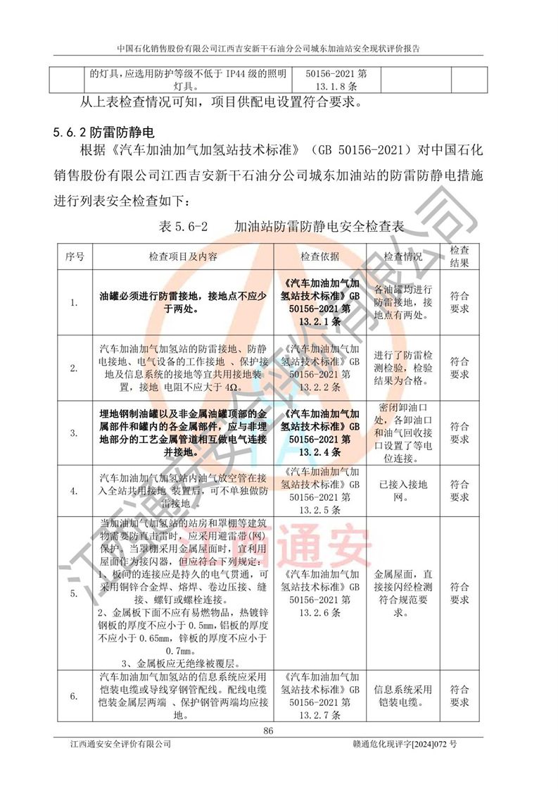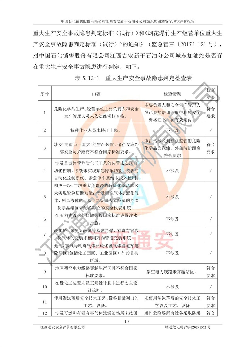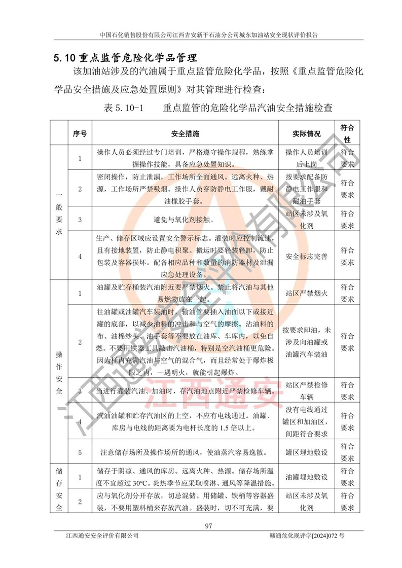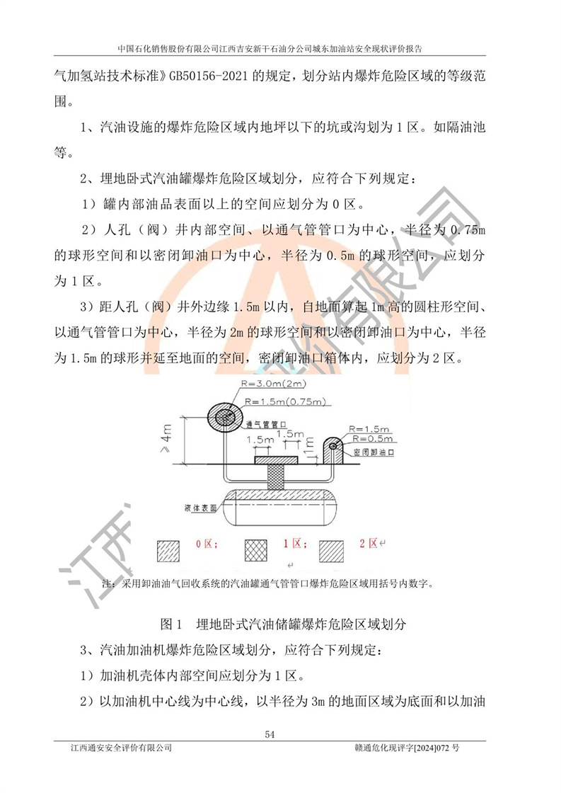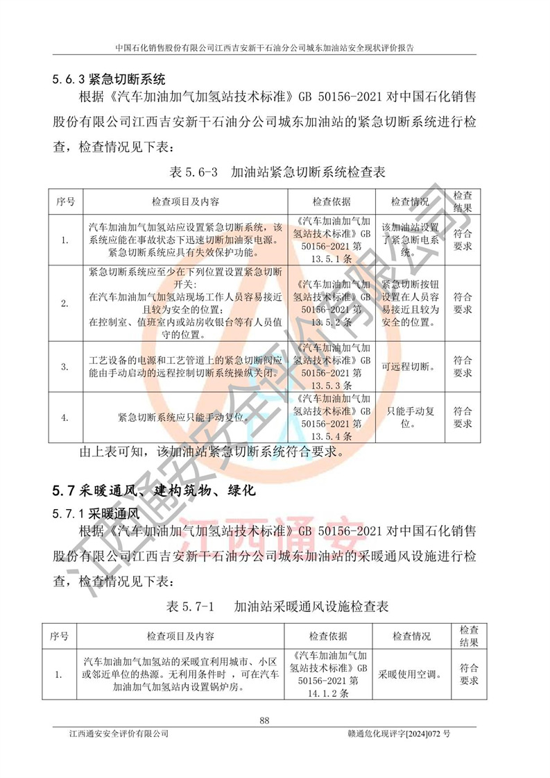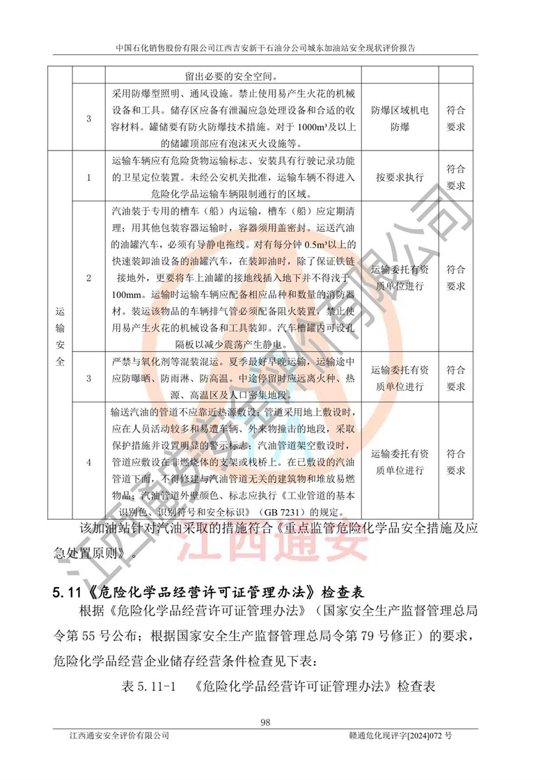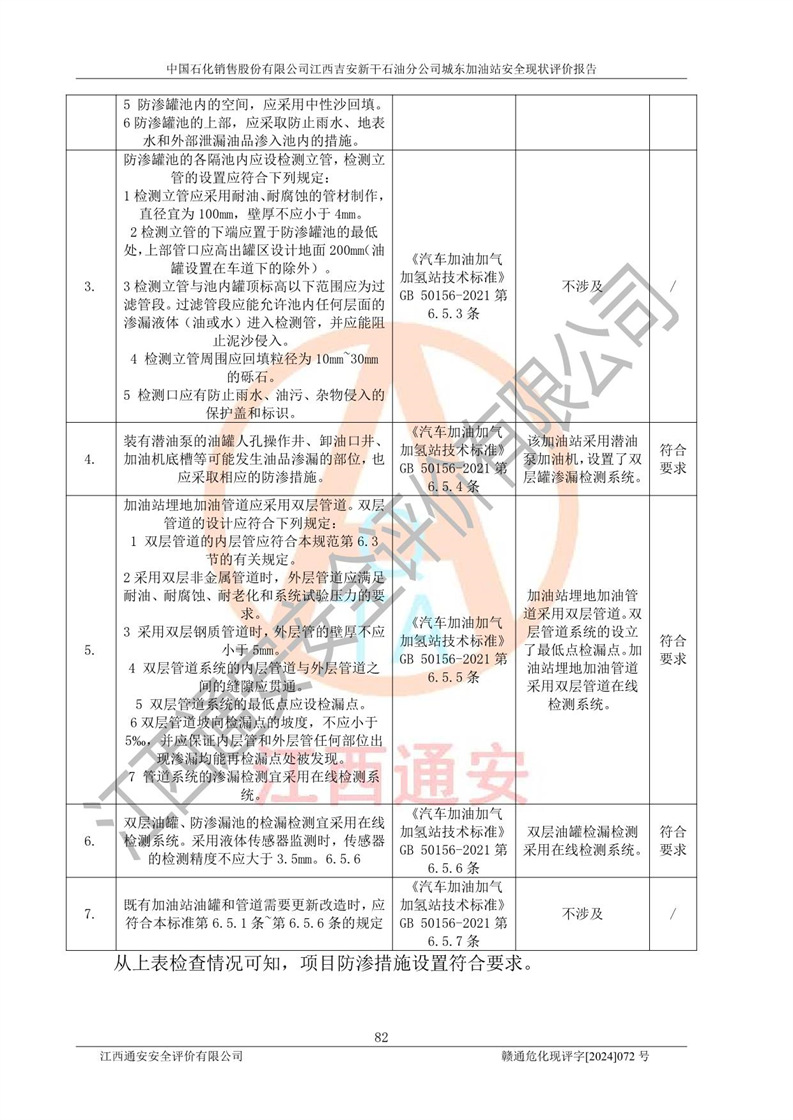 評價(jià)結(jié)論 | 中國石化銷售股份有限公司江西吉安新干石油分公司城東加油站符合《汽車加油加氣加氫站技術(shù)標(biāo)準(zhǔn)》GB50156-2021等標(biāo)準(zhǔn)規(guī)范的要求,安全風(fēng)險(xiǎn)可控,滿足危險(xiǎn)化學(xué)品經(jīng)營的安全條件。 | |||