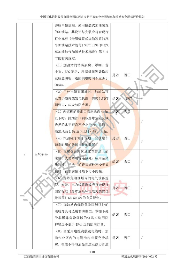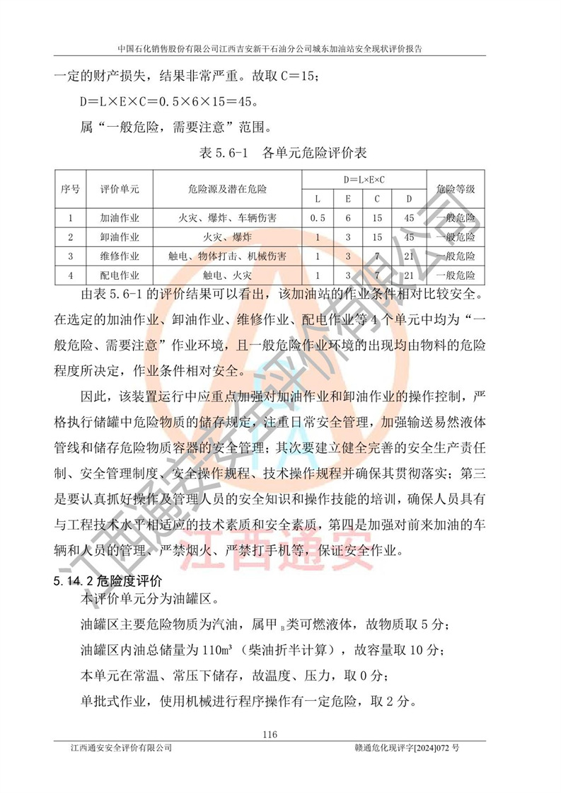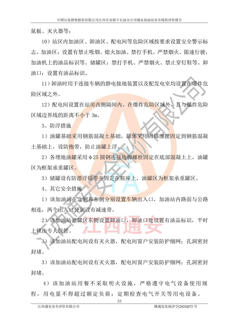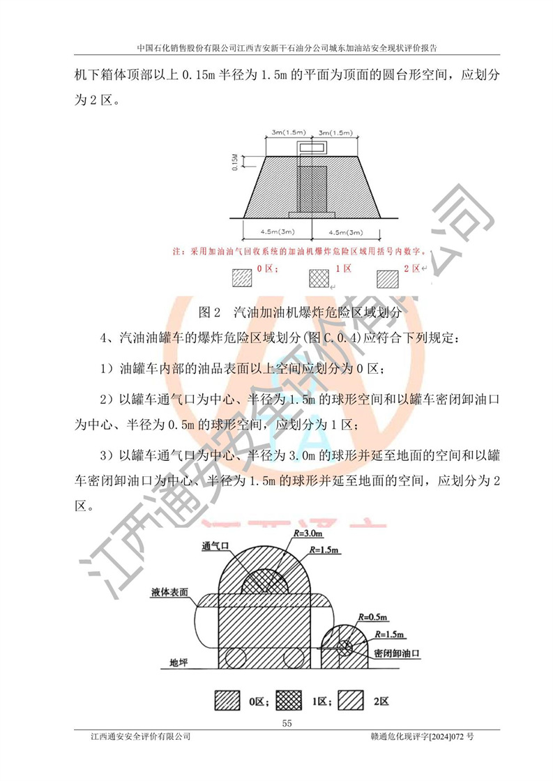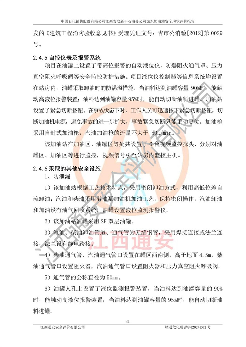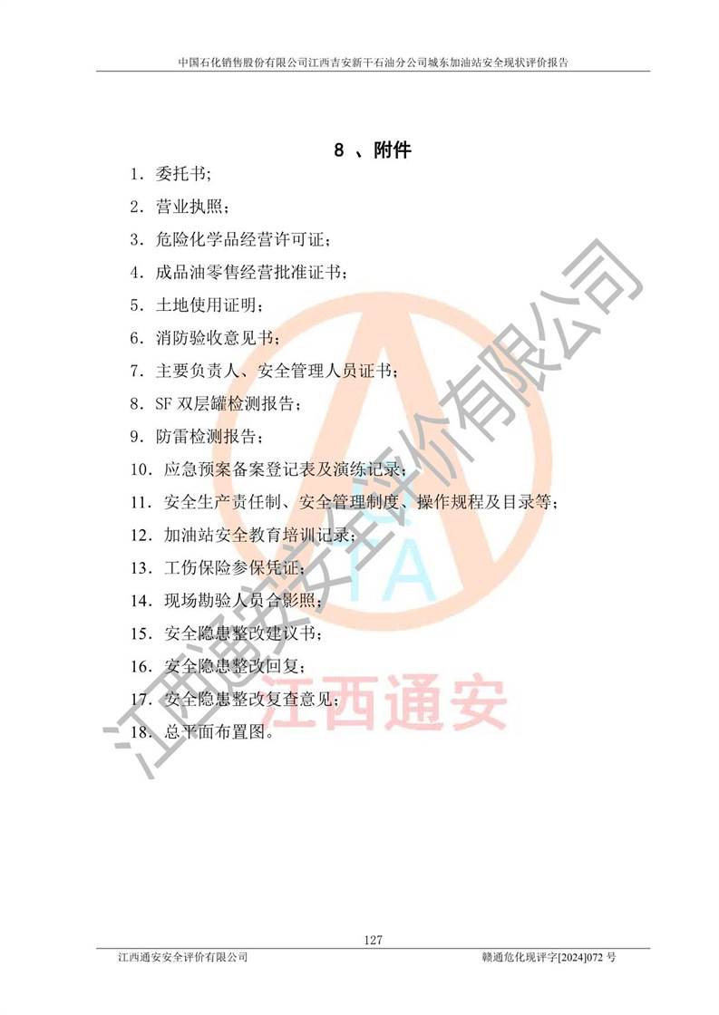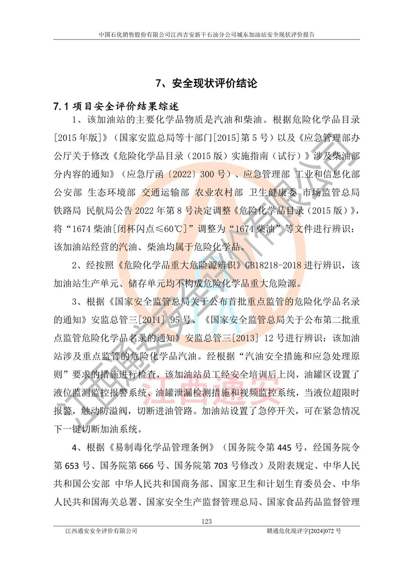 評價(jià)結(jié)論 | 中國石化銷售股份有限公司江西吉安新干石油分公司城東加油站符合《汽車加油加氣加氫站技術(shù)標(biāo)準(zhǔn)》GB50156-2021等標(biāo)準(zhǔn)規(guī)范的要求,安全風(fēng)險(xiǎn)可控,滿足危險(xiǎn)化學(xué)品經(jīng)營的安全條件。 | |||