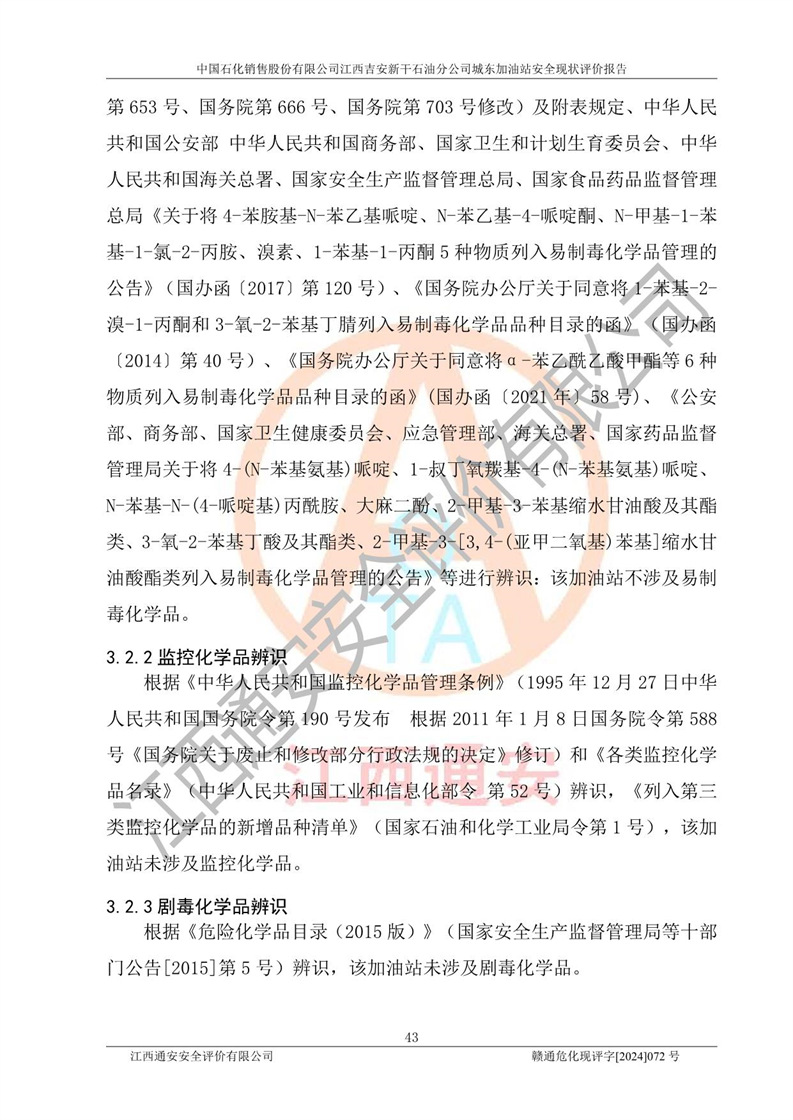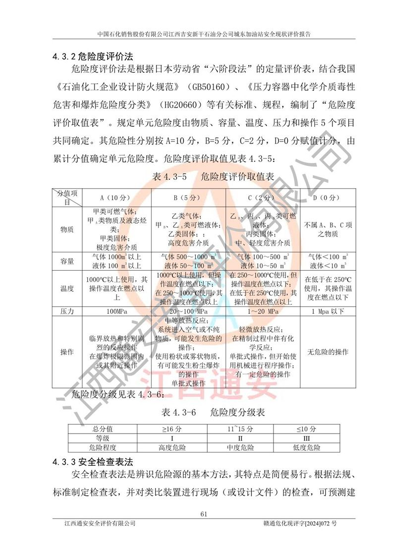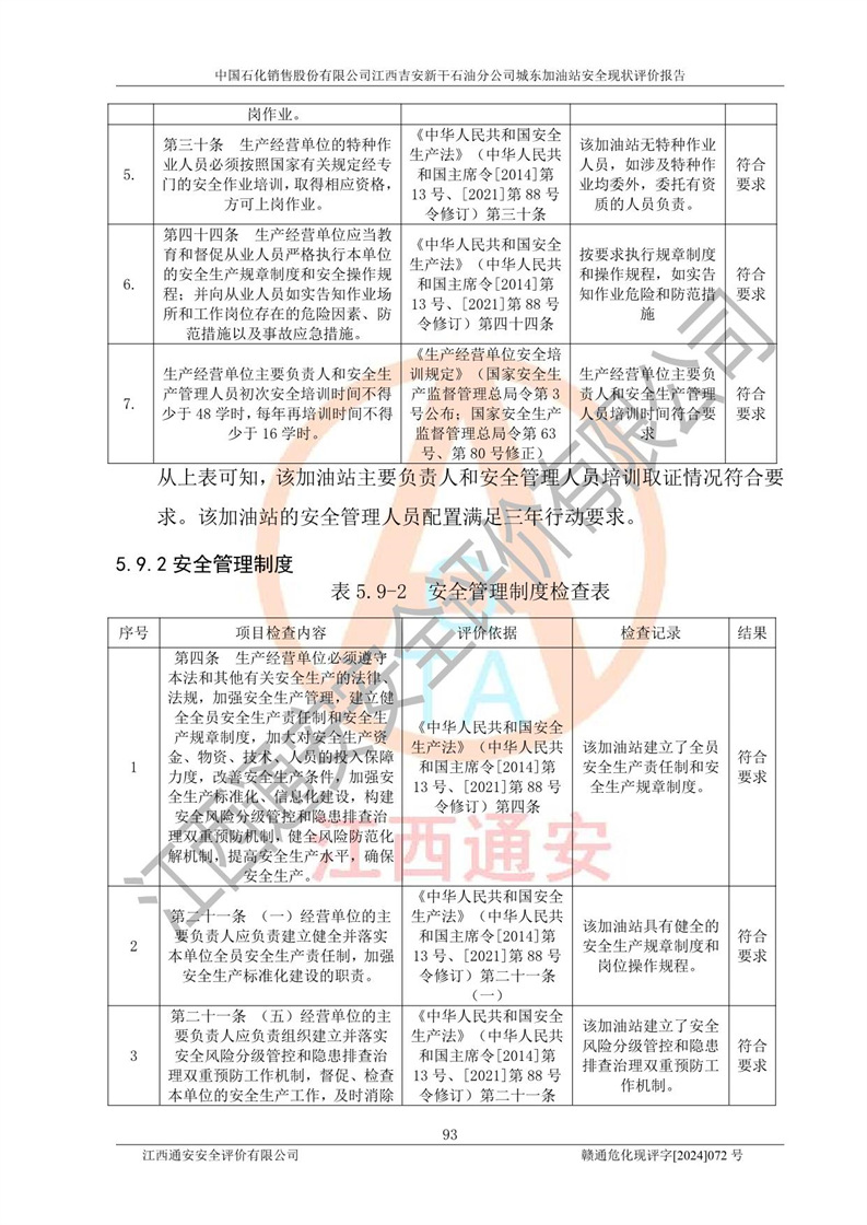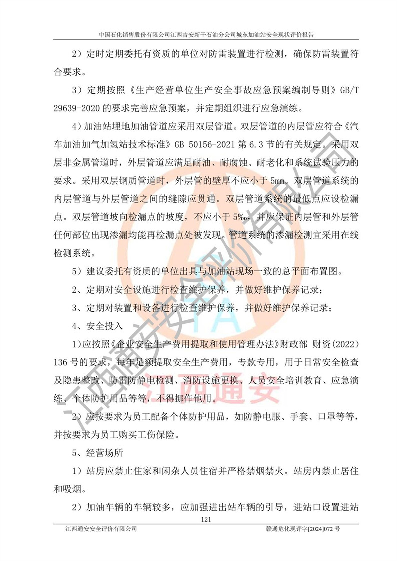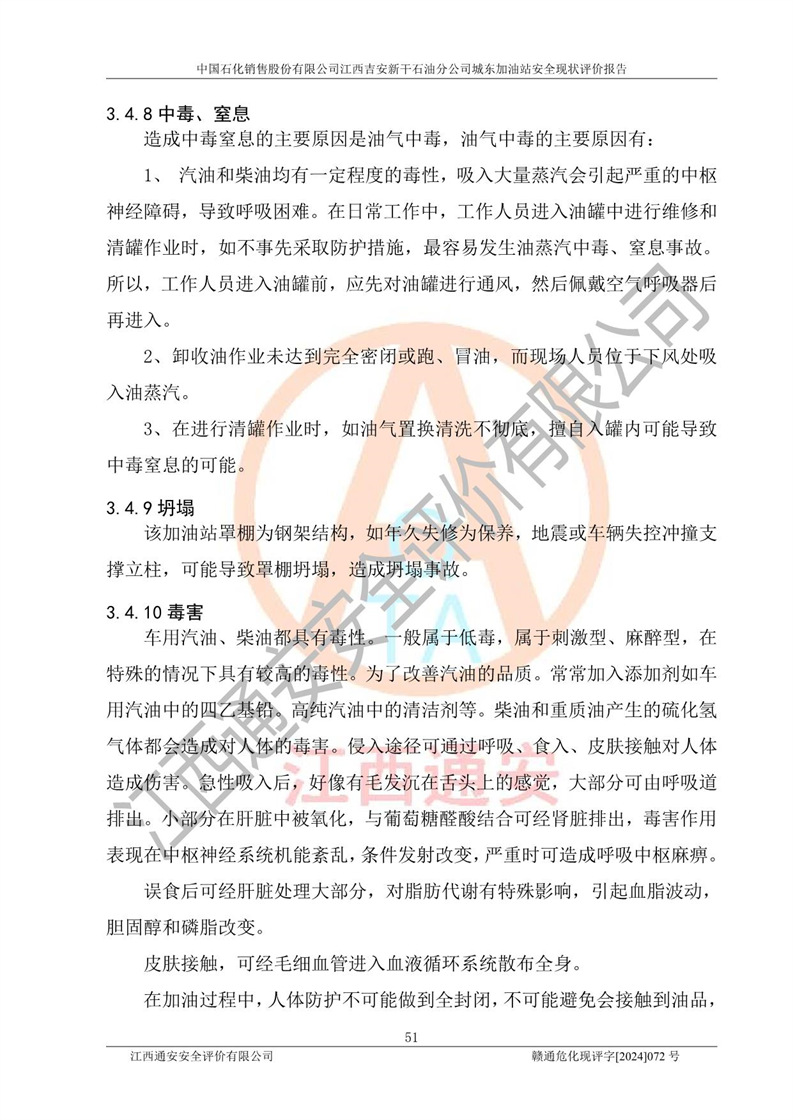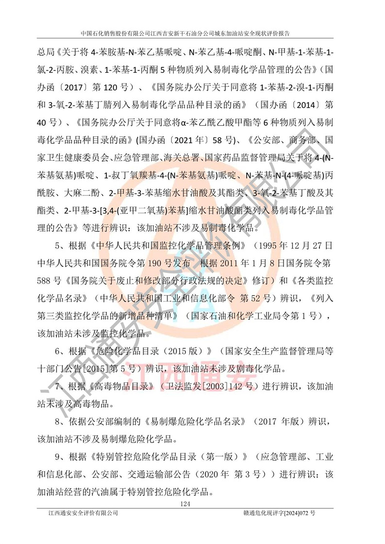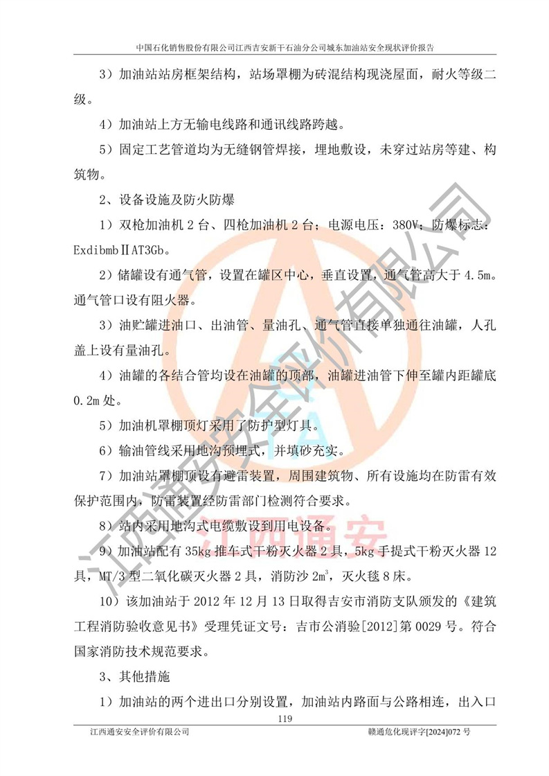 評價(jià)結(jié)論 | 中國石化銷售股份有限公司江西吉安新干石油分公司城東加油站符合《汽車加油加氣加氫站技術(shù)標(biāo)準(zhǔn)》GB50156-2021等標(biāo)準(zhǔn)規(guī)范的要求,安全風(fēng)險(xiǎn)可控,滿足危險(xiǎn)化學(xué)品經(jīng)營的安全條件。 | |||