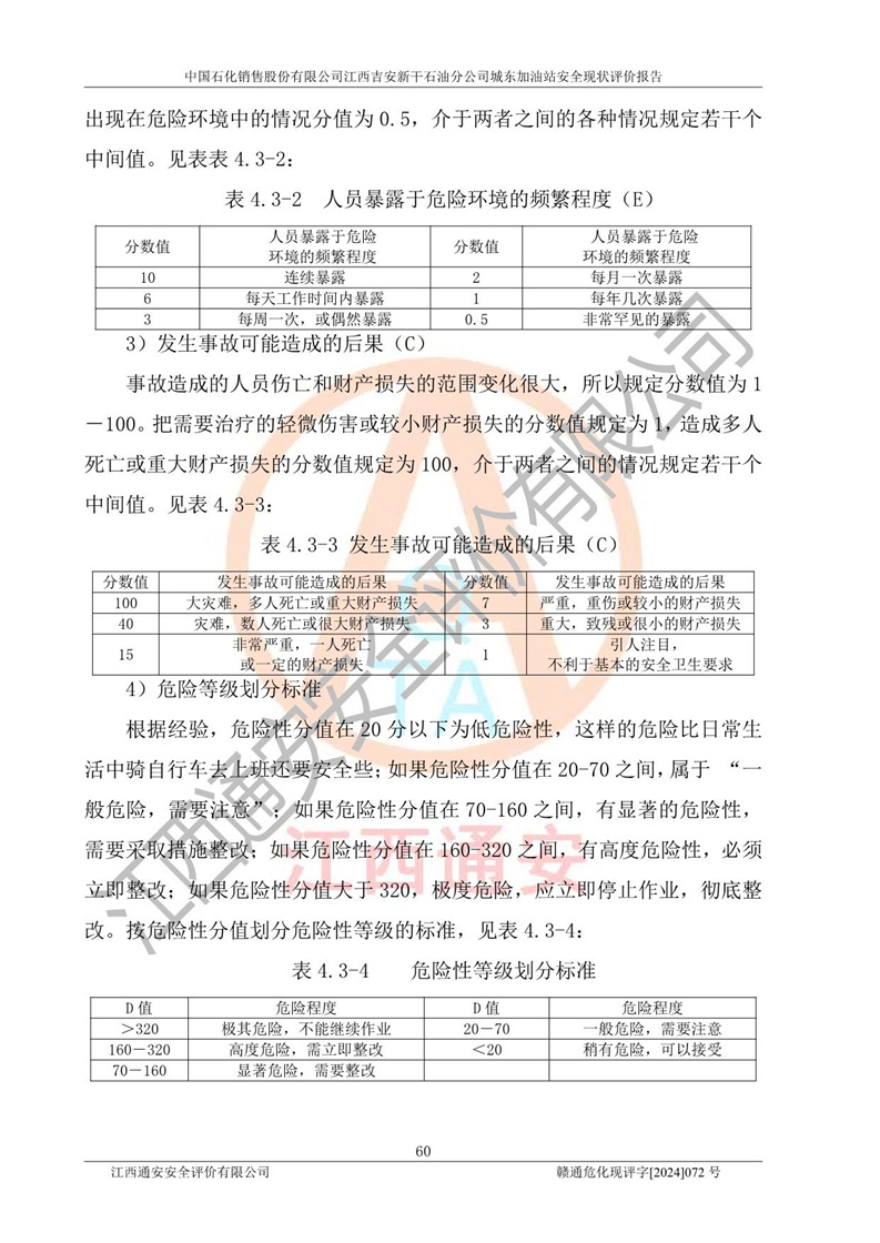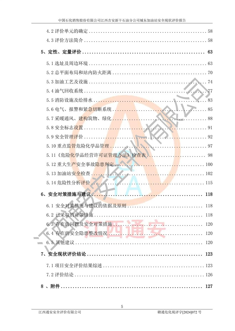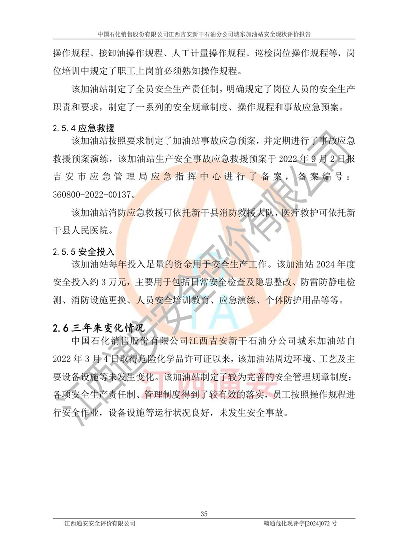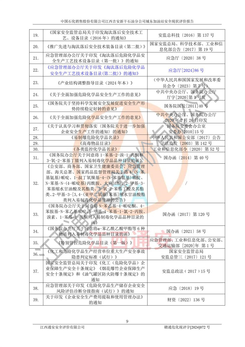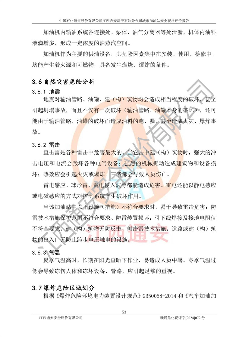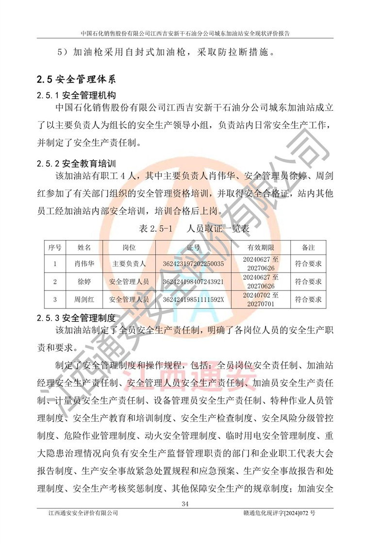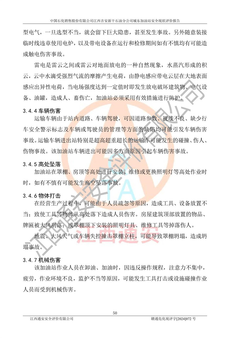 評價(jià)結(jié)論 | 中國石化銷售股份有限公司江西吉安新干石油分公司城東加油站符合《汽車加油加氣加氫站技術(shù)標(biāo)準(zhǔn)》GB50156-2021等標(biāo)準(zhǔn)規(guī)范的要求,安全風(fēng)險(xiǎn)可控,滿足危險(xiǎn)化學(xué)品經(jīng)營的安全條件。 | |||