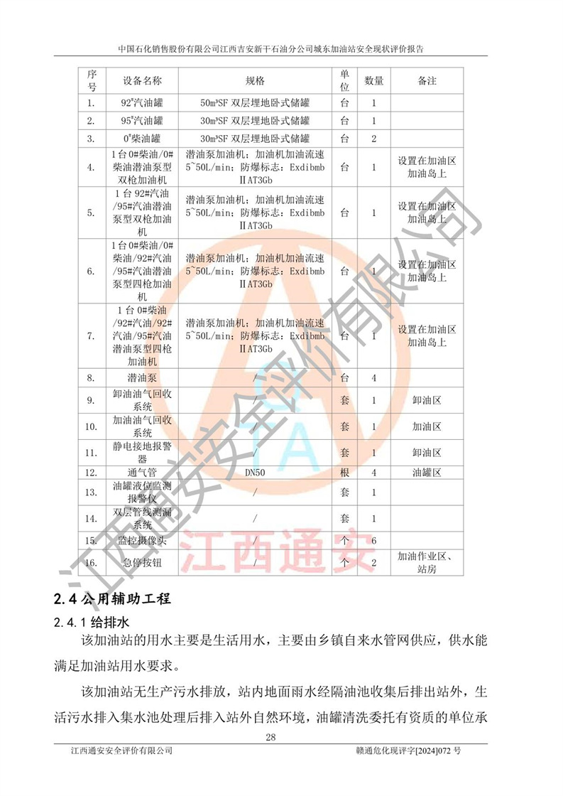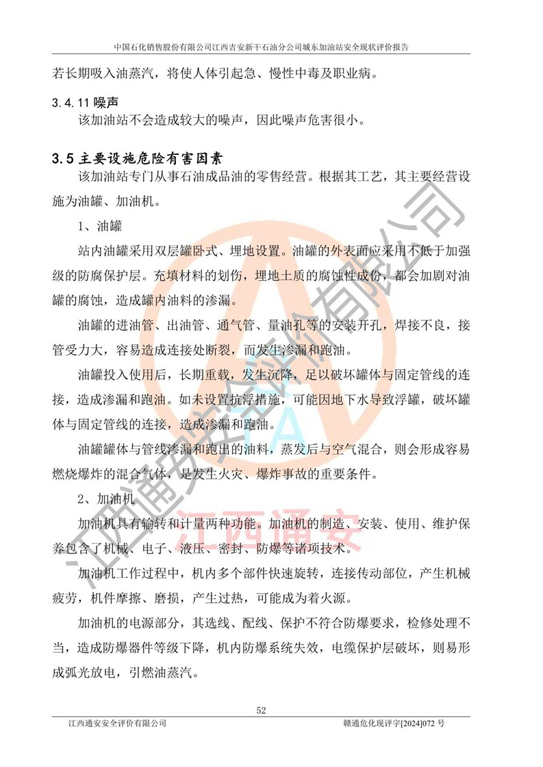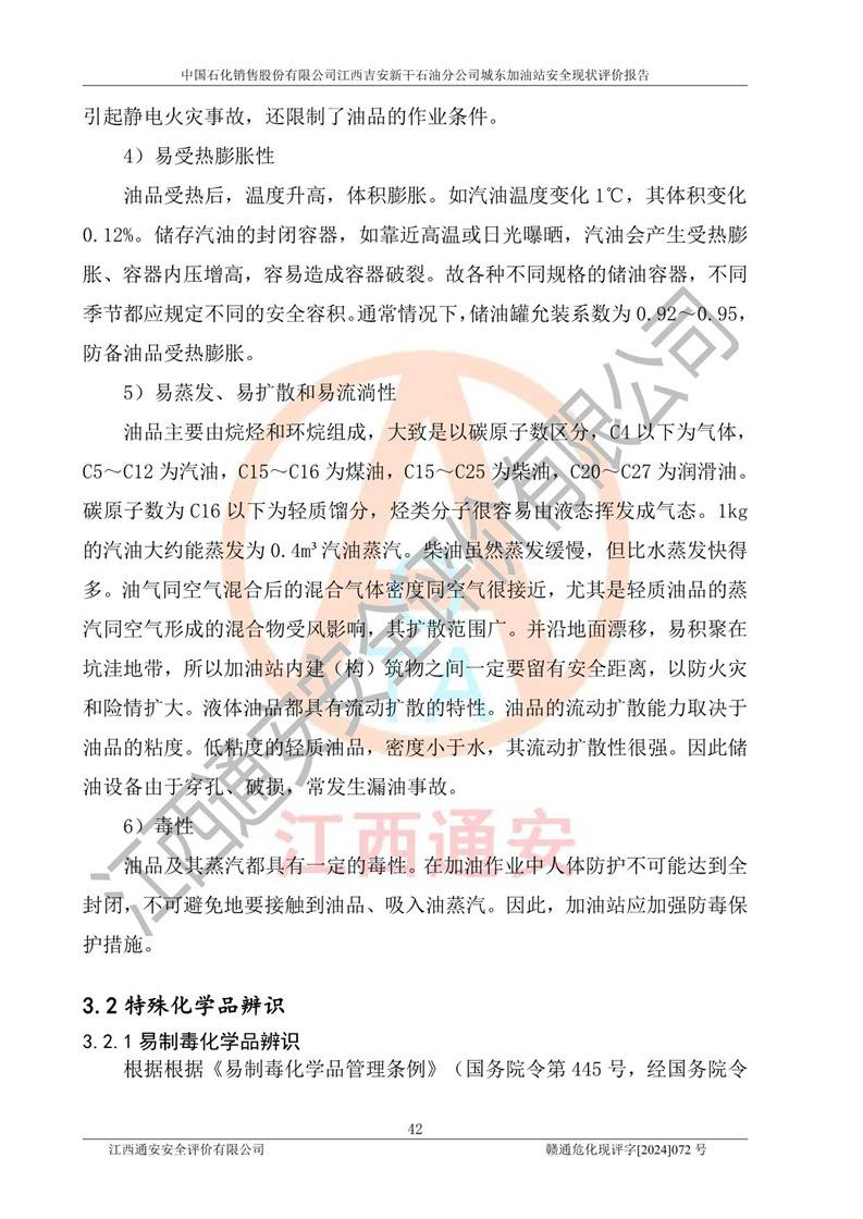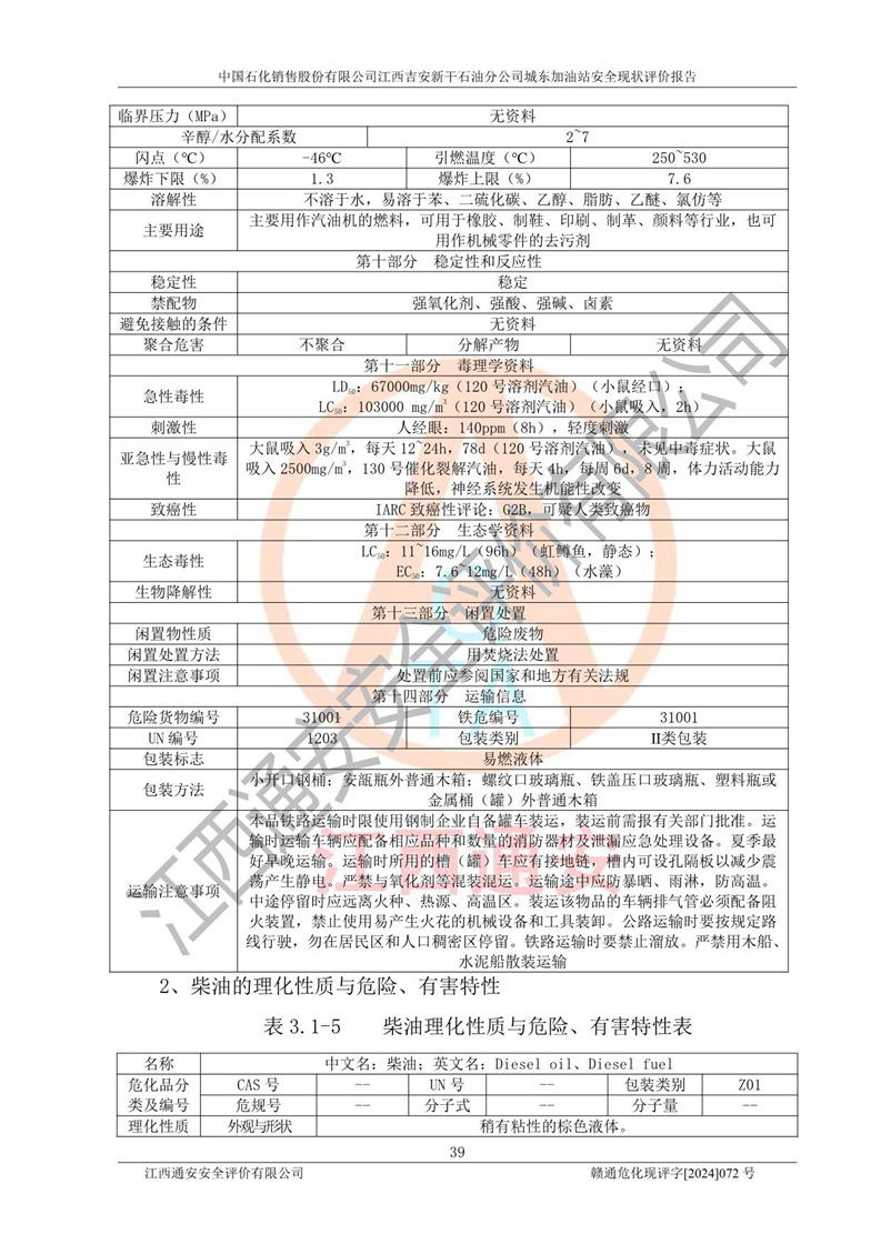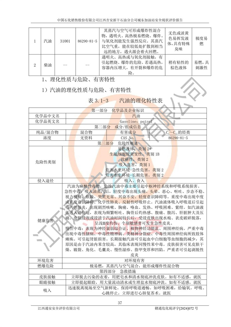 項(xiàng)目簡介 | 中國石化銷售股份有限公司江西吉安新干石油分公司城東加油站是一家從事成品油零售經(jīng)營的企業(yè)。該加油站于2014年4月16日經(jīng)吉安市市場監(jiān)督管理局核準(zhǔn)注冊成立,營業(yè)場所位于江西省吉安市新干縣金川鎮(zhèn)瓦橋村新七公路。該加油站屬于外商投資企業(yè)分公司,負(fù)責(zé)人為肖偉華,營業(yè)執(zhí)照統(tǒng)一社會(huì)信用代碼為:91360824065389328G。營業(yè)執(zhí)照核準(zhǔn)經(jīng)營范圍:許可項(xiàng)目:危險(xiǎn)化學(xué)品經(jīng)營,成品油零售(不含危險(xiǎn)化學(xué)品),成品油倉儲(chǔ),成品油零售,**類增值電信業(yè)務(wù),第二類增值電信業(yè)務(wù),第三類醫(yī)療器械經(jīng)營,出版物零售,**代理業(yè)務(wù),***零售,發(fā)電業(yè)務(wù)、輸電業(yè)務(wù)、供(配)電業(yè)務(wù),互聯(lián)網(wǎng)直播技術(shù)服務(wù),酒類經(jīng)營,食品銷售,小食雜,網(wǎng)絡(luò)文化經(jīng)營,藥品零售,燃?xì)饨?jīng)營,煙草制品零售,出版物批發(fā),旅游業(yè)務(wù),住宿服務(wù),餐飲服務(wù),港口經(jīng)營,保稅倉庫經(jīng)營,保稅物流中心經(jīng)營(依法須經(jīng)批準(zhǔn)的項(xiàng)目,經(jīng)相關(guān)部門批準(zhǔn)后在許可**期內(nèi)方可開展經(jīng)營活動(dòng),具體經(jīng)營項(xiàng)目和許可期限以相關(guān)部門批準(zhǔn)文件或許可證件為準(zhǔn))一般項(xiàng)目:成品油批發(fā)(不含危險(xiǎn)化學(xué)品),辦公設(shè)備銷售,電池銷售,成品油倉儲(chǔ)(不含危險(xiǎn)化學(xué)品),**類醫(yī)療器械銷售,第二類醫(yī)療器械銷售,輪胎銷售,低溫倉儲(chǔ)(不含危險(xiǎn)化學(xué)品等需許可審批的項(xiàng)目),電動(dòng)自行車銷售,電動(dòng)汽車充電基礎(chǔ)設(shè)施運(yùn)營,寵物食品及用品批發(fā),非電力家用器具銷售,化妝品批發(fā),化妝品零售,個(gè)人衛(wèi)生用品銷售,會(huì)議及展覽服務(wù),金銀制品銷售,集中式**充電站,普通貨物倉儲(chǔ)服務(wù)(不含危險(xiǎn)化學(xué)品等需許可審批的項(xiàng)目),人力資源服務(wù)(不含職業(yè)中介活動(dòng)、勞務(wù)派遣服務(wù)),食品互聯(lián)網(wǎng)銷售(僅銷售預(yù)包裝食品),食用農(nóng)產(chǎn)品零售,外賣遞送服務(wù),消毒劑銷售(不含危險(xiǎn)化學(xué)品),新能源汽車換電設(shè)施銷售,站用加氫及儲(chǔ)氫設(shè)施銷售,鐘表銷售,**化學(xué)產(chǎn)品銷售(不含危險(xiǎn)化學(xué)品),保健食品(預(yù)包裝)銷售,針紡織品銷售,服裝服飾零售,日用品銷售,五金產(chǎn)品零售,家用電器銷售,單用途商業(yè)預(yù)付卡代理銷售,電子產(chǎn)品銷售,潤滑油銷售,石油制品銷售(不含危險(xiǎn)化學(xué)品),戶外用品銷售,汽車銷售,摩托車及零配件批發(fā),摩托車及零配件零售,農(nóng)副產(chǎn)品銷售,化肥銷售,農(nóng)用薄膜銷售,安防設(shè)備銷售,禮品花卉銷售,計(jì)算機(jī)軟硬件及輔助設(shè)備零售,橡膠制品銷售,機(jī)械設(shè)備銷售,珠寶首飾零售,珠寶首飾批發(fā),玩具銷售,樂器批發(fā),樂器零售,家具銷售,建筑材料銷售,機(jī)動(dòng)車充電銷售,技術(shù)服務(wù)、技術(shù)開發(fā)、技術(shù)咨詢、技術(shù)交流、技術(shù)**、技術(shù)推廣,機(jī)動(dòng)車修理和維護(hù),物業(yè)管理,停車場服務(wù),居民日常生活服務(wù),票務(wù)代理服務(wù),廣告發(fā)布,廣告制作,廣告設(shè)計(jì)、代理,洗車服務(wù),信息咨詢服務(wù)(不含許可類信息咨詢服務(wù)),軟件開發(fā),貨物進(jìn)出口,食品進(jìn)出口,技術(shù)進(jìn)出口,進(jìn)出口代理,汽車裝飾用品銷售,租賃服務(wù)(不含許可類租賃服務(wù)),小微型客車租賃經(jīng)營服務(wù)(除依法須經(jīng)批準(zhǔn)的項(xiàng)目外,憑營業(yè)執(zhí)照依法自主開展經(jīng)營活動(dòng)) 中國石化銷售股份有限公司江西吉安新干石油分公司城東加油站占地面積1373.13㎡,加油站中設(shè)有1臺(tái)0#柴油/0#柴油潛油泵型雙槍加油機(jī),1臺(tái)92#汽油/95#汽油潛油泵型雙槍加油機(jī),1臺(tái)0#柴油/0#柴油/92#汽油/95#汽油潛油泵型四槍加油機(jī),1臺(tái)0#柴油/92#汽油/92#汽油/95#汽油潛油泵型四槍加油機(jī),設(shè)2臺(tái)SF雙層30m3埋地臥式0#柴油罐、1臺(tái)SF雙層50m3埋地臥式92#汽油儲(chǔ)罐,1臺(tái)SF雙層30m3埋地臥式95#汽油儲(chǔ)罐,總罐容為140m3,折合油罐容積為110m3(柴油罐容積折半計(jì)入油罐總?cè)莘e),屬二級加油站,汽油卸油、加油設(shè)置了油氣回收系統(tǒng)。 中國石化銷售股份有限公司江西吉安新干石油分公司城東加油站于2022年1月27日經(jīng)吉安市應(yīng)急管理局核準(zhǔn),取得了《危險(xiǎn)化學(xué)品經(jīng)營許可證》,證書編號(hào):贛吉危化經(jīng)字[2022]360800000009,許可經(jīng)營范圍:成品油。**期2022年3月04日2025年03月03日。 中國石化銷售股份有限公司江西吉安新干石油分公司城東加油站2020年12月15日經(jīng)吉安市商務(wù)局核準(zhǔn),取得了《成品油零售經(jīng)營批準(zhǔn)證書》,證書編號(hào):油零售證書第吉0060號(hào),批準(zhǔn)從事成品油(汽油、柴油)零售業(yè)務(wù)。證書**期2020年12月15日至2025年12月14日。 項(xiàng)目生產(chǎn)過程中涉及的危險(xiǎn)化學(xué)品有:汽油、柴油等。 項(xiàng)目各生產(chǎn)和儲(chǔ)存單元均未構(gòu)
