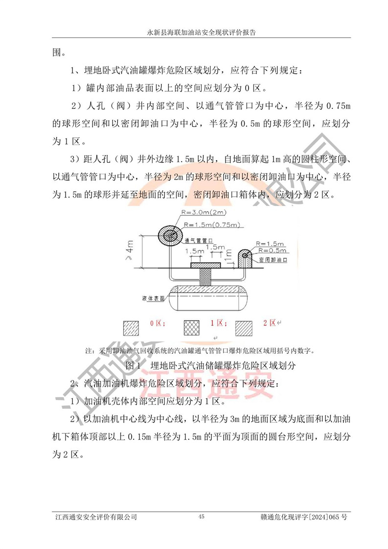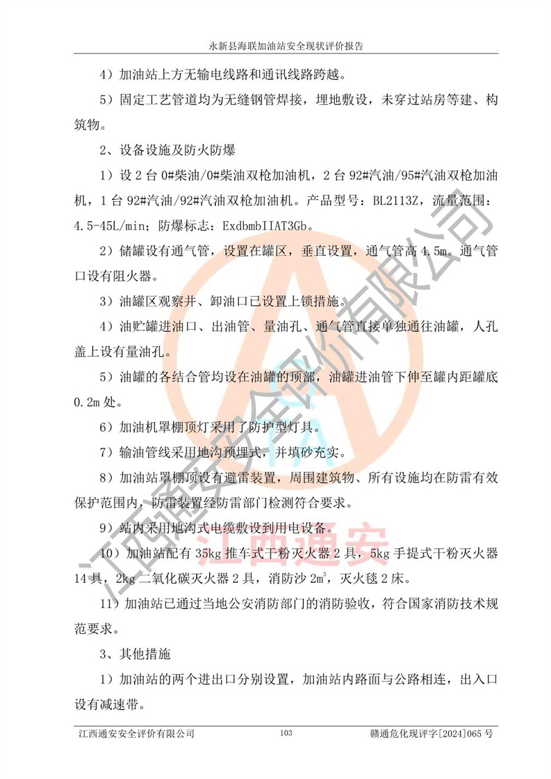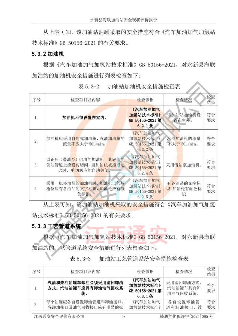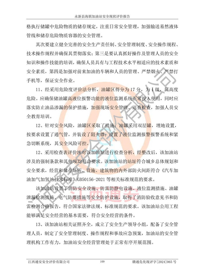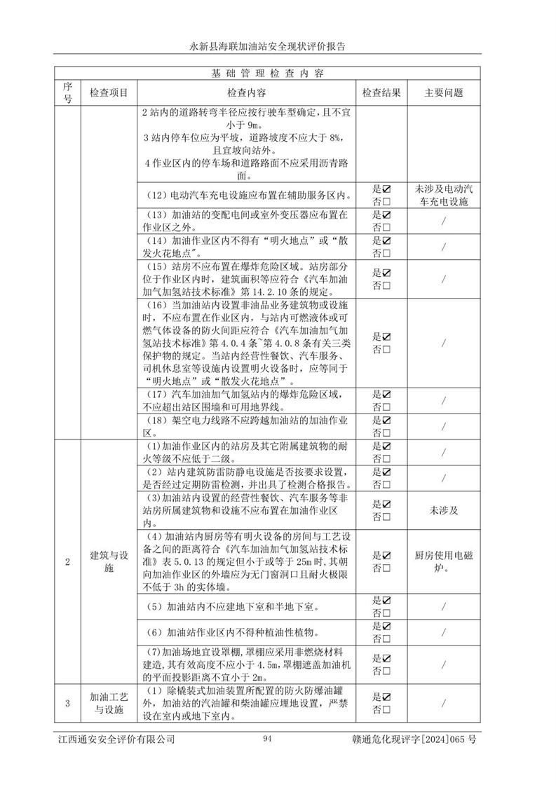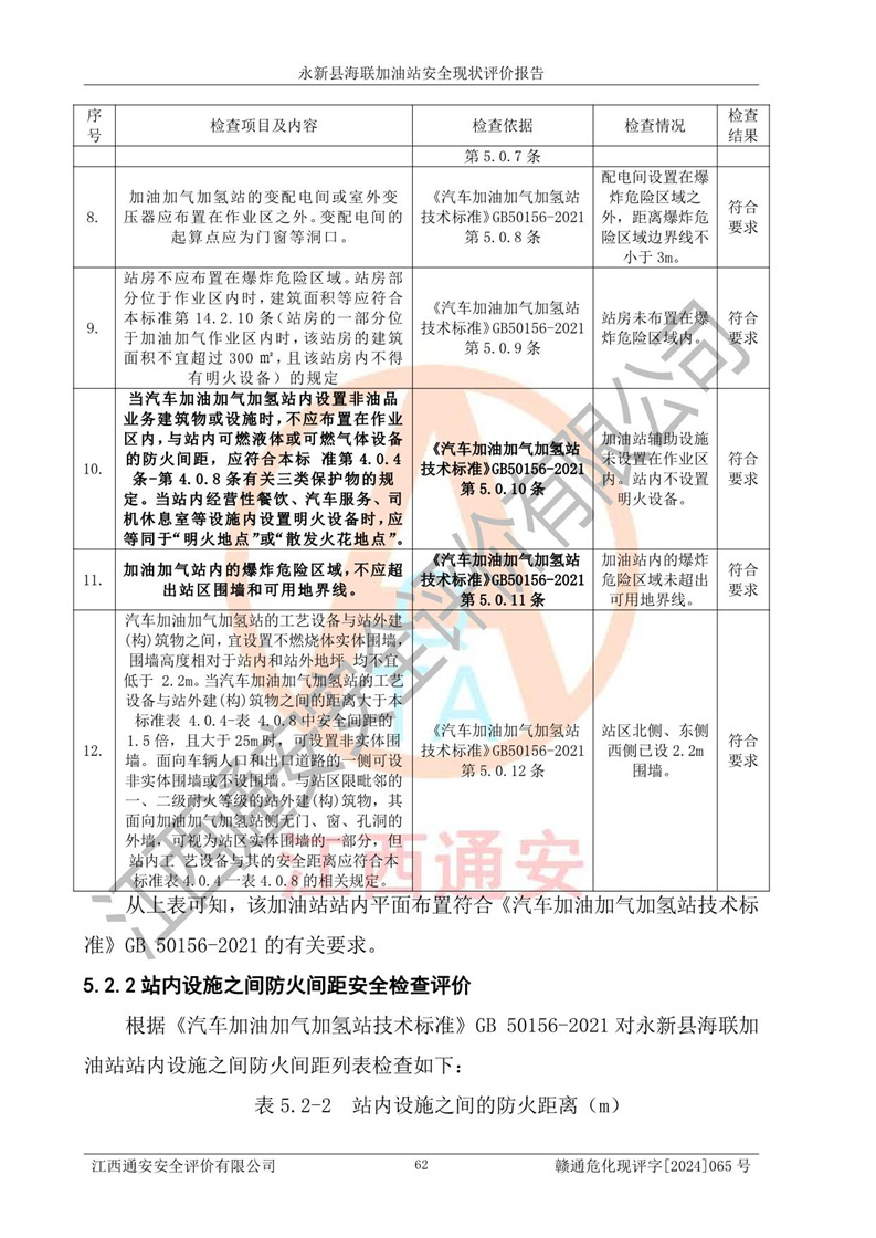 評價(jià)結(jié)論 | 永新縣海聯(lián)加油站站址合理,周邊環(huán)境良好,與敏感防護(hù)目標(biāo)間距符合規(guī)范要求,站區(qū)建構(gòu)筑物之間的防火間距、耐火等級符合標(biāo)準(zhǔn)要求,與總平面布置圖一致,加油卸油工藝及設(shè)備設(shè)施合理,工藝布置得當(dāng),防雷設(shè)施經(jīng)檢測合格,采取的工藝安全設(shè)施符合規(guī)范要求;該加油站制定了安全管理制度和操作規(guī)程,人員經(jīng)培訓(xùn)合格后上崗,安全管理人員經(jīng)考核合格并取得安全合格證,能按照法律法規(guī)要求開展安全生產(chǎn)管理工作。 綜上:永新縣海聯(lián)加油站符合《汽車加油加氣加氫站技術(shù)標(biāo)準(zhǔn)》GB50156-2021等標(biāo)準(zhǔn)規(guī)范的要求,安全風(fēng)險(xiǎn)可控,滿足危險(xiǎn)化學(xué)品經(jīng)營的安全條件。 | |||