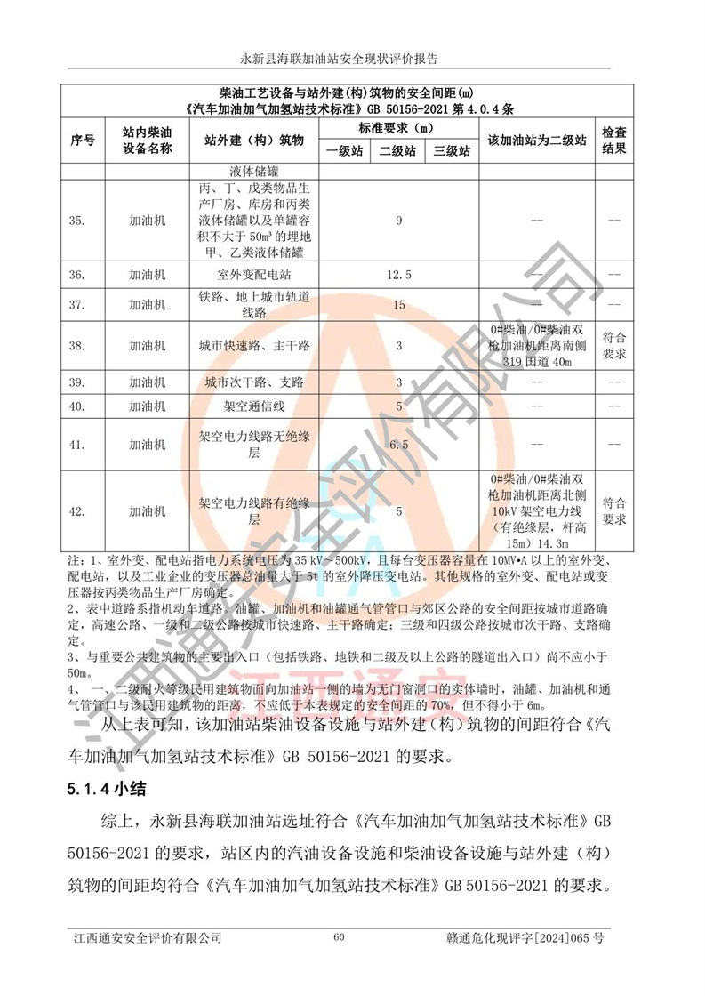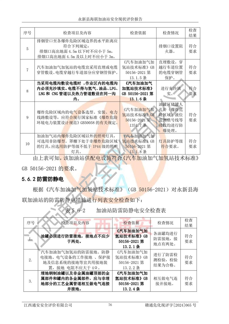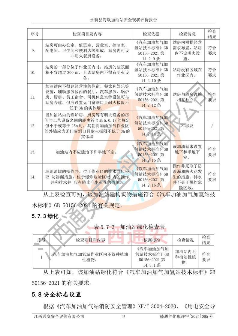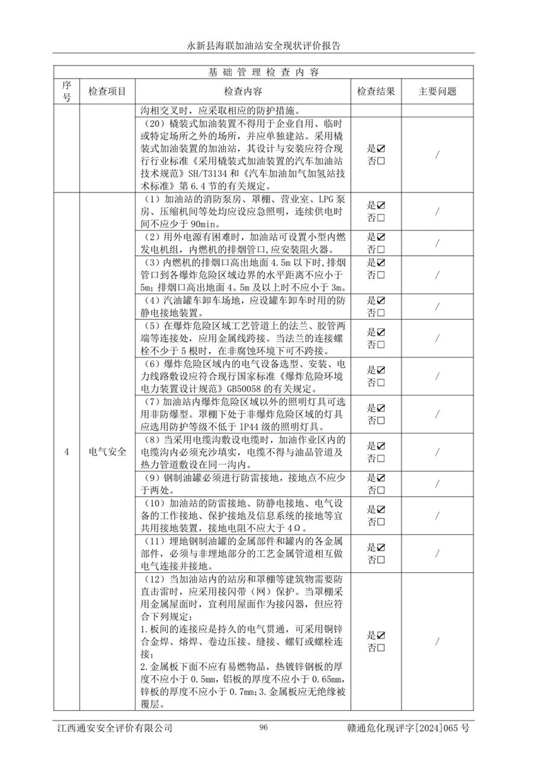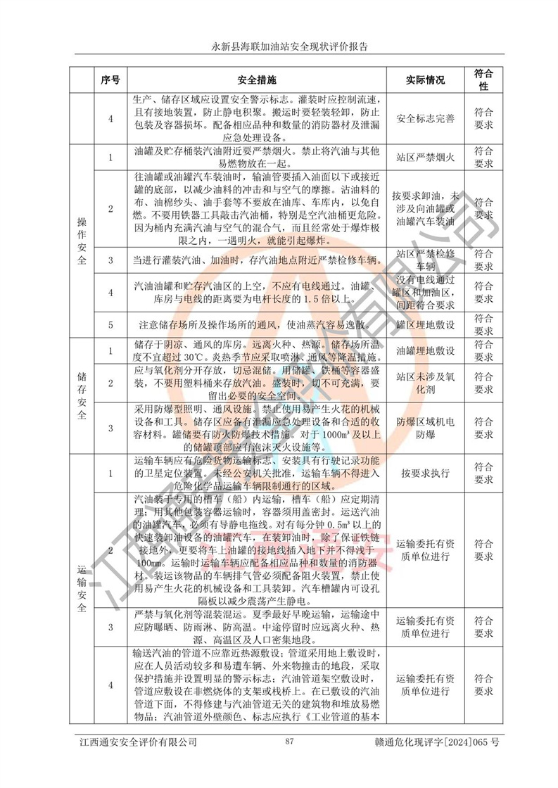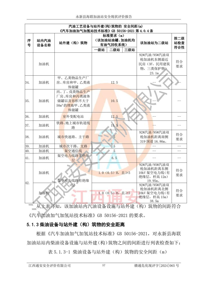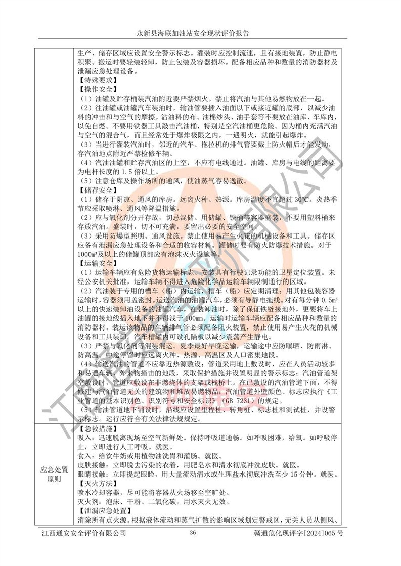 評價(jià)結(jié)論 | 永新縣海聯(lián)加油站站址合理,周邊環(huán)境良好,與敏感防護(hù)目標(biāo)間距符合規(guī)范要求,站區(qū)建構(gòu)筑物之間的防火間距、耐火等級符合標(biāo)準(zhǔn)要求,與總平面布置圖一致,加油卸油工藝及設(shè)備設(shè)施合理,工藝布置得當(dāng),防雷設(shè)施經(jīng)檢測合格,采取的工藝安全設(shè)施符合規(guī)范要求;該加油站制定了安全管理制度和操作規(guī)程,人員經(jīng)培訓(xùn)合格后上崗,安全管理人員經(jīng)考核合格并取得安全合格證,能按照法律法規(guī)要求開展安全生產(chǎn)管理工作。 綜上:永新縣海聯(lián)加油站符合《汽車加油加氣加氫站技術(shù)標(biāo)準(zhǔn)》GB50156-2021等標(biāo)準(zhǔn)規(guī)范的要求,安全風(fēng)險(xiǎn)可控,滿足危險(xiǎn)化學(xué)品經(jīng)營的安全條件。 | |||