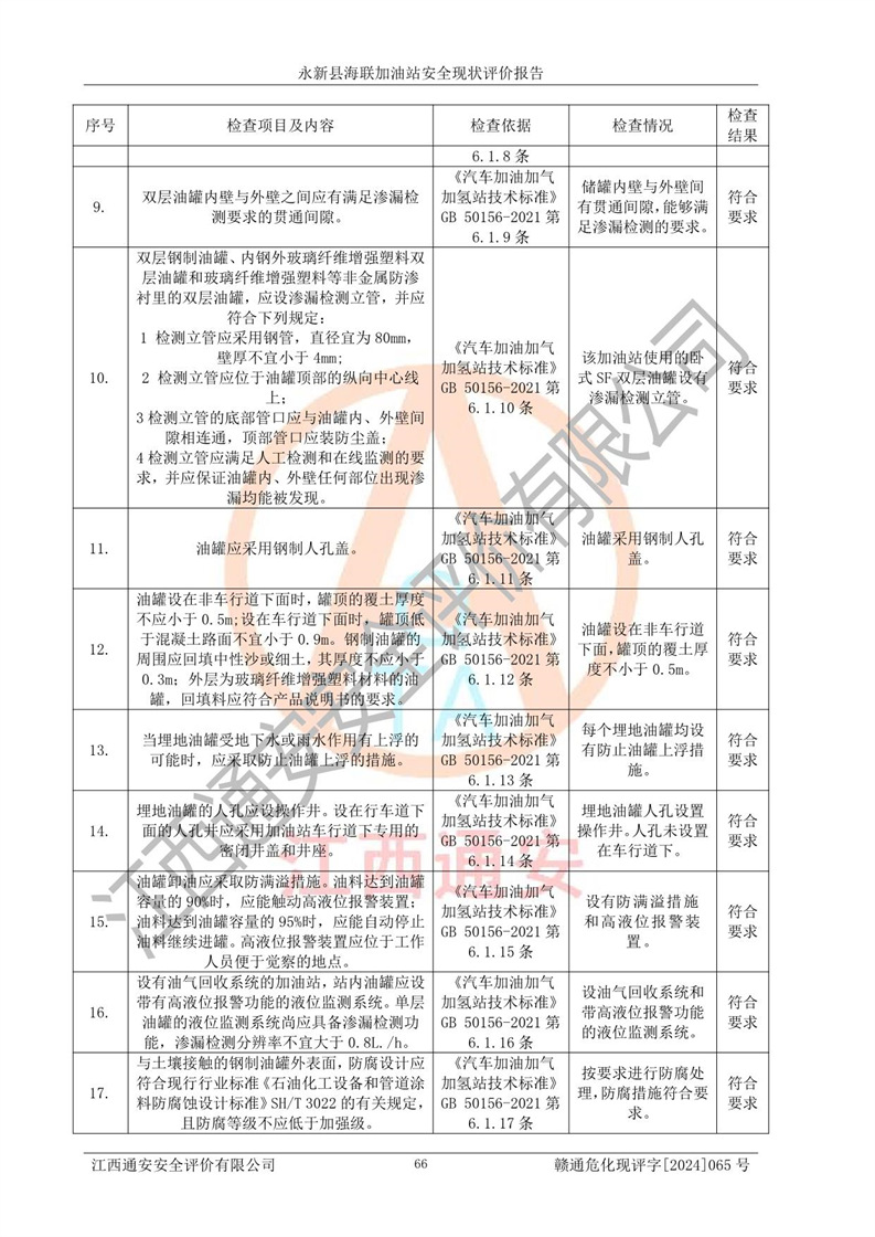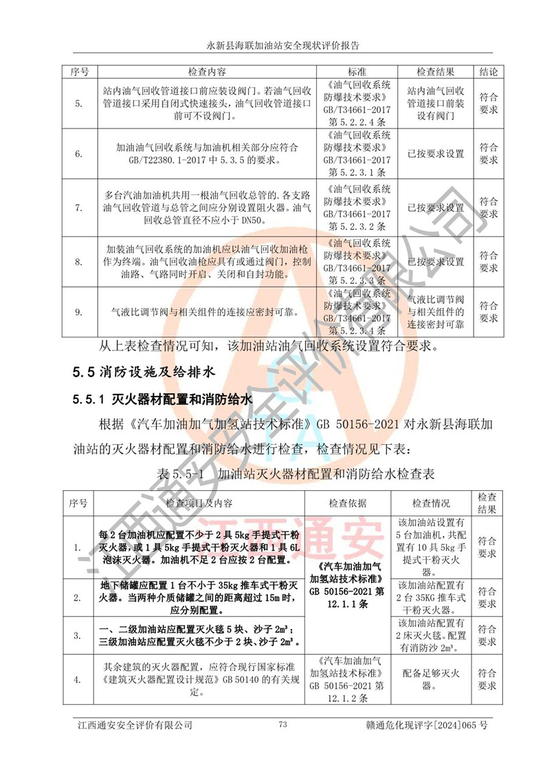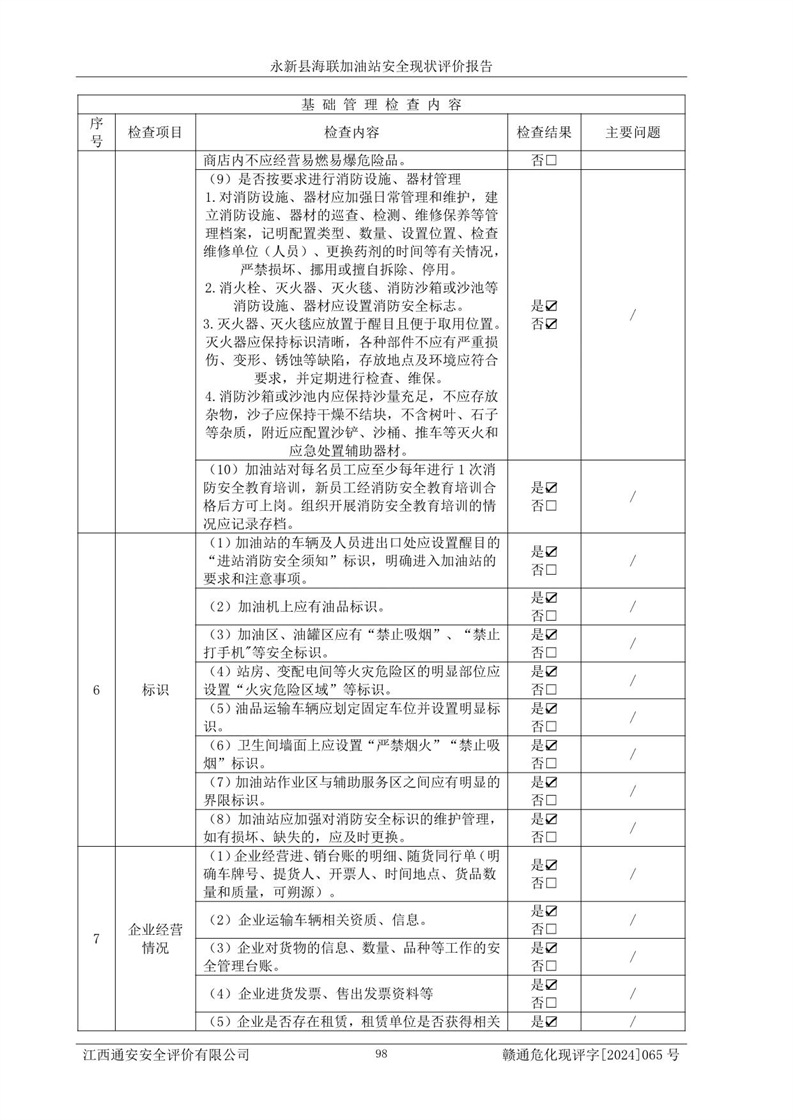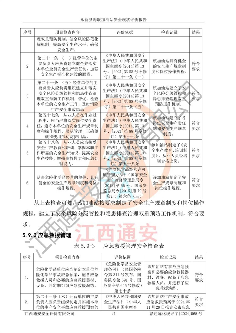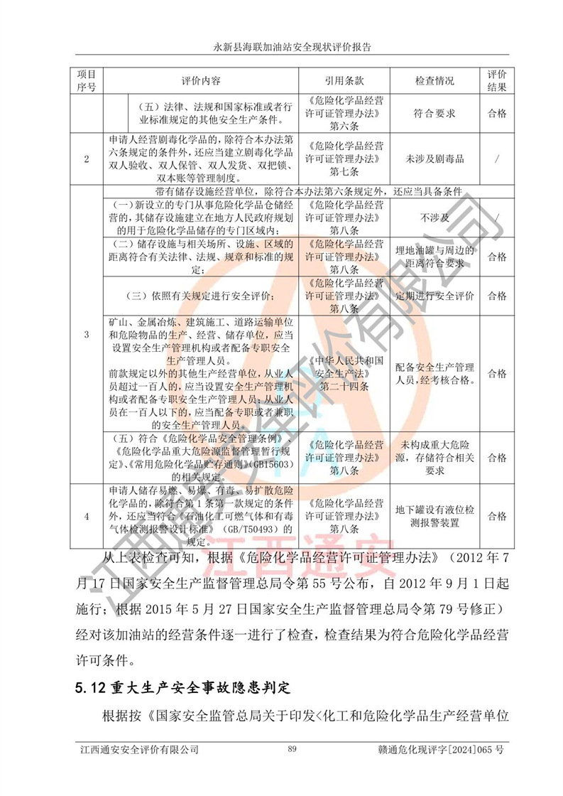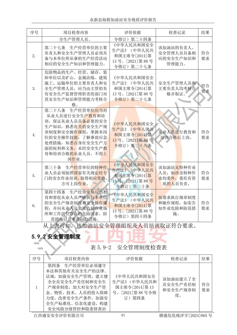 評價(jià)結(jié)論 | 永新縣海聯(lián)加油站站址合理,周邊環(huán)境良好,與敏感防護(hù)目標(biāo)間距符合規(guī)范要求,站區(qū)建構(gòu)筑物之間的防火間距、耐火等級符合標(biāo)準(zhǔn)要求,與總平面布置圖一致,加油卸油工藝及設(shè)備設(shè)施合理,工藝布置得當(dāng),防雷設(shè)施經(jīng)檢測合格,采取的工藝安全設(shè)施符合規(guī)范要求;該加油站制定了安全管理制度和操作規(guī)程,人員經(jīng)培訓(xùn)合格后上崗,安全管理人員經(jīng)考核合格并取得安全合格證,能按照法律法規(guī)要求開展安全生產(chǎn)管理工作。 綜上:永新縣海聯(lián)加油站符合《汽車加油加氣加氫站技術(shù)標(biāo)準(zhǔn)》GB50156-2021等標(biāo)準(zhǔn)規(guī)范的要求,安全風(fēng)險(xiǎn)可控,滿足危險(xiǎn)化學(xué)品經(jīng)營的安全條件。 | |||
