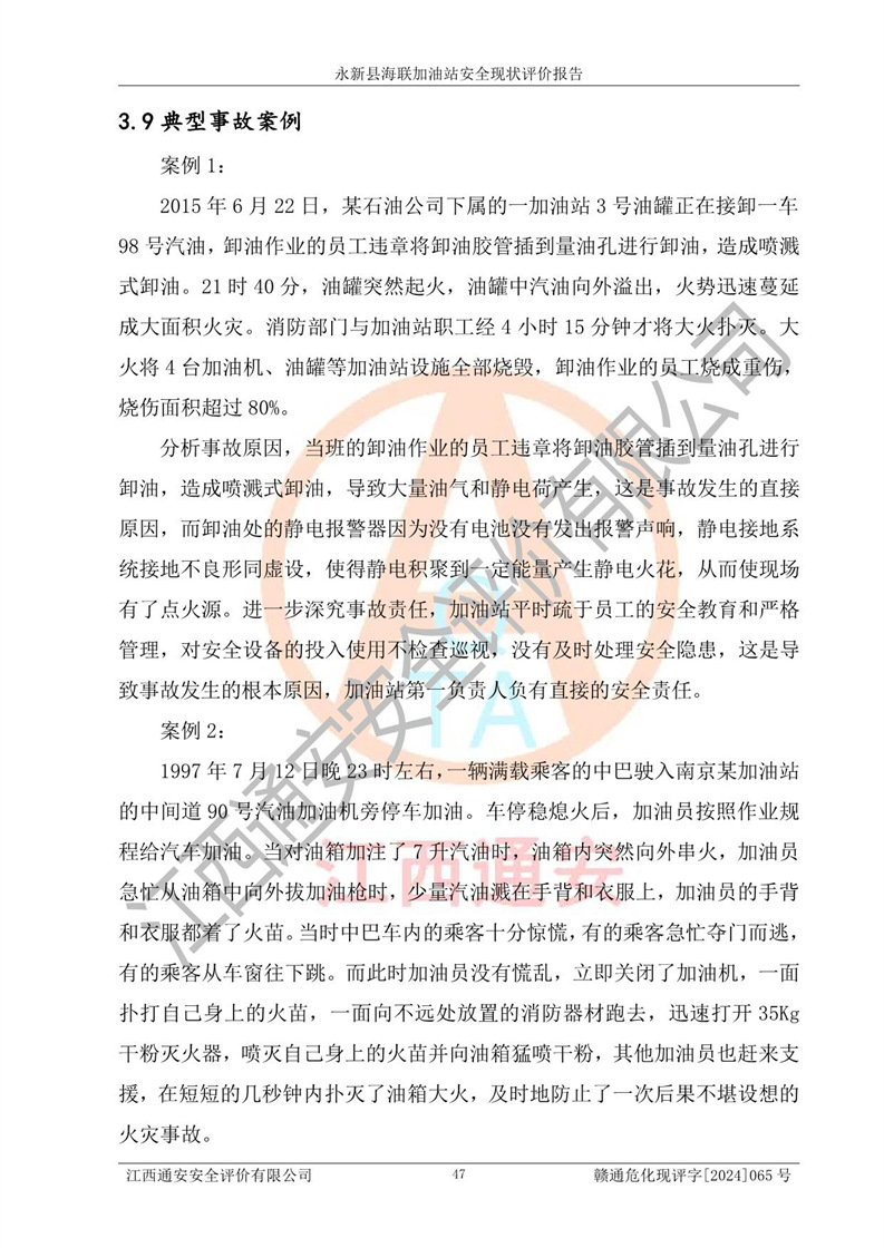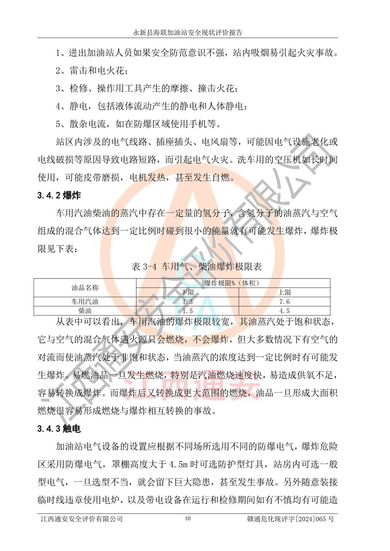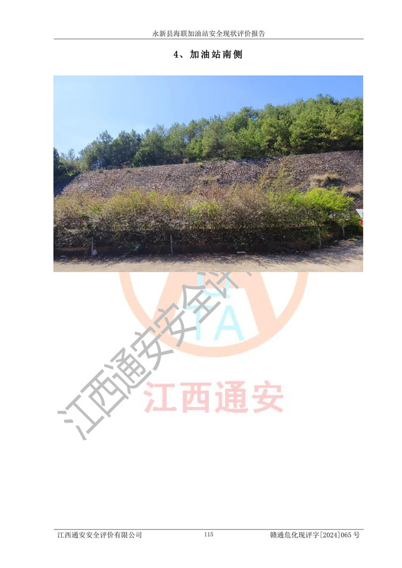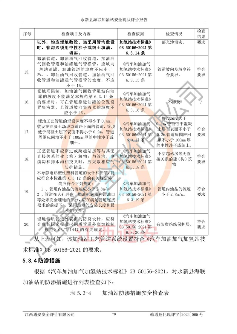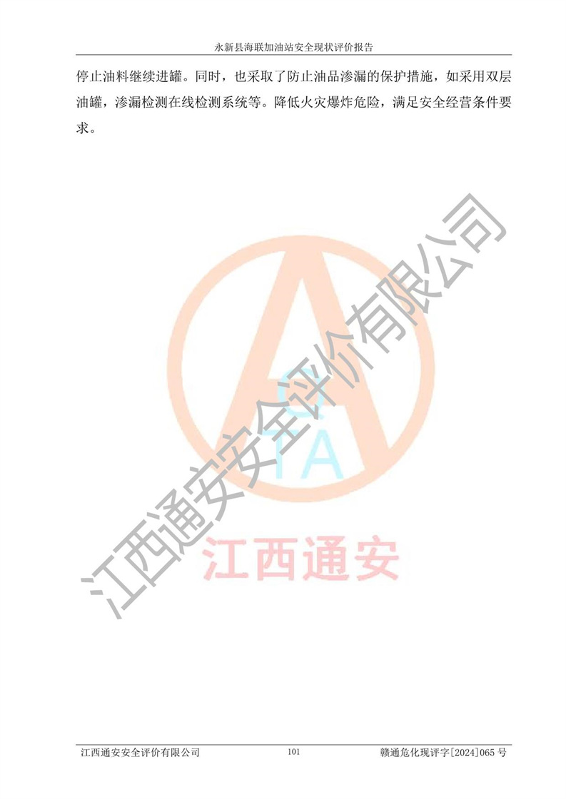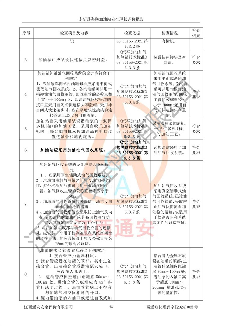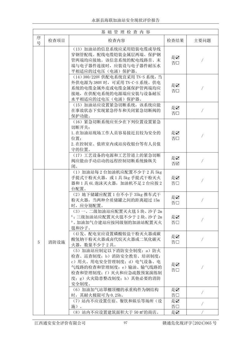 評價(jià)結(jié)論 | 永新縣海聯(lián)加油站站址合理,周邊環(huán)境良好,與敏感防護(hù)目標(biāo)間距符合規(guī)范要求,站區(qū)建構(gòu)筑物之間的防火間距、耐火等級符合標(biāo)準(zhǔn)要求,與總平面布置圖一致,加油卸油工藝及設(shè)備設(shè)施合理,工藝布置得當(dāng),防雷設(shè)施經(jīng)檢測合格,采取的工藝安全設(shè)施符合規(guī)范要求;該加油站制定了安全管理制度和操作規(guī)程,人員經(jīng)培訓(xùn)合格后上崗,安全管理人員經(jīng)考核合格并取得安全合格證,能按照法律法規(guī)要求開展安全生產(chǎn)管理工作。 綜上:永新縣海聯(lián)加油站符合《汽車加油加氣加氫站技術(shù)標(biāo)準(zhǔn)》GB50156-2021等標(biāo)準(zhǔn)規(guī)范的要求,安全風(fēng)險(xiǎn)可控,滿足危險(xiǎn)化學(xué)品經(jīng)營的安全條件。 | |||