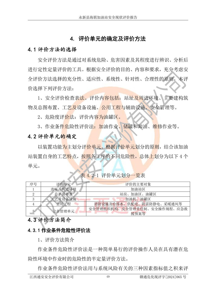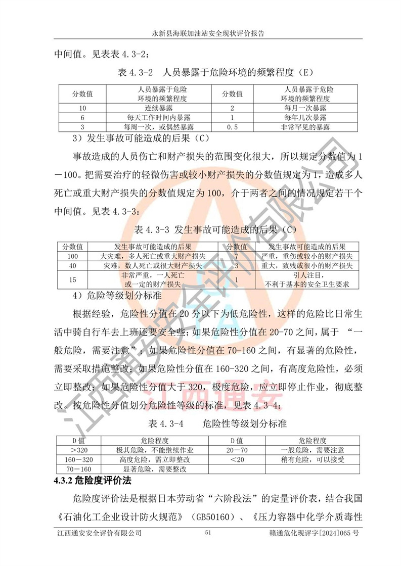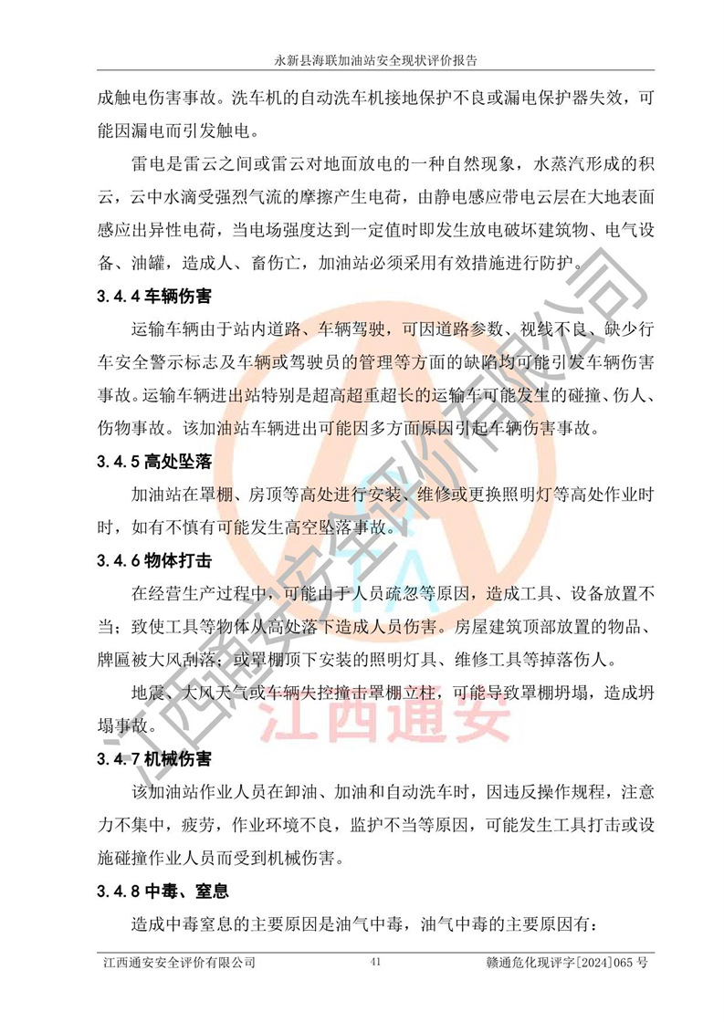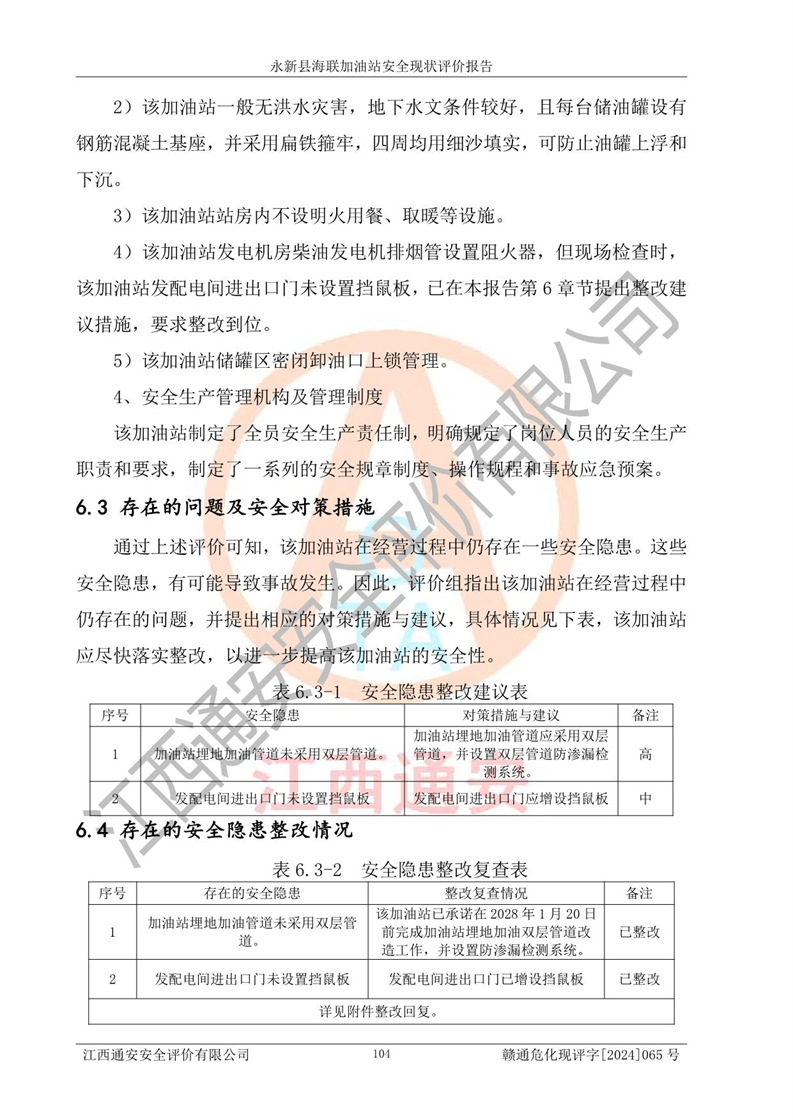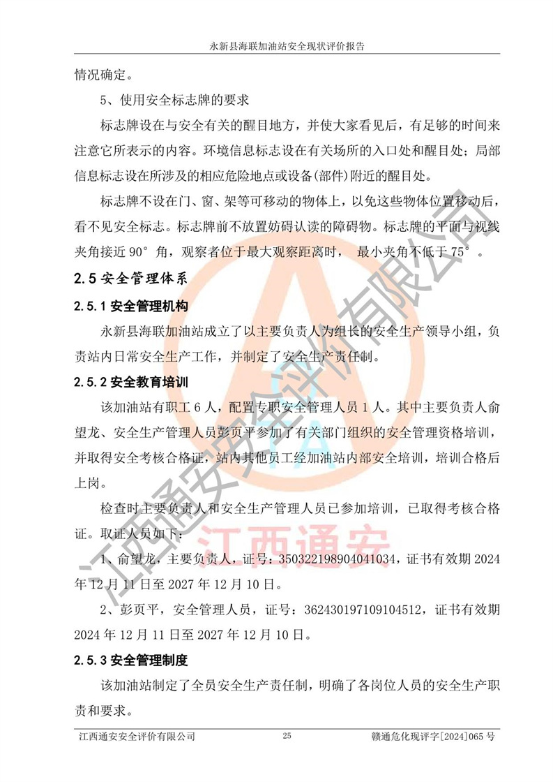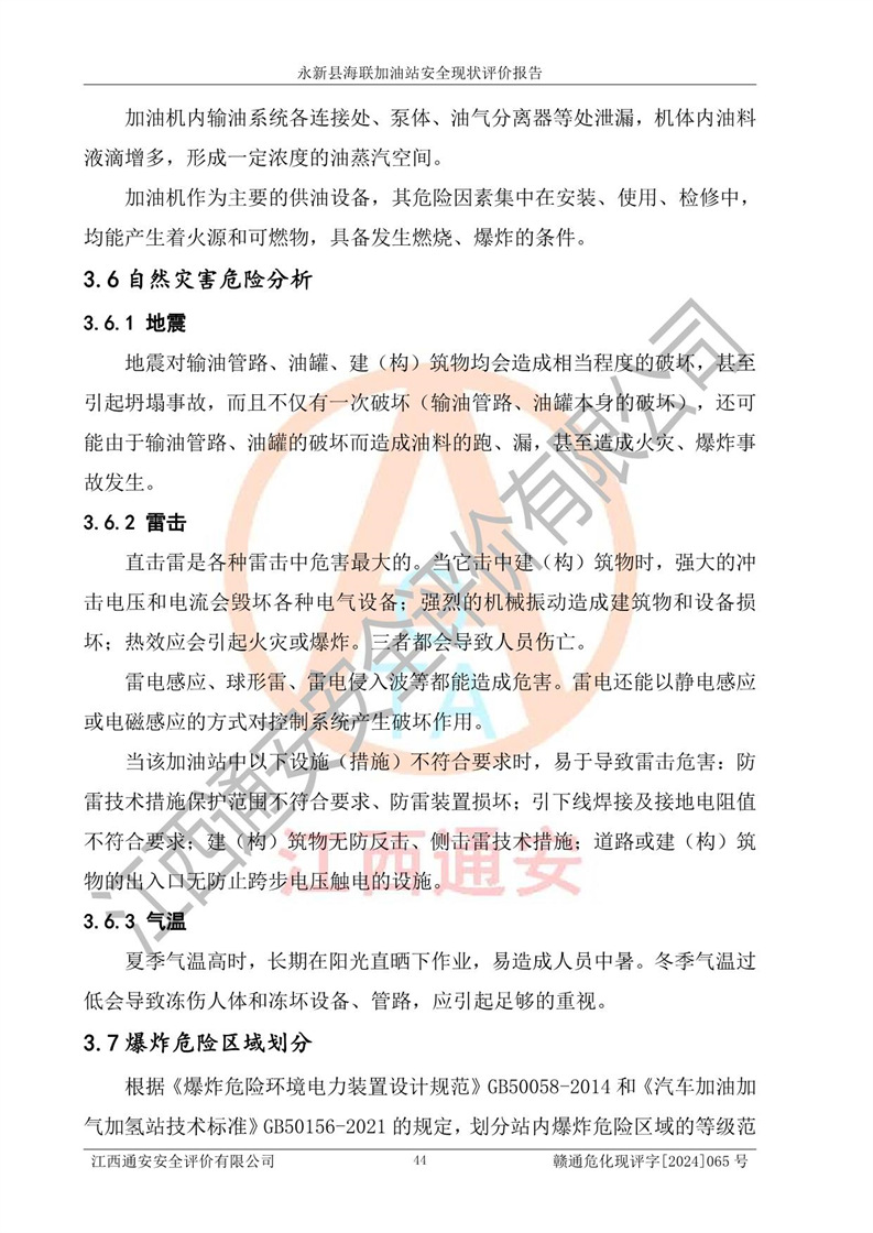 評價(jià)結(jié)論 | 永新縣海聯(lián)加油站站址合理,周邊環(huán)境良好,與敏感防護(hù)目標(biāo)間距符合規(guī)范要求,站區(qū)建構(gòu)筑物之間的防火間距、耐火等級符合標(biāo)準(zhǔn)要求,與總平面布置圖一致,加油卸油工藝及設(shè)備設(shè)施合理,工藝布置得當(dāng),防雷設(shè)施經(jīng)檢測合格,采取的工藝安全設(shè)施符合規(guī)范要求;該加油站制定了安全管理制度和操作規(guī)程,人員經(jīng)培訓(xùn)合格后上崗,安全管理人員經(jīng)考核合格并取得安全合格證,能按照法律法規(guī)要求開展安全生產(chǎn)管理工作。 綜上:永新縣海聯(lián)加油站符合《汽車加油加氣加氫站技術(shù)標(biāo)準(zhǔn)》GB50156-2021等標(biāo)準(zhǔn)規(guī)范的要求,安全風(fēng)險(xiǎn)可控,滿足危險(xiǎn)化學(xué)品經(jīng)營的安全條件。 | |||