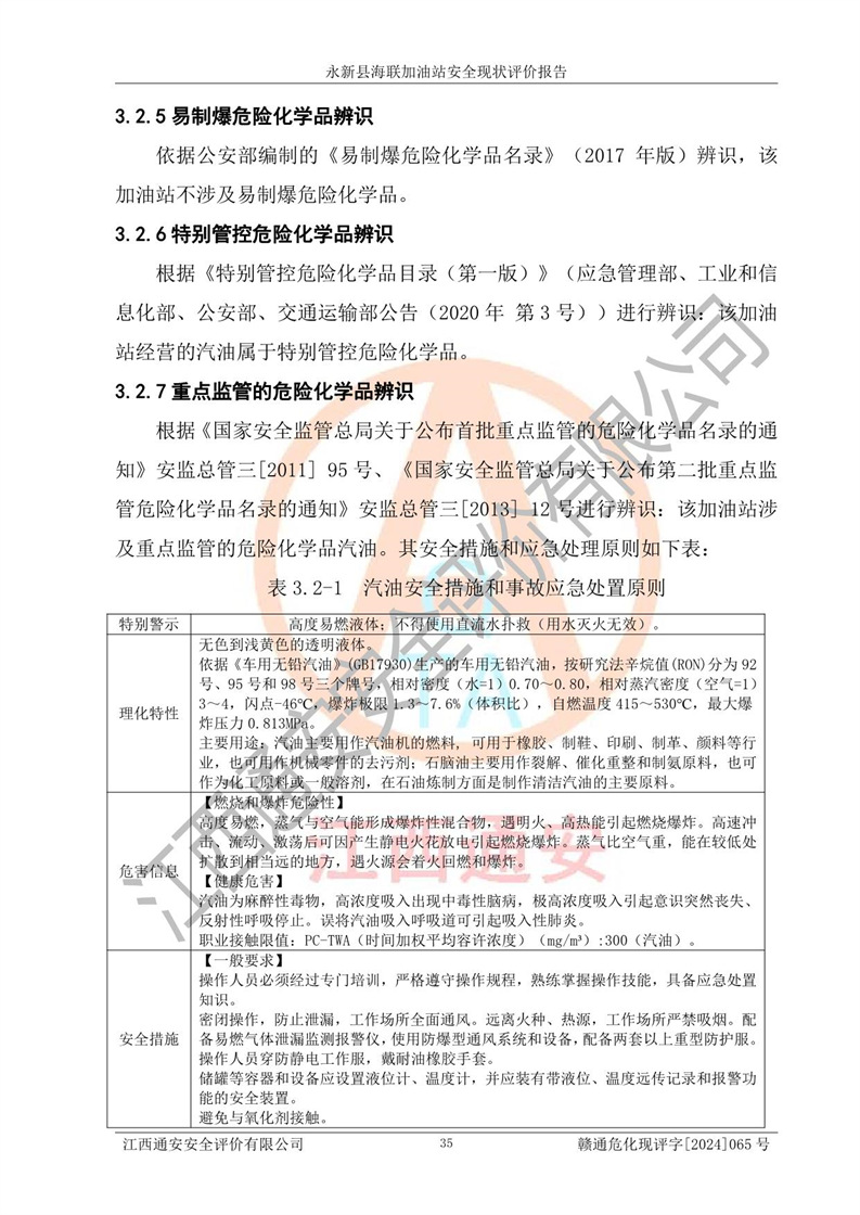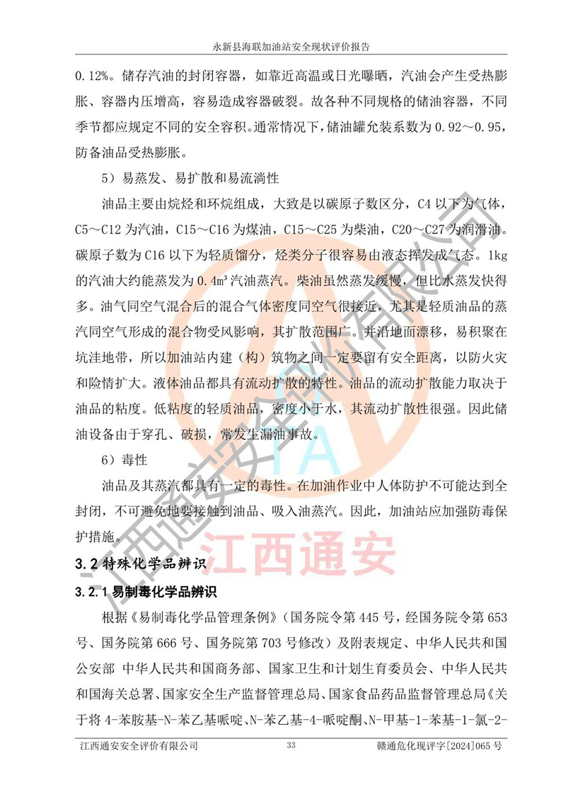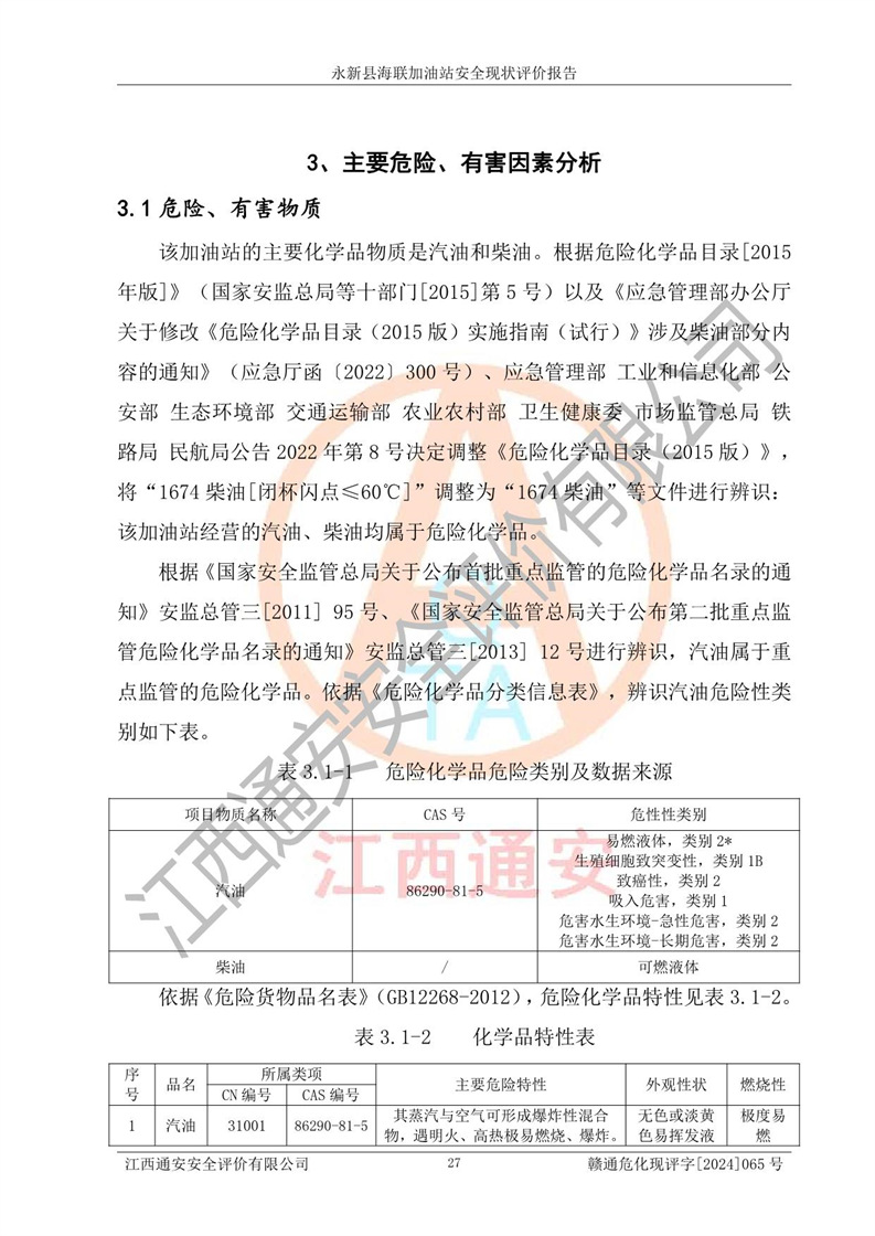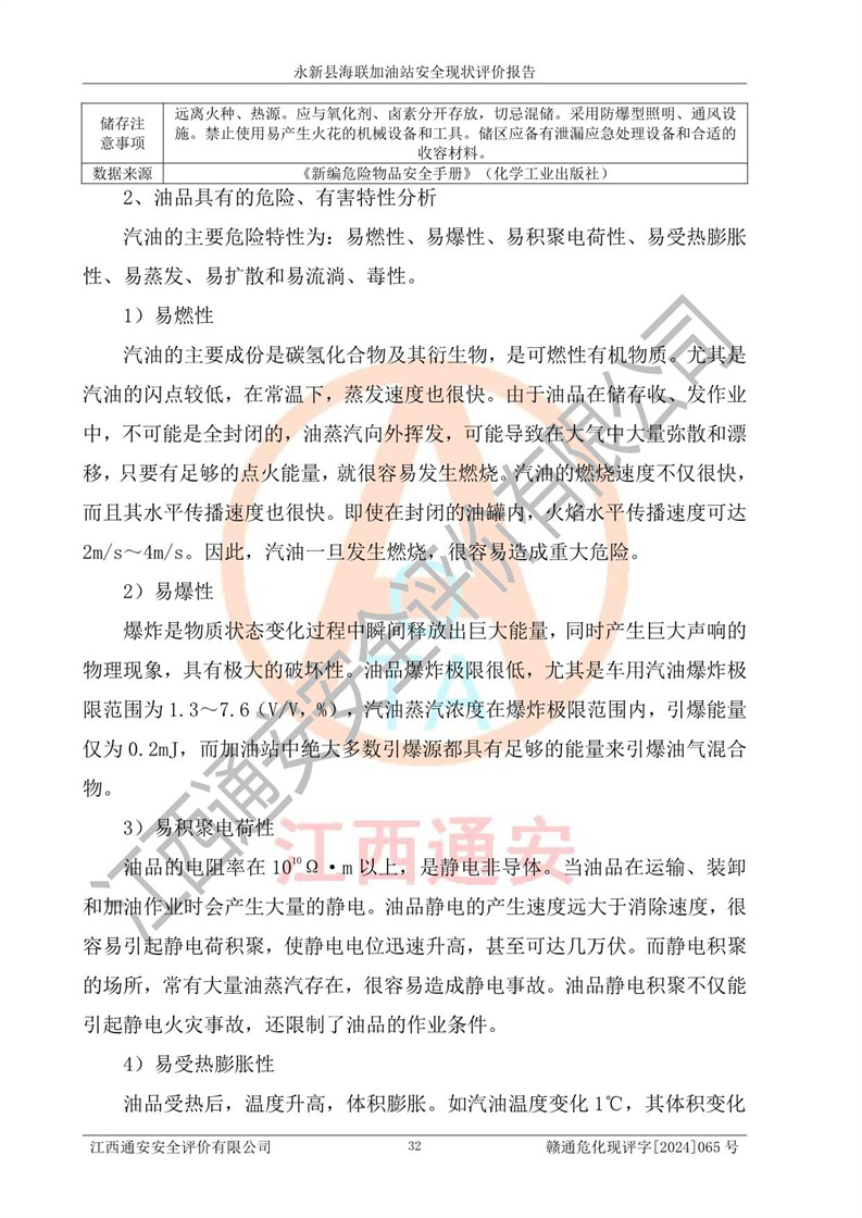 項(xiàng)目簡介 | 永新縣海聯(lián)加油站成立于2009年9月8日,住所位于江西省吉安市永新縣高市鄉(xiāng)蘆溪村319國道旁。該加油站經(jīng)營許可范圍:許可項(xiàng)目:成品油零售(依法須經(jīng)批準(zhǔn)的項(xiàng)目,經(jīng)相關(guān)部門批準(zhǔn)后方可開展經(jīng)營活動,具體經(jīng)營項(xiàng)目以相關(guān)部門批準(zhǔn)文件或許可證件為準(zhǔn))。 永新縣海聯(lián)加油站設(shè)2臺0#柴油/0#柴油雙槍加油機(jī),2臺92#汽油/95#汽油雙槍加油機(jī),1臺92#汽油/92#汽油雙槍加油機(jī);設(shè)置4臺SF雙層埋地儲罐,其中包括:1臺50m392#汽油雙層埋地儲罐;1臺35m392#汽油雙層埋地儲罐;1臺50m30#柴油雙層埋地儲罐;1臺35m395#汽油雙層埋地儲罐;總儲量為170m3,柴油折半后總?cè)莘e為145m3,加油站等級為二級,汽油卸油、加油設(shè)置了油氣回收系統(tǒng)。 該加油站的主要化學(xué)品物質(zhì)是汽油和柴油。根據(jù)危險(xiǎn)化學(xué)品目錄[2015年版]》(**安監(jiān)總局等十部門[2015]第5號)以及《應(yīng)急管理部辦公廳關(guān)于修改《危險(xiǎn)化學(xué)品目錄(2015版)實(shí)施指南(試行)》涉及柴油部分內(nèi)容的通知》(應(yīng)急廳函〔2022〕300號)、應(yīng)急管理部 工業(yè)和信息化部 公安部 生態(tài)環(huán)境部 交通運(yùn)輸部 農(nóng)業(yè)農(nóng)村部 衛(wèi)生健康委 市場監(jiān)管總局 鐵路局 民航局公告2022年第8號決定調(diào)整《危險(xiǎn)化學(xué)品目錄(2015版)》,將“1674柴油[閉杯閃點(diǎn)≤60℃]”調(diào)整為“1674柴油”等文件進(jìn)行辨識:該加油站經(jīng)營的汽油、柴油均屬于危險(xiǎn)化學(xué)品。 | |||
