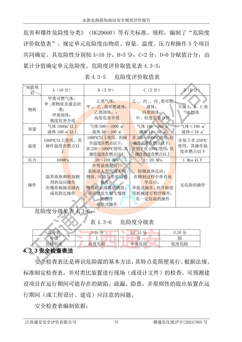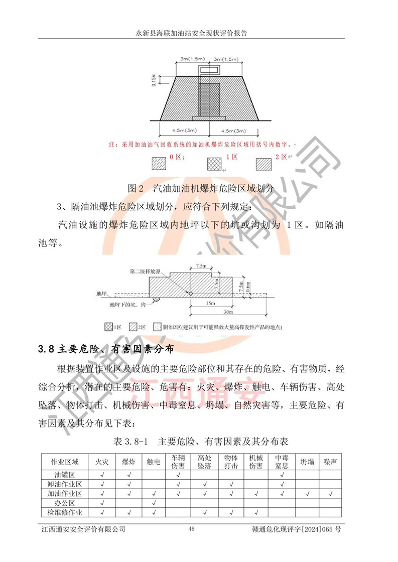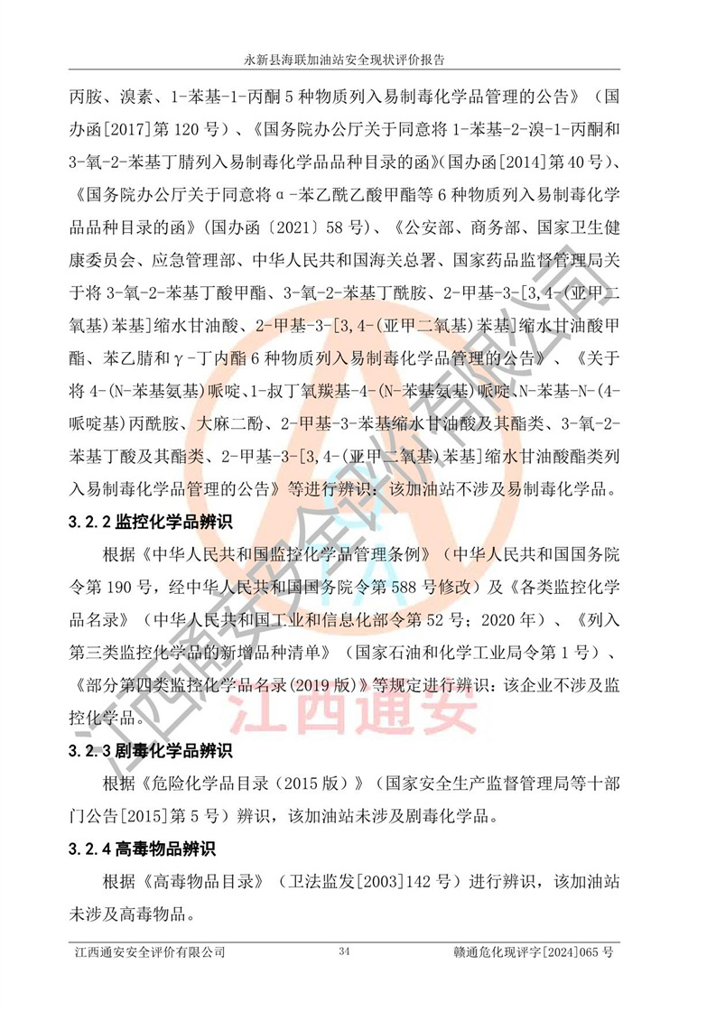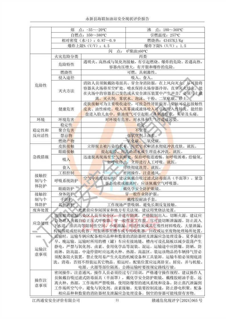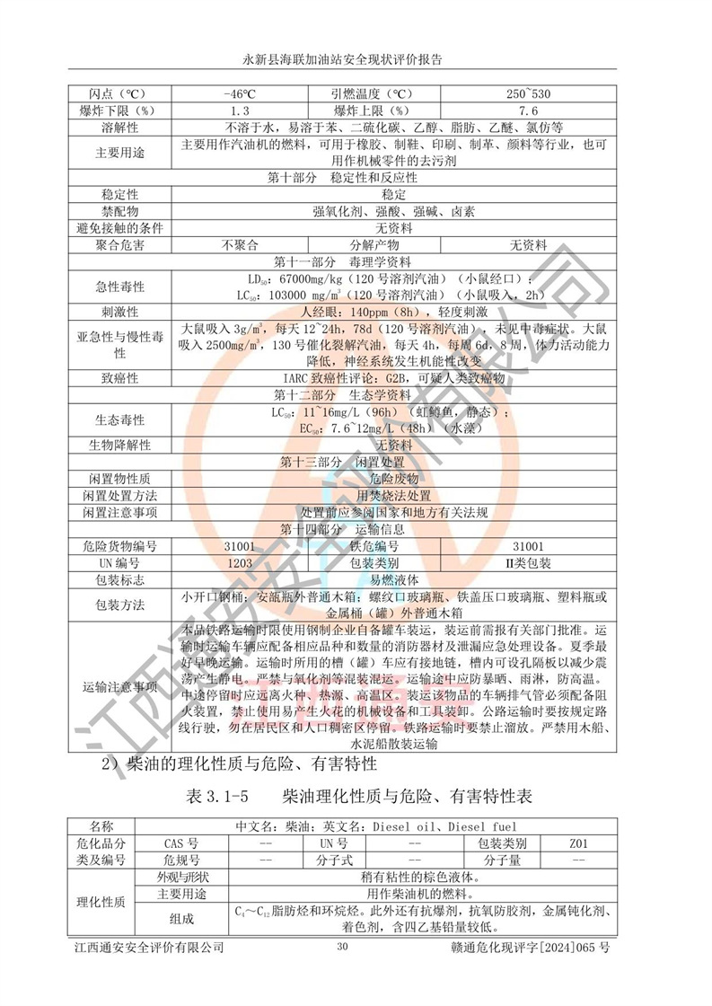 項(xiàng)目簡介 | 永新縣海聯(lián)加油站成立于2009年9月8日,住所位于江西省吉安市永新縣高市鄉(xiāng)蘆溪村319國道旁。該加油站經(jīng)營許可范圍:許可項(xiàng)目:成品油零售(依法須經(jīng)批準(zhǔn)的項(xiàng)目,經(jīng)相關(guān)部門批準(zhǔn)后方可開展經(jīng)營活動,具體經(jīng)營項(xiàng)目以相關(guān)部門批準(zhǔn)文件或許可證件為準(zhǔn))。 永新縣海聯(lián)加油站設(shè)2臺0#柴油/0#柴油雙槍加油機(jī),2臺92#汽油/95#汽油雙槍加油機(jī),1臺92#汽油/92#汽油雙槍加油機(jī);設(shè)置4臺SF雙層埋地儲罐,其中包括:1臺50m392#汽油雙層埋地儲罐;1臺35m392#汽油雙層埋地儲罐;1臺50m30#柴油雙層埋地儲罐;1臺35m395#汽油雙層埋地儲罐;總儲量為170m3,柴油折半后總?cè)莘e為145m3,加油站等級為二級,汽油卸油、加油設(shè)置了油氣回收系統(tǒng)。 該加油站的主要化學(xué)品物質(zhì)是汽油和柴油。根據(jù)危險(xiǎn)化學(xué)品目錄[2015年版]》(**安監(jiān)總局等十部門[2015]第5號)以及《應(yīng)急管理部辦公廳關(guān)于修改《危險(xiǎn)化學(xué)品目錄(2015版)實(shí)施指南(試行)》涉及柴油部分內(nèi)容的通知》(應(yīng)急廳函〔2022〕300號)、應(yīng)急管理部 工業(yè)和信息化部 公安部 生態(tài)環(huán)境部 交通運(yùn)輸部 農(nóng)業(yè)農(nóng)村部 衛(wèi)生健康委 市場監(jiān)管總局 鐵路局 民航局公告2022年第8號決定調(diào)整《危險(xiǎn)化學(xué)品目錄(2015版)》,將“1674柴油[閉杯閃點(diǎn)≤60℃]”調(diào)整為“1674柴油”等文件進(jìn)行辨識:該加油站經(jīng)營的汽油、柴油均屬于危險(xiǎn)化學(xué)品。 | |||