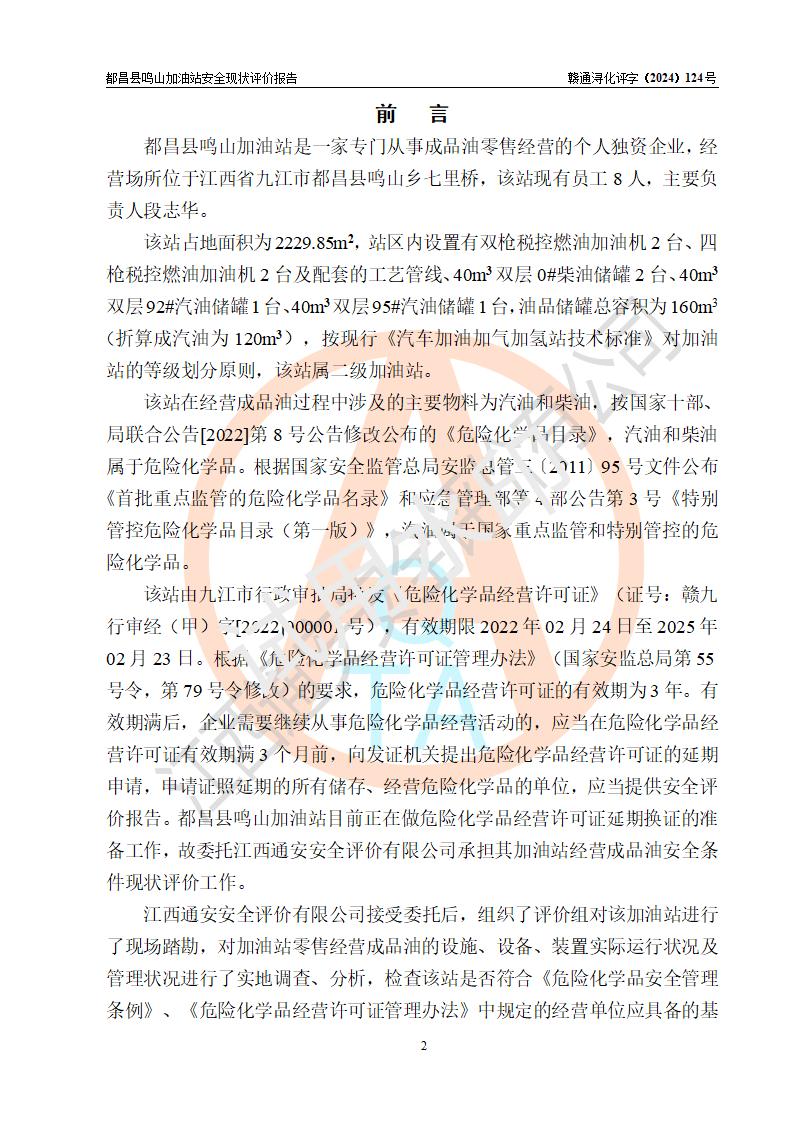 評價報告名稱 | 都昌縣鳴山加油站安全現(xiàn)狀評價報告 | |||