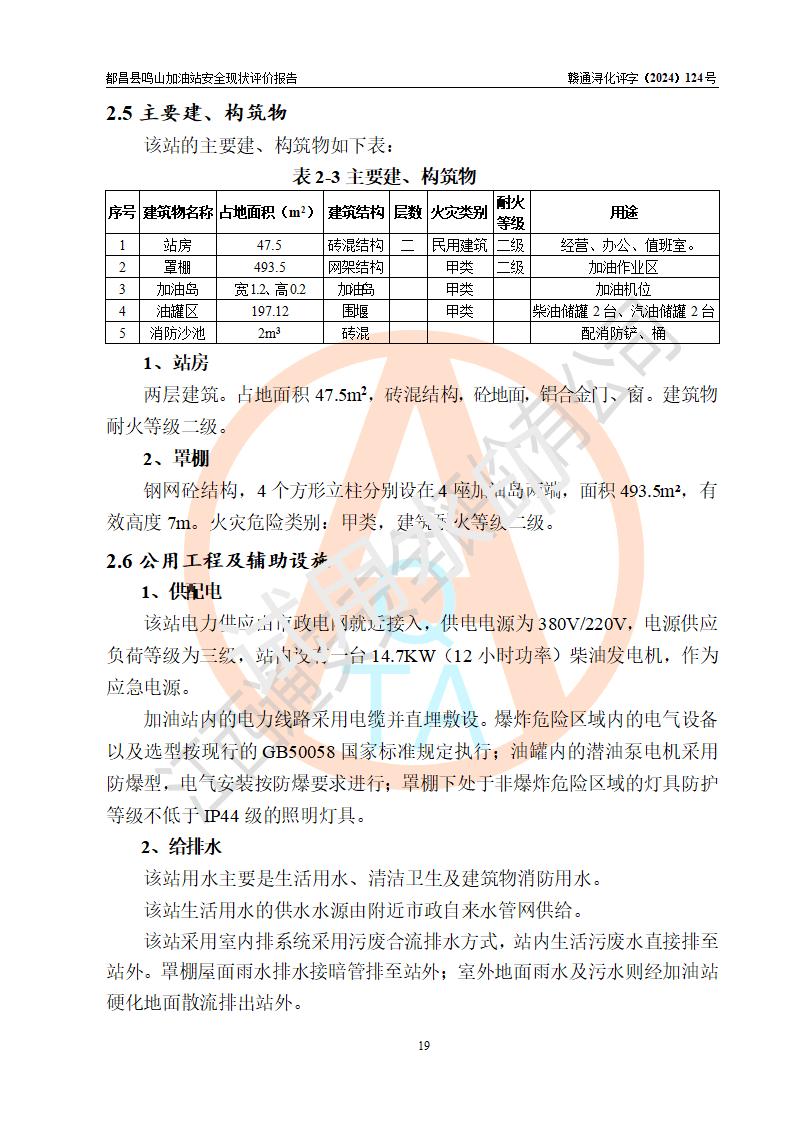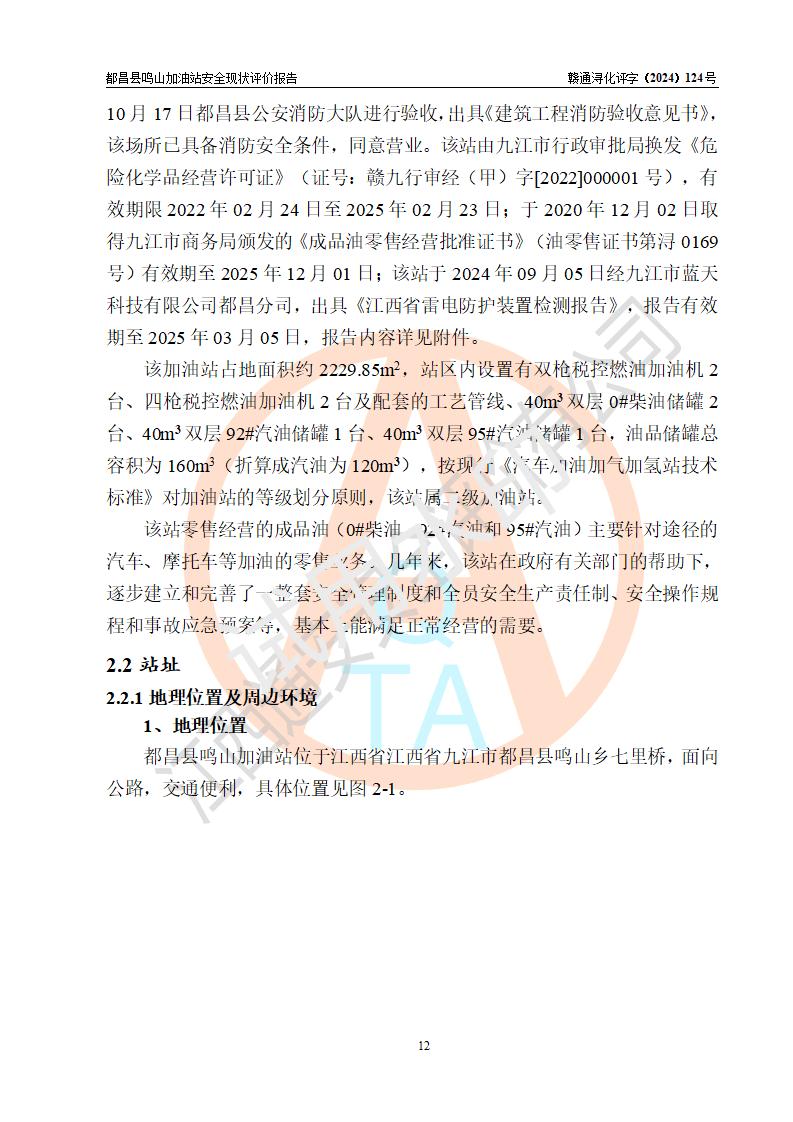 項目簡介 | 都昌縣鳴山加油站是一家專門從事成品油零售經(jīng)營的個人獨資企業(yè),經(jīng)營場所位于江西省九江市都昌縣鳴山鄉(xiāng)七里橋,該站現(xiàn)有員工8人,主要負責(zé)人段志華。 該站占地面積為2229.85m2,站區(qū)內(nèi)設(shè)置有雙槍稅控燃油加油機2臺、四槍稅控燃油加油機2臺及配套的工藝管線、40m3雙層0#柴油儲罐2臺、40m3雙層92#汽油儲罐1臺、40m3雙層95#汽油儲罐1臺,油品儲罐總?cè)莘e為160m3(折算成汽油為120m3),按現(xiàn)行《汽車加油加氣加氫站技術(shù)標(biāo)準(zhǔn)》對加油站的等級劃分原則,該站屬二級加油站。 該站由九江市行政審批局換發(fā)《危險化學(xué)品經(jīng)營許可證》(證號:贛九行審經(jīng)(甲)字[2022]000001號),**期限2022年02月24日至2025年02月23日。 | |||