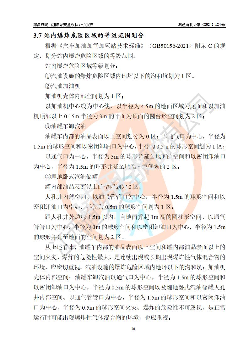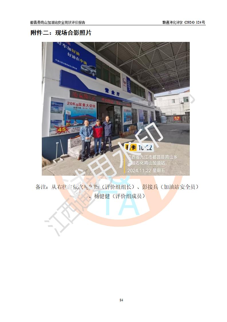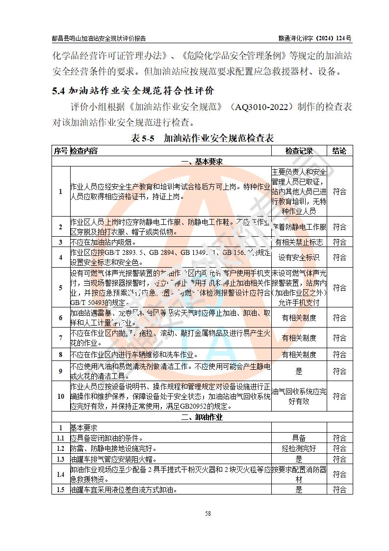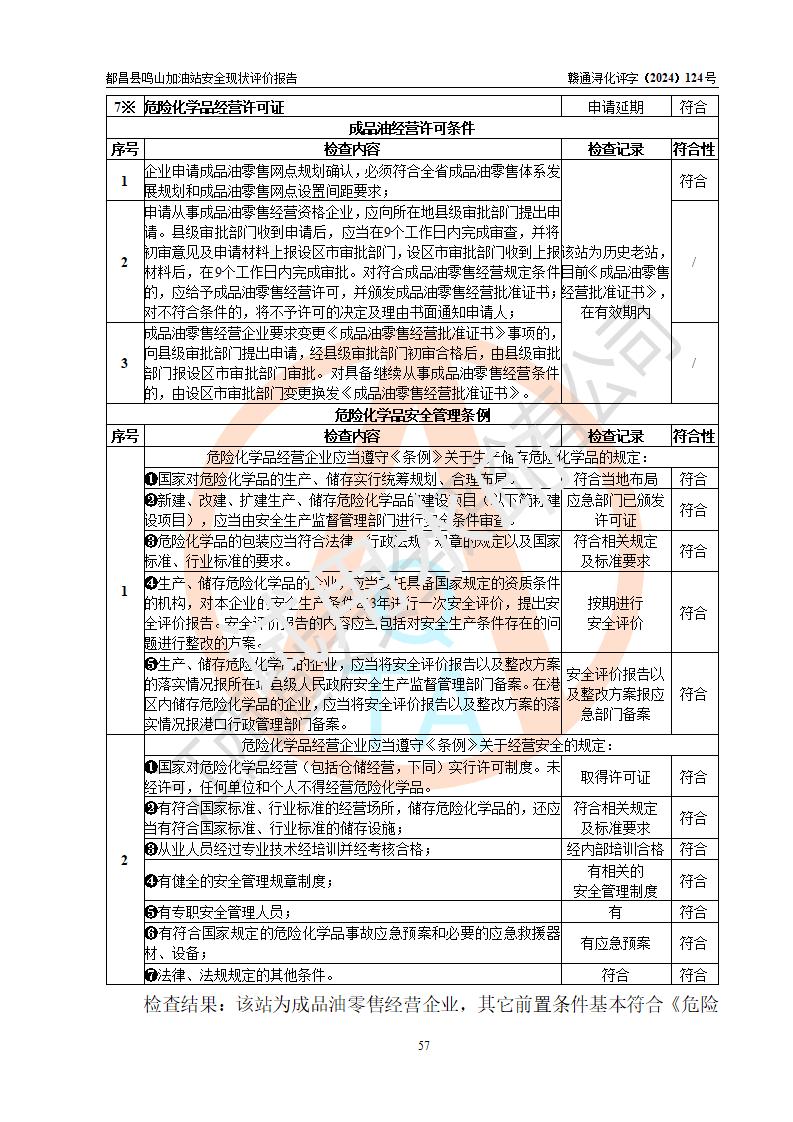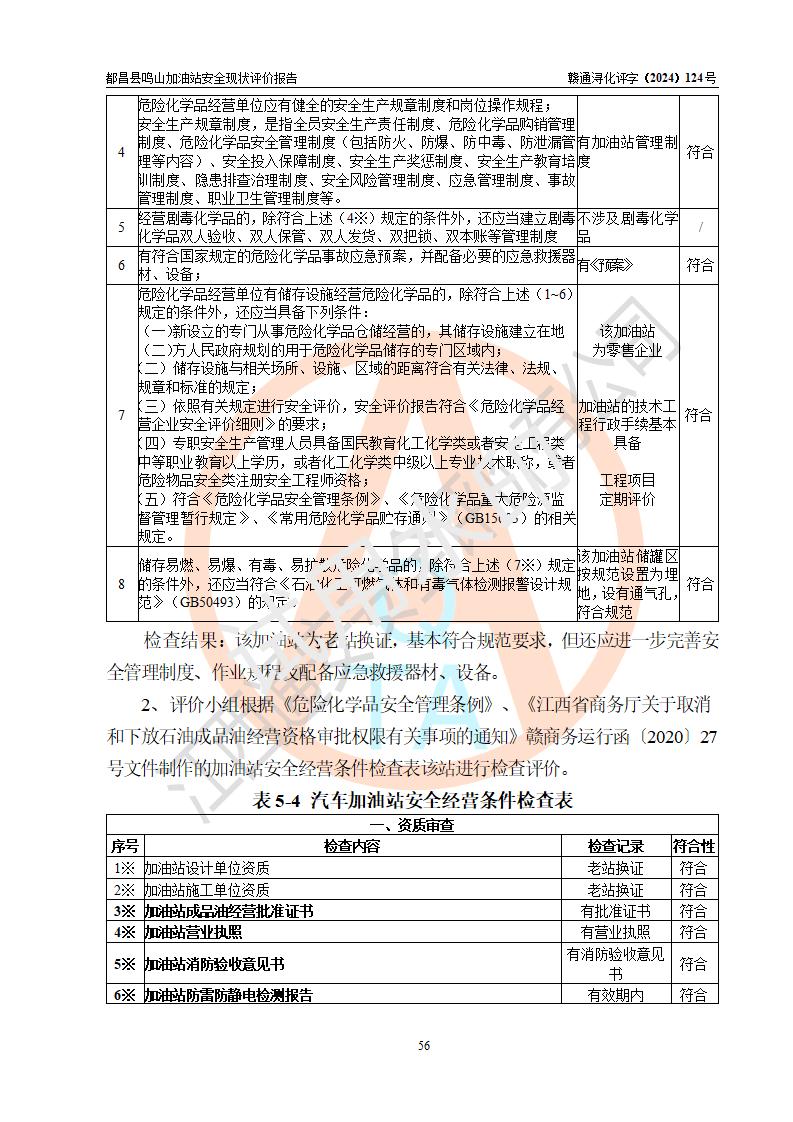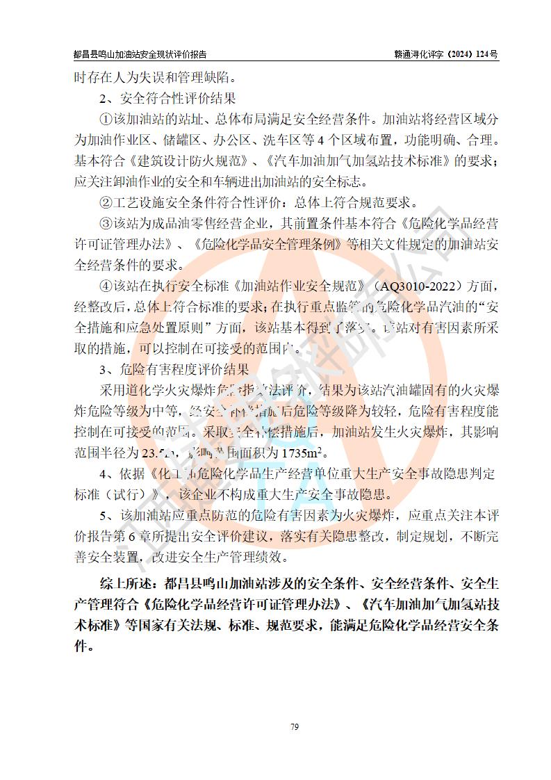 評價結(jié)論 | 都昌縣鳴山加油站涉及的安全條件、安全經(jīng)營條件、安全生產(chǎn)管理符合《危險化學(xué)品經(jīng)營許可證管理辦法》、《汽車加油加氣加氫站技術(shù)標(biāo)準(zhǔn)》等**有關(guān)法規(guī)、標(biāo)準(zhǔn)、規(guī)范要求,能滿足危險化學(xué)品經(jīng)營安全條件。 | |||