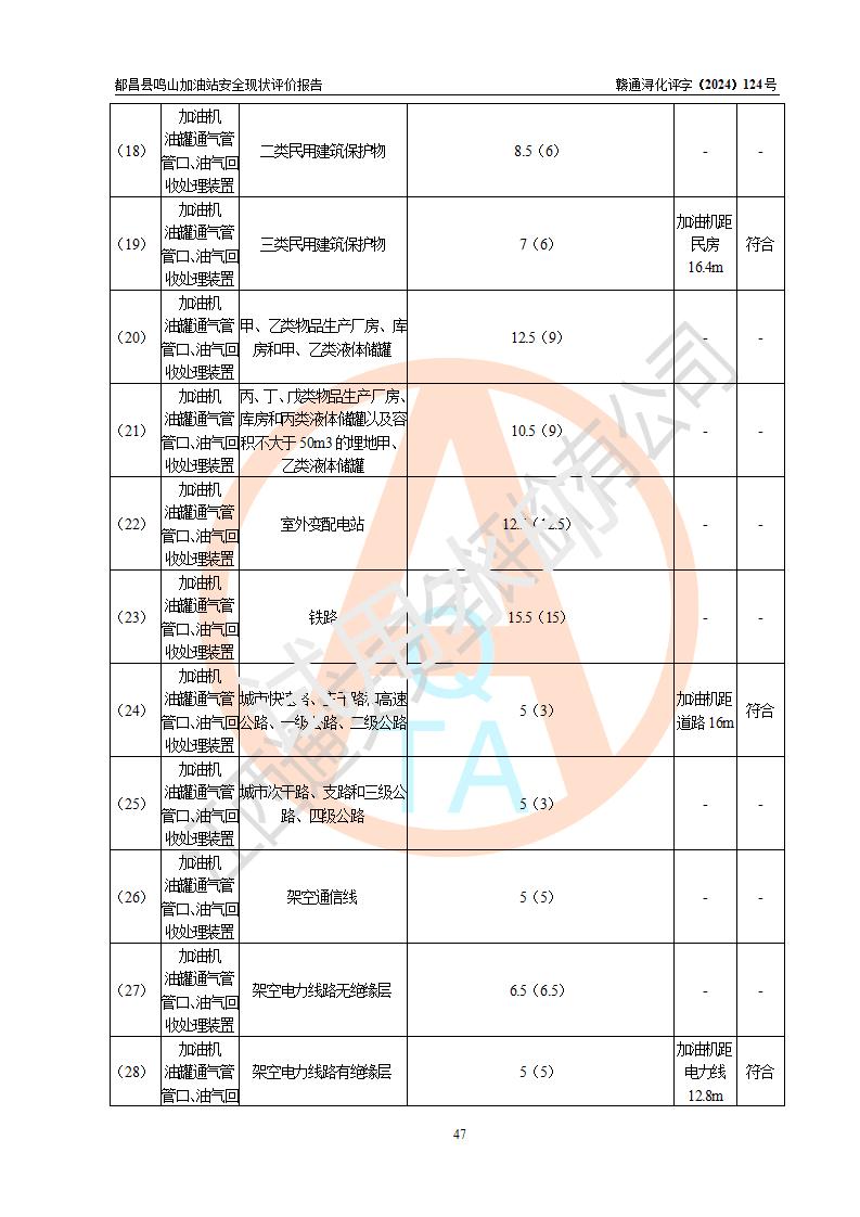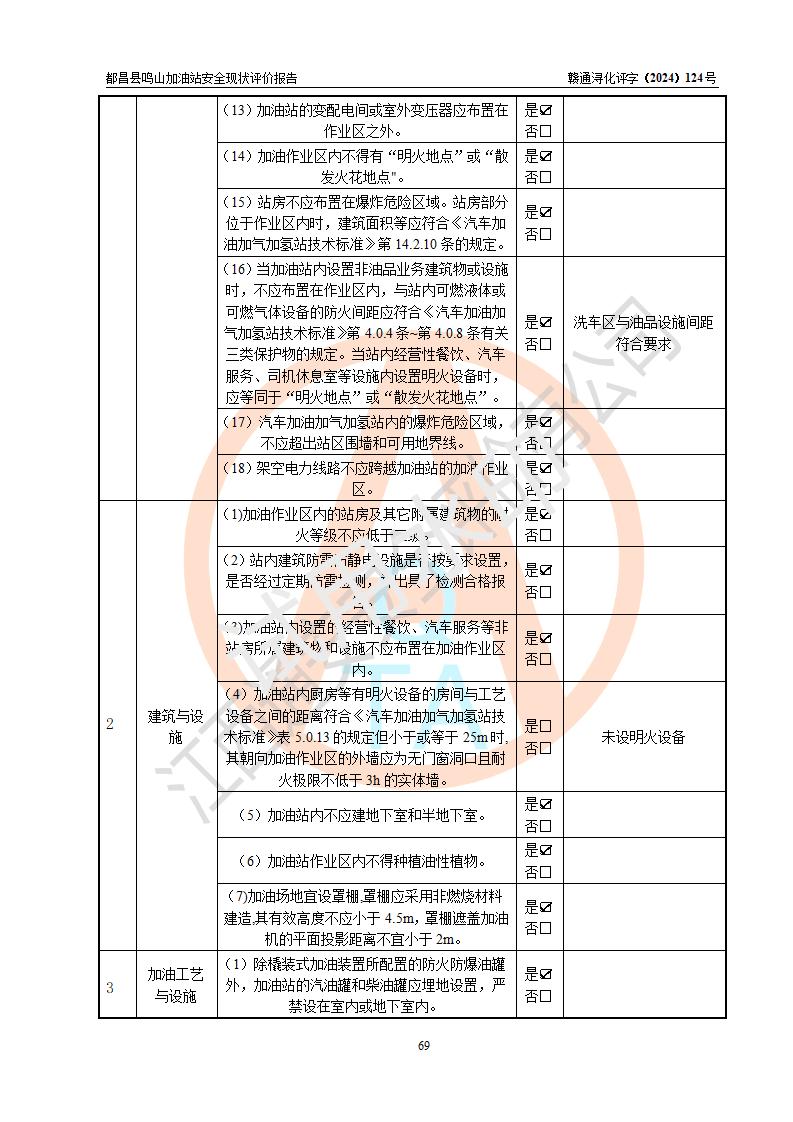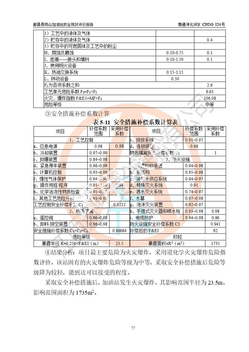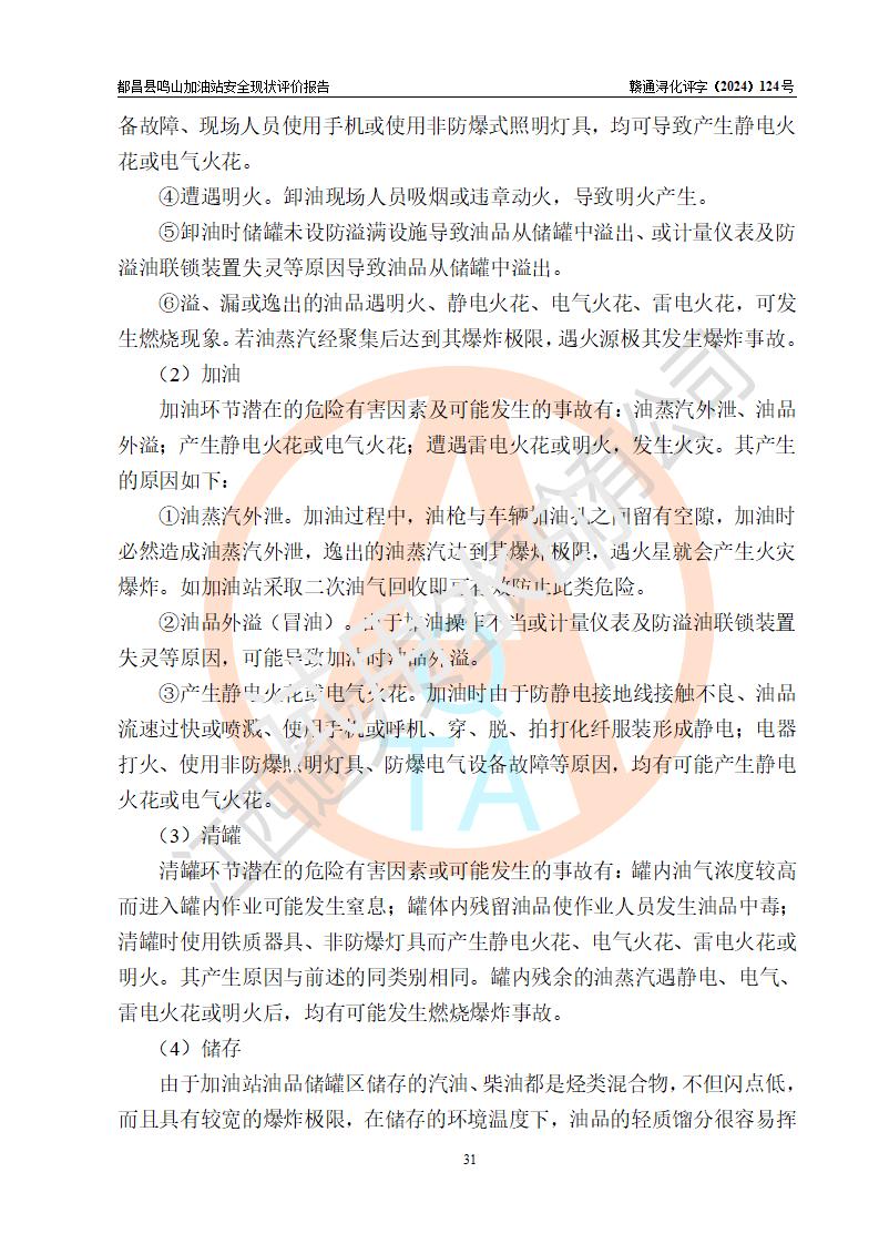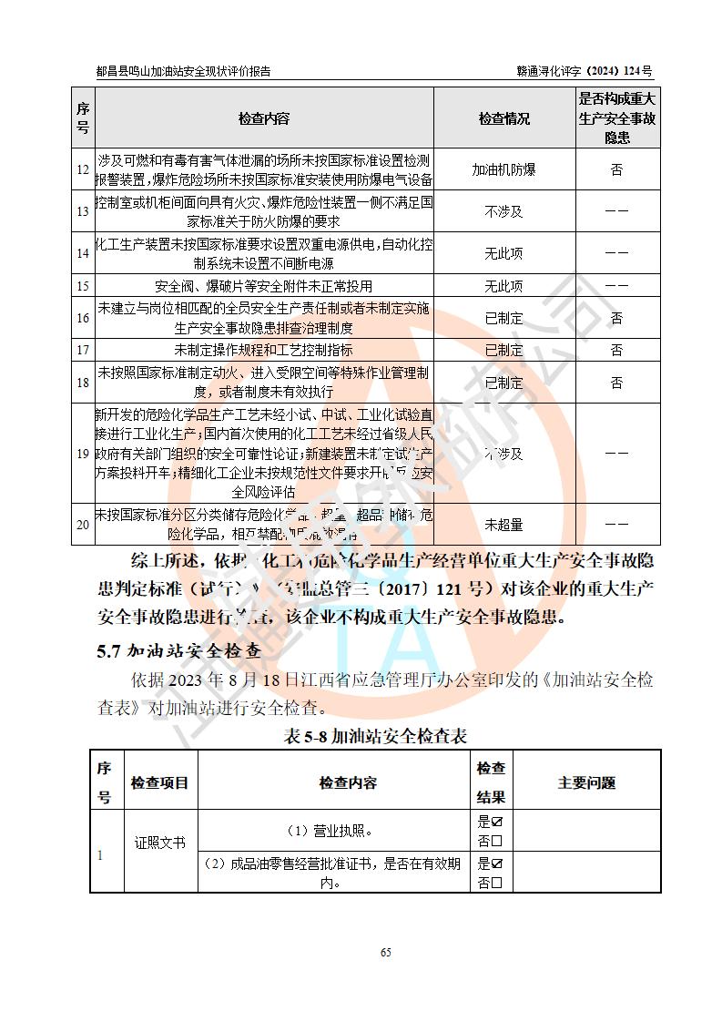 評價結(jié)論 | 都昌縣鳴山加油站涉及的安全條件、安全經(jīng)營條件、安全生產(chǎn)管理符合《危險化學(xué)品經(jīng)營許可證管理辦法》、《汽車加油加氣加氫站技術(shù)標(biāo)準(zhǔn)》等**有關(guān)法規(guī)、標(biāo)準(zhǔn)、規(guī)范要求,能滿足危險化學(xué)品經(jīng)營安全條件。 | |||