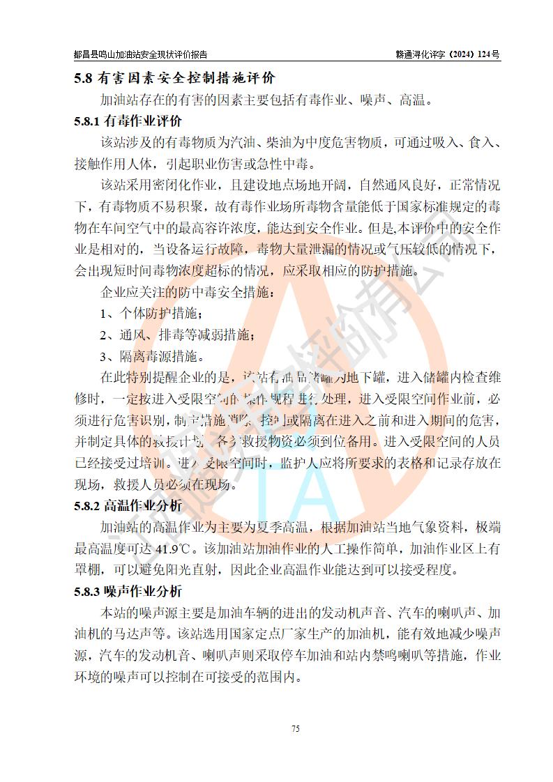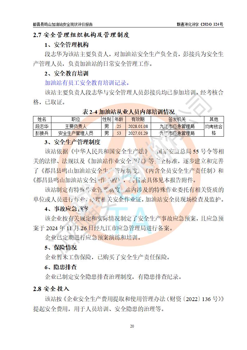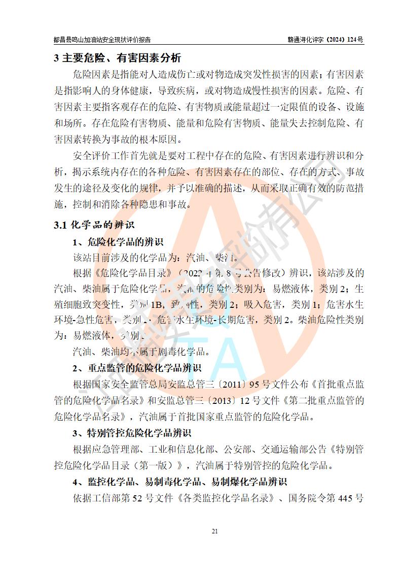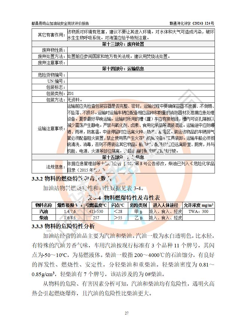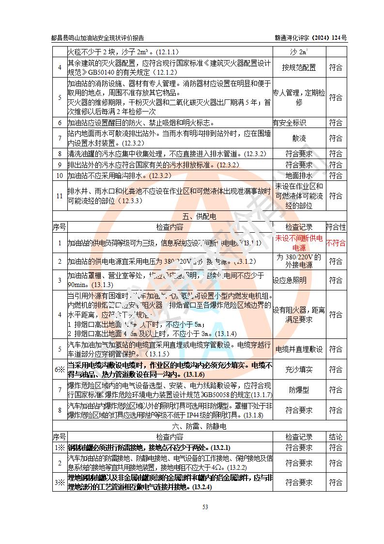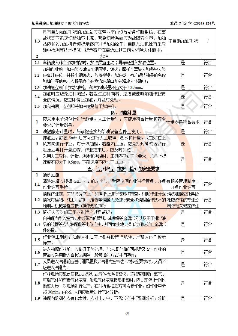評價結(jié)論 | 都昌縣鳴山加油站涉及的安全條件、安全經(jīng)營條件、安全生產(chǎn)管理符合《危險化學(xué)品經(jīng)營許可證管理辦法》、《汽車加油加氣加氫站技術(shù)標(biāo)準(zhǔn)》等**有關(guān)法規(guī)、標(biāo)準(zhǔn)、規(guī)范要求,能滿足危險化學(xué)品經(jīng)營安全條件。 | |||