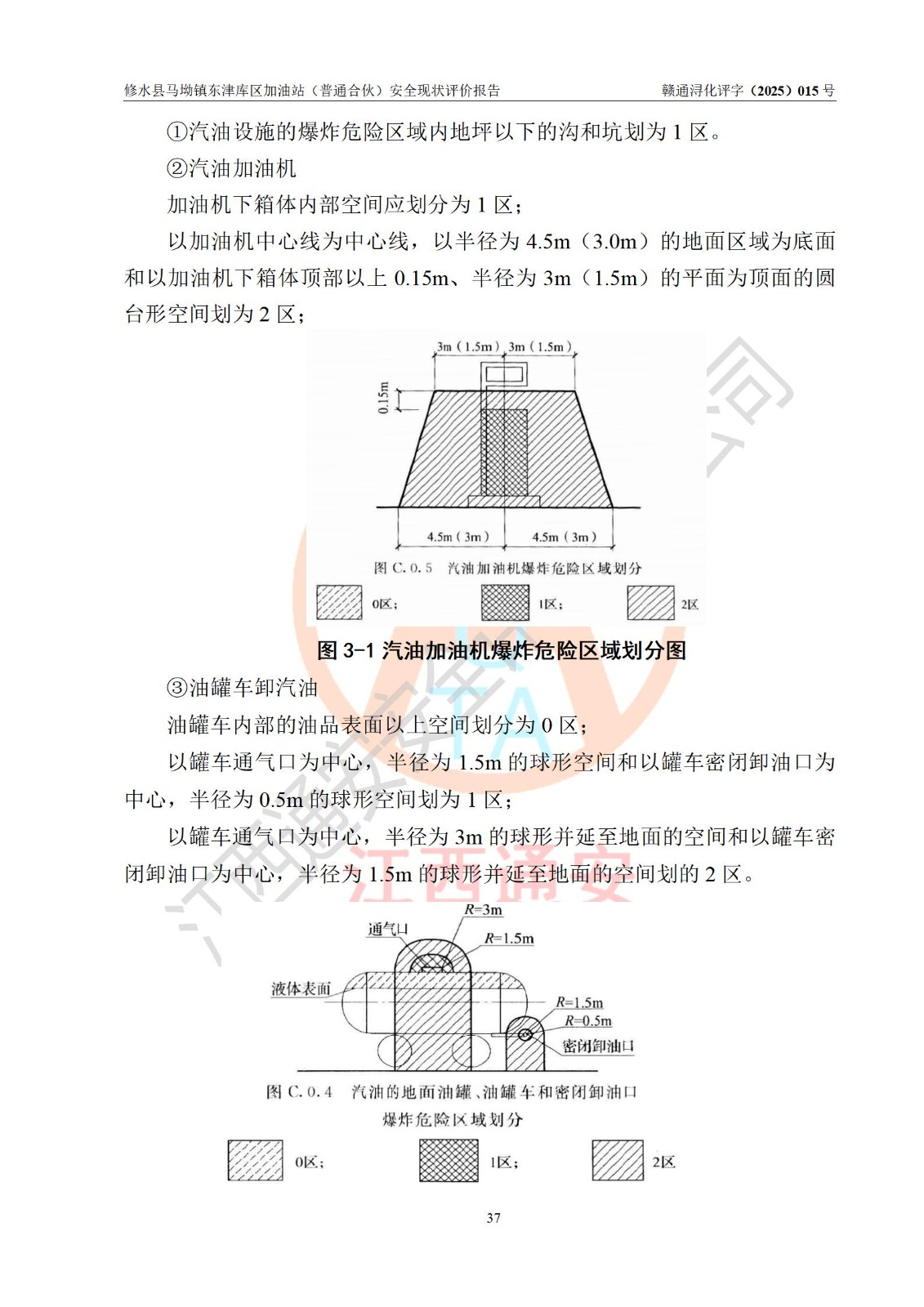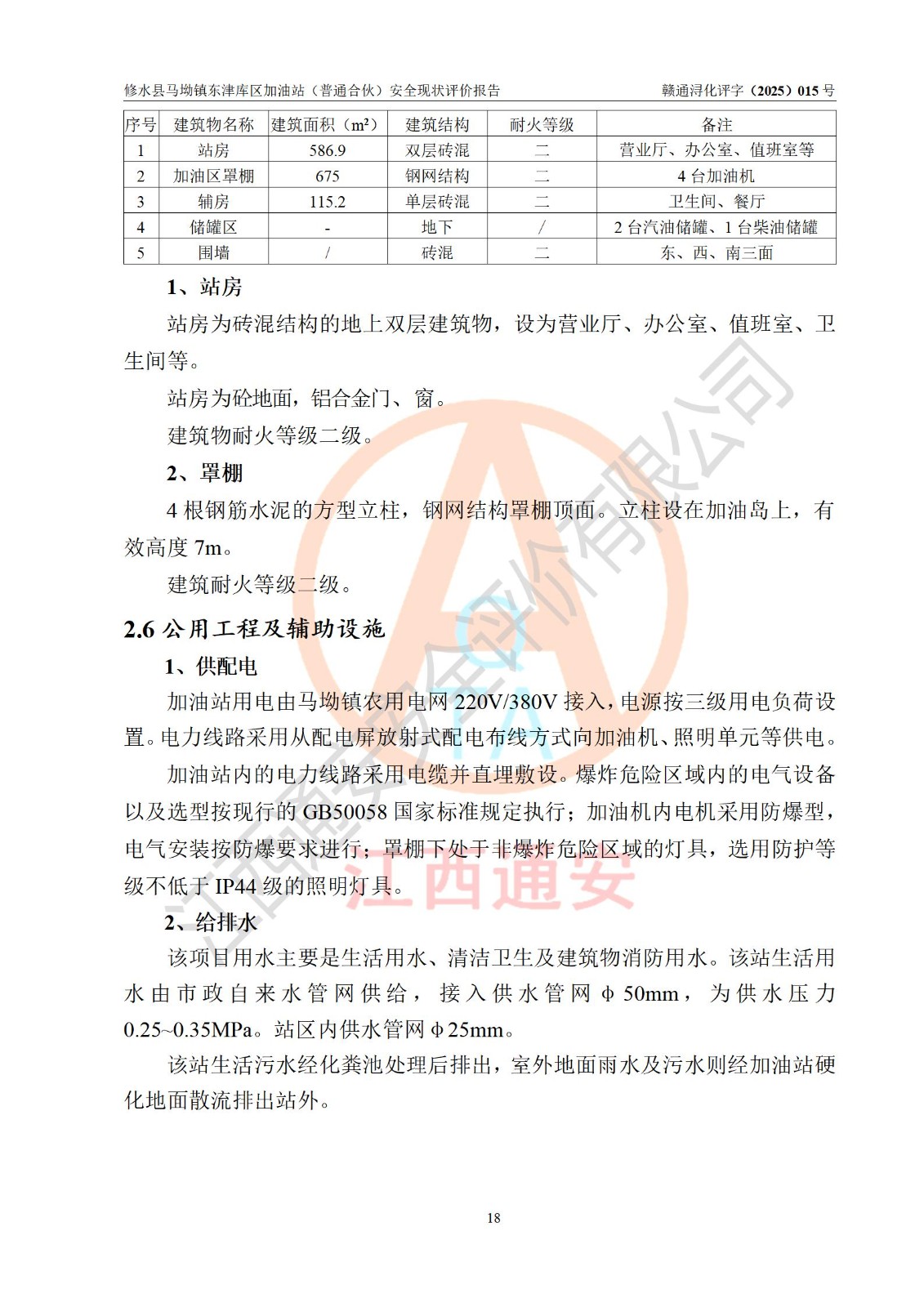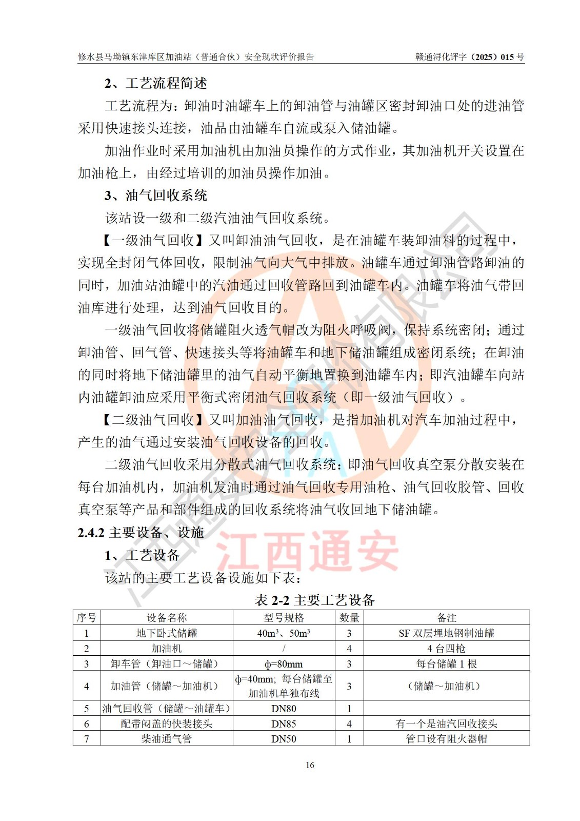 項(xiàng)目簡(jiǎn)介 | 修水縣馬坳鎮(zhèn)東津庫(kù)區(qū)加油站(普通合伙)是一家專門從事成品油零售經(jīng)營(yíng)的普通合伙企業(yè),經(jīng)營(yíng)場(chǎng)所位于江西省九江市修水縣馬坳鎮(zhèn)東津村?,F(xiàn)有從業(yè)人員8名,其中安全管理人員1人,加油站負(fù)責(zé)人徐益林。 該加油站占地面積2666.66m2,站區(qū)內(nèi)設(shè)置有4臺(tái)四槍程控燃油加油機(jī)及配套的工藝管線,設(shè)有SF雙層儲(chǔ)罐3臺(tái),其中40m3的92#汽油儲(chǔ)罐1臺(tái)、50m3的0#柴油儲(chǔ)罐1臺(tái)、40m3的95#汽油儲(chǔ)罐1臺(tái),油品儲(chǔ)罐總?cè)莘e為130m3(折算成汽油為105m3),按現(xiàn)行《汽車加油加氣加氫站技術(shù)標(biāo)準(zhǔn)》對(duì)加油站的等級(jí)劃分原則,屬二級(jí)加油站。 該站由九江市行政審批局換發(fā)《危險(xiǎn)化學(xué)品經(jīng)營(yíng)許可證》(證號(hào):贛九行審經(jīng)(甲)字[2022]000055號(hào)),**期限2022年04月09日至2025年04月08日。 | |||