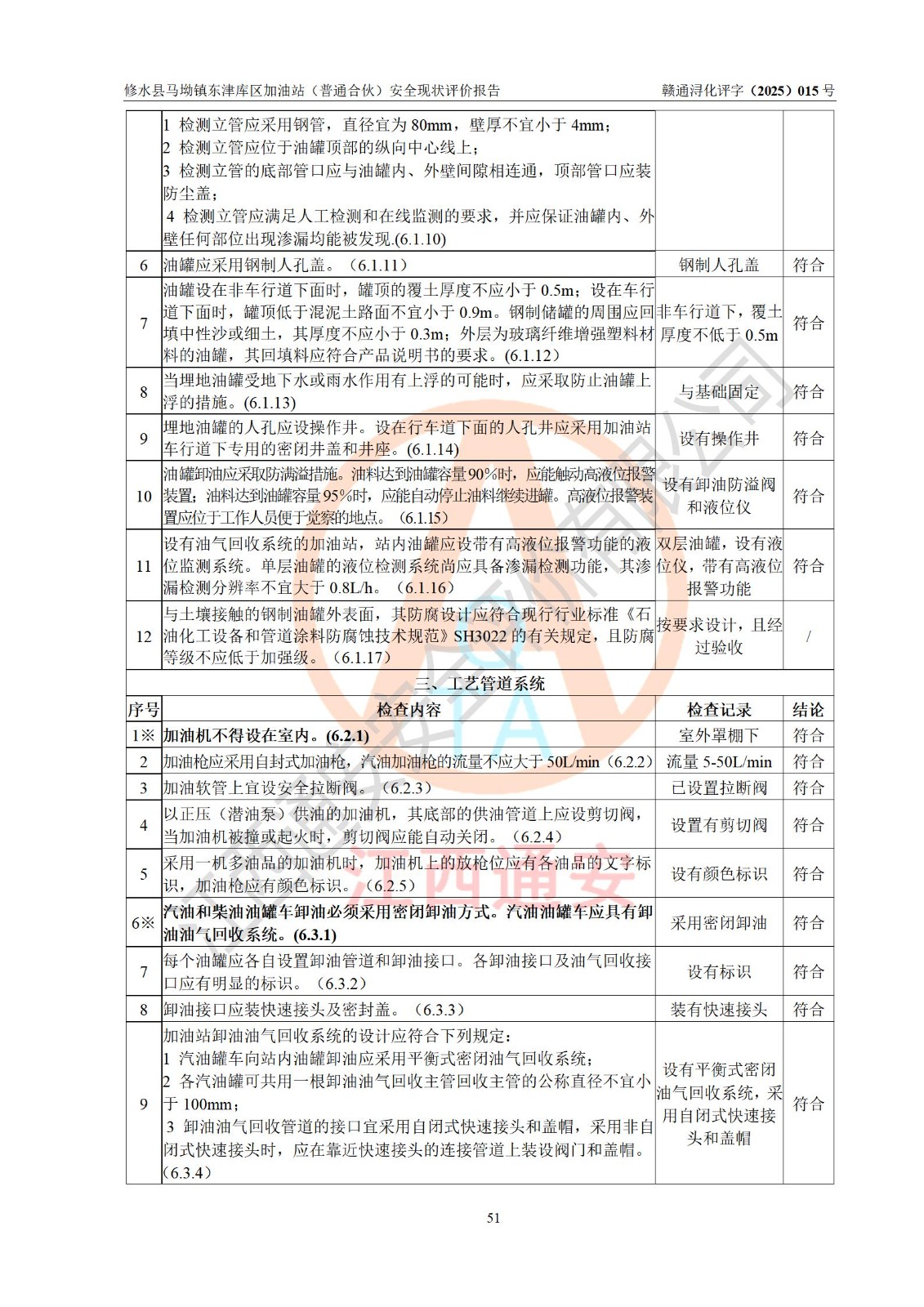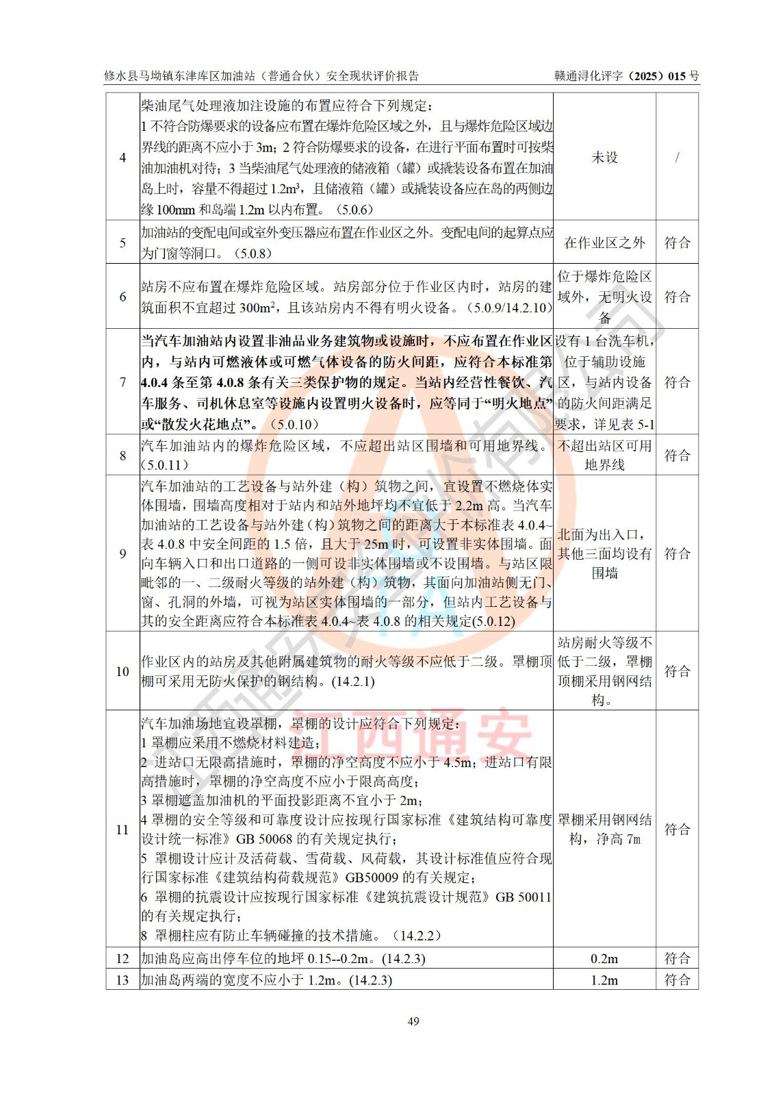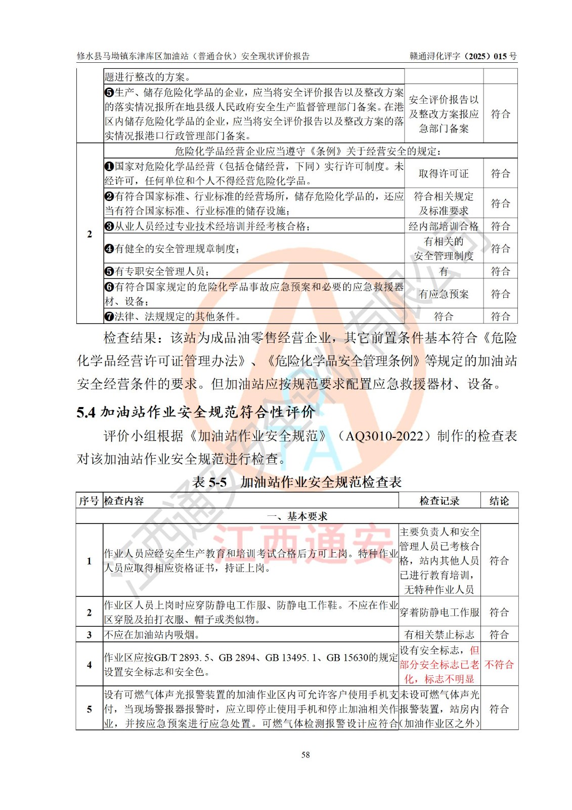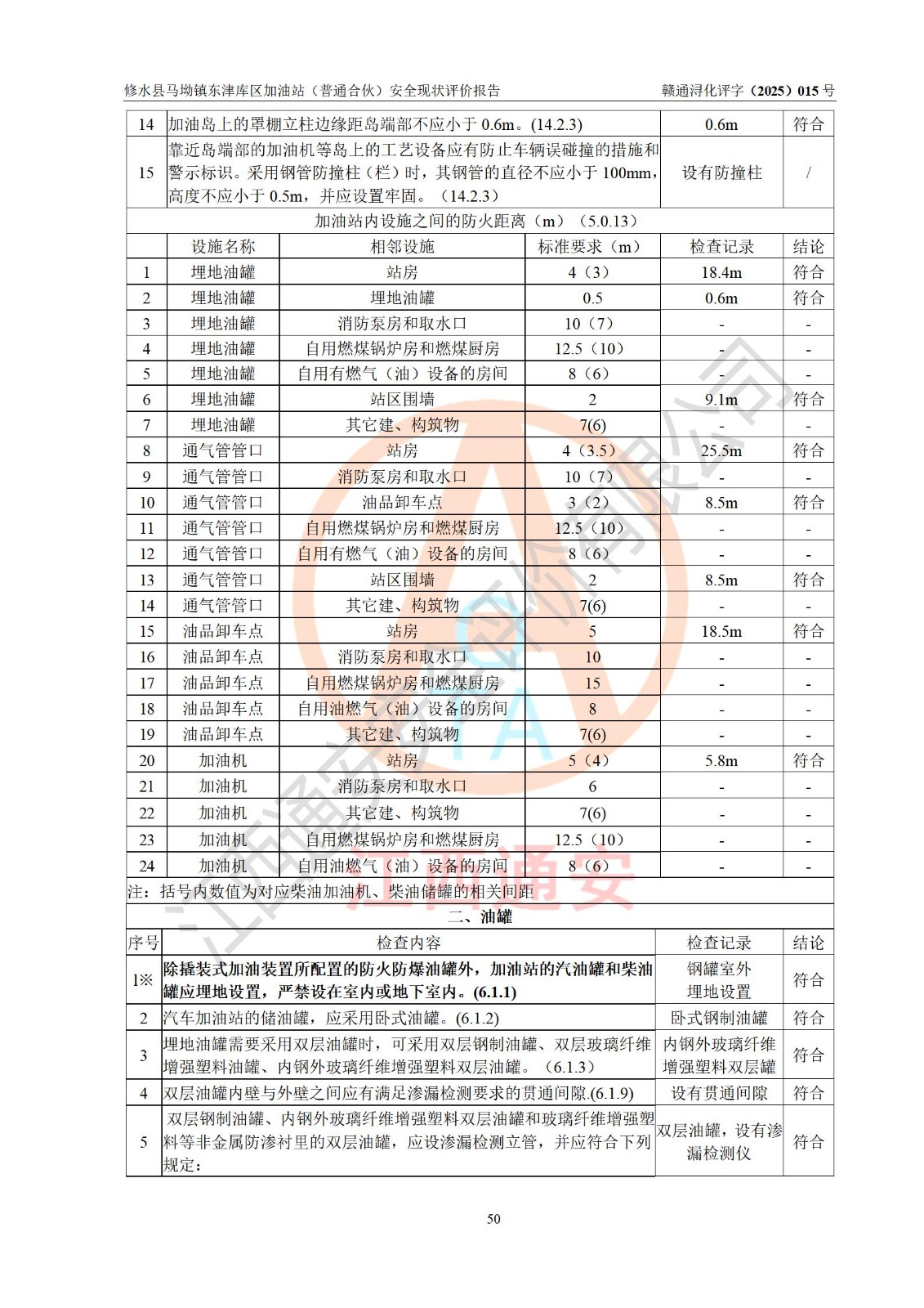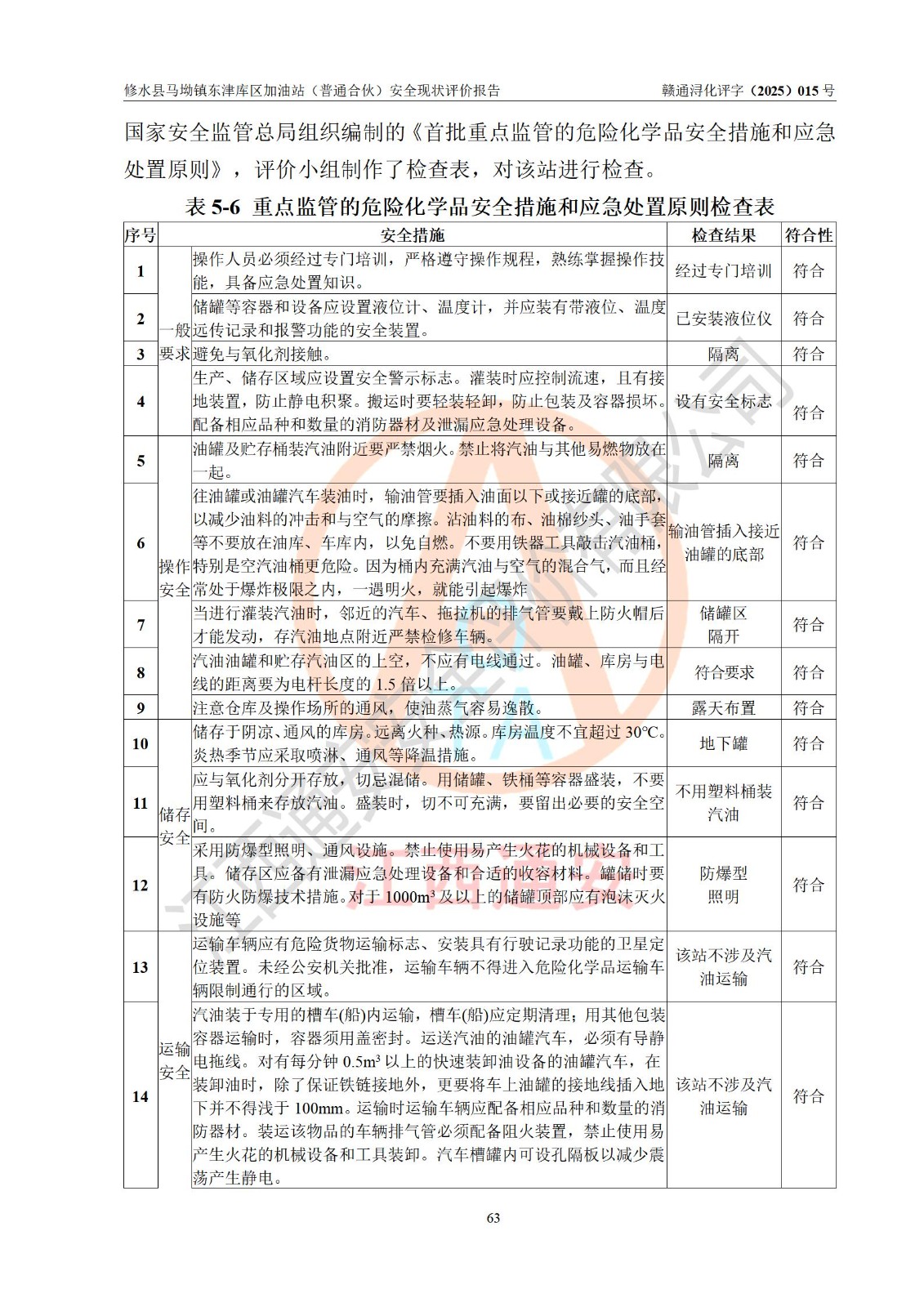 評(píng)價(jià)結(jié)論 | 修水縣馬坳鎮(zhèn)東津庫(kù)區(qū)加油站(普通合伙)涉及的安全條件、安全經(jīng)營(yíng)條件、安全生產(chǎn)管理符合《危險(xiǎn)化學(xué)品經(jīng)營(yíng)許可證管理辦法》、《汽車加油加氣加氫站技術(shù)標(biāo)準(zhǔn)》等**有關(guān)法規(guī)、標(biāo)準(zhǔn)、規(guī)范要求,能滿足危險(xiǎn)化學(xué)品經(jīng)營(yíng)安全條件。 | |||