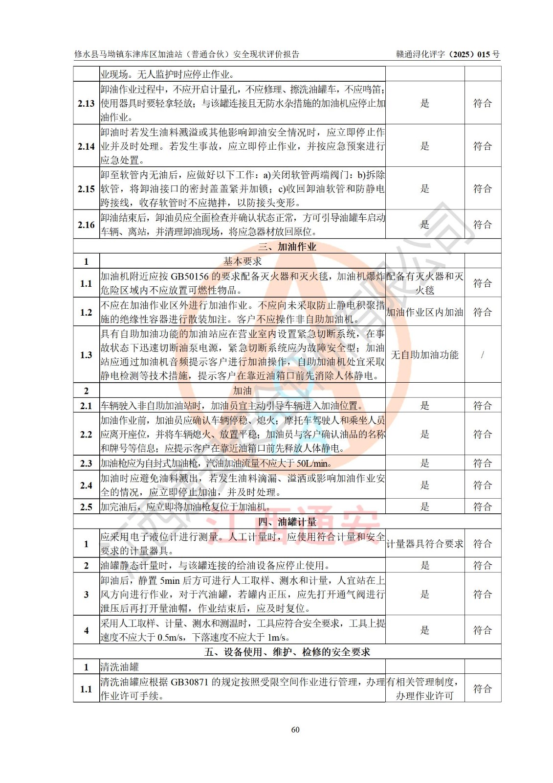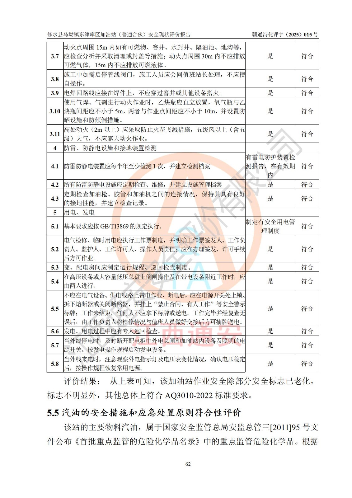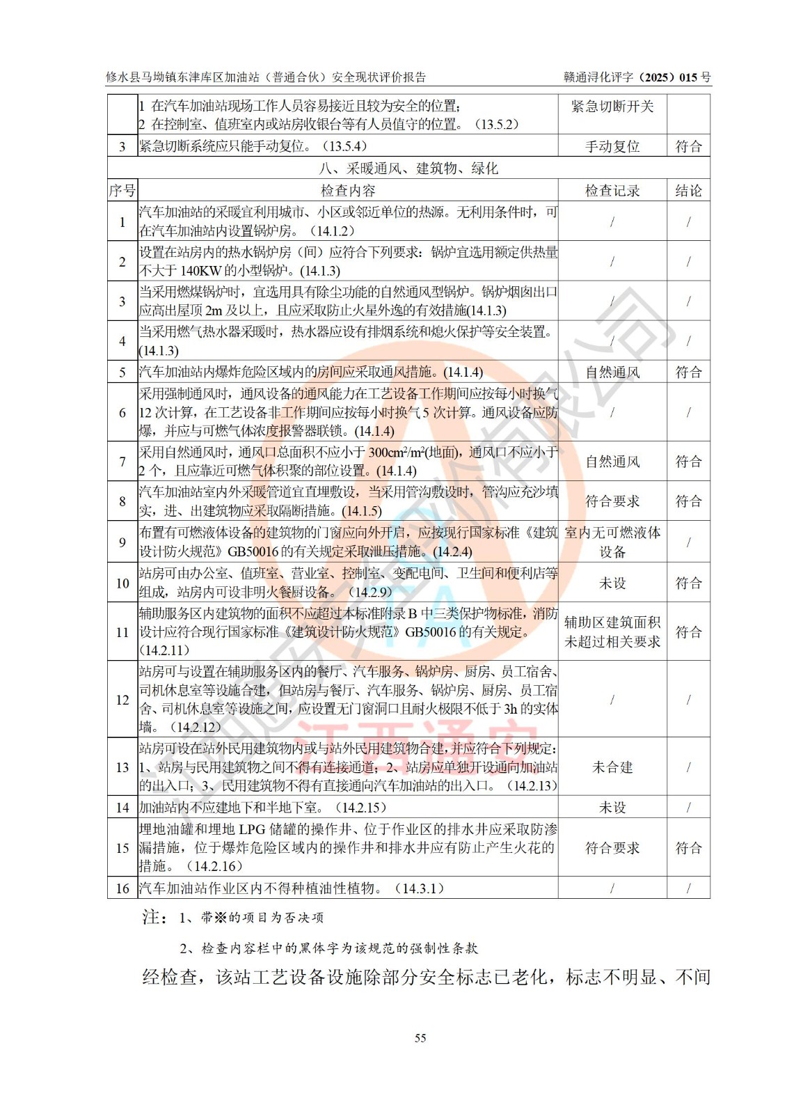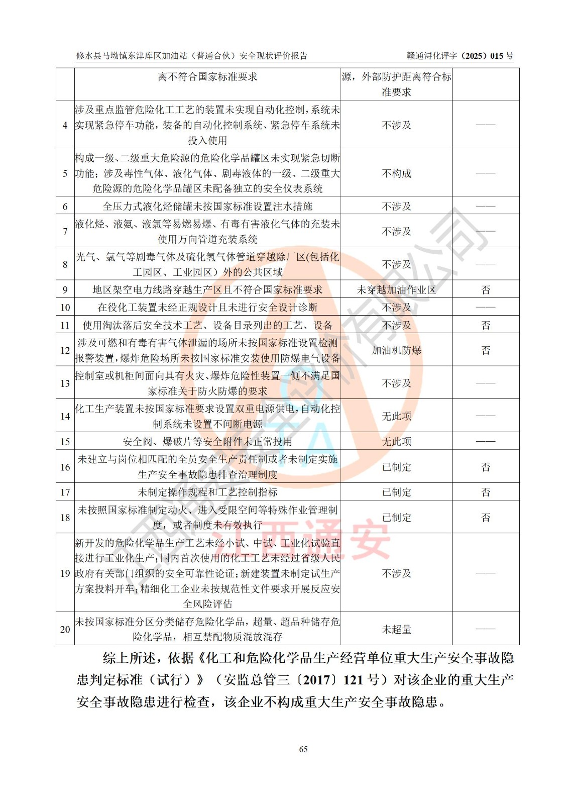 評(píng)價(jià)結(jié)論 | 修水縣馬坳鎮(zhèn)東津庫(kù)區(qū)加油站(普通合伙)涉及的安全條件、安全經(jīng)營(yíng)條件、安全生產(chǎn)管理符合《危險(xiǎn)化學(xué)品經(jīng)營(yíng)許可證管理辦法》、《汽車加油加氣加氫站技術(shù)標(biāo)準(zhǔn)》等**有關(guān)法規(guī)、標(biāo)準(zhǔn)、規(guī)范要求,能滿足危險(xiǎn)化學(xué)品經(jīng)營(yíng)安全條件。 | |||