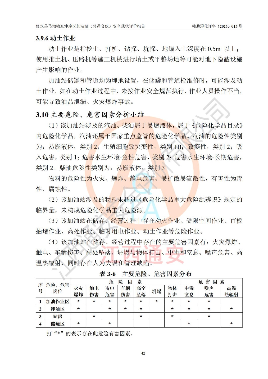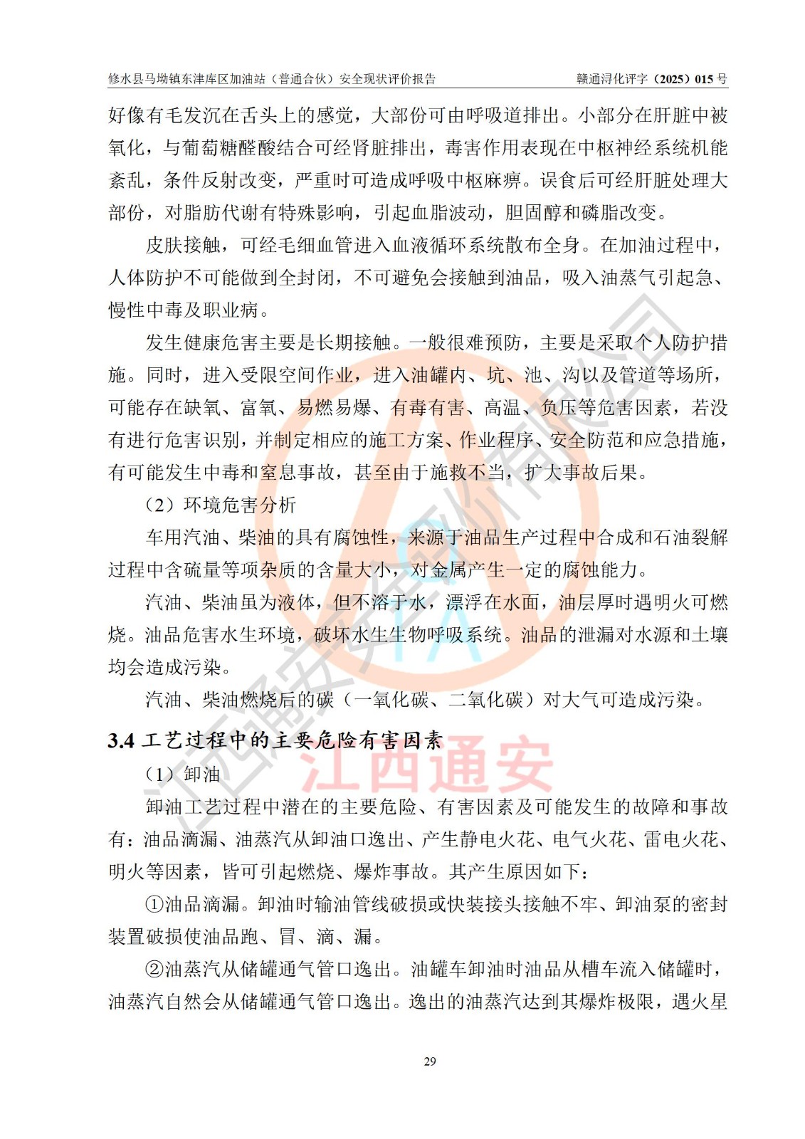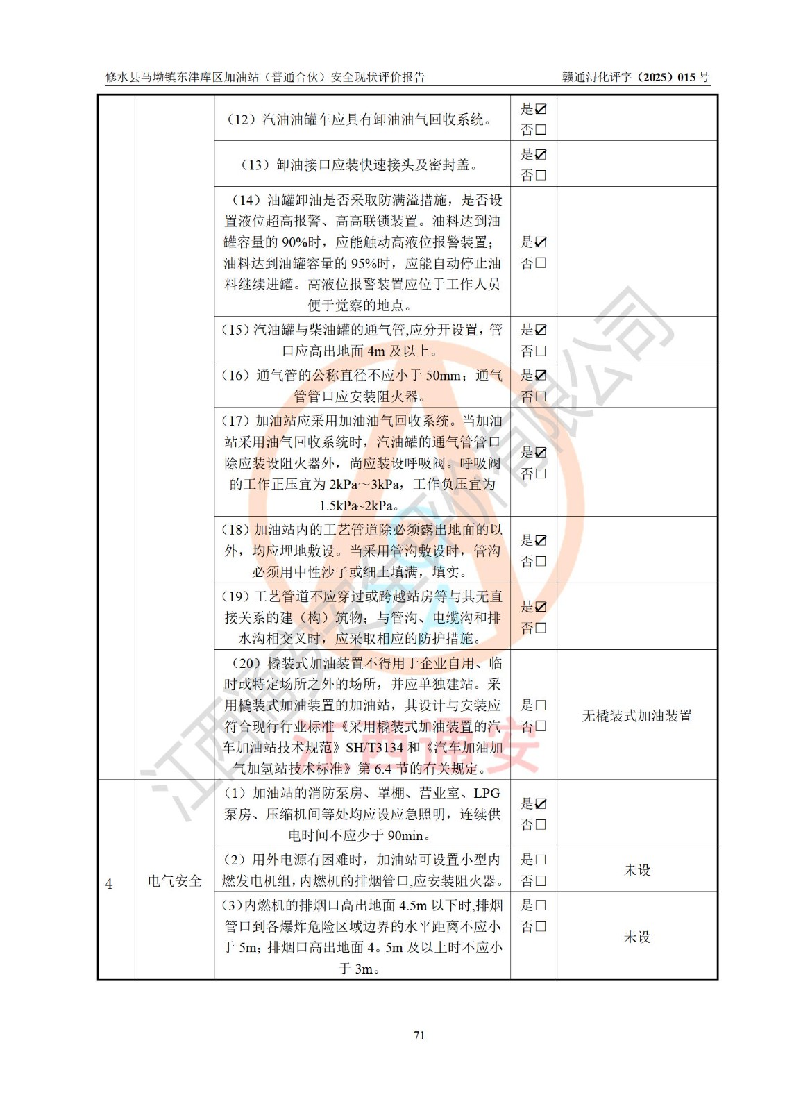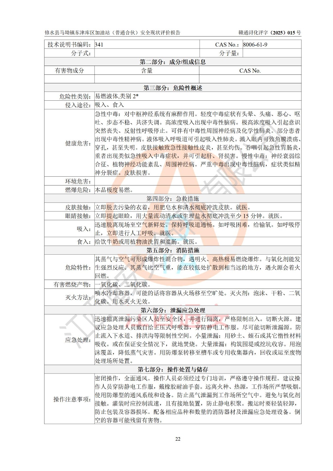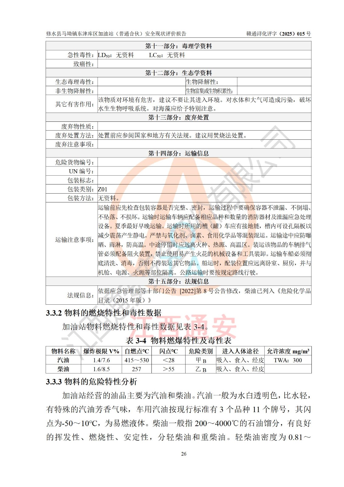 評(píng)價(jià)結(jié)論 | 修水縣馬坳鎮(zhèn)東津庫(kù)區(qū)加油站(普通合伙)涉及的安全條件、安全經(jīng)營(yíng)條件、安全生產(chǎn)管理符合《危險(xiǎn)化學(xué)品經(jīng)營(yíng)許可證管理辦法》、《汽車加油加氣加氫站技術(shù)標(biāo)準(zhǔn)》等**有關(guān)法規(guī)、標(biāo)準(zhǔn)、規(guī)范要求,能滿足危險(xiǎn)化學(xué)品經(jīng)營(yíng)安全條件。 | |||