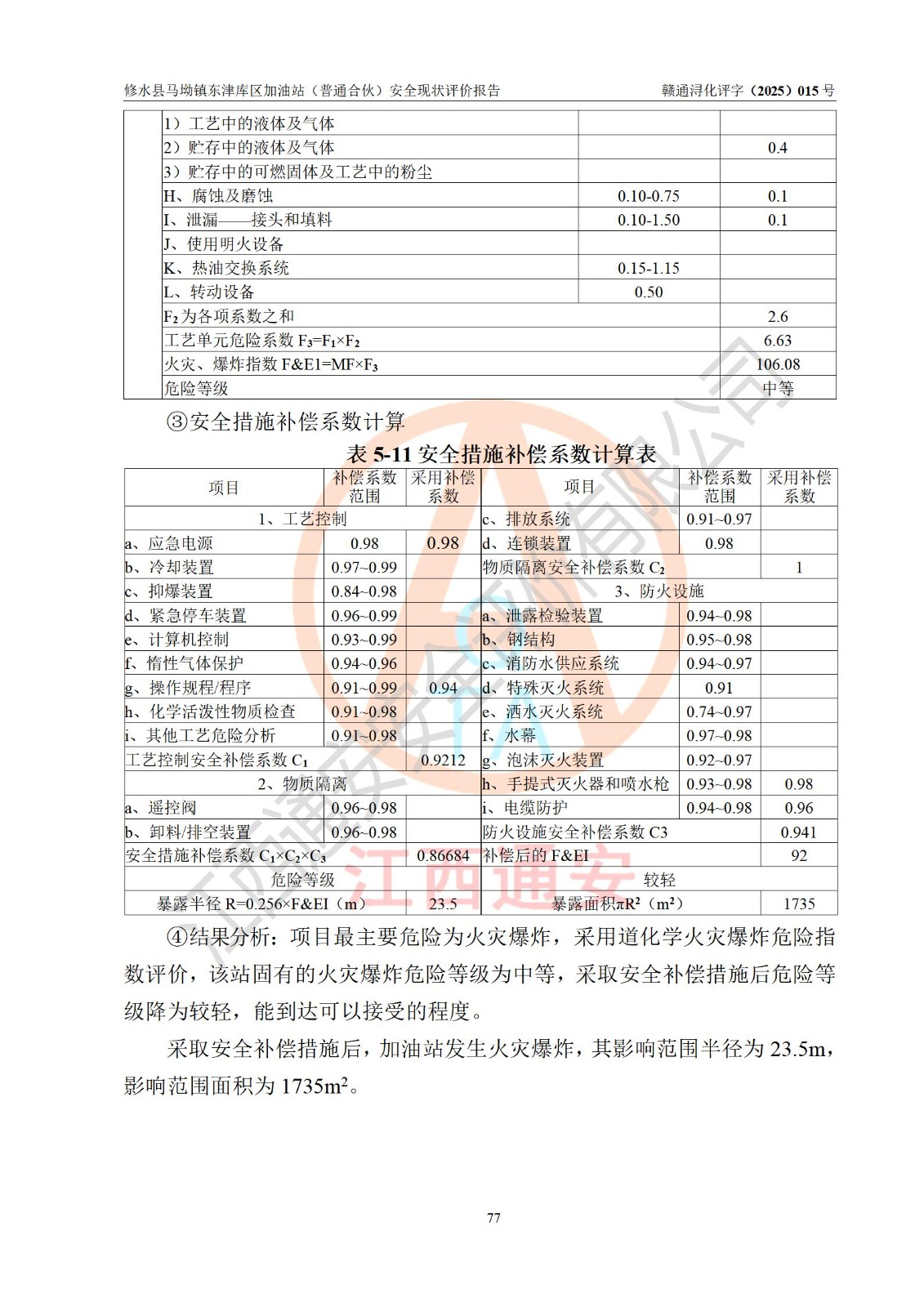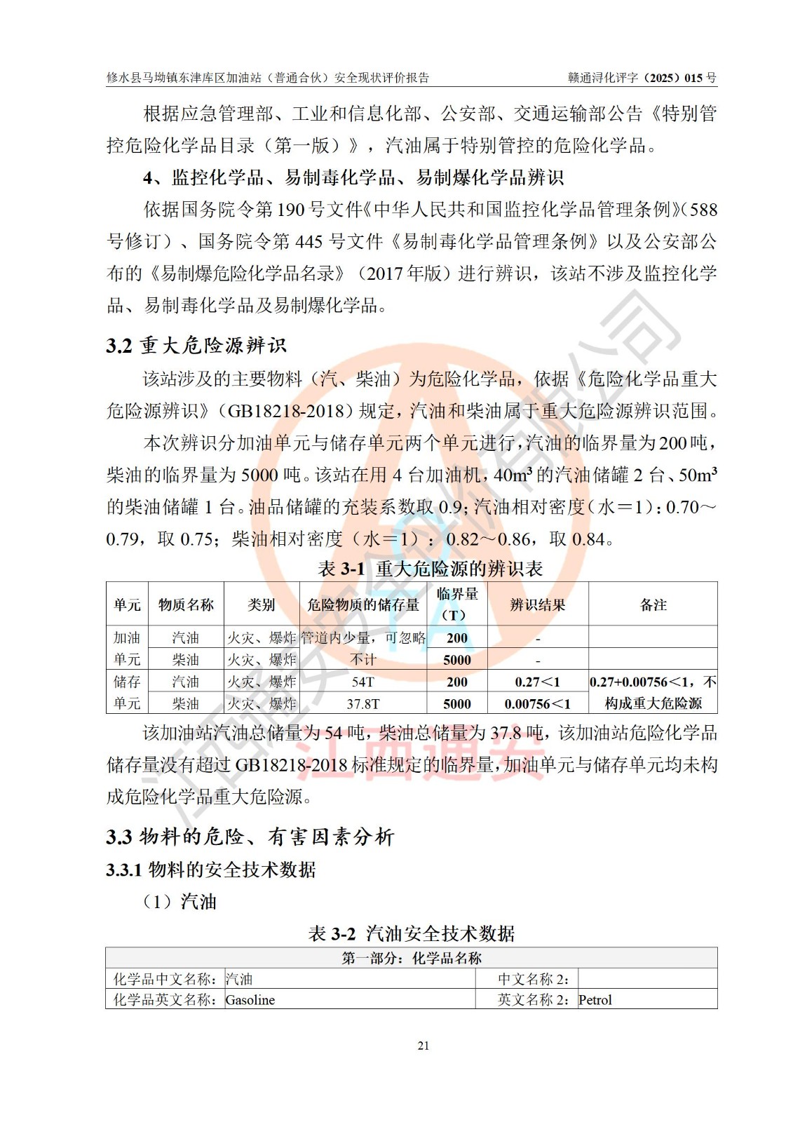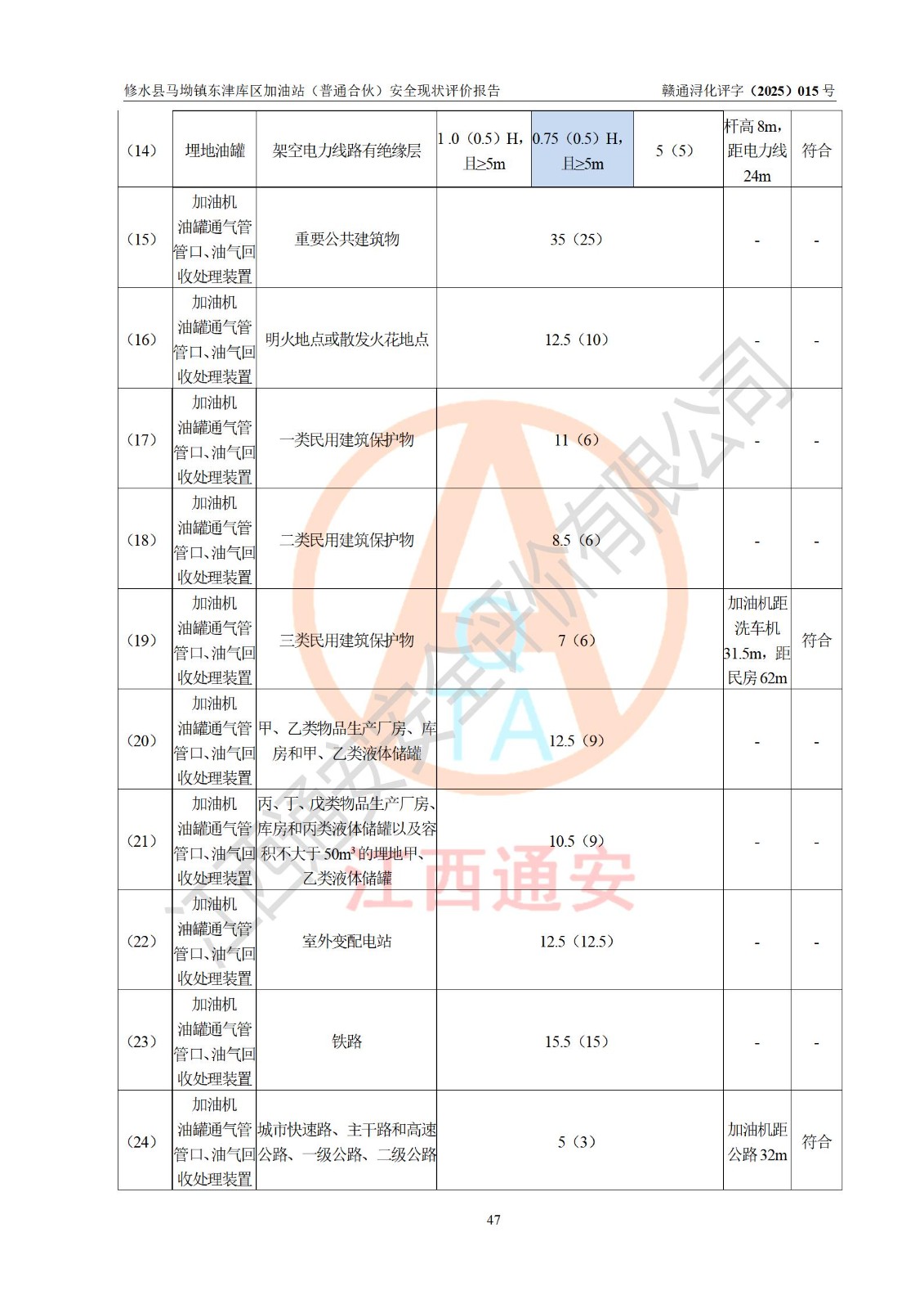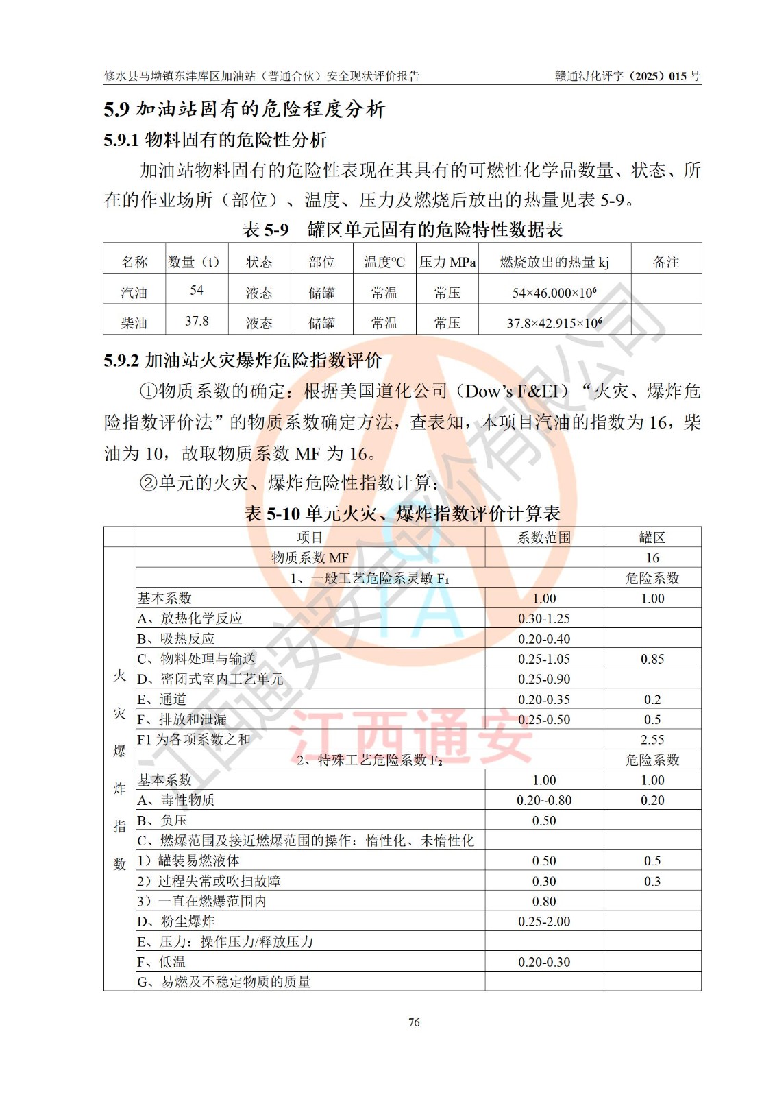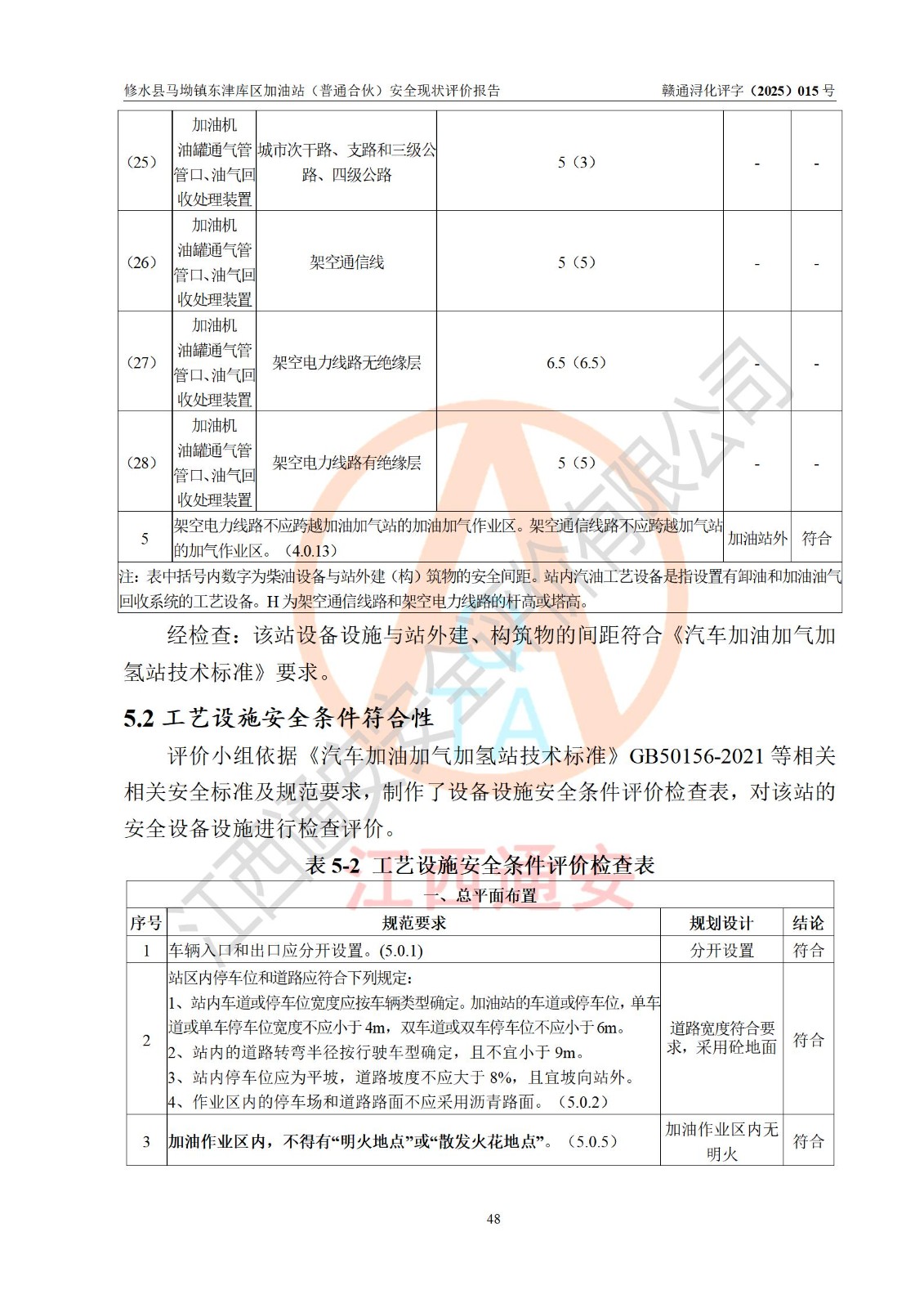 評(píng)價(jià)結(jié)論 | 修水縣馬坳鎮(zhèn)東津庫(kù)區(qū)加油站(普通合伙)涉及的安全條件、安全經(jīng)營(yíng)條件、安全生產(chǎn)管理符合《危險(xiǎn)化學(xué)品經(jīng)營(yíng)許可證管理辦法》、《汽車加油加氣加氫站技術(shù)標(biāo)準(zhǔn)》等**有關(guān)法規(guī)、標(biāo)準(zhǔn)、規(guī)范要求,能滿足危險(xiǎn)化學(xué)品經(jīng)營(yíng)安全條件。 | |||