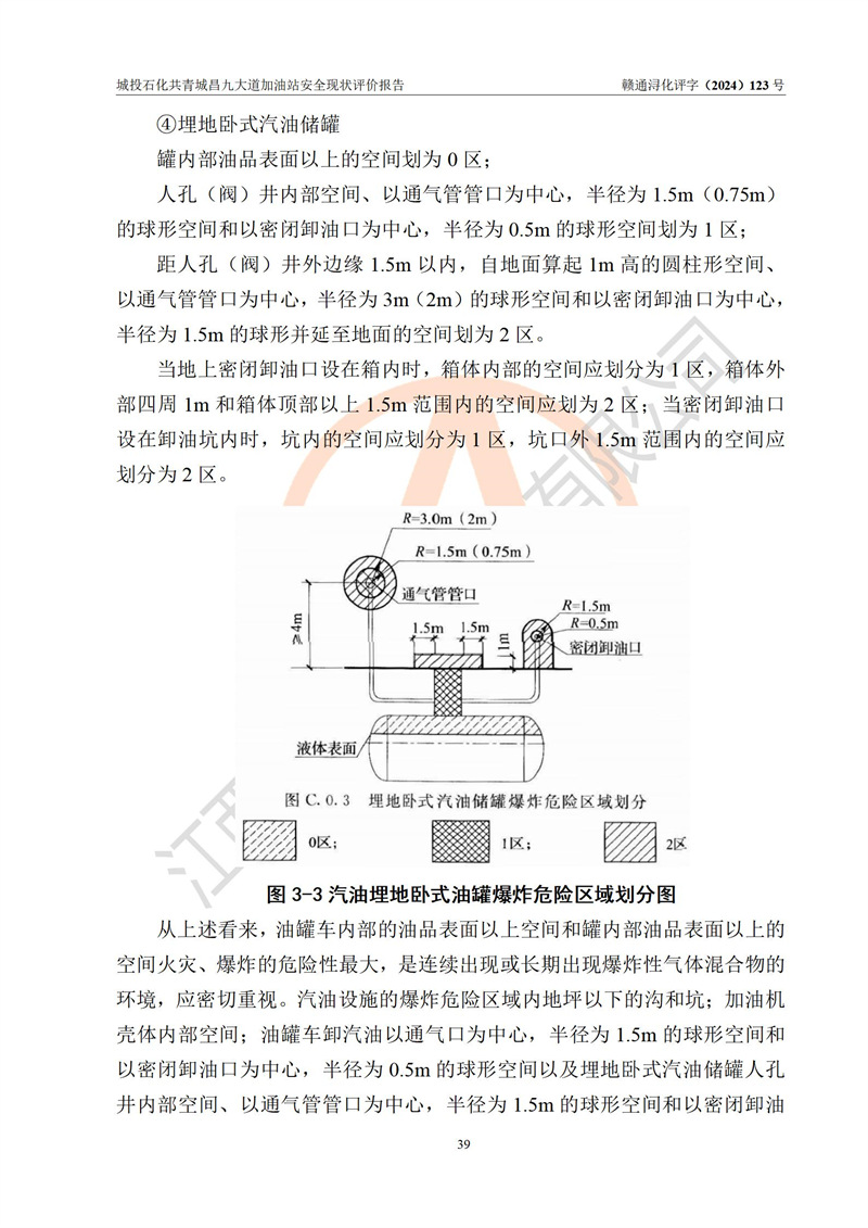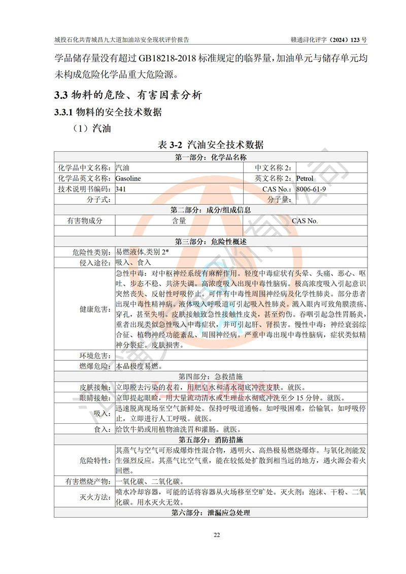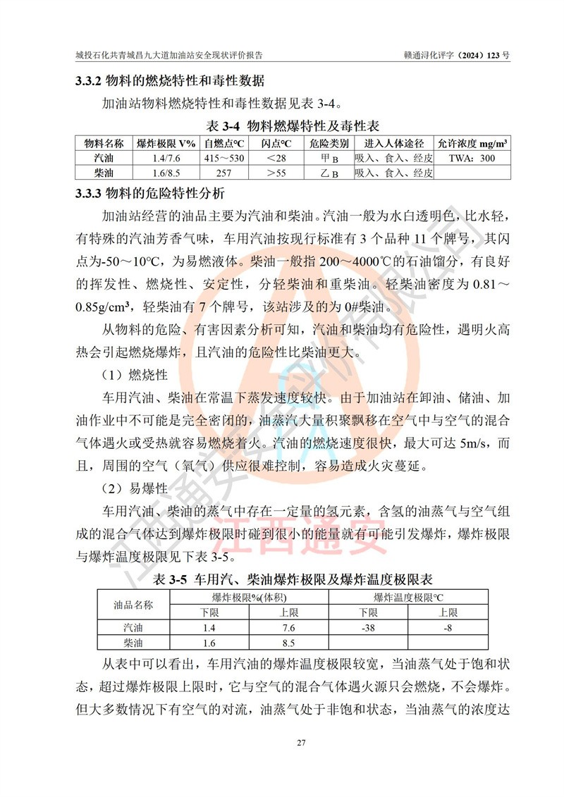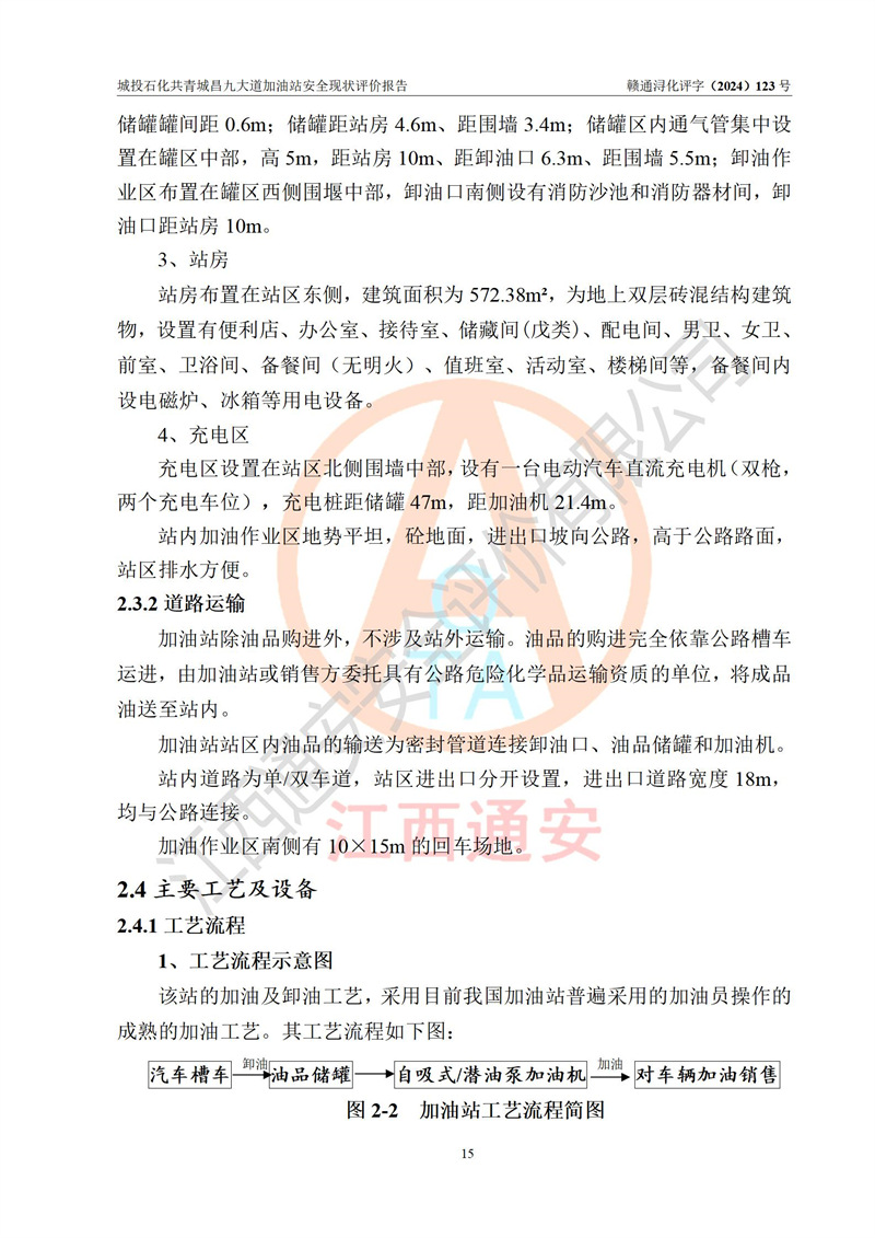 項(xiàng)目簡(jiǎn)介 | 九江市城投石化能源有限公司共青城昌九大道加油站是一家專門(mén)從事成品油零售經(jīng)營(yíng)的其他有限責(zé)任公司分公司,經(jīng)營(yíng)場(chǎng)所位于江西省九江市共青城市昌九大道以東、金牛山莊以南1樓。現(xiàn)有從業(yè)人員6名,其中安全管理人員1人,加油站負(fù)責(zé)人張?zhí)锢凇?/span> 該加油站占地面積3600.30m2,站區(qū)內(nèi)設(shè)置有4臺(tái)4槍加油機(jī)及配套的工藝管線,設(shè)4臺(tái)SF地下儲(chǔ)罐,其中30m3的0#柴油儲(chǔ)罐2臺(tái)、30m3的92#汽油儲(chǔ)罐1臺(tái)、30m3的95#汽油儲(chǔ)罐1臺(tái),油品儲(chǔ)罐總?cè)莘e共計(jì)120 m3(折算成汽油為90m3),按現(xiàn)行《汽車(chē)加油加氣加氫站技術(shù)標(biāo)準(zhǔn)》對(duì)加油站的等級(jí)劃分原則,屬三級(jí)加油站。 該站由共青城市行政審批局換發(fā)《危險(xiǎn)化學(xué)品經(jīng)營(yíng)許可證》(證號(hào):贛共危化經(jīng)字[2024]000001號(hào)),**期限2024年04月24日至2027年04月23日。 | |||