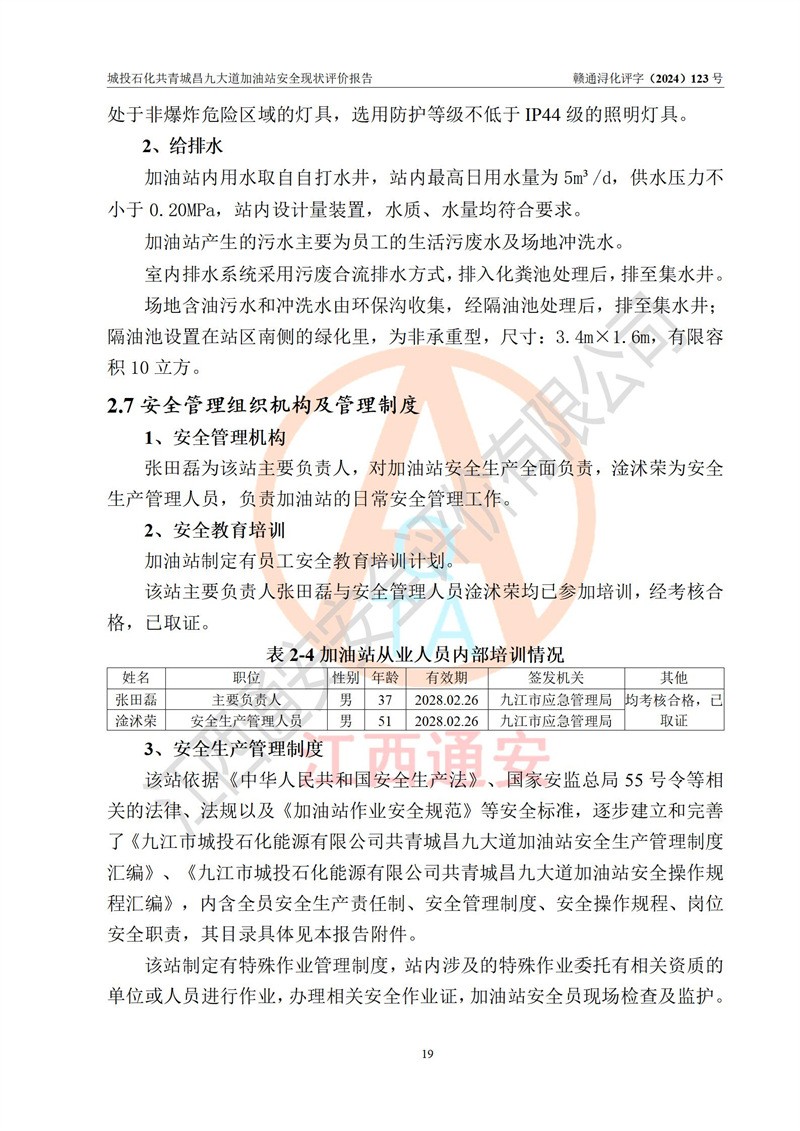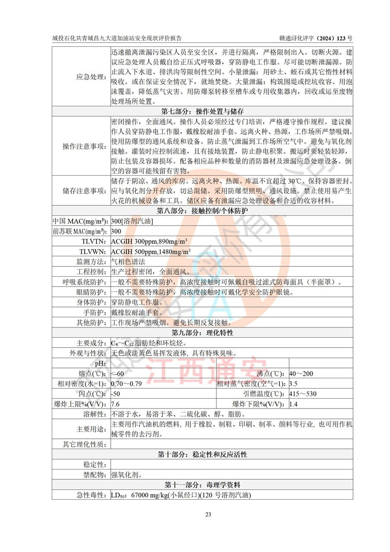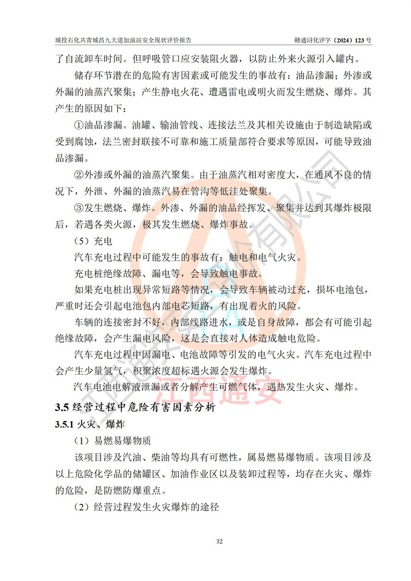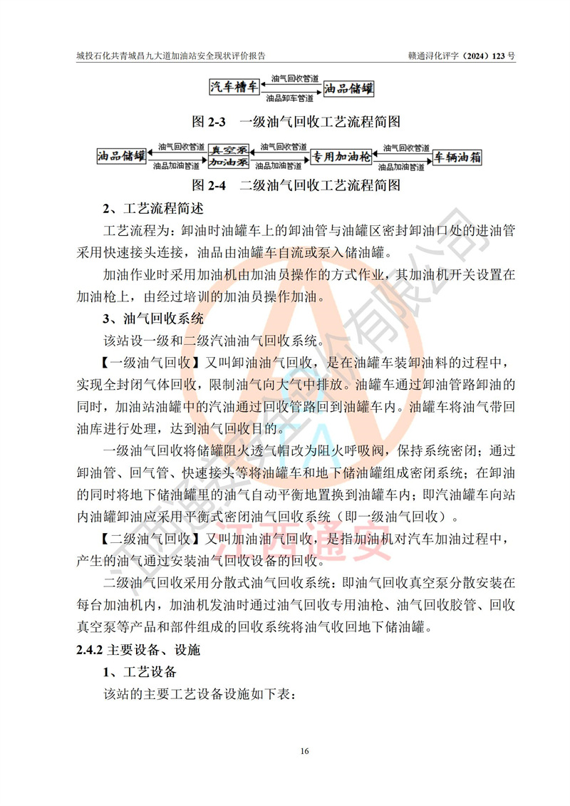 項(xiàng)目簡(jiǎn)介 | 九江市城投石化能源有限公司共青城昌九大道加油站是一家專門(mén)從事成品油零售經(jīng)營(yíng)的其他有限責(zé)任公司分公司,經(jīng)營(yíng)場(chǎng)所位于江西省九江市共青城市昌九大道以東、金牛山莊以南1樓。現(xiàn)有從業(yè)人員6名,其中安全管理人員1人,加油站負(fù)責(zé)人張?zhí)锢凇?/span> 該加油站占地面積3600.30m2,站區(qū)內(nèi)設(shè)置有4臺(tái)4槍加油機(jī)及配套的工藝管線,設(shè)4臺(tái)SF地下儲(chǔ)罐,其中30m3的0#柴油儲(chǔ)罐2臺(tái)、30m3的92#汽油儲(chǔ)罐1臺(tái)、30m3的95#汽油儲(chǔ)罐1臺(tái),油品儲(chǔ)罐總?cè)莘e共計(jì)120 m3(折算成汽油為90m3),按現(xiàn)行《汽車(chē)加油加氣加氫站技術(shù)標(biāo)準(zhǔn)》對(duì)加油站的等級(jí)劃分原則,屬三級(jí)加油站。 該站由共青城市行政審批局換發(fā)《危險(xiǎn)化學(xué)品經(jīng)營(yíng)許可證》(證號(hào):贛共危化經(jīng)字[2024]000001號(hào)),**期限2024年04月24日至2027年04月23日。 | |||