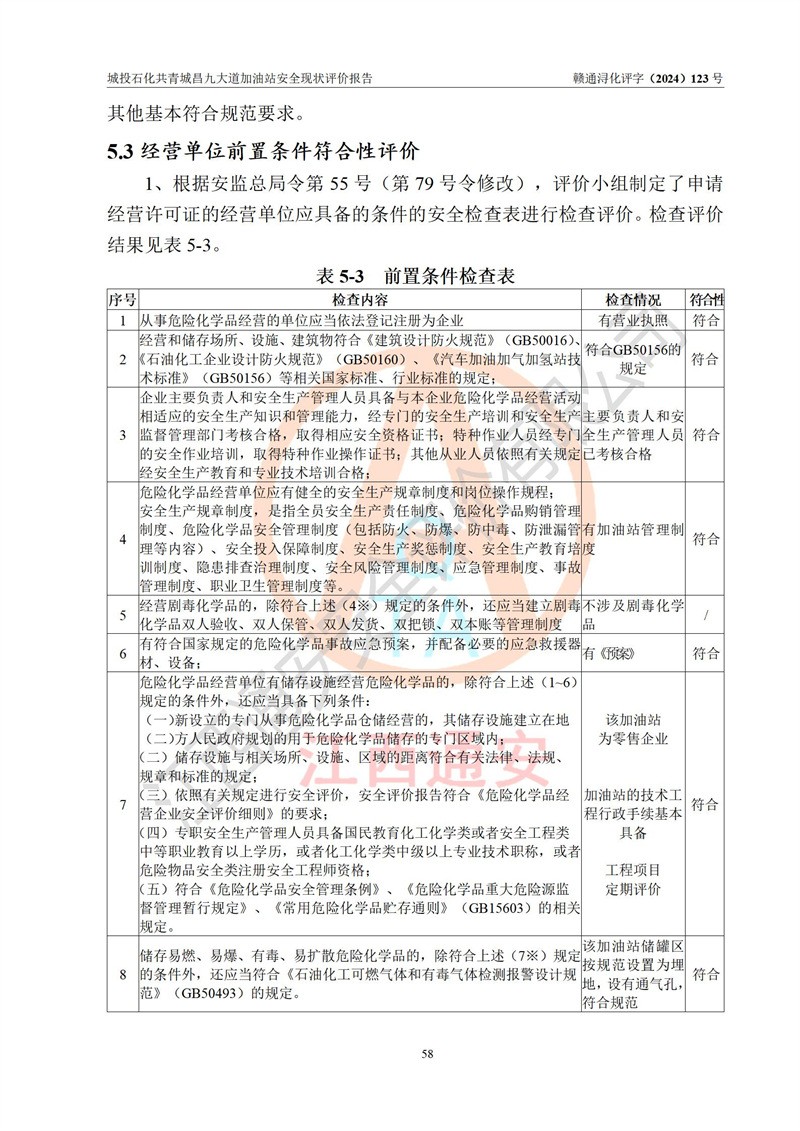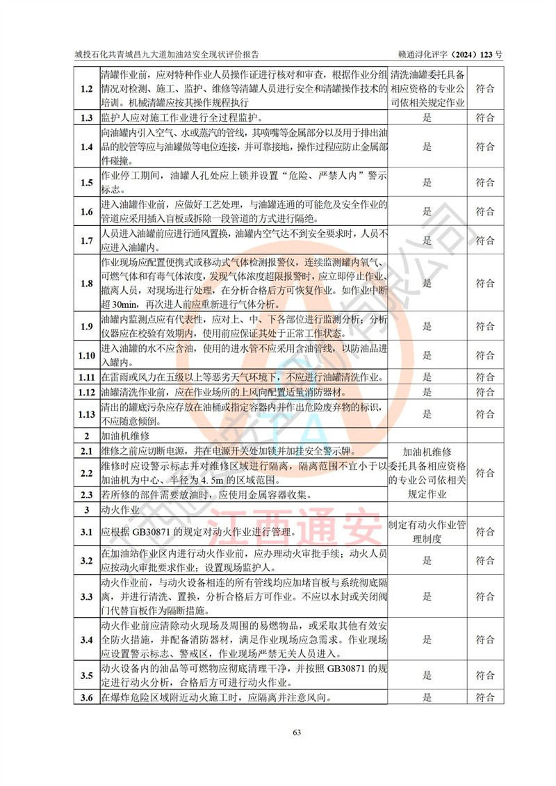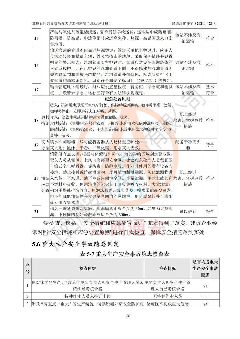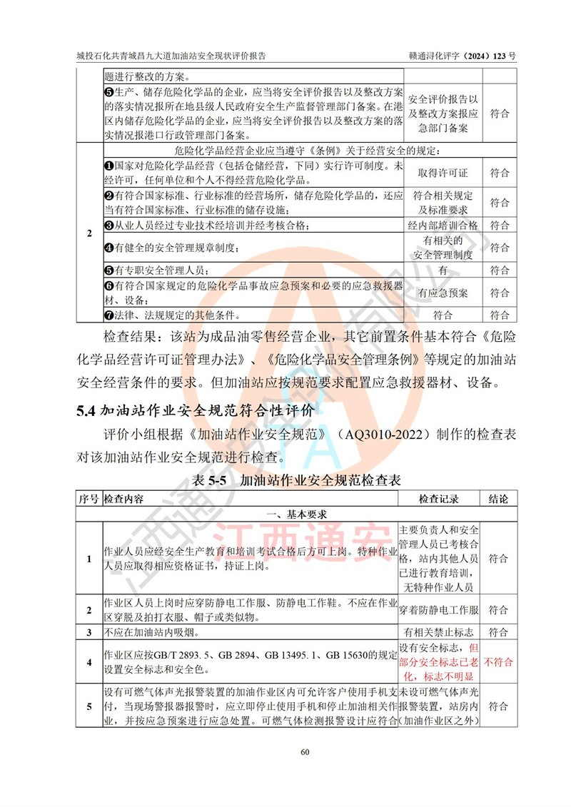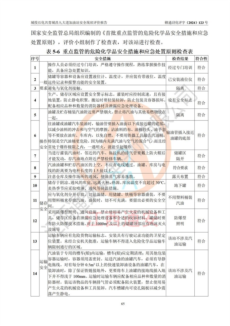 評(píng)價(jià)結(jié)論 | 九江市城投石化能源有限公司共青城昌九大道加油站涉及的安全條件、安全經(jīng)營(yíng)條件、安全生產(chǎn)管理符合《危險(xiǎn)化學(xué)品經(jīng)營(yíng)許可證管理辦法》、《汽車(chē)加油加氣加氫站技術(shù)標(biāo)準(zhǔn)》等**有關(guān)法規(guī)、標(biāo)準(zhǔn)、規(guī)范要求,能滿足危險(xiǎn)化學(xué)品經(jīng)營(yíng)安全條件。 | |||