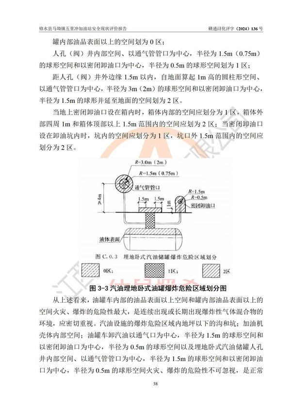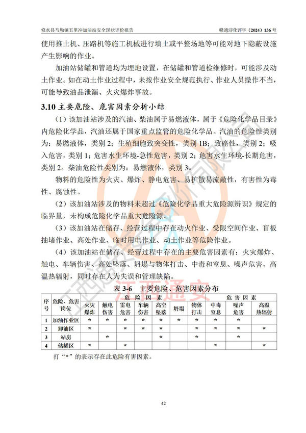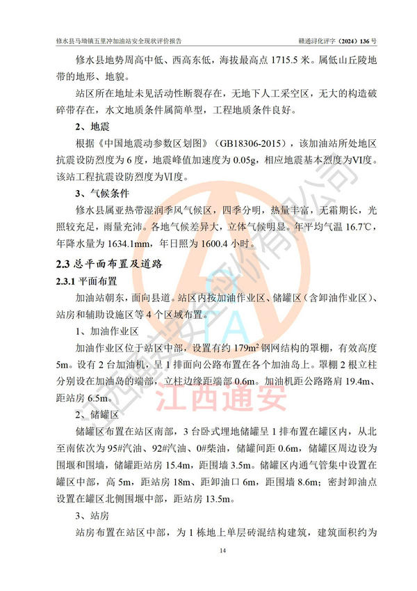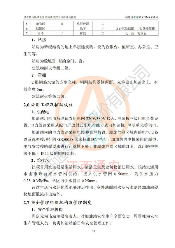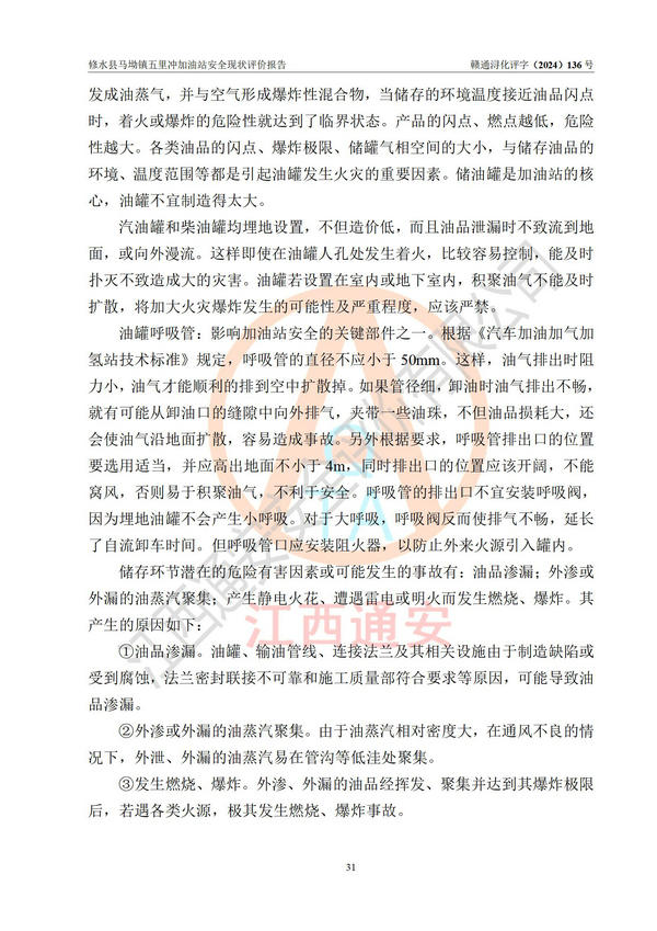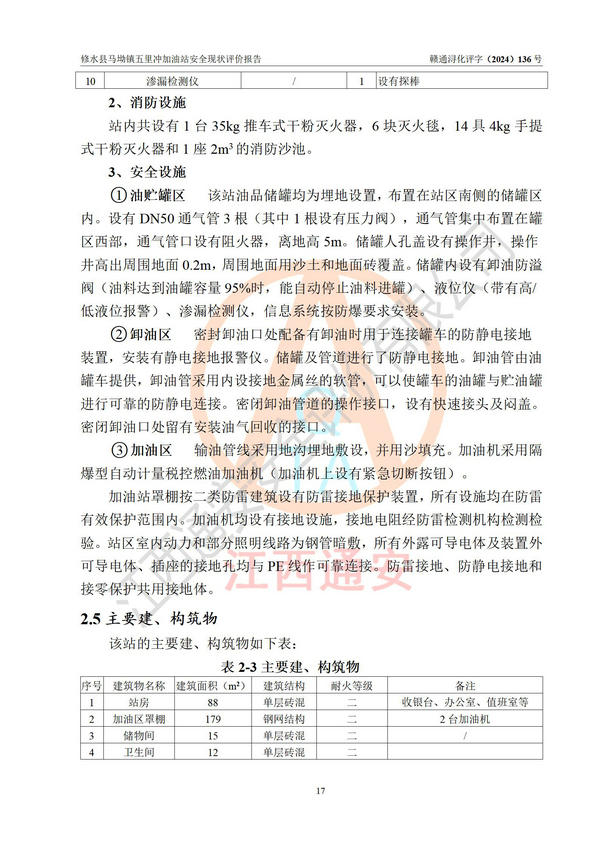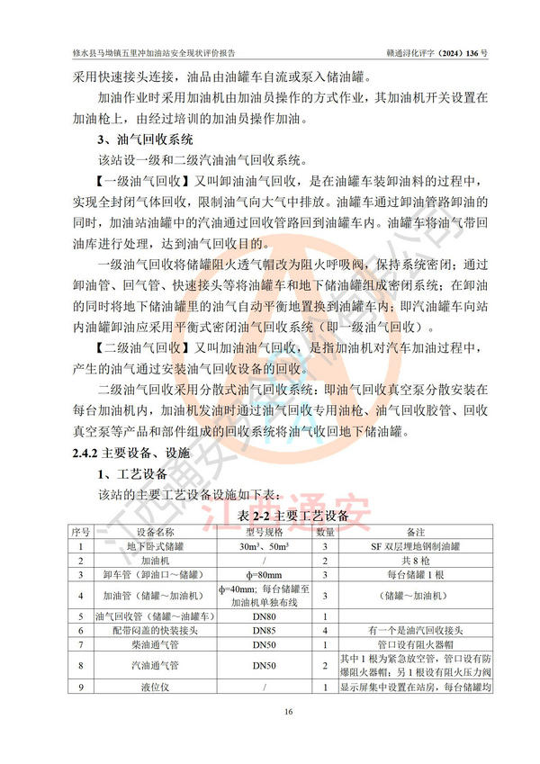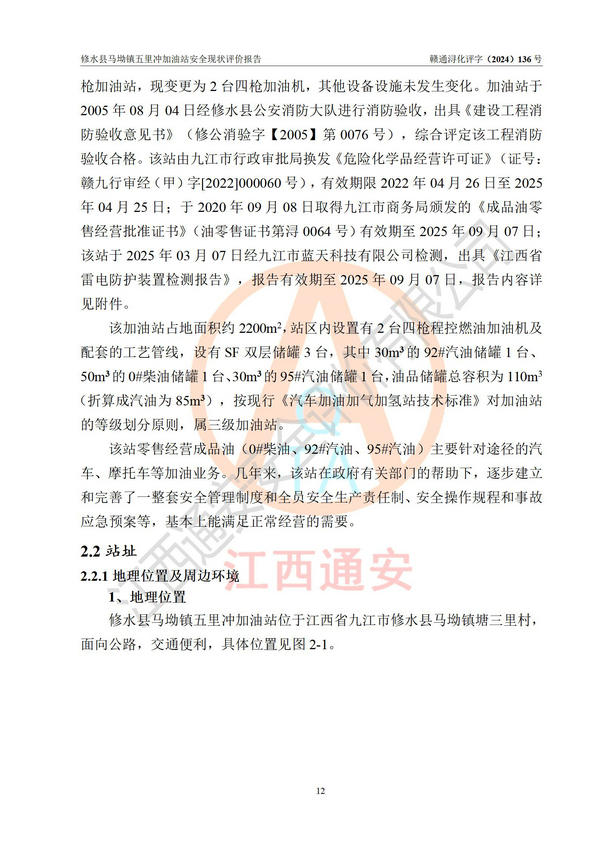 項(xiàng)目簡介 | 修水縣馬坳鎮(zhèn)五里沖加油站是一家專門從事成品油零售經(jīng)營的個(gè)體工商戶,經(jīng)營場所位于江西省九江市修水縣馬坳鎮(zhèn)塘三里村?,F(xiàn)有從業(yè)人員4名,其中安全管理人員1人,加油站負(fù)責(zé)人邱定元。 該加油站占地面積約2200m2,站區(qū)內(nèi)設(shè)置有2臺(tái)四槍程控燃油加油機(jī)及配套的工藝管線,設(shè)有SF雙層儲(chǔ)罐3臺(tái),其中30m3的92#汽油儲(chǔ)罐1臺(tái)、50m3的0#柴油儲(chǔ)罐1臺(tái)、30m3的95#汽油儲(chǔ)罐1臺(tái),油品儲(chǔ)罐總?cè)莘e為110m3(折算成汽油為85m3),按現(xiàn)行《汽車加油加氣加氫站技術(shù)標(biāo)準(zhǔn)》對(duì)加油站的等級(jí)劃分原則,屬三級(jí)加油站。 該站由九江市行政審批局換發(fā)《危險(xiǎn)化學(xué)品經(jīng)營許可證》(證號(hào):贛九行審經(jīng)(甲)字[2022]000060號(hào)),**期限2022年04月26日至2025年04月25日。 | |||