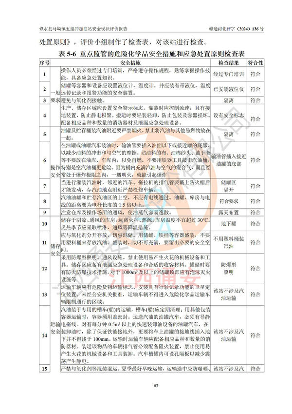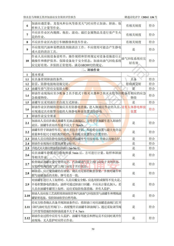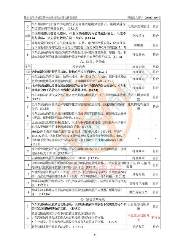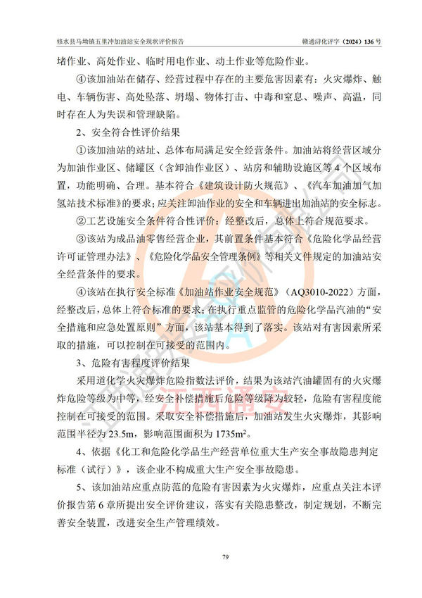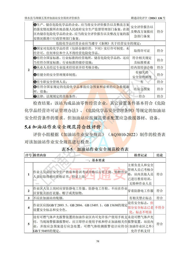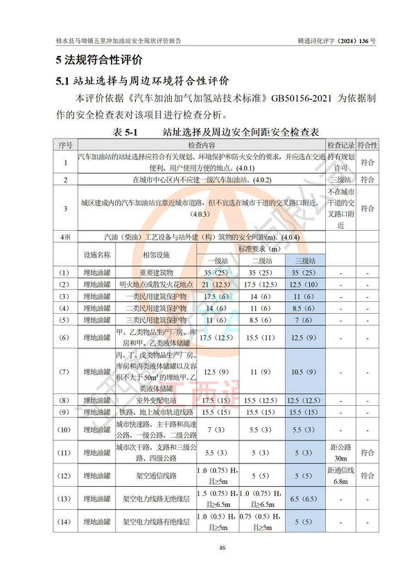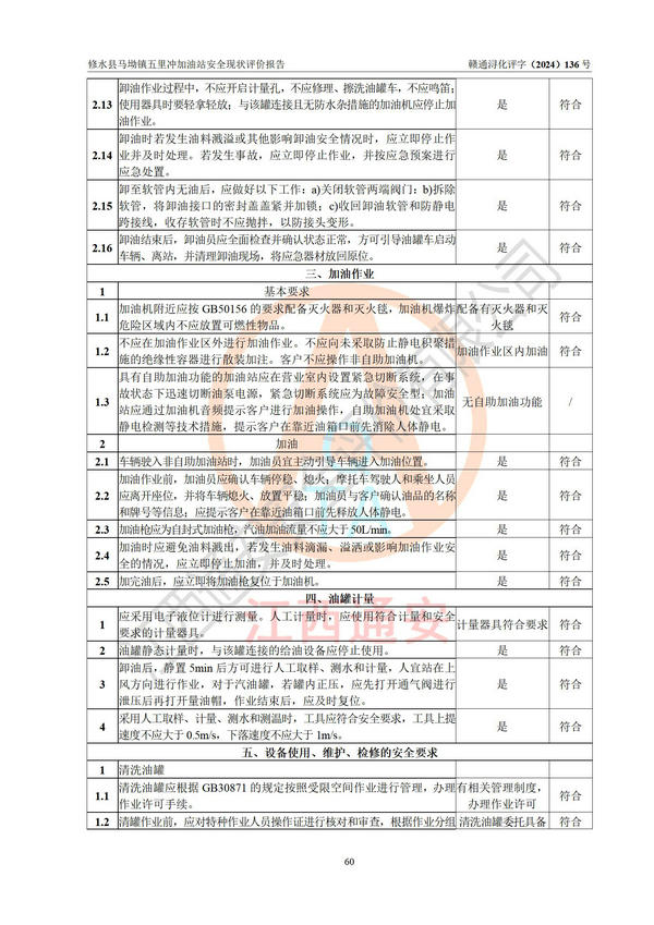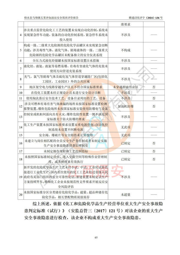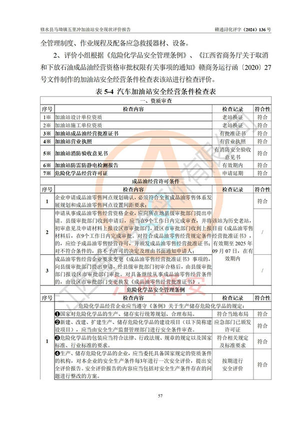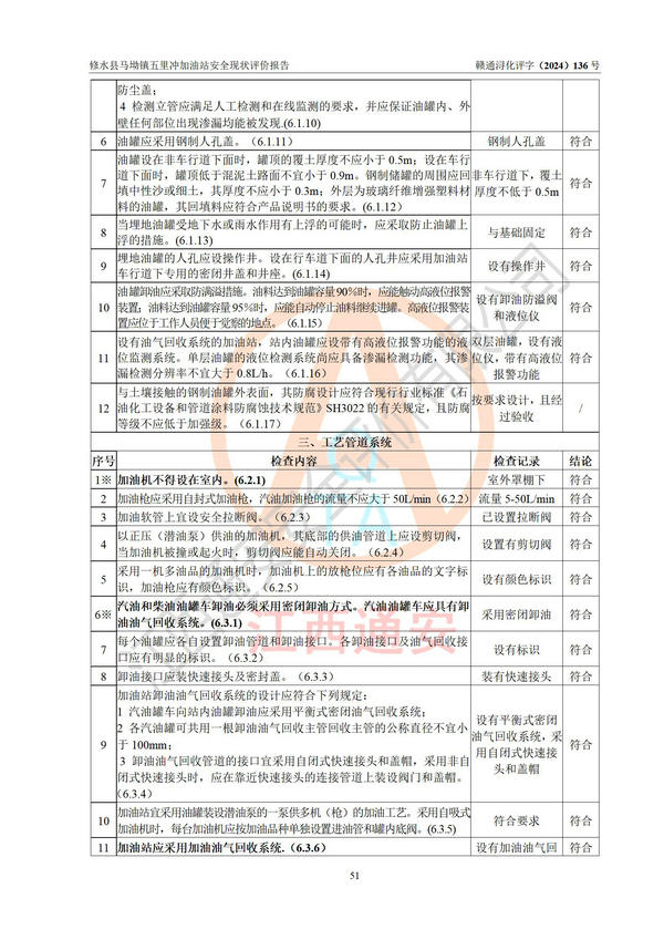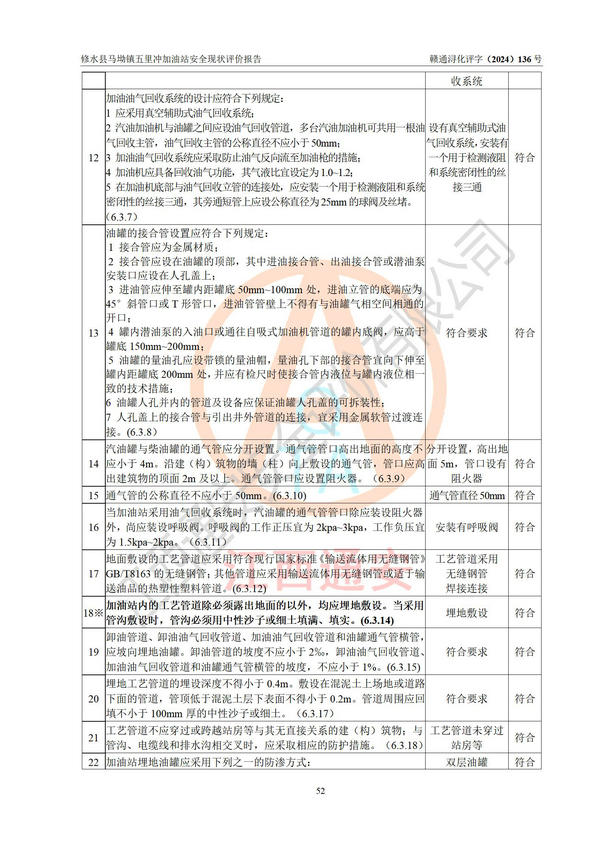 評(píng)價(jià)結(jié)論 | 修水縣馬坳鎮(zhèn)五里沖加油站涉及的安全條件、安全經(jīng)營條件、安全生產(chǎn)管理符合《危險(xiǎn)化學(xué)品經(jīng)營許可證管理辦法》、《汽車加油加氣加氫站技術(shù)標(biāo)準(zhǔn)》等**有關(guān)法規(guī)、標(biāo)準(zhǔn)、規(guī)范要求,能滿足危險(xiǎn)化學(xué)品經(jīng)營安全條件。 | |||