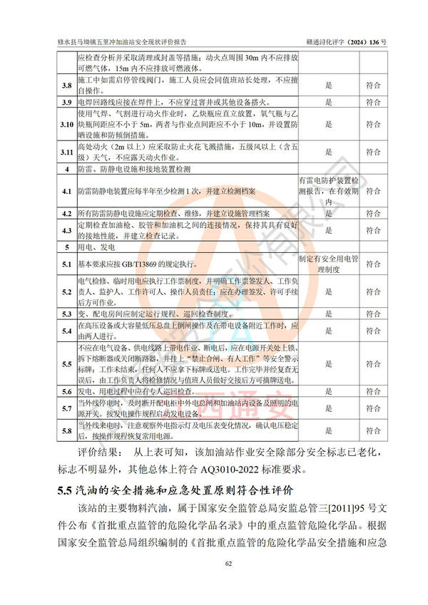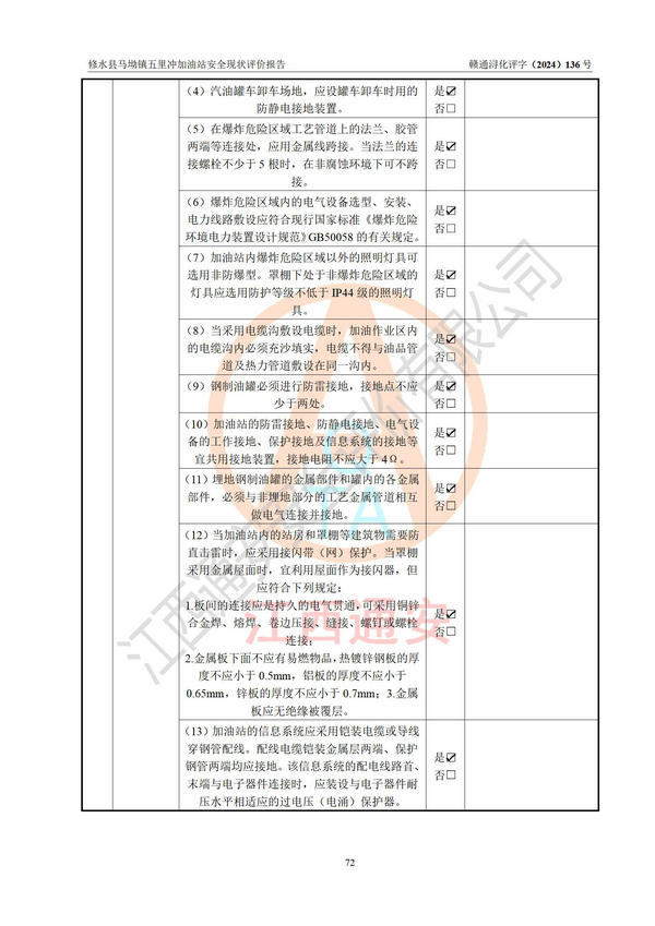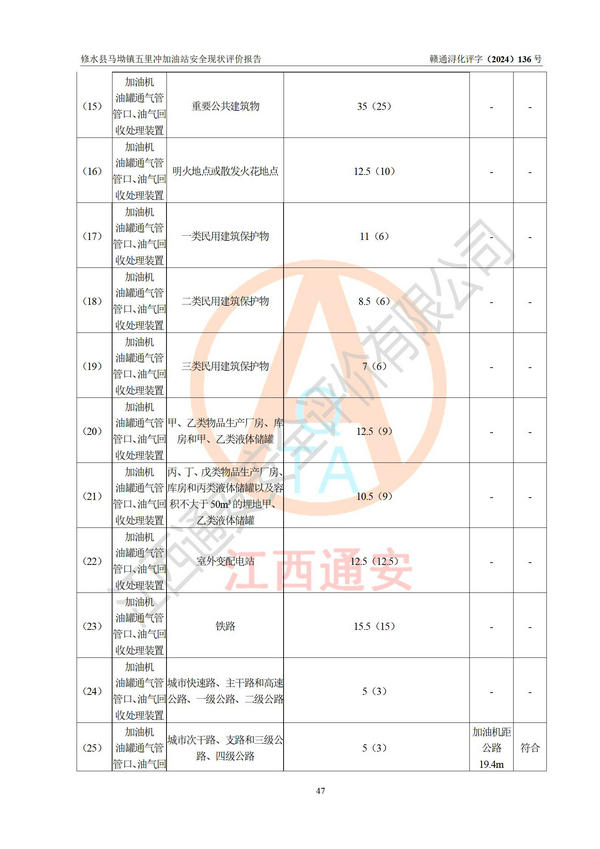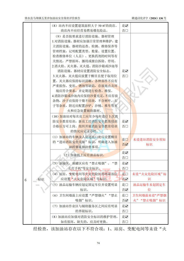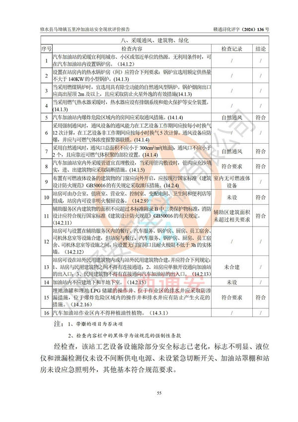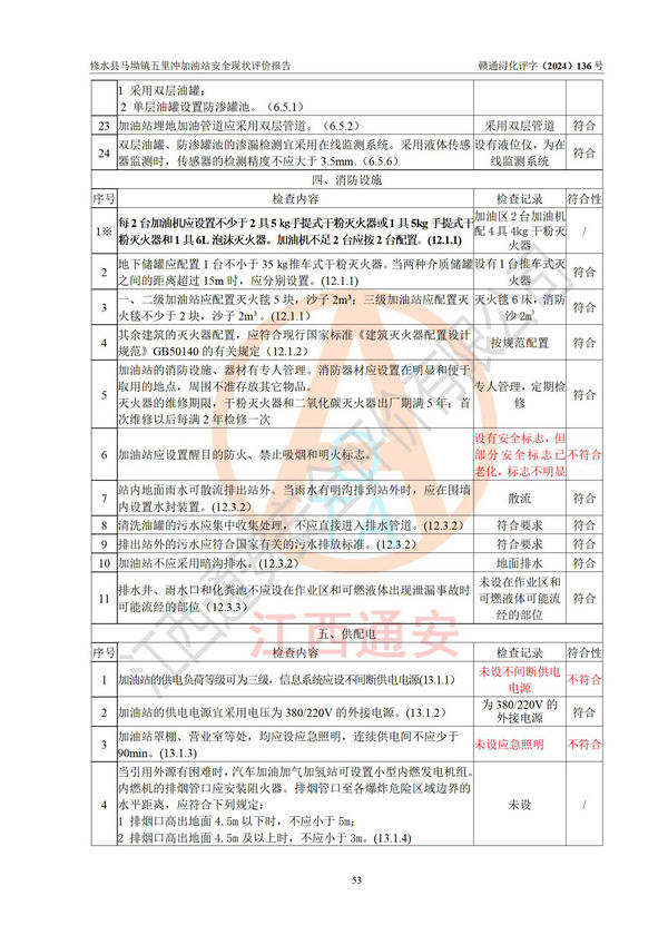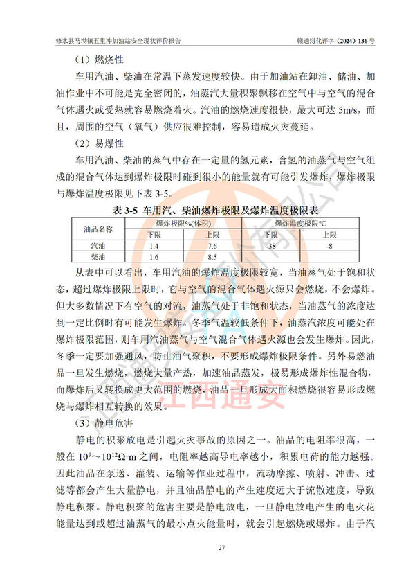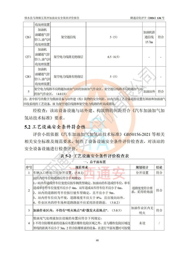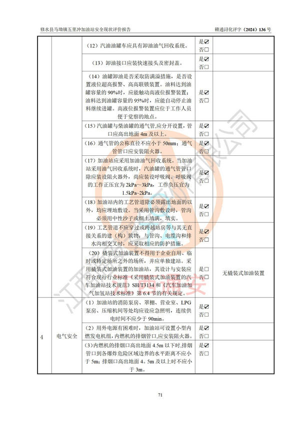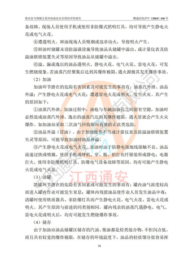 評(píng)價(jià)結(jié)論 | 修水縣馬坳鎮(zhèn)五里沖加油站涉及的安全條件、安全經(jīng)營條件、安全生產(chǎn)管理符合《危險(xiǎn)化學(xué)品經(jīng)營許可證管理辦法》、《汽車加油加氣加氫站技術(shù)標(biāo)準(zhǔn)》等**有關(guān)法規(guī)、標(biāo)準(zhǔn)、規(guī)范要求,能滿足危險(xiǎn)化學(xué)品經(jīng)營安全條件。 | |||