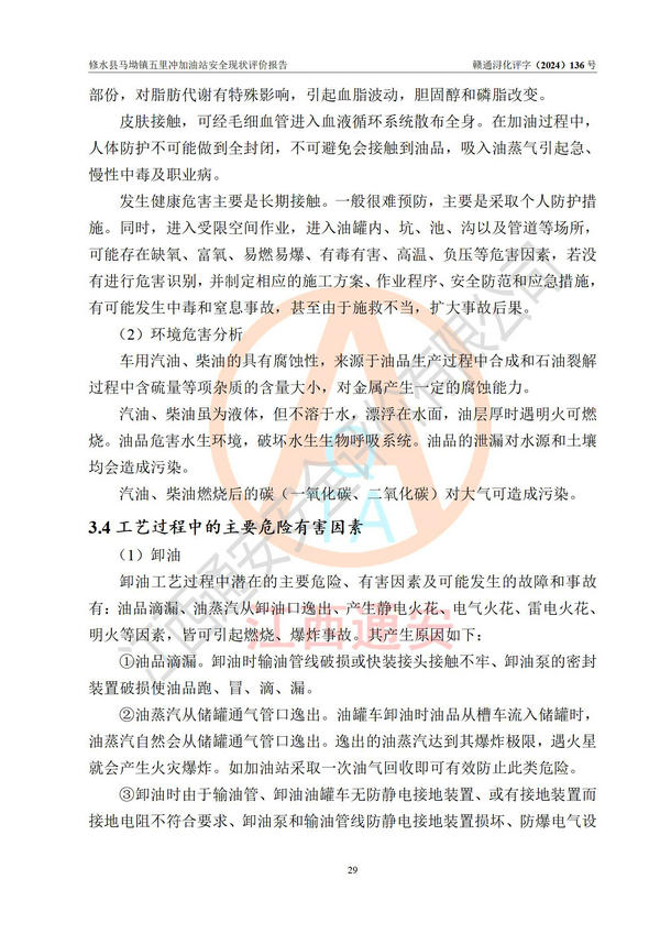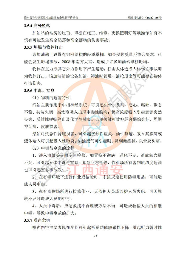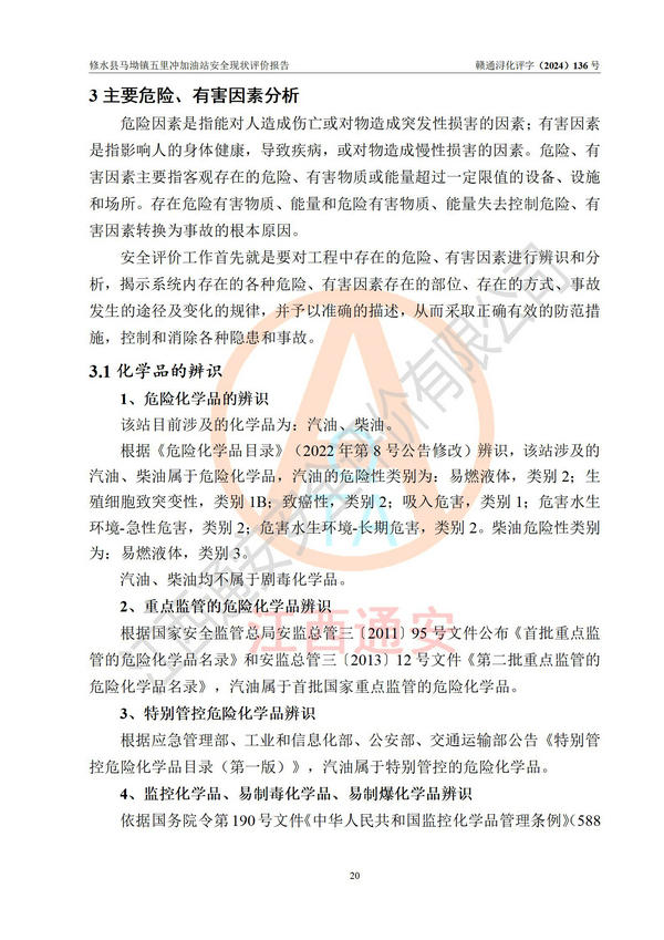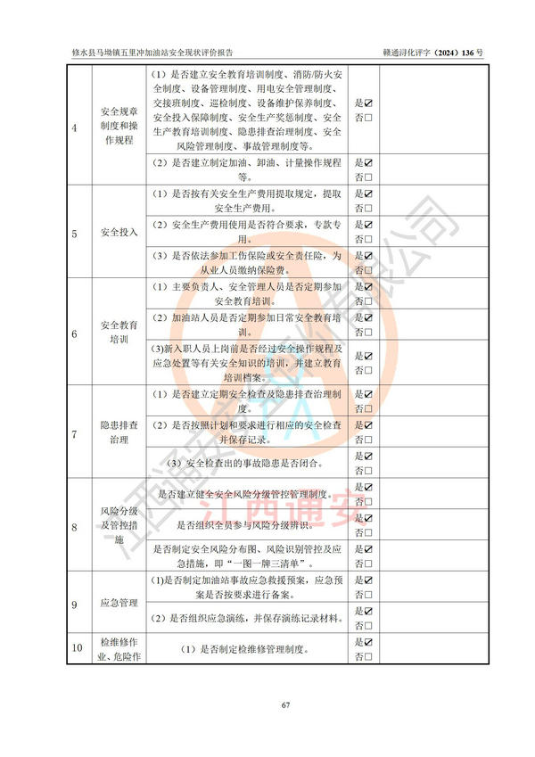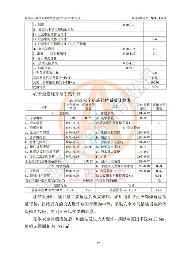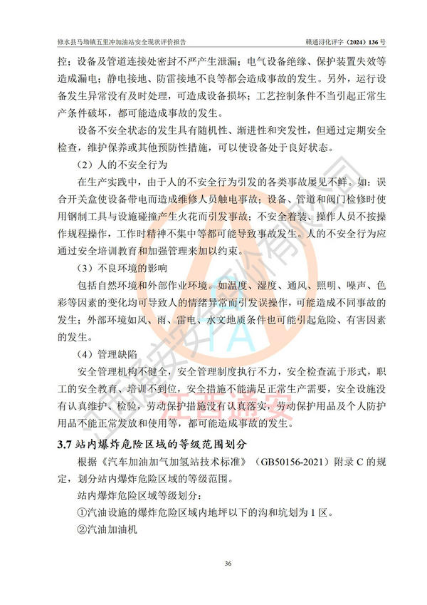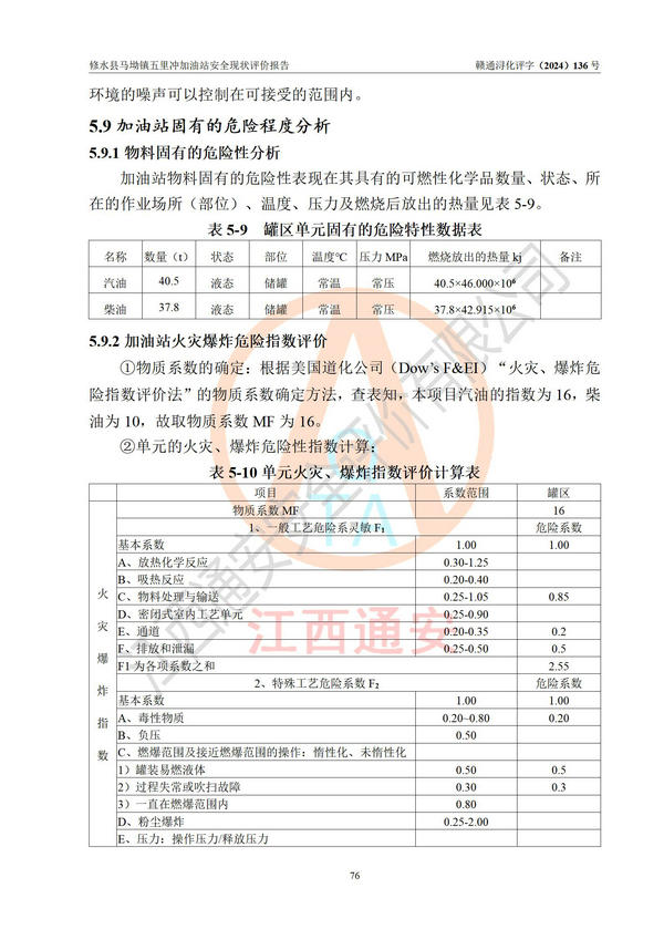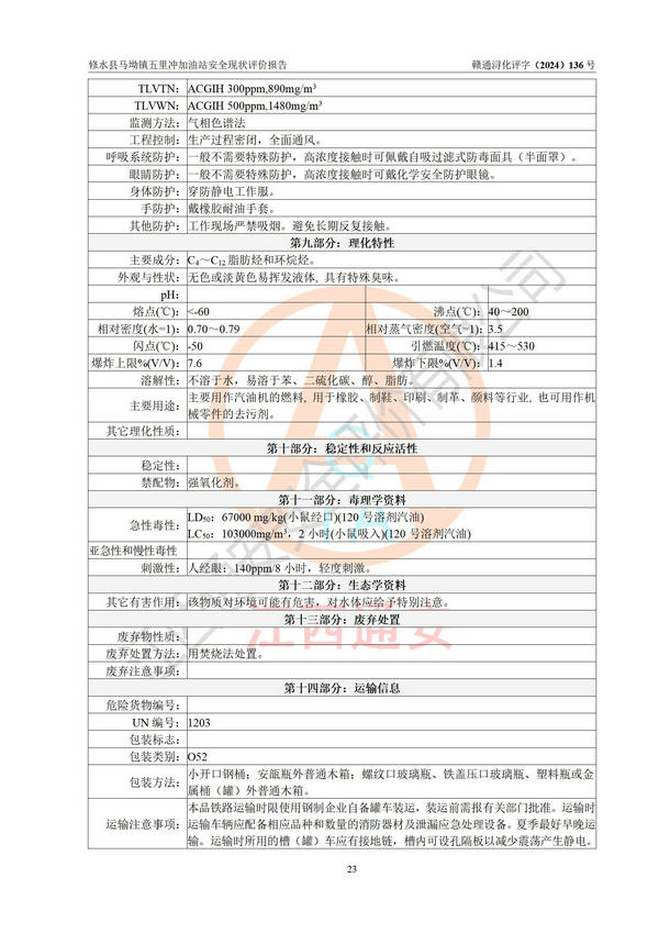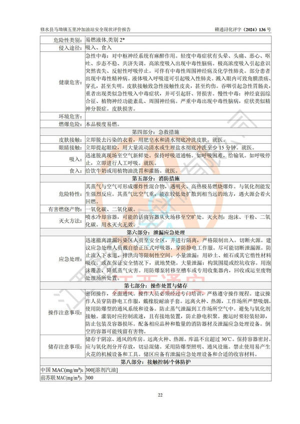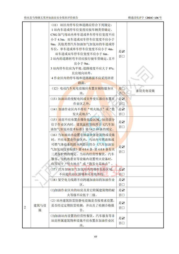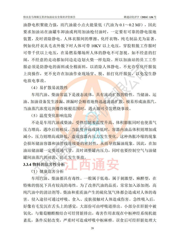 評(píng)價(jià)結(jié)論 | 修水縣馬坳鎮(zhèn)五里沖加油站涉及的安全條件、安全經(jīng)營條件、安全生產(chǎn)管理符合《危險(xiǎn)化學(xué)品經(jīng)營許可證管理辦法》、《汽車加油加氣加氫站技術(shù)標(biāo)準(zhǔn)》等**有關(guān)法規(guī)、標(biāo)準(zhǔn)、規(guī)范要求,能滿足危險(xiǎn)化學(xué)品經(jīng)營安全條件。 | |||
