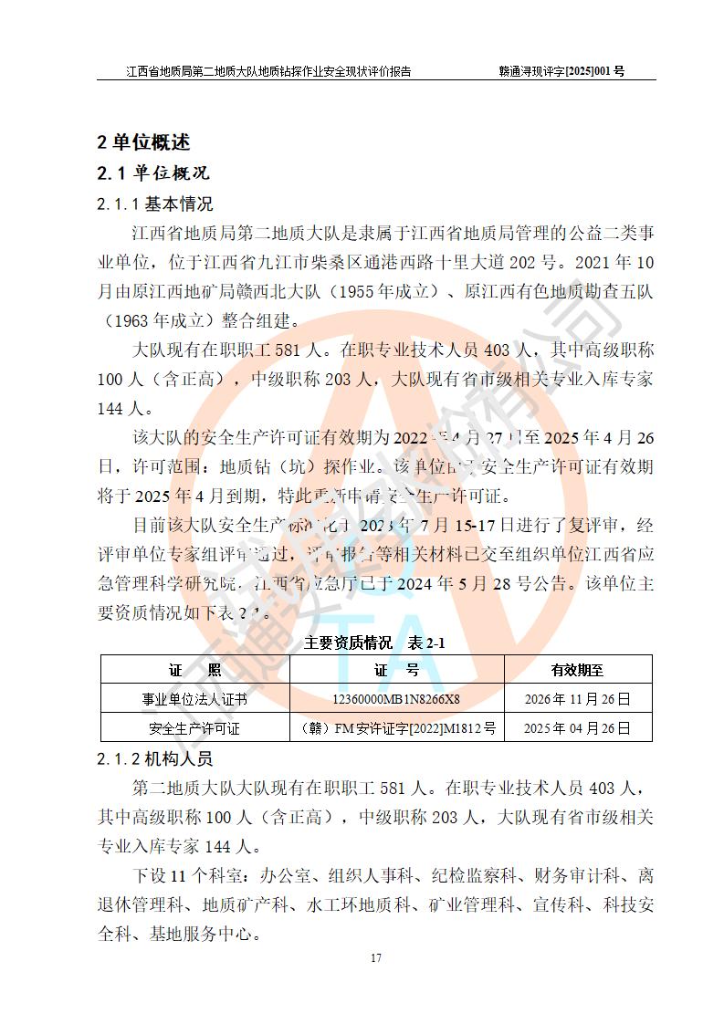 項(xiàng)目簡介 | 江西省地質(zhì)局第二地質(zhì)大隊(duì)是隸屬于江西省地質(zhì)局管理的公益二類事業(yè)單位,位于江西省九江市柴桑區(qū)通港西路十里大道202號。2021年10月由原江西地礦局贛西北大隊(duì)(1955年成立)、原江西有色地質(zhì)勘查五隊(duì)(1963年成立)整合組建。 曾榮獲“**科技進(jìn)步特等獎”、首批“**地質(zhì)找礦功勛單位”、“**五四紅旗團(tuán)委”、“江西省地質(zhì)勘查功勛單位”等**和省部級頒發(fā)的各類成果獎400余項(xiàng)。 大隊(duì)機(jī)關(guān)設(shè)置有辦公室、組織人事科、紀(jì)檢監(jiān)察科、財務(wù)審計(jì)科、離退休管理科、地質(zhì)礦產(chǎn)科、水工環(huán)地質(zhì)科、礦業(yè)管理科、科技安全科、基地服務(wù)中心等11個科室;擁有地勘院、地調(diào)院、水工環(huán)院、探工院、實(shí)驗(yàn)室、巖土一公司、巖土二公司、巖土五公司、廣東分公司、贛州分公司、巖土測試等經(jīng)濟(jì)實(shí)體單位25個。 大隊(duì)現(xiàn)有在職職工581人。在職專業(yè)技術(shù)人員403人,其中高級職稱100人(含正高),中級職稱203人,大隊(duì)現(xiàn)有省市級相關(guān)專業(yè)入庫專家144人,為地方**業(yè)務(wù)部門長期提供專業(yè)技術(shù)服務(wù)。 該大隊(duì)上一輪安全生產(chǎn)許可證**期為2022年4月27日至2025年4月26日,許可范圍:地質(zhì)鉆(坑)探作業(yè)。該單位由于安全生產(chǎn)許可證**期將于2025年4月到期,特此重新申請安全生產(chǎn)許可證。按照《安全生產(chǎn)法》、《礦山安全法》和《關(guān)于做好非煤礦山企業(yè)安全生產(chǎn)許可證延期換證工作的通知》等有關(guān)規(guī)定,該單位在申請安全生產(chǎn)許可證前應(yīng)進(jìn)行安全現(xiàn)狀評價。 | |||||