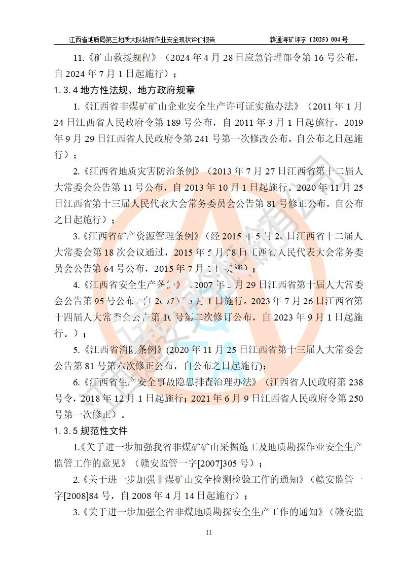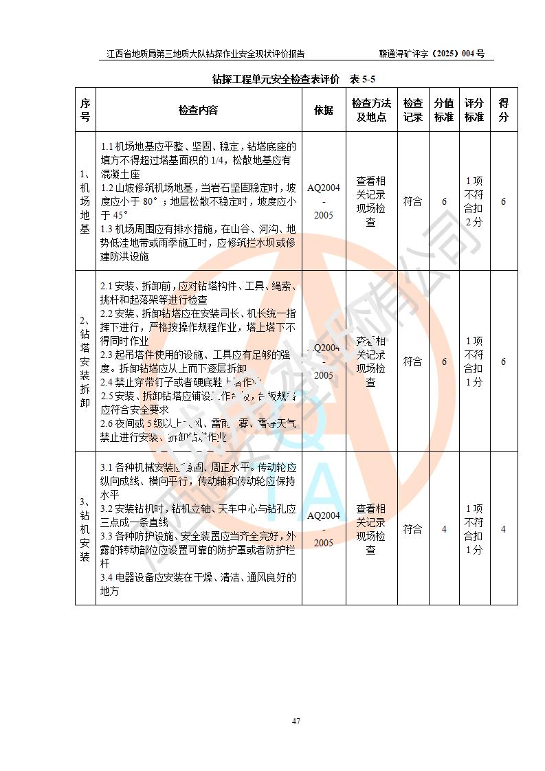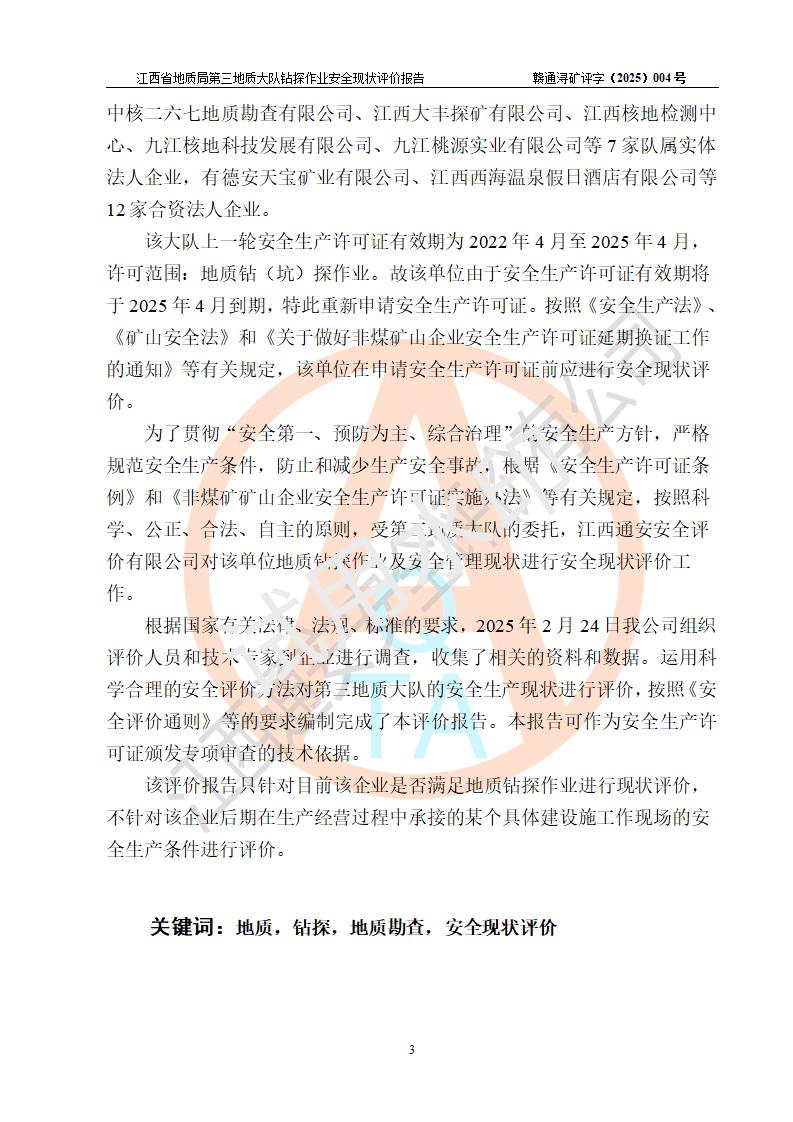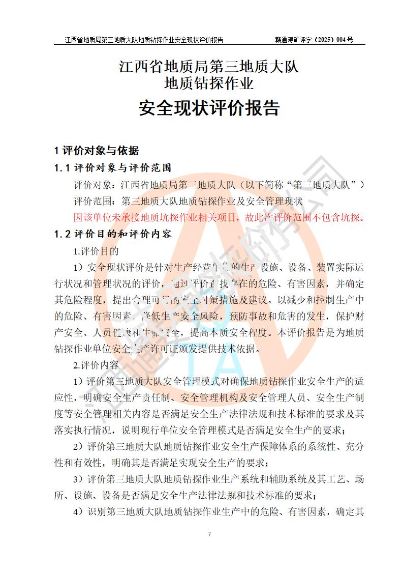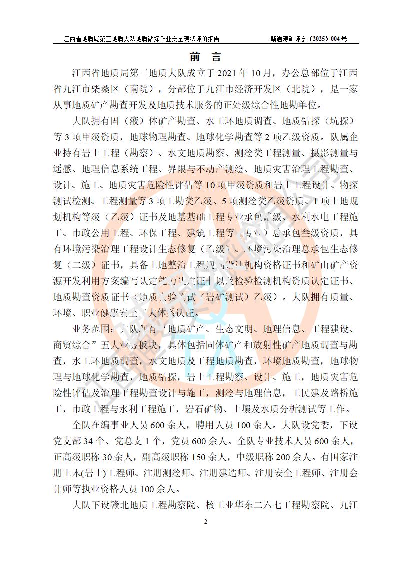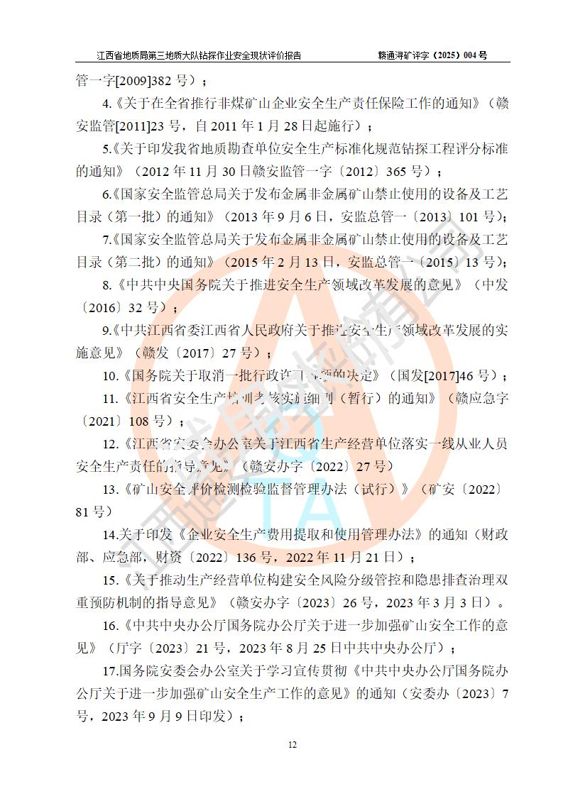 報告名稱 | 江西省地質(zhì)局第三地質(zhì)大隊地質(zhì)鉆探作業(yè)安全現(xiàn)狀評價報告 | |||||