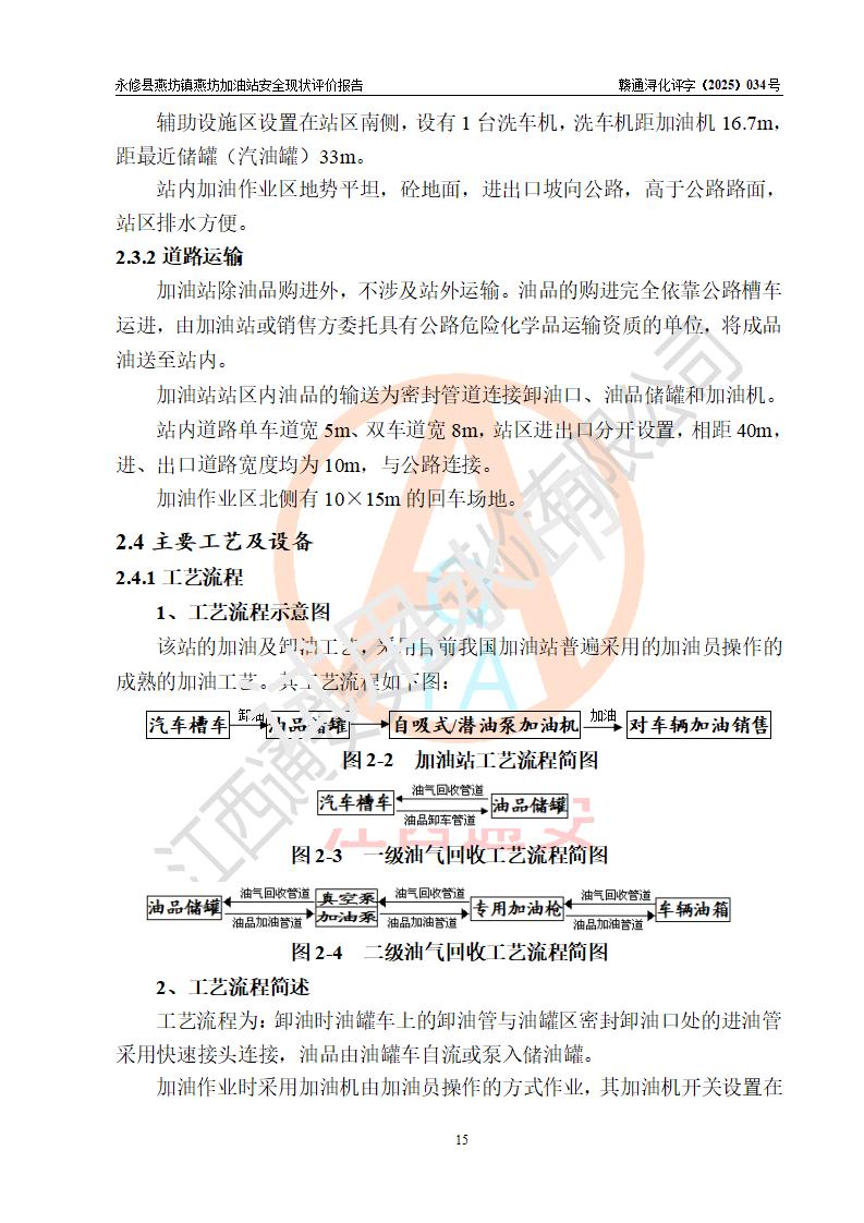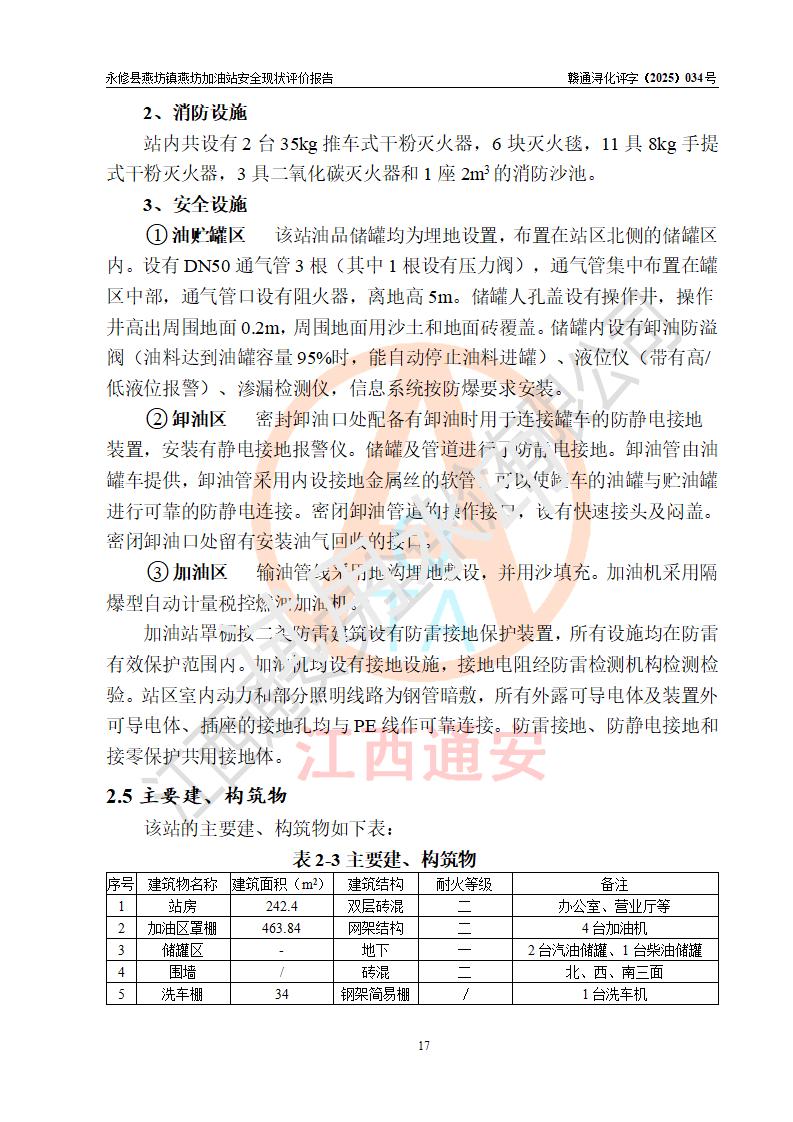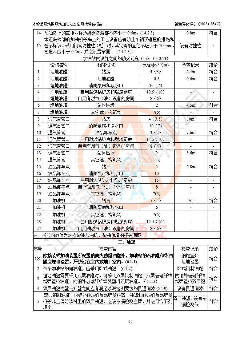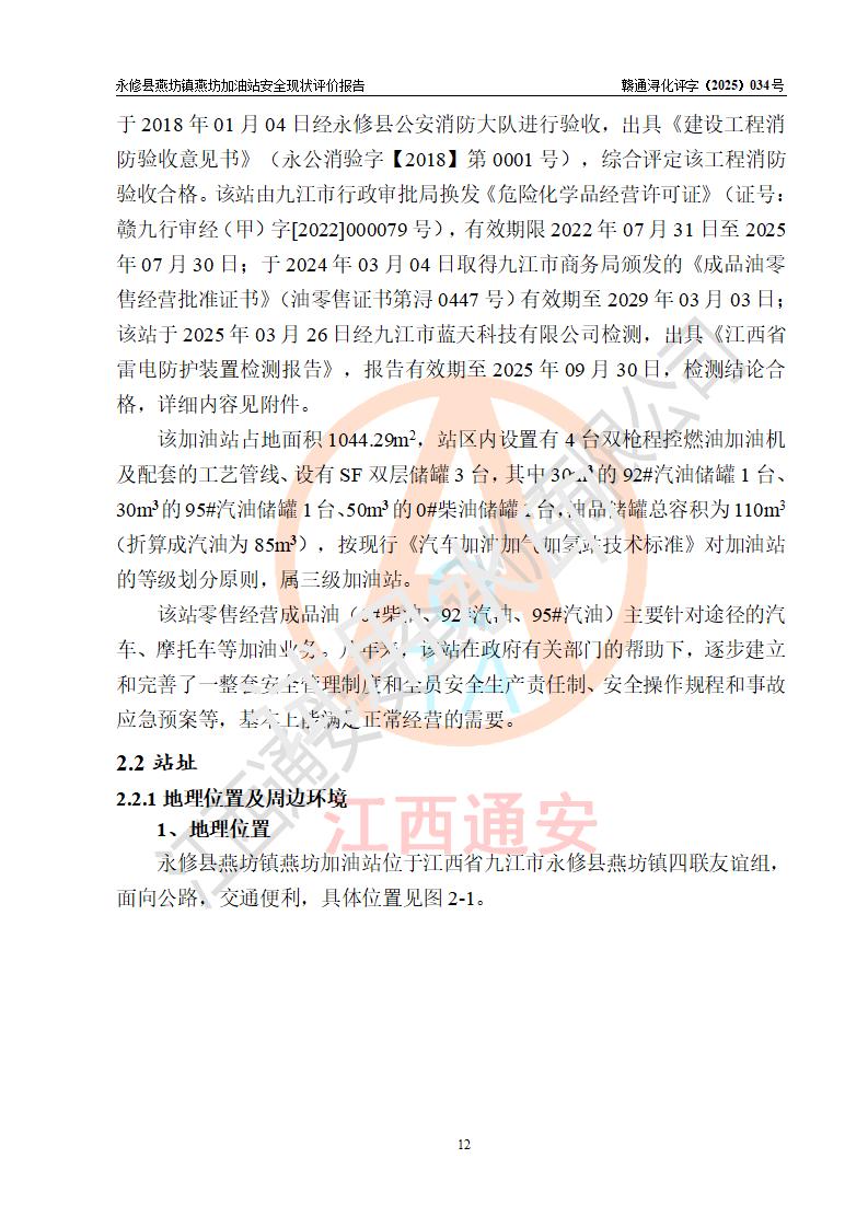 項(xiàng)目簡(jiǎn)介 | 永修縣燕坊鎮(zhèn)燕坊加油站是一家專門從事成品油零售經(jīng)營(yíng)的個(gè)體工商戶,經(jīng)營(yíng)場(chǎng)所位于江西省九江市永修縣燕坊鎮(zhèn)四聯(lián)友誼組?,F(xiàn)有從業(yè)人員6名,其中安全管理人員1人,加油站負(fù)責(zé)人傅偉杰。 該加油站占地面積1044.29m2,站區(qū)內(nèi)設(shè)置有4臺(tái)雙槍程控燃油加油機(jī)及配套的工藝管線、設(shè)有SF雙層儲(chǔ)罐3臺(tái),其中30m3的92#汽油儲(chǔ)罐1臺(tái)、30m3的95#汽油儲(chǔ)罐1臺(tái)、50m3的0#柴油儲(chǔ)罐1臺(tái),油品儲(chǔ)罐總?cè)莘e為110m3(折算成汽油為85m3),按現(xiàn)行《汽車加油加氣加氫站技術(shù)標(biāo)準(zhǔn)》對(duì)加油站的等級(jí)劃分原則,屬三級(jí)加油站。 該站由九江市行政審批局換發(fā)《危險(xiǎn)化學(xué)品經(jīng)營(yíng)許可證》(證號(hào):贛九行審經(jīng)(甲)字[2022]000079號(hào)),**期限2022年07月31日至2025年07月30日。 | |||
