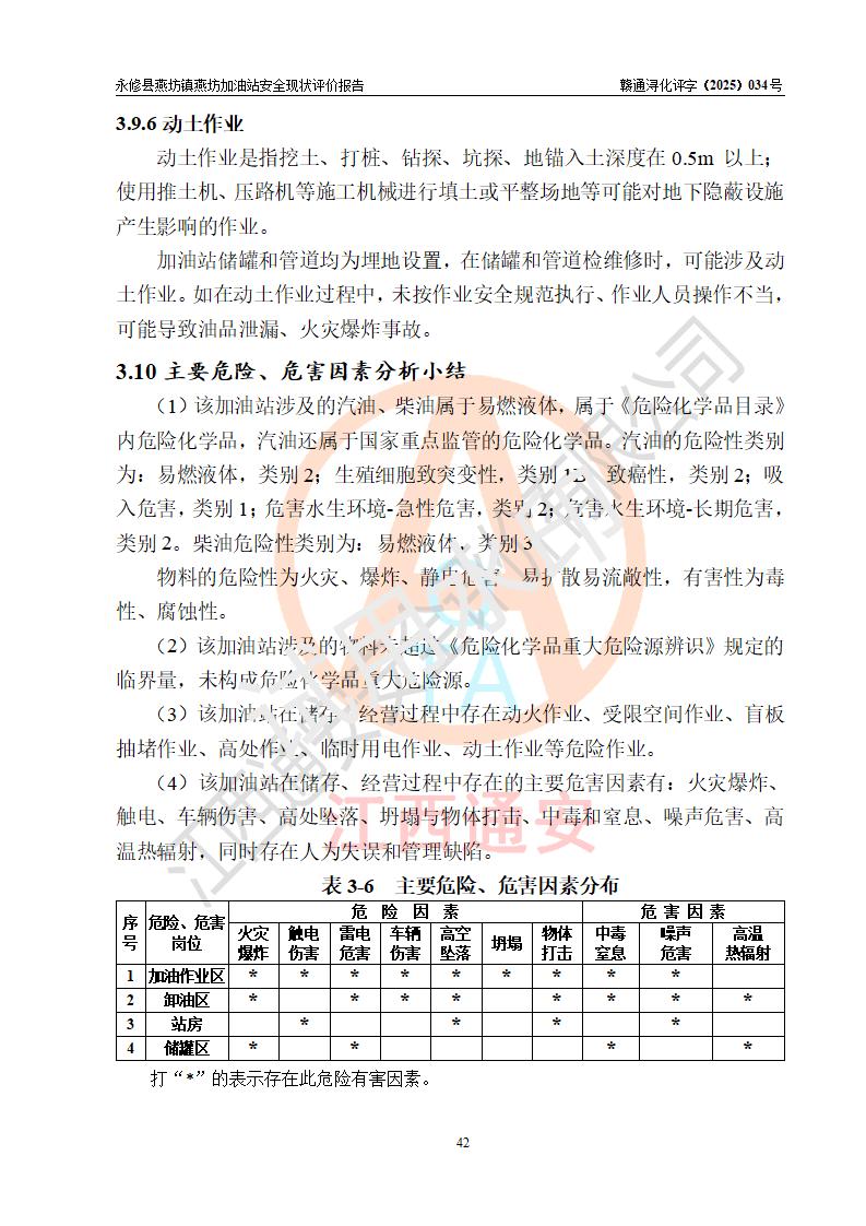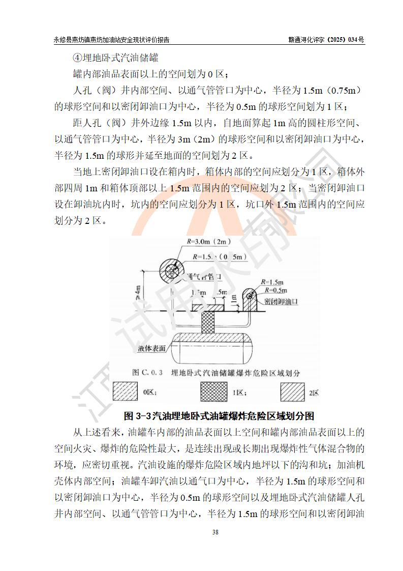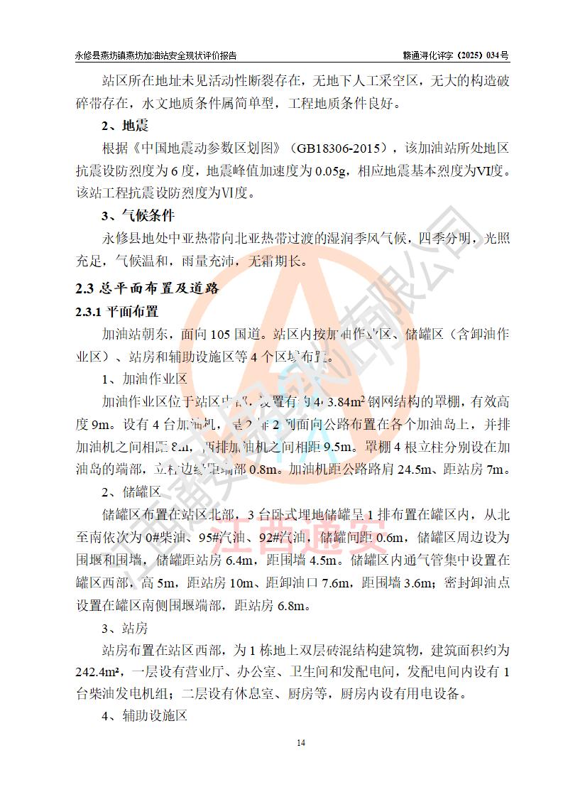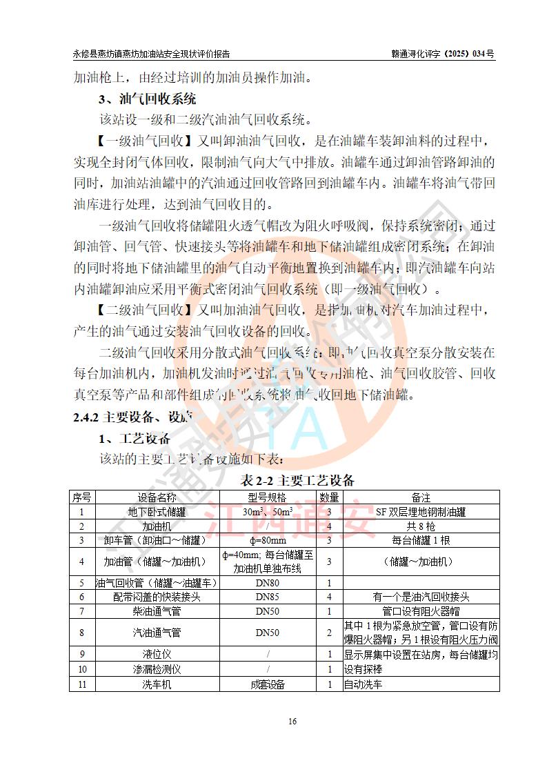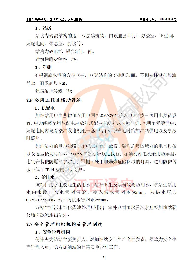 項(xiàng)目簡(jiǎn)介 | 永修縣燕坊鎮(zhèn)燕坊加油站是一家專門從事成品油零售經(jīng)營(yíng)的個(gè)體工商戶,經(jīng)營(yíng)場(chǎng)所位于江西省九江市永修縣燕坊鎮(zhèn)四聯(lián)友誼組?,F(xiàn)有從業(yè)人員6名,其中安全管理人員1人,加油站負(fù)責(zé)人傅偉杰。 該加油站占地面積1044.29m2,站區(qū)內(nèi)設(shè)置有4臺(tái)雙槍程控燃油加油機(jī)及配套的工藝管線、設(shè)有SF雙層儲(chǔ)罐3臺(tái),其中30m3的92#汽油儲(chǔ)罐1臺(tái)、30m3的95#汽油儲(chǔ)罐1臺(tái)、50m3的0#柴油儲(chǔ)罐1臺(tái),油品儲(chǔ)罐總?cè)莘e為110m3(折算成汽油為85m3),按現(xiàn)行《汽車加油加氣加氫站技術(shù)標(biāo)準(zhǔn)》對(duì)加油站的等級(jí)劃分原則,屬三級(jí)加油站。 該站由九江市行政審批局換發(fā)《危險(xiǎn)化學(xué)品經(jīng)營(yíng)許可證》(證號(hào):贛九行審經(jīng)(甲)字[2022]000079號(hào)),**期限2022年07月31日至2025年07月30日。 | |||
