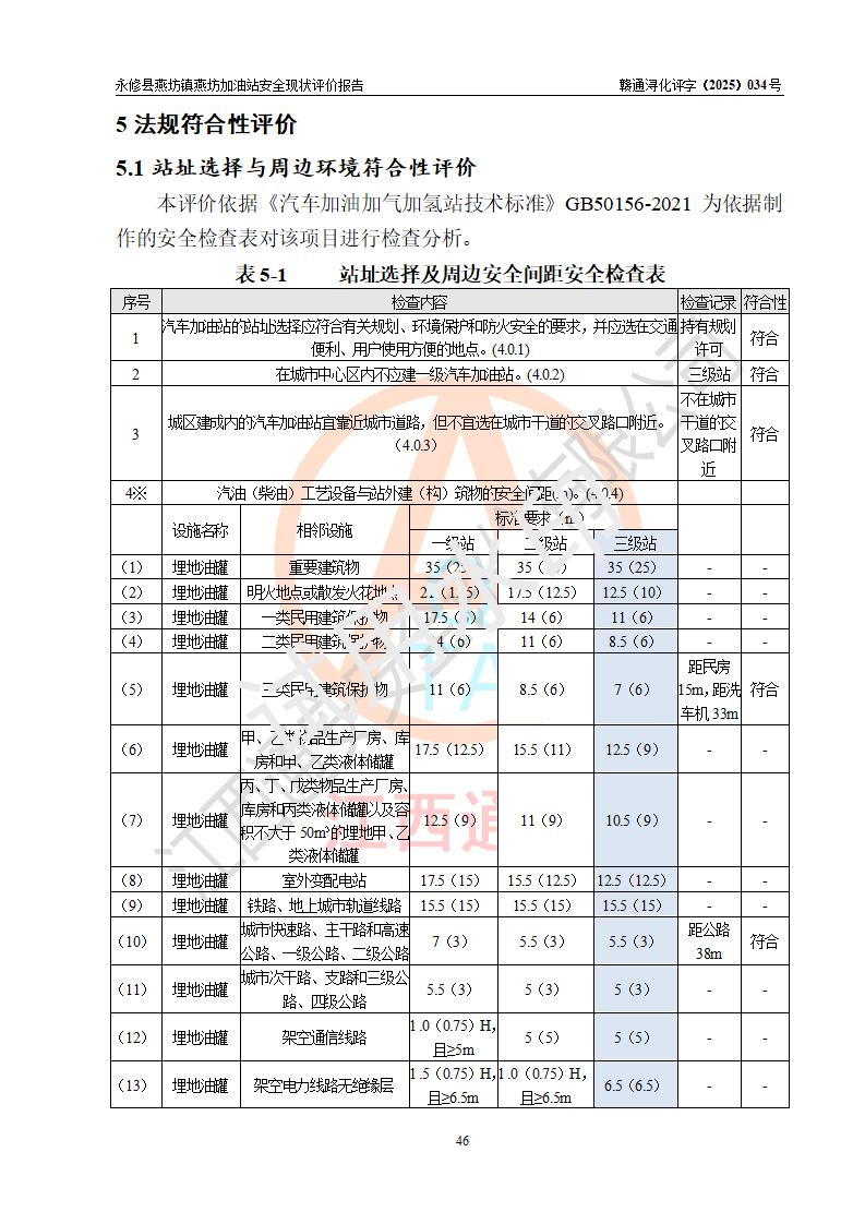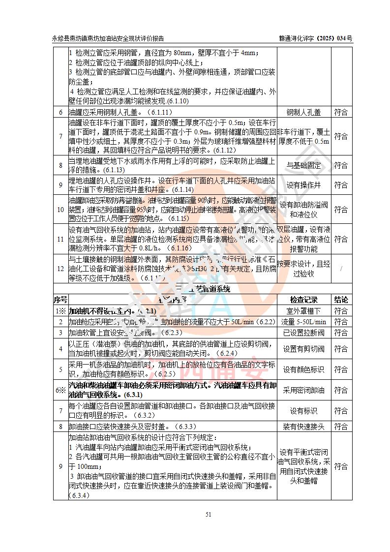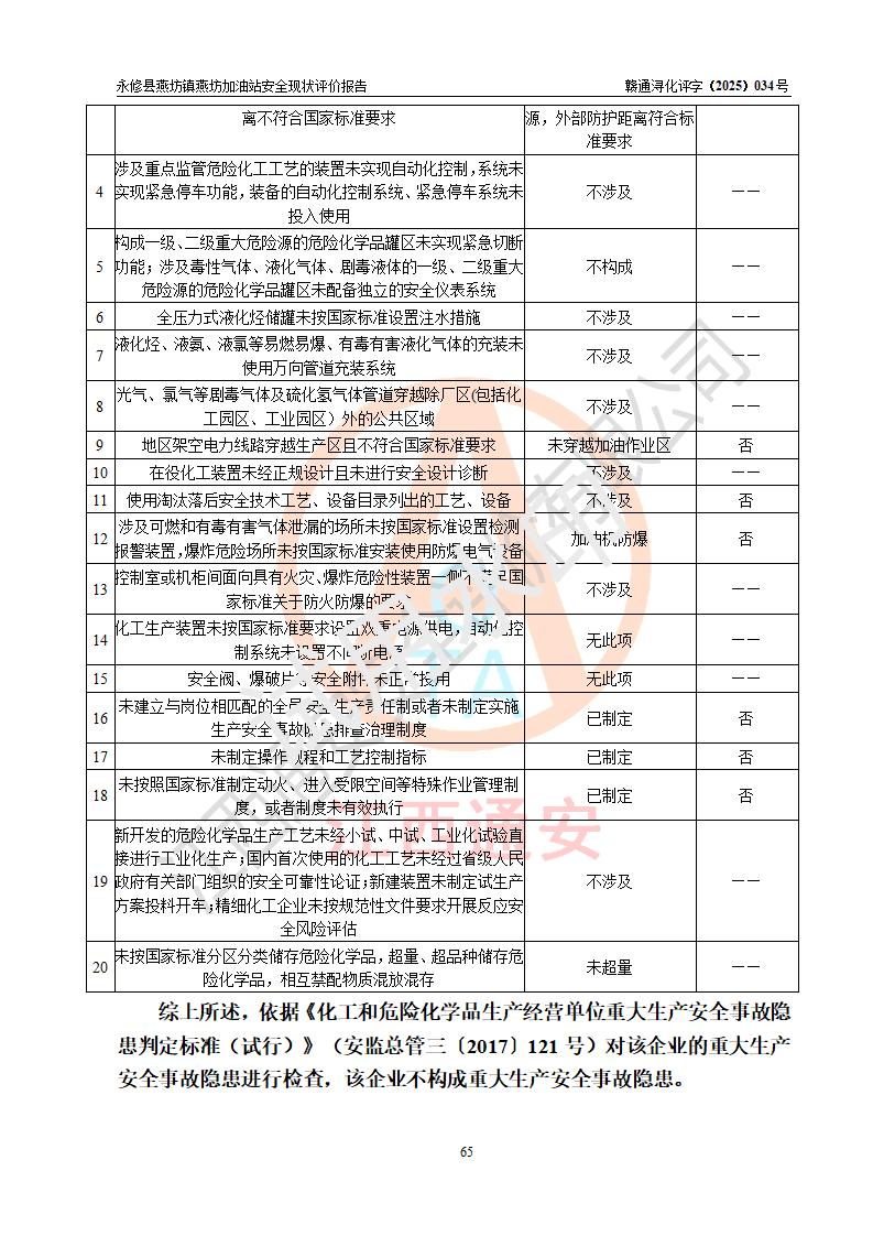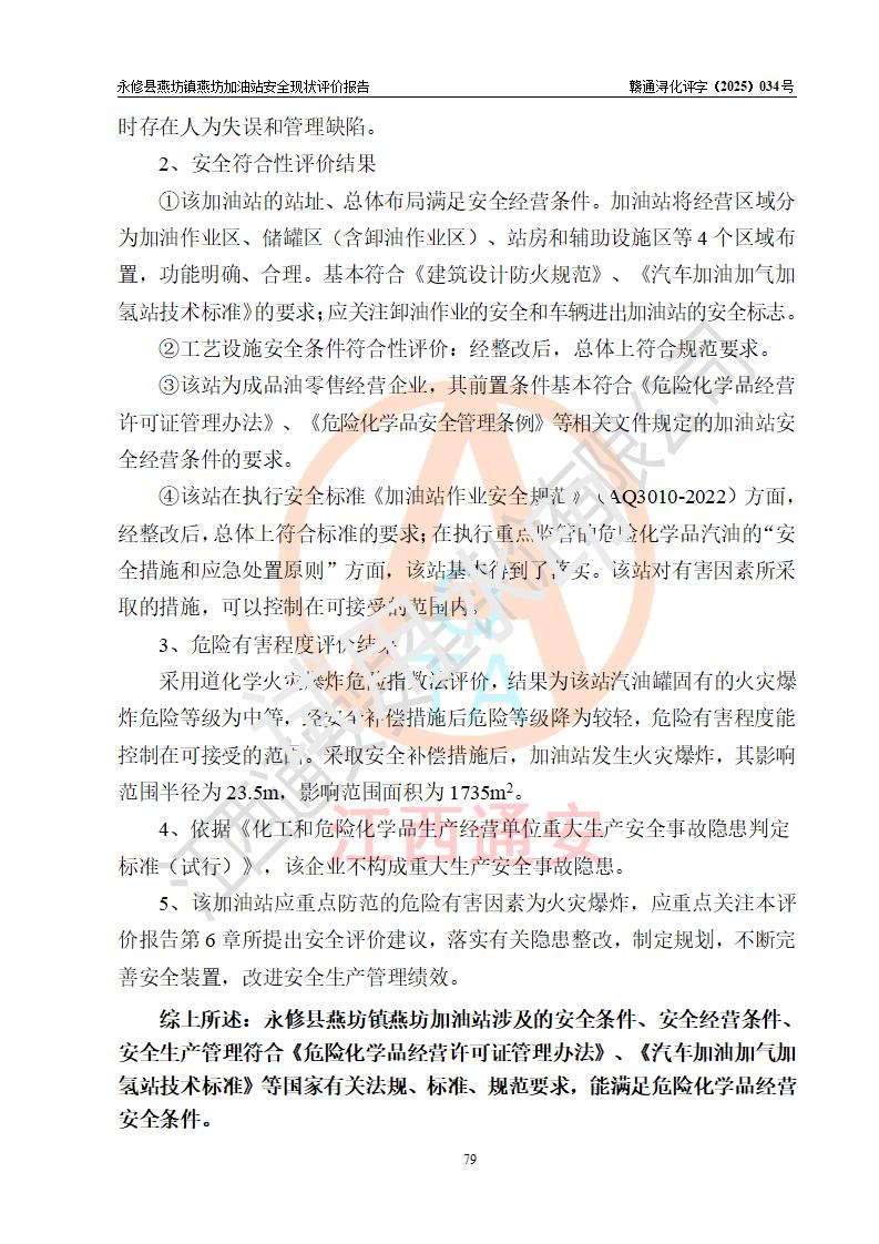 評(píng)價(jià)結(jié)論 | 永修縣燕坊鎮(zhèn)燕坊加油站涉及的安全條件、安全經(jīng)營(yíng)條件、安全生產(chǎn)管理符合《危險(xiǎn)化學(xué)品經(jīng)營(yíng)許可證管理辦法》、《汽車加油加氣加氫站技術(shù)標(biāo)準(zhǔn)》等**有關(guān)法規(guī)、標(biāo)準(zhǔn)、規(guī)范要求,能滿足危險(xiǎn)化學(xué)品經(jīng)營(yíng)安全條件。 | |||