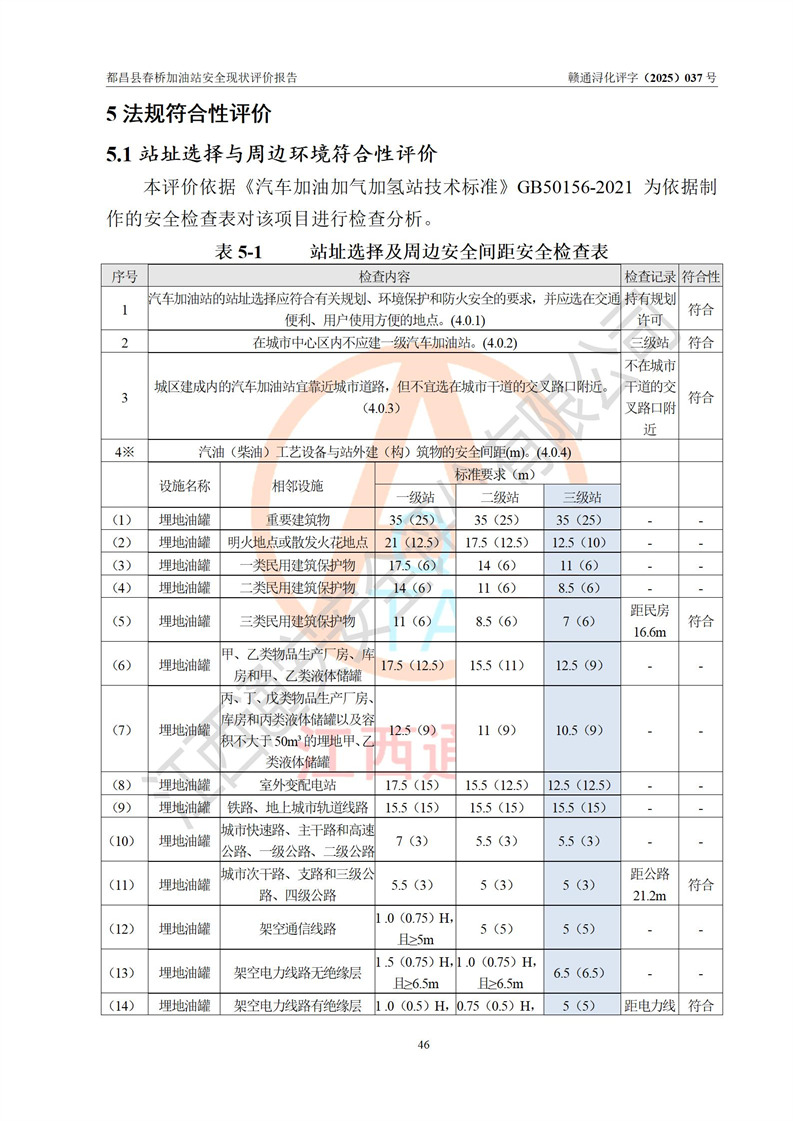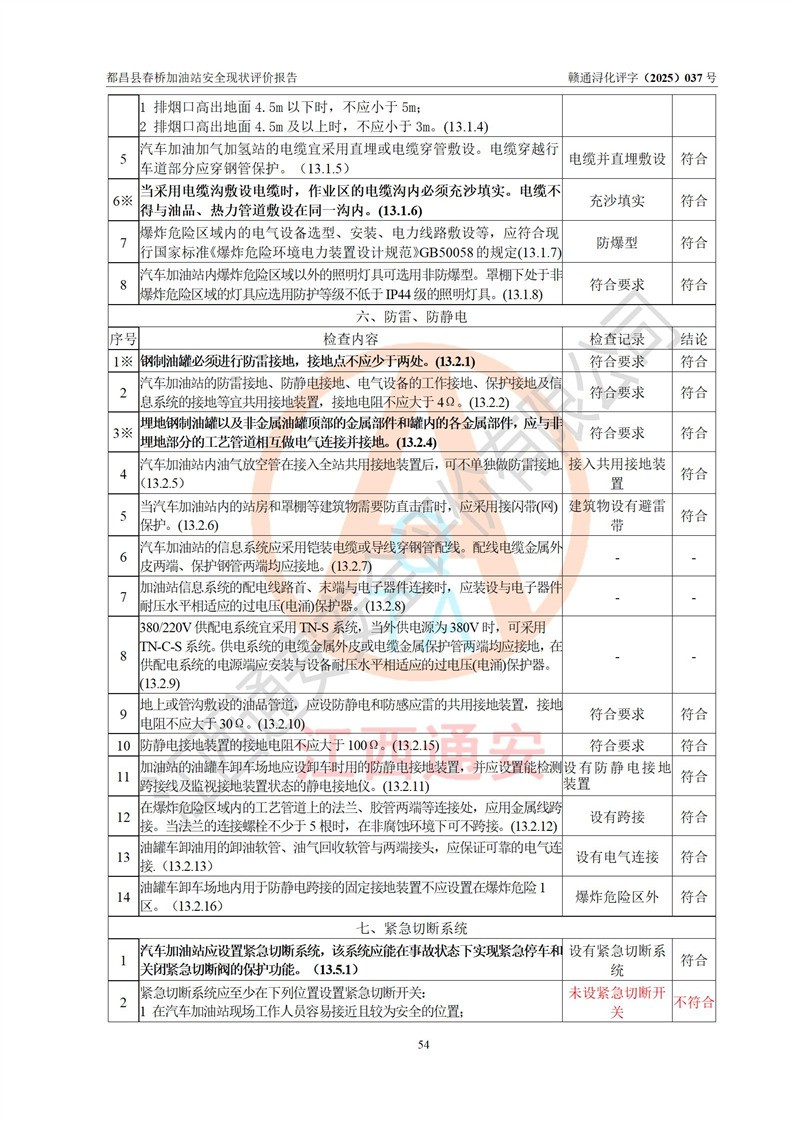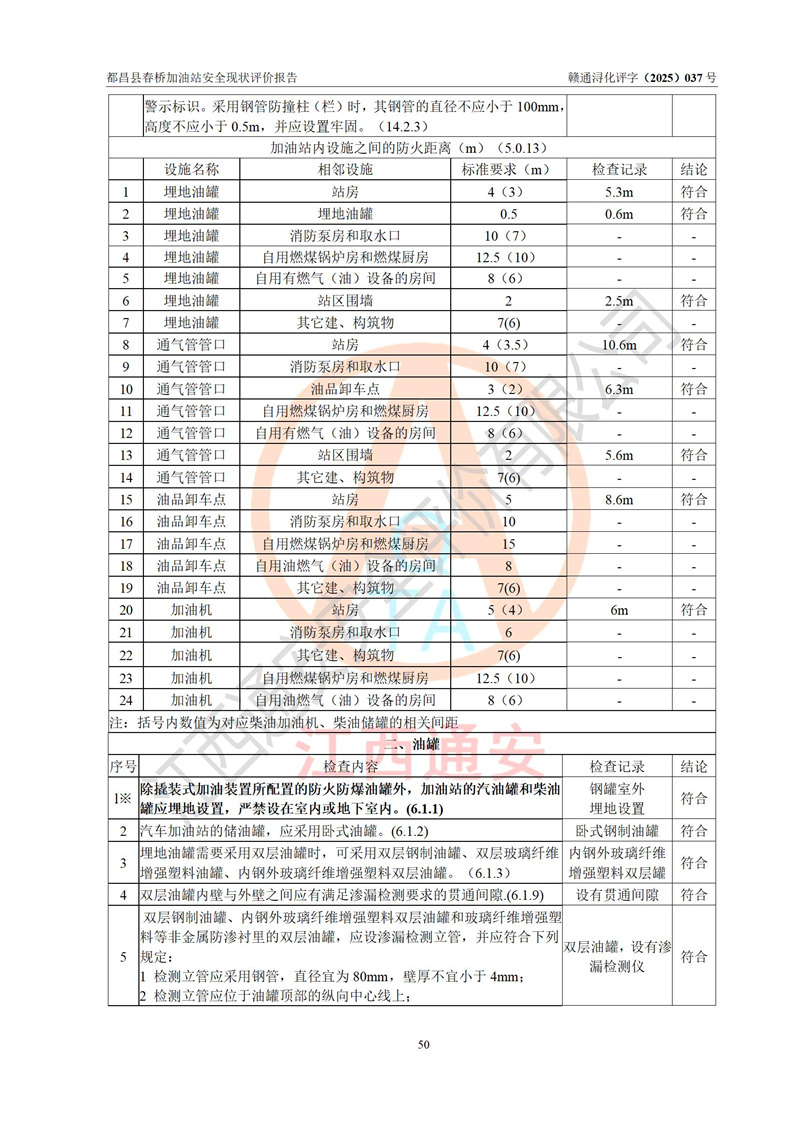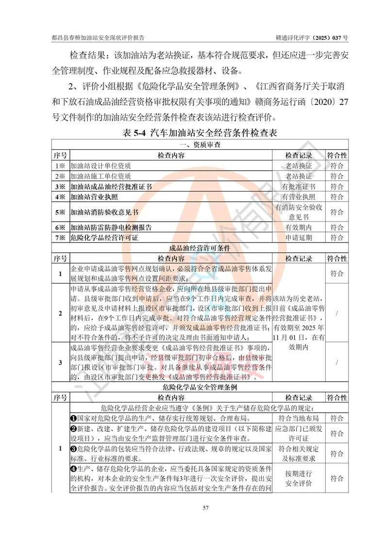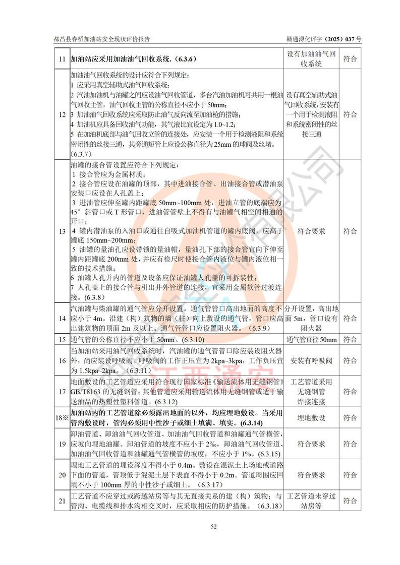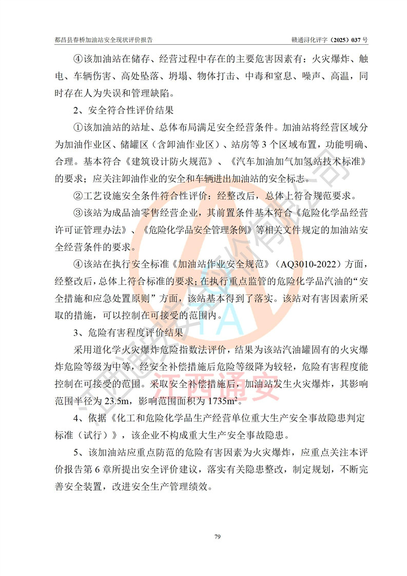 評價結(jié)論 | 都昌縣春橋加油站涉及的安全條件、安全經(jīng)營條件、安全生產(chǎn)管理符合《危險化學(xué)品經(jīng)營許可證管理辦法》、《汽車加油加氣加氫站技術(shù)標(biāo)準(zhǔn)》等**有關(guān)法規(guī)、標(biāo)準(zhǔn)、規(guī)范要求,能滿足危險化學(xué)品經(jīng)營安全條件。 | |||