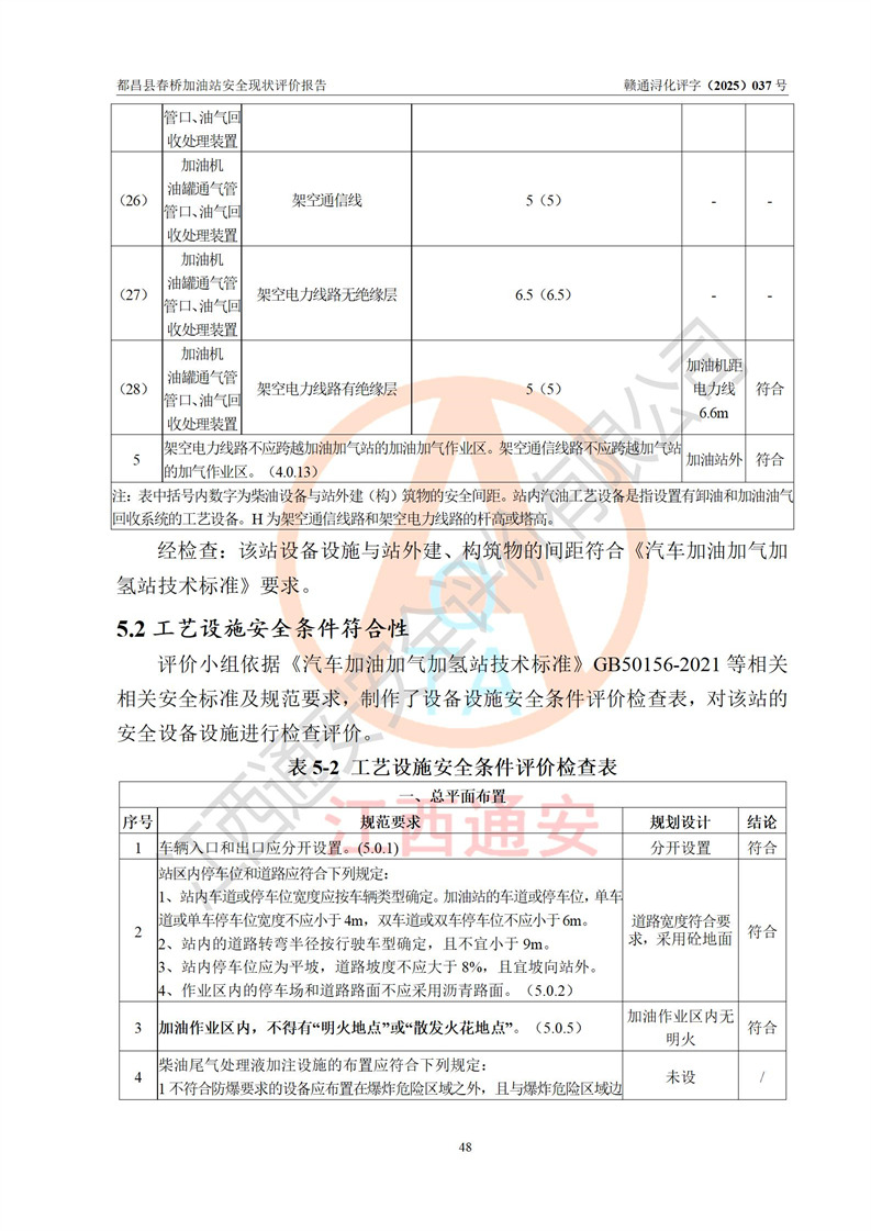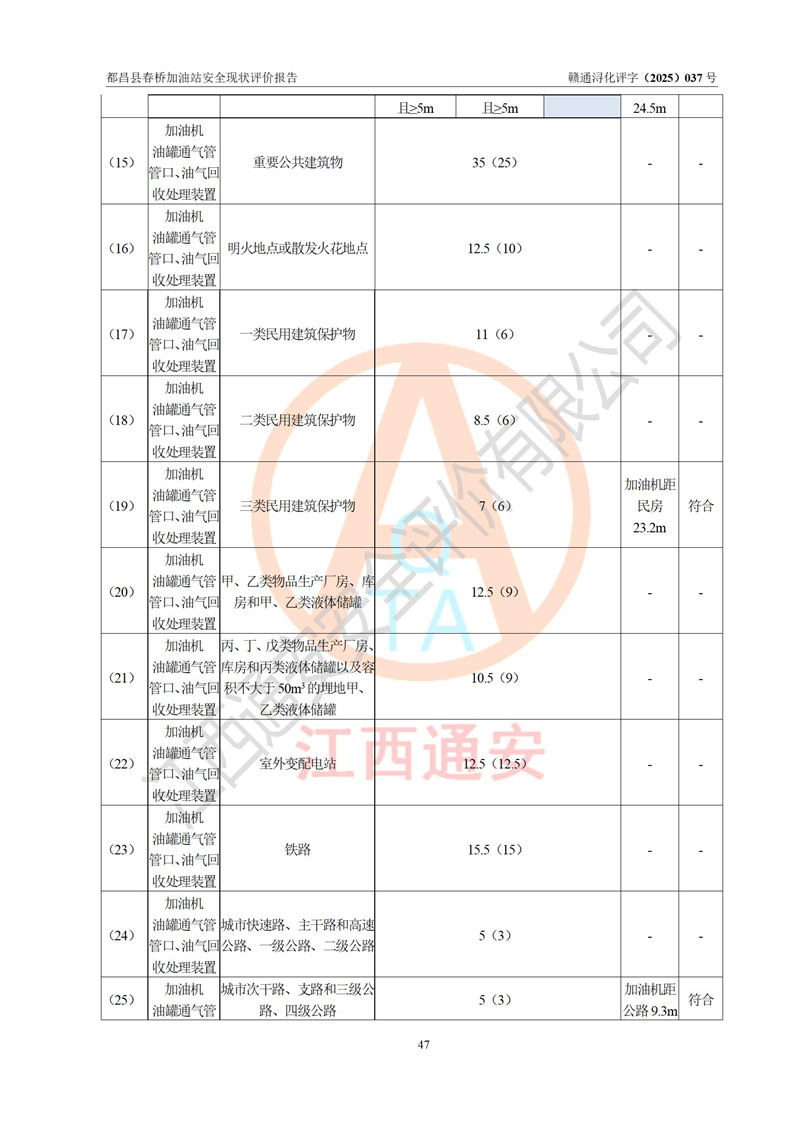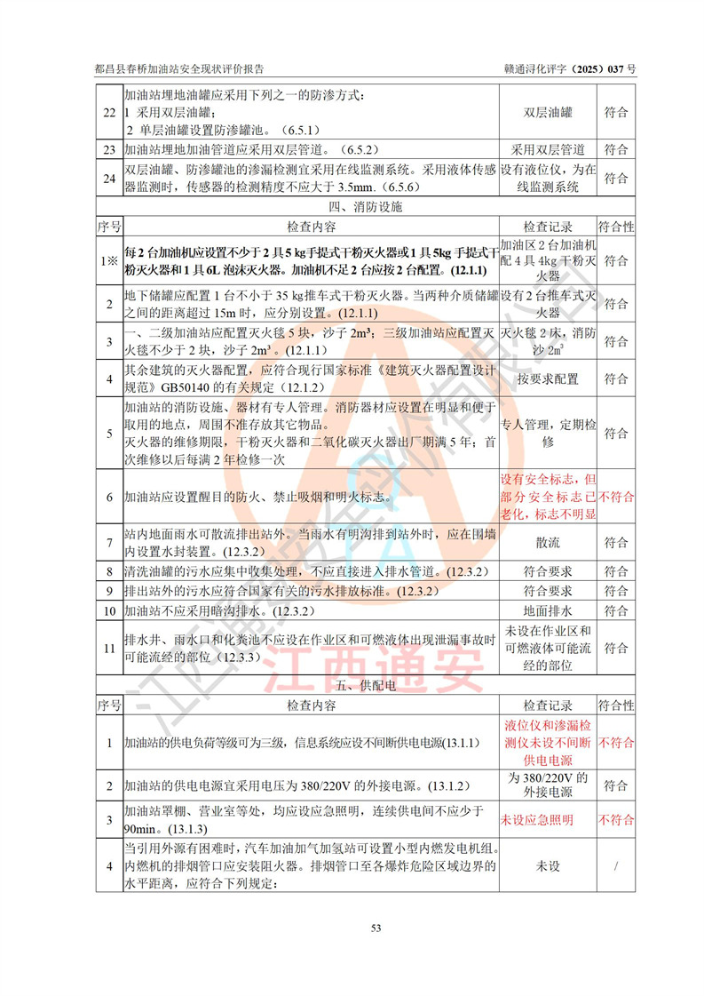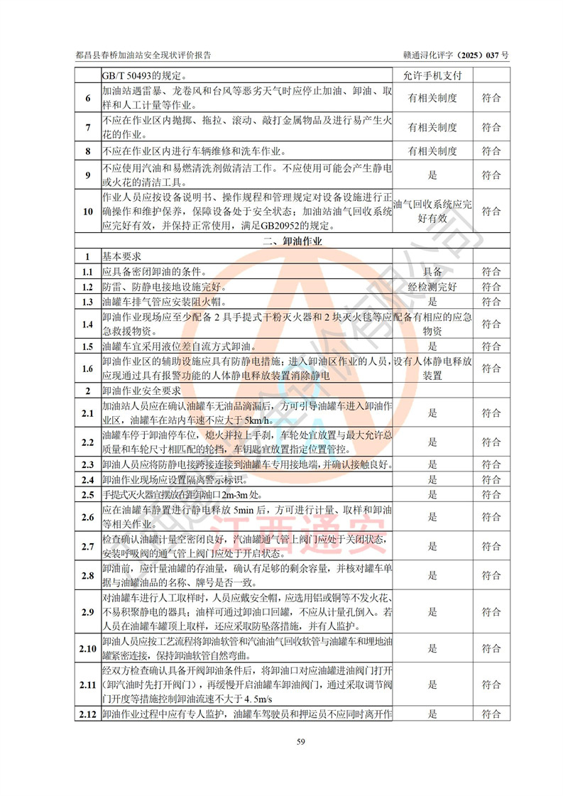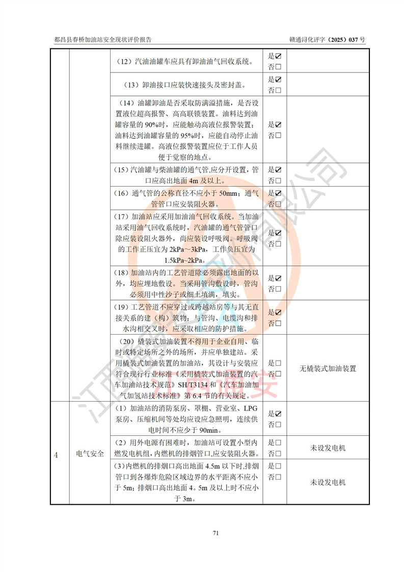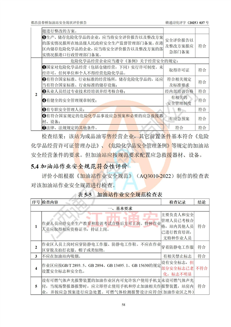 評價結(jié)論 | 都昌縣春橋加油站涉及的安全條件、安全經(jīng)營條件、安全生產(chǎn)管理符合《危險化學(xué)品經(jīng)營許可證管理辦法》、《汽車加油加氣加氫站技術(shù)標(biāo)準(zhǔn)》等**有關(guān)法規(guī)、標(biāo)準(zhǔn)、規(guī)范要求,能滿足危險化學(xué)品經(jīng)營安全條件。 | |||