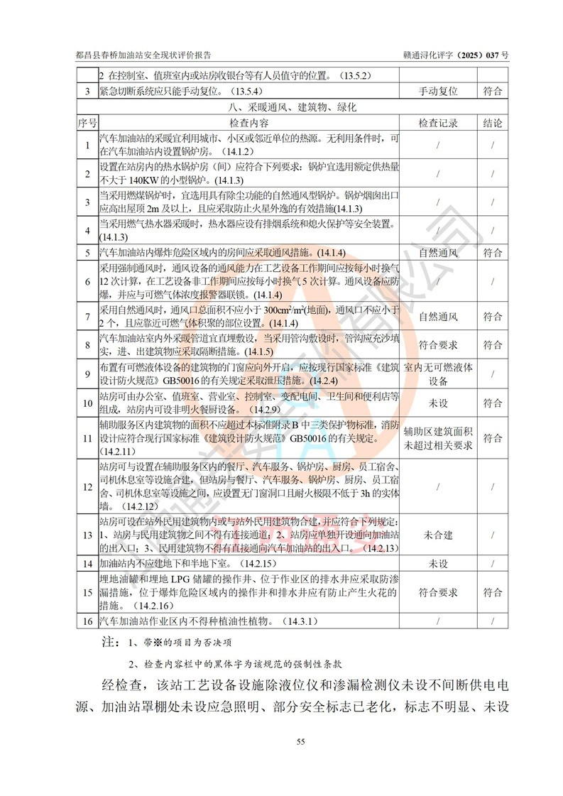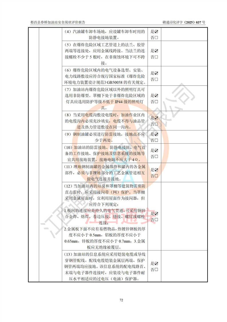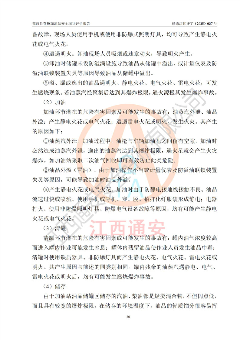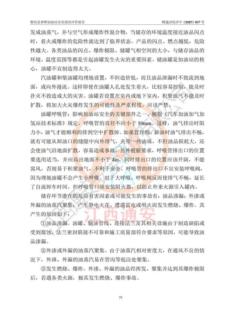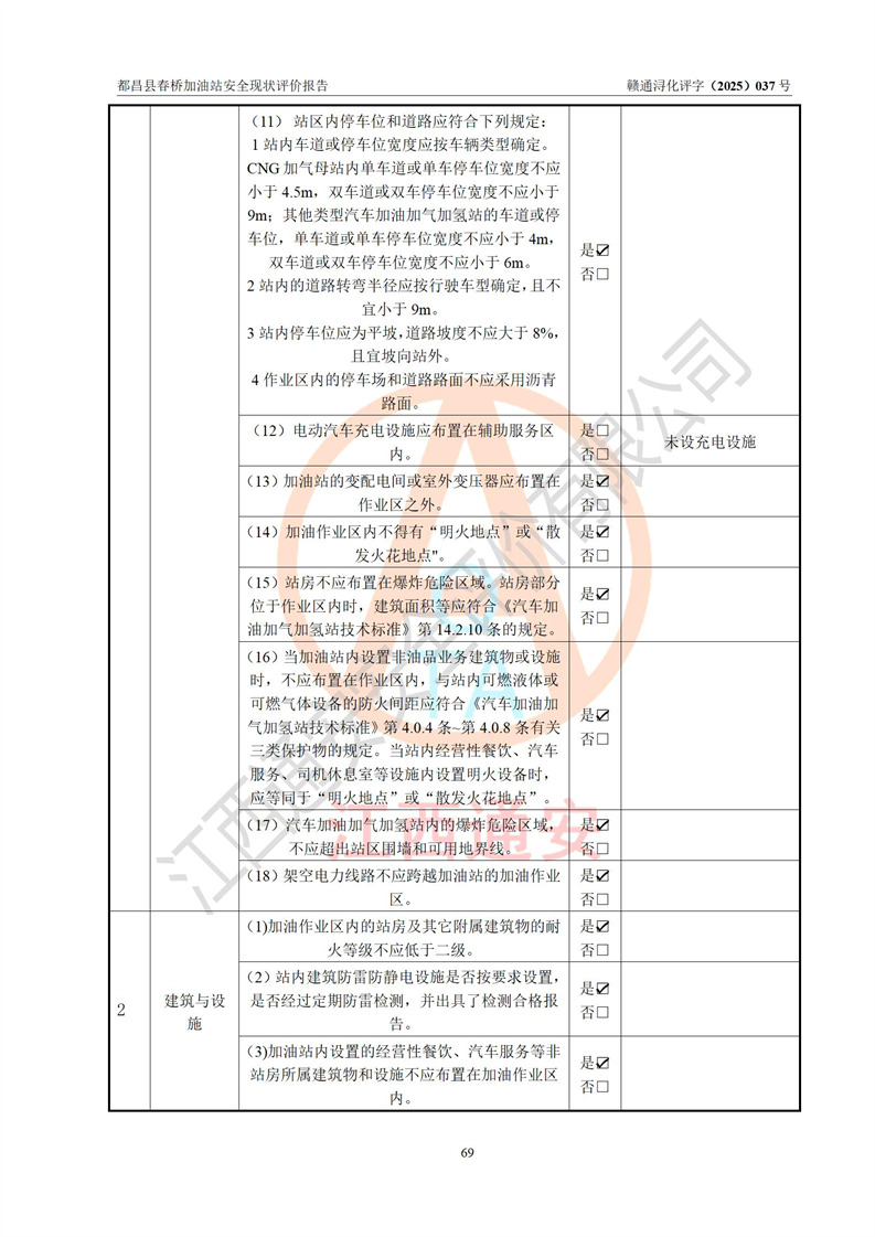 評價結(jié)論 | 都昌縣春橋加油站涉及的安全條件、安全經(jīng)營條件、安全生產(chǎn)管理符合《危險化學(xué)品經(jīng)營許可證管理辦法》、《汽車加油加氣加氫站技術(shù)標(biāo)準(zhǔn)》等**有關(guān)法規(guī)、標(biāo)準(zhǔn)、規(guī)范要求,能滿足危險化學(xué)品經(jīng)營安全條件。 | |||