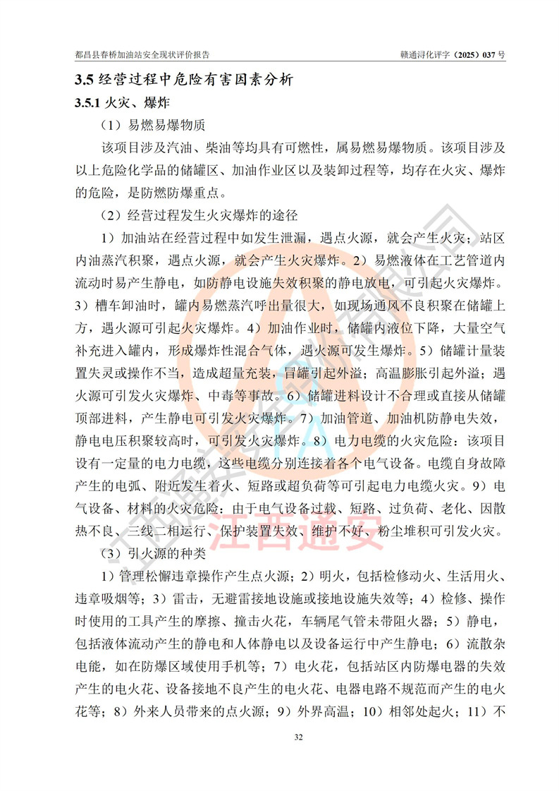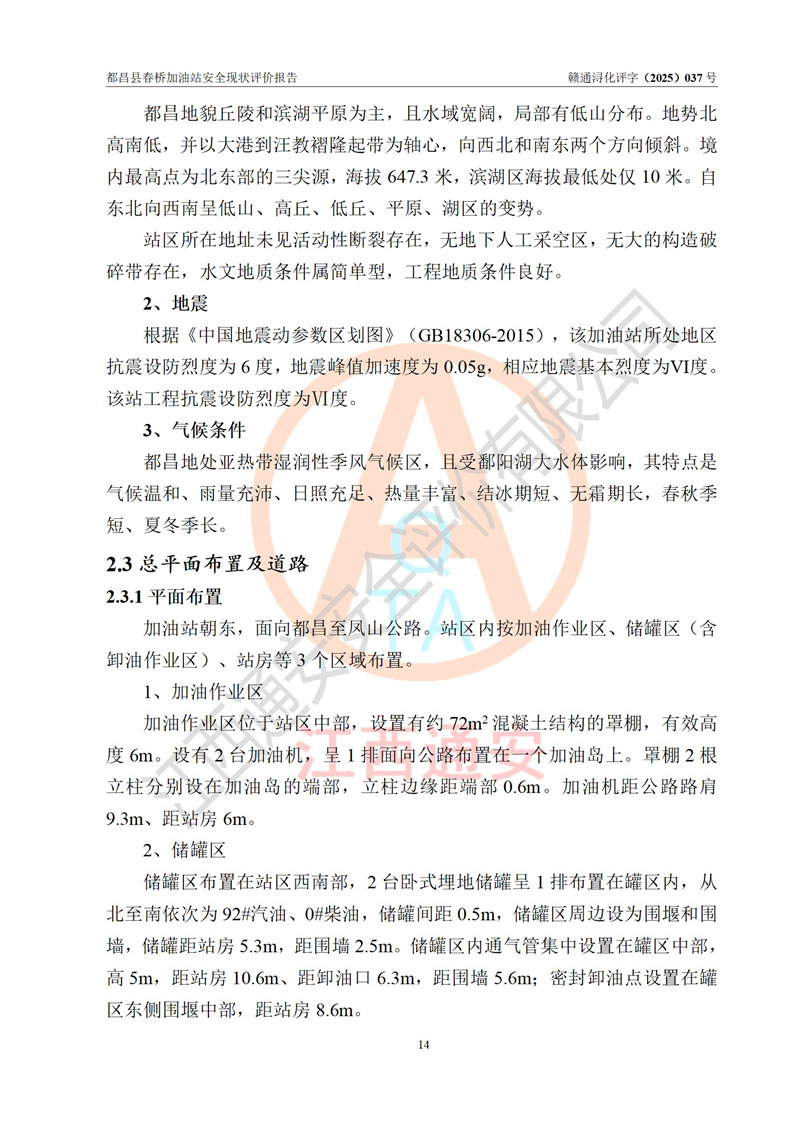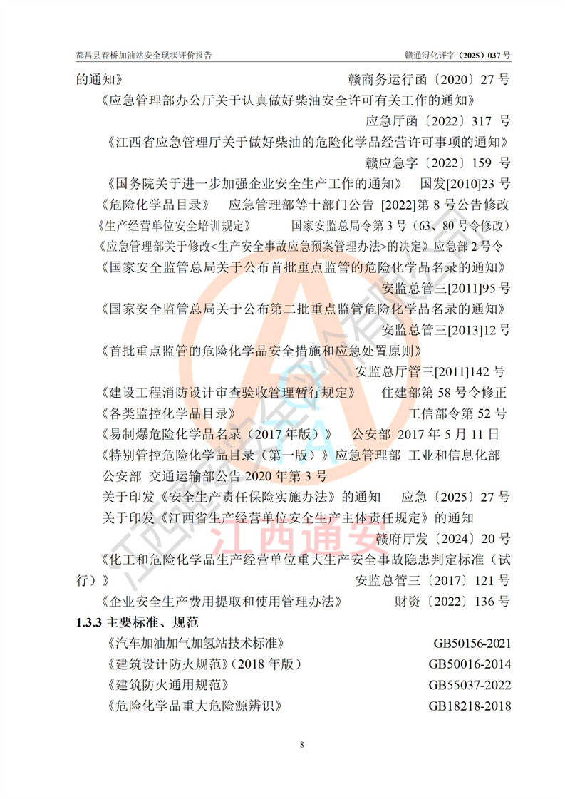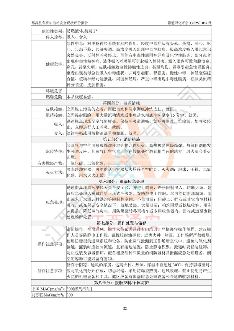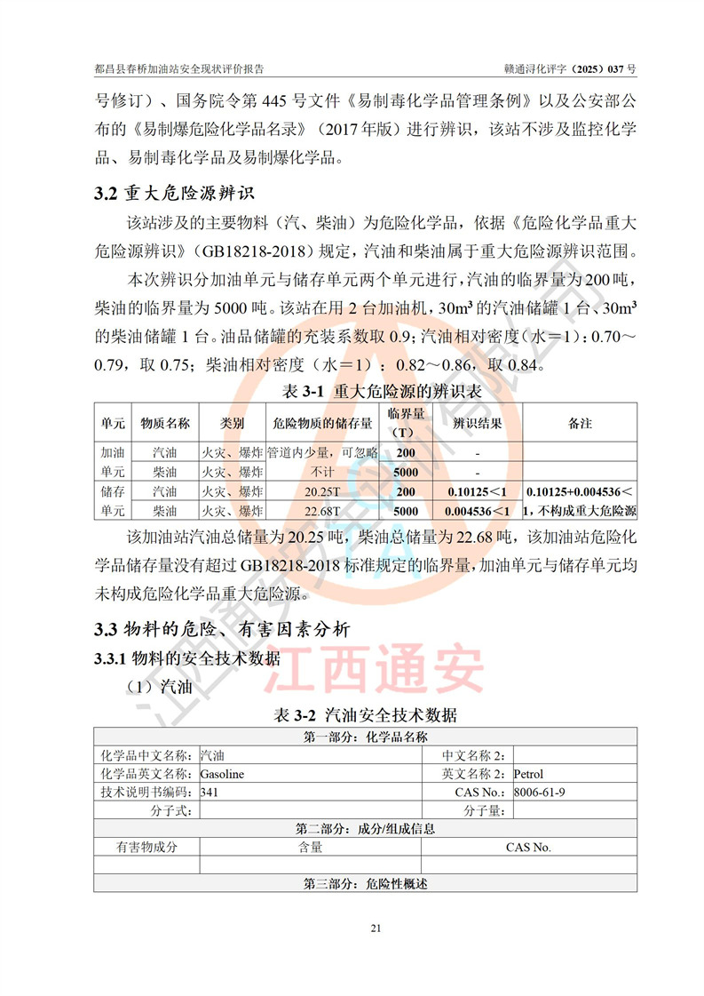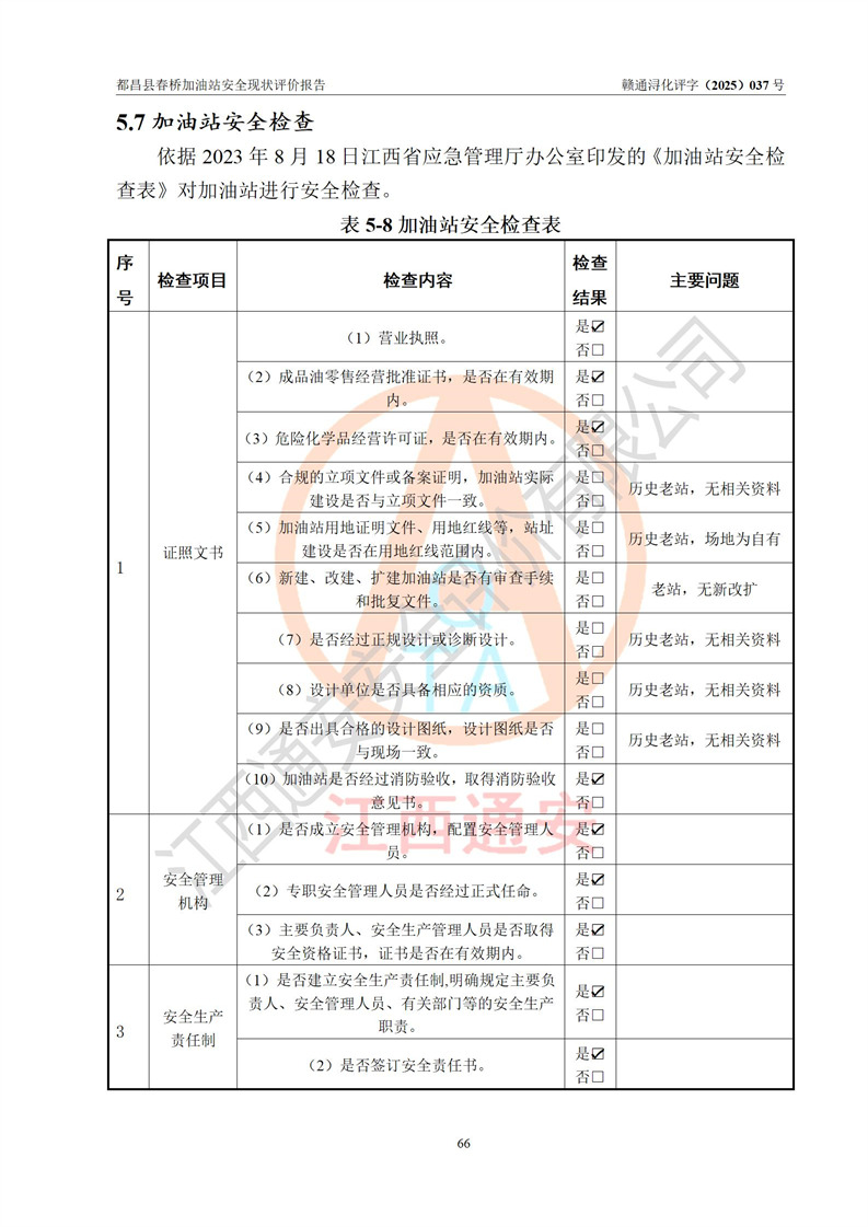 評價結(jié)論 | 都昌縣春橋加油站涉及的安全條件、安全經(jīng)營條件、安全生產(chǎn)管理符合《危險化學(xué)品經(jīng)營許可證管理辦法》、《汽車加油加氣加氫站技術(shù)標(biāo)準(zhǔn)》等**有關(guān)法規(guī)、標(biāo)準(zhǔn)、規(guī)范要求,能滿足危險化學(xué)品經(jīng)營安全條件。 | |||