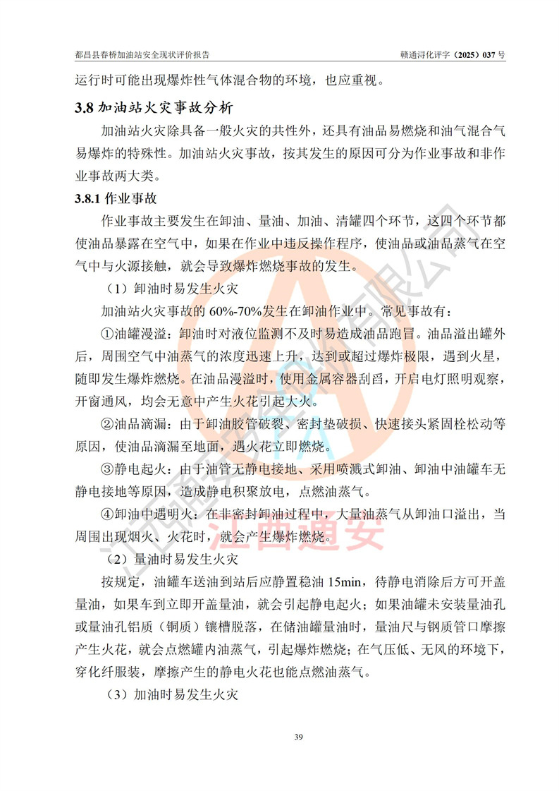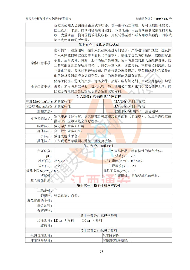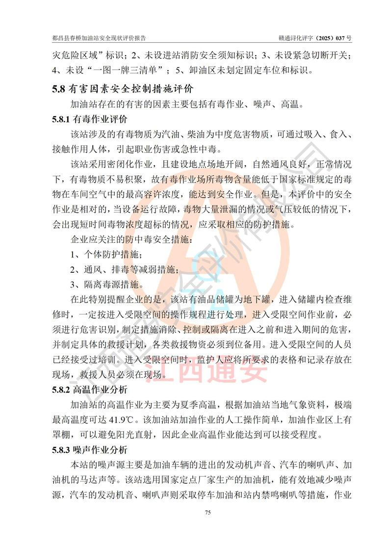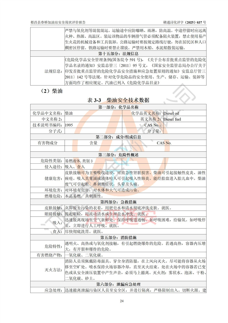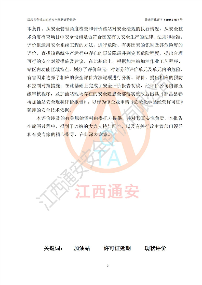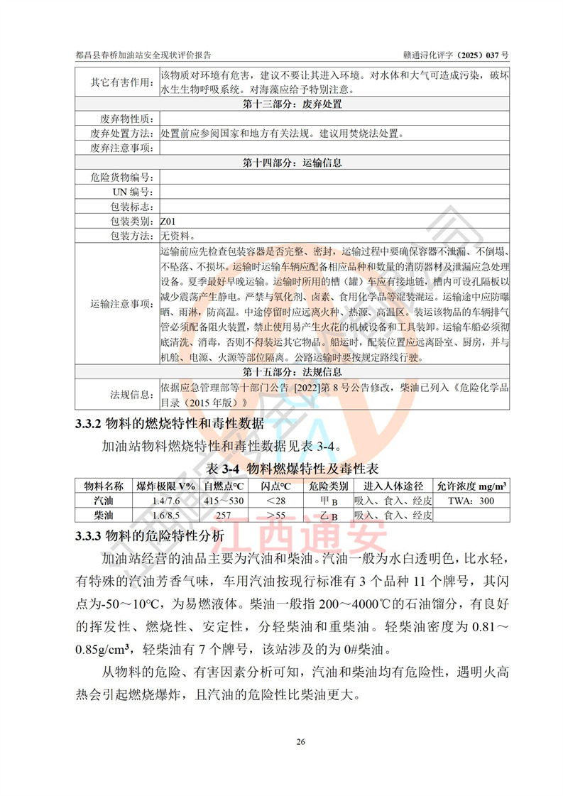 評價結(jié)論 | 都昌縣春橋加油站涉及的安全條件、安全經(jīng)營條件、安全生產(chǎn)管理符合《危險化學(xué)品經(jīng)營許可證管理辦法》、《汽車加油加氣加氫站技術(shù)標(biāo)準(zhǔn)》等**有關(guān)法規(guī)、標(biāo)準(zhǔn)、規(guī)范要求,能滿足危險化學(xué)品經(jīng)營安全條件。 | |||