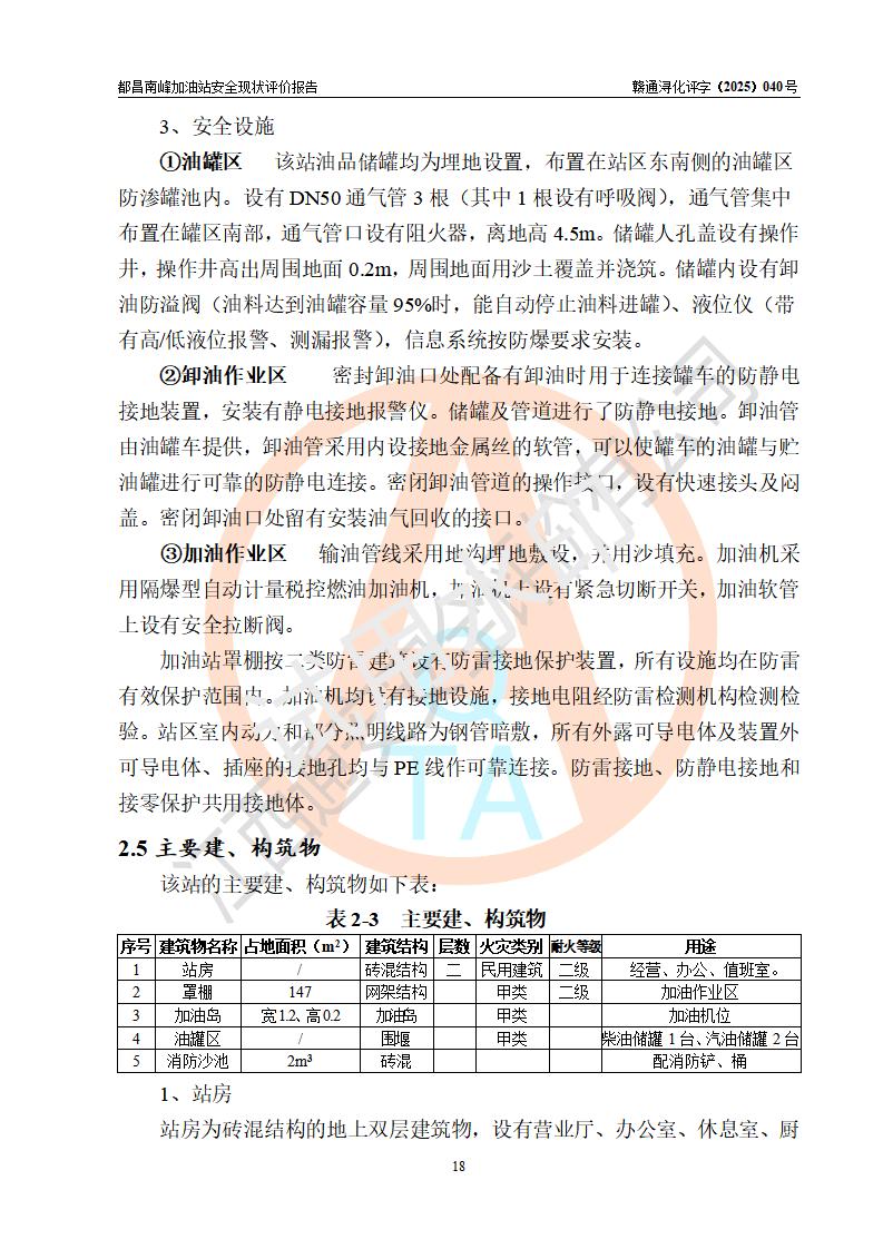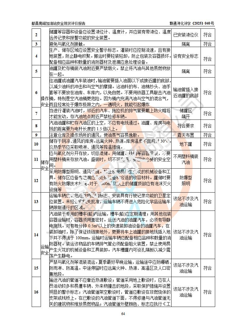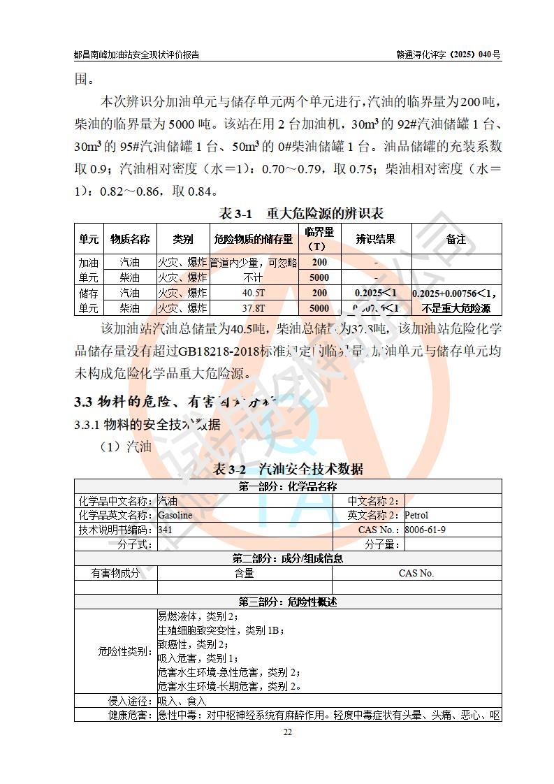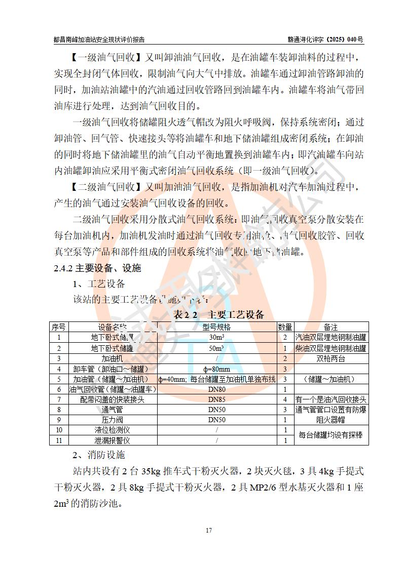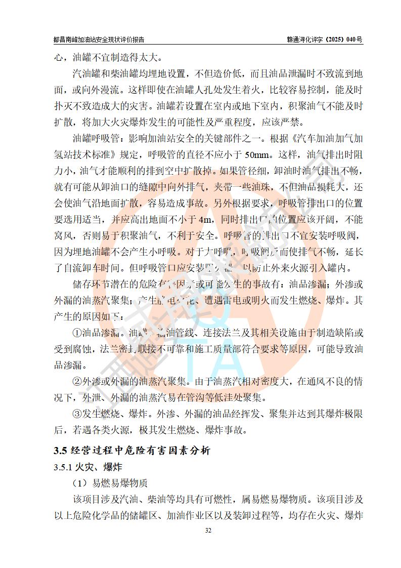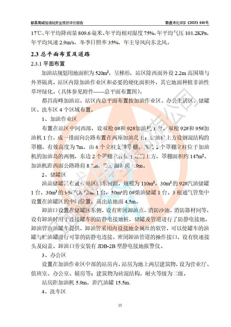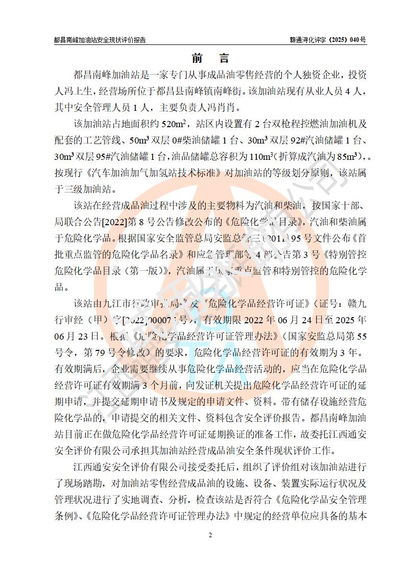 都昌南峰加油站是一家專門從事成品油零售經營的個人獨資企業(yè),投資人馮上生,經營場所位于都昌縣南峰鎮(zhèn)南峰街。該加油站現有從業(yè)人員4人,其中安全管理人員1人,主要負責人馮肖肖。 該加油站占地面積約520m2,站區(qū)內設置有2臺雙槍程控燃油加油機及配套的工藝管線、50m3雙層0#柴油儲罐1臺、30m3雙層92#汽油儲罐1臺、30m3雙層95#汽油儲罐1臺,油品儲罐總容積為110m3(折算成汽油為85m3),。按現行《汽車加油加氣加氫站技術標準》對加油站的等級劃分原則,該站屬于三級加油站。 該站由九江市行政審批局換發(fā)《危險化學品經營許可證》(證號:贛九行審經(甲)字[2022]000075號),**期限2022年06月24日至2025年06月23日。 |