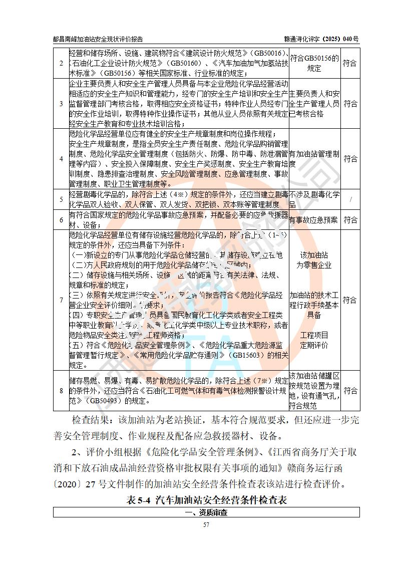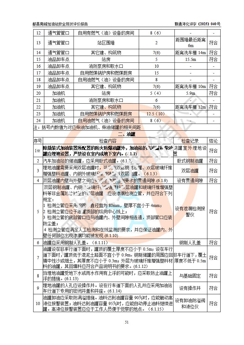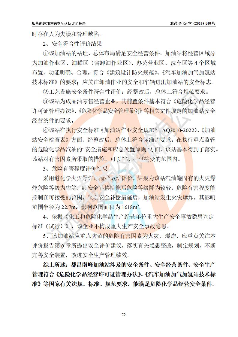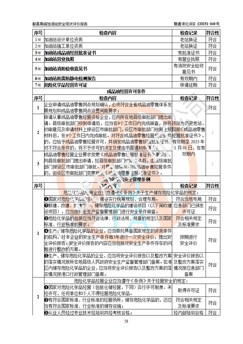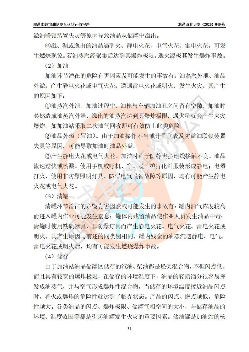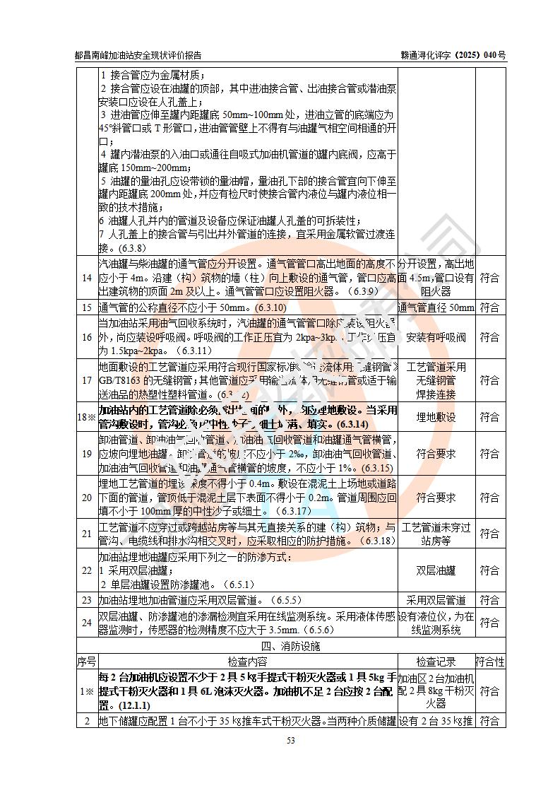 都昌南峰加油站是一家專門從事成品油零售經營的個人獨資企業(yè),投資人馮上生,經營場所位于都昌縣南峰鎮(zhèn)南峰街。該加油站現有從業(yè)人員4人,其中安全管理人員1人,主要負責人馮肖肖。 該加油站占地面積約520m2,站區(qū)內設置有2臺雙槍程控燃油加油機及配套的工藝管線、50m3雙層0#柴油儲罐1臺、30m3雙層92#汽油儲罐1臺、30m3雙層95#汽油儲罐1臺,油品儲罐總容積為110m3(折算成汽油為85m3),。按現行《汽車加油加氣加氫站技術標準》對加油站的等級劃分原則,該站屬于三級加油站。 該站由九江市行政審批局換發(fā)《危險化學品經營許可證》(證號:贛九行審經(甲)字[2022]000075號),**期限2022年06月24日至2025年06月23日。 |