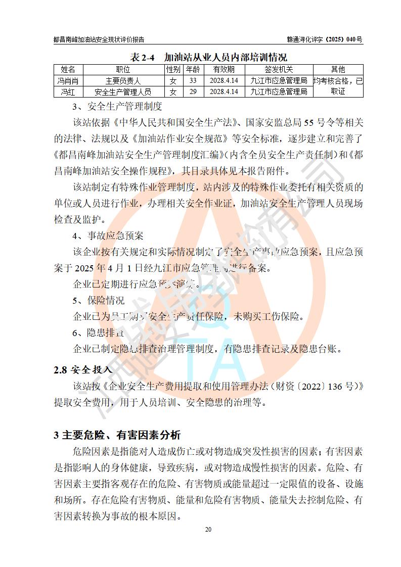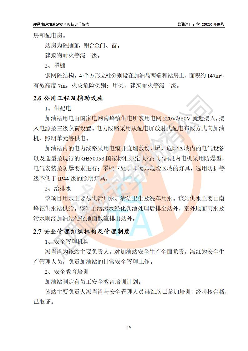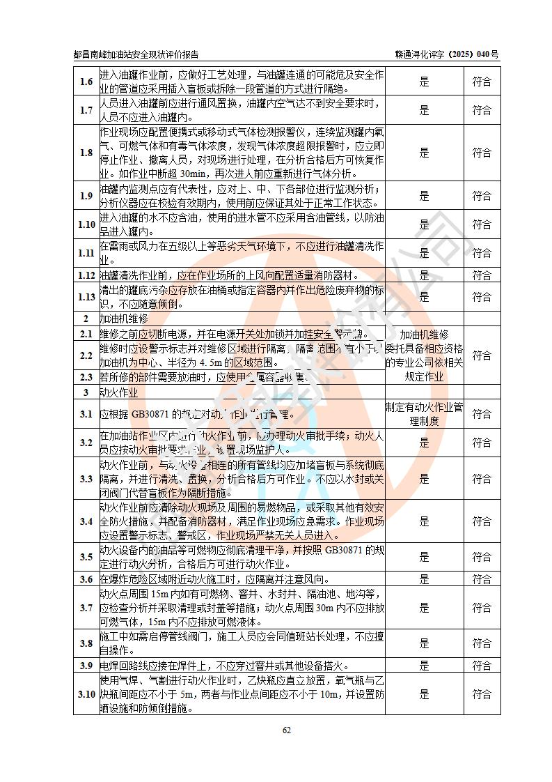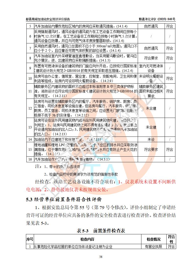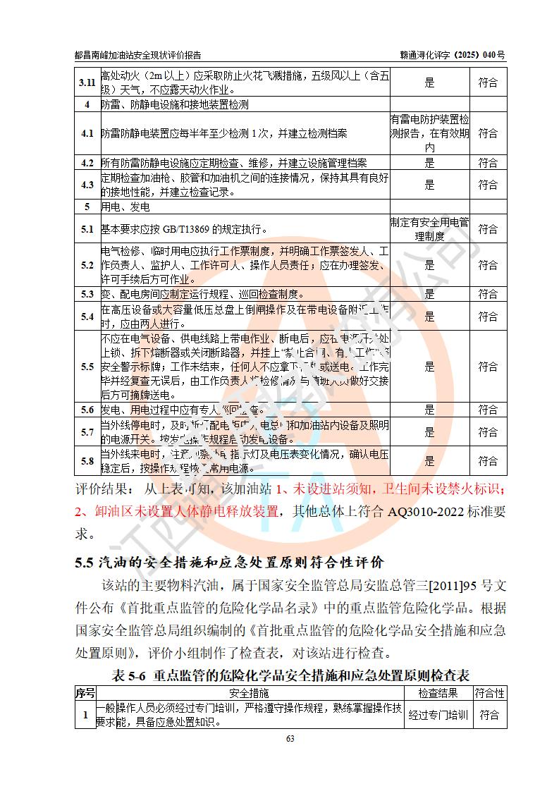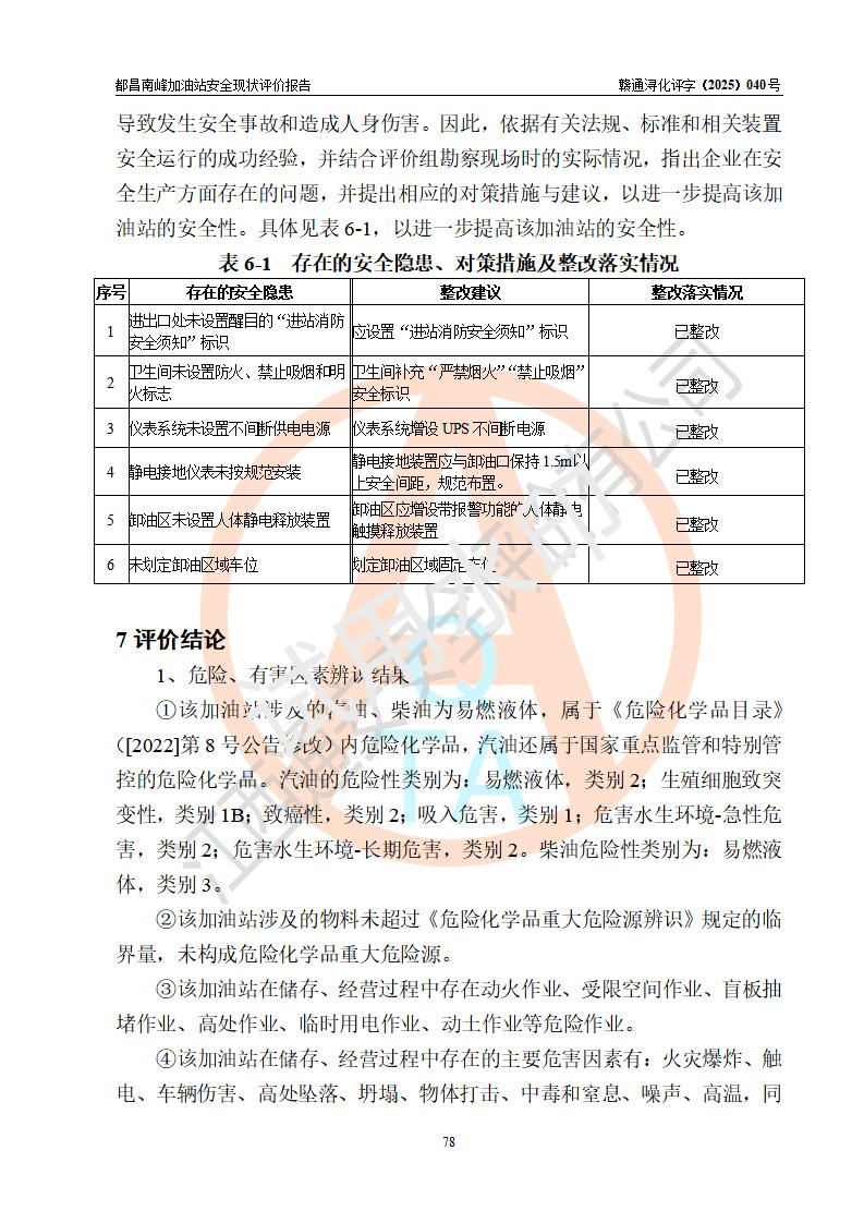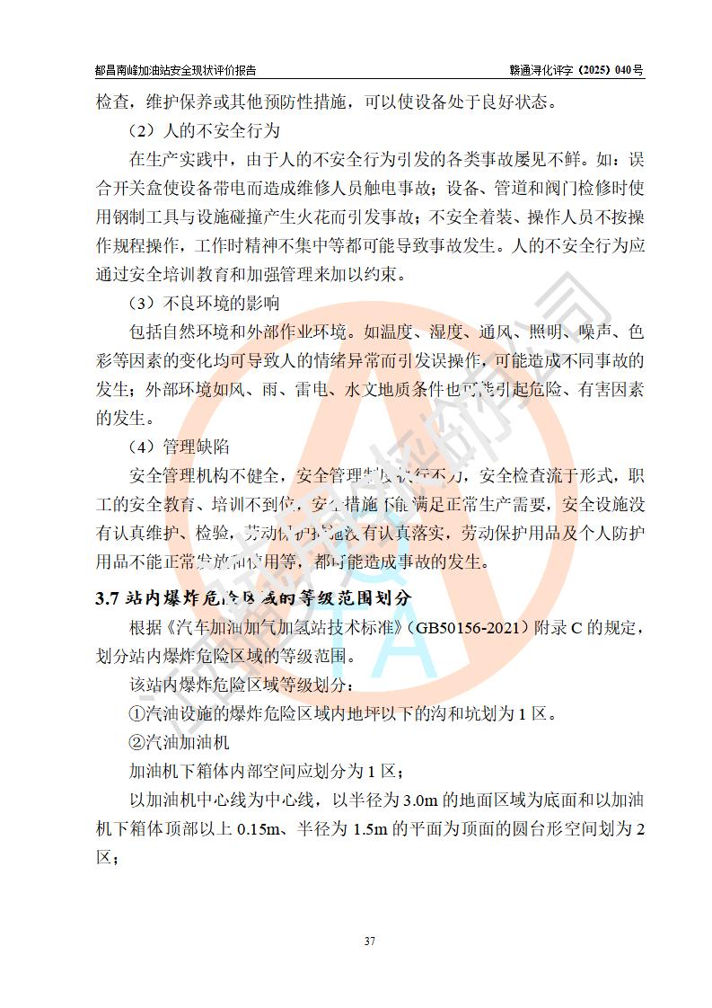 都昌南峰加油站是一家專門從事成品油零售經營的個人獨資企業(yè),投資人馮上生,經營場所位于都昌縣南峰鎮(zhèn)南峰街。該加油站現有從業(yè)人員4人,其中安全管理人員1人,主要負責人馮肖肖。 該加油站占地面積約520m2,站區(qū)內設置有2臺雙槍程控燃油加油機及配套的工藝管線、50m3雙層0#柴油儲罐1臺、30m3雙層92#汽油儲罐1臺、30m3雙層95#汽油儲罐1臺,油品儲罐總容積為110m3(折算成汽油為85m3),。按現行《汽車加油加氣加氫站技術標準》對加油站的等級劃分原則,該站屬于三級加油站。 該站由九江市行政審批局換發(fā)《危險化學品經營許可證》(證號:贛九行審經(甲)字[2022]000075號),**期限2022年06月24日至2025年06月23日。 |