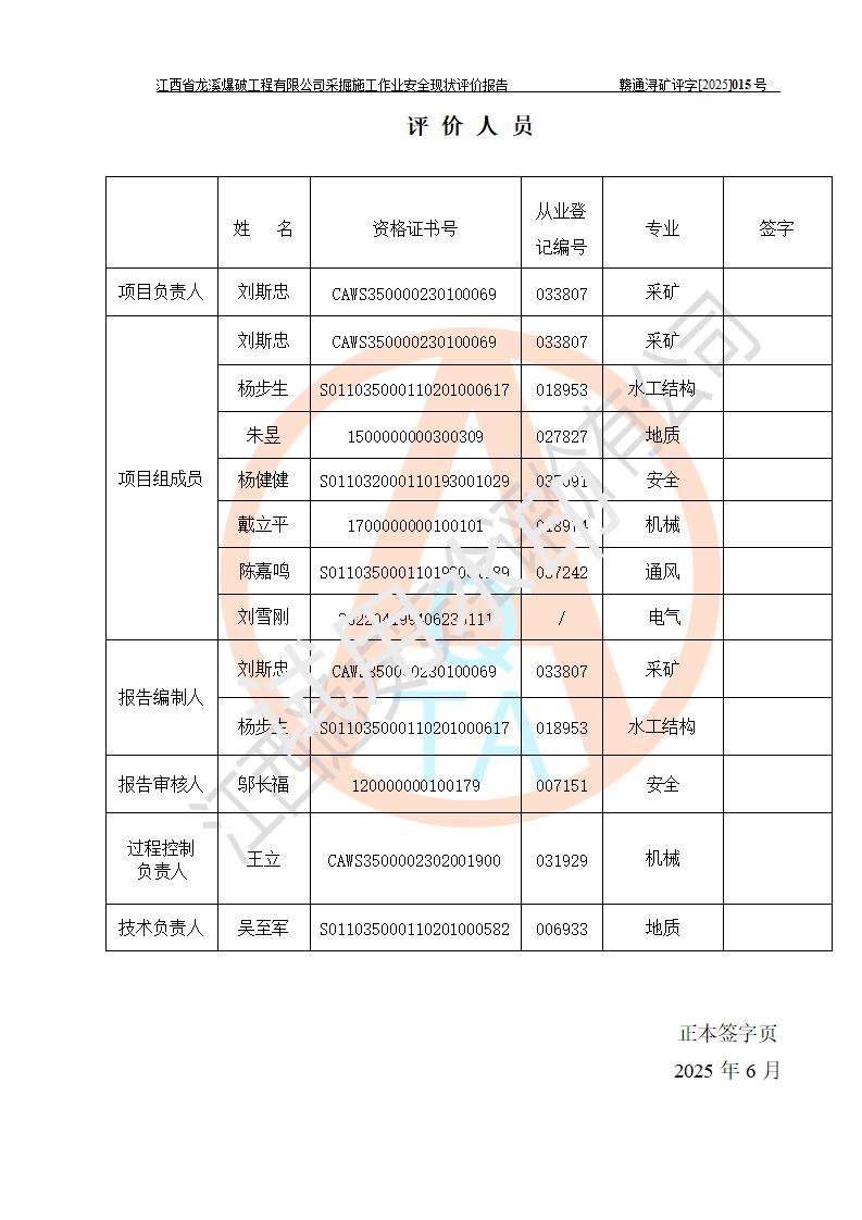 參與評(píng)價(jià)項(xiàng)目相關(guān)人員 | 姓名 | 資格證書(shū)號(hào) | 從業(yè)登記號(hào) | |