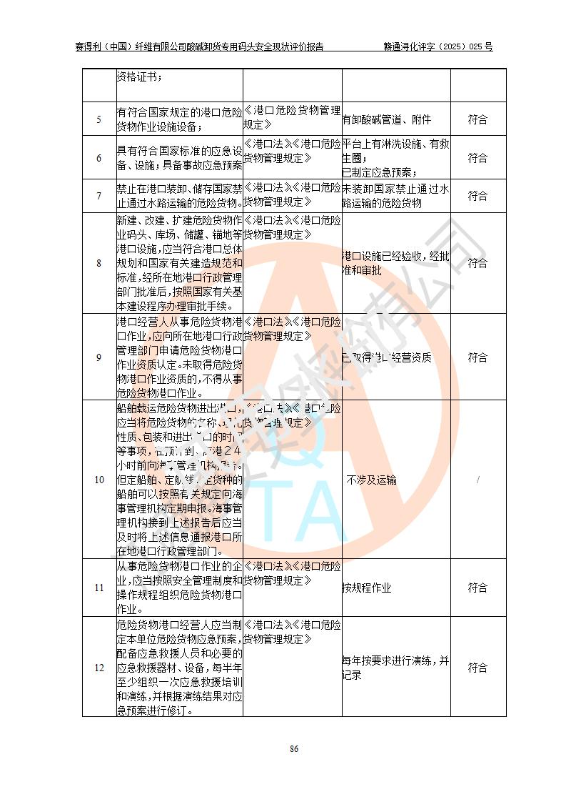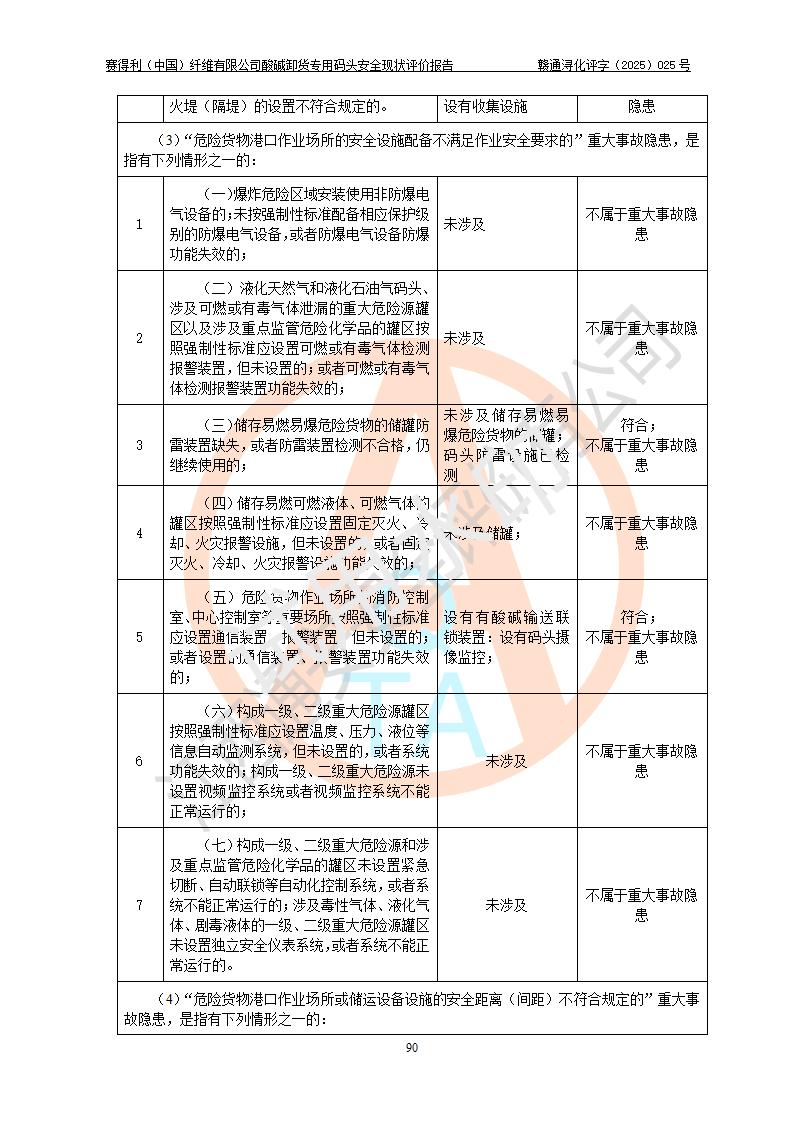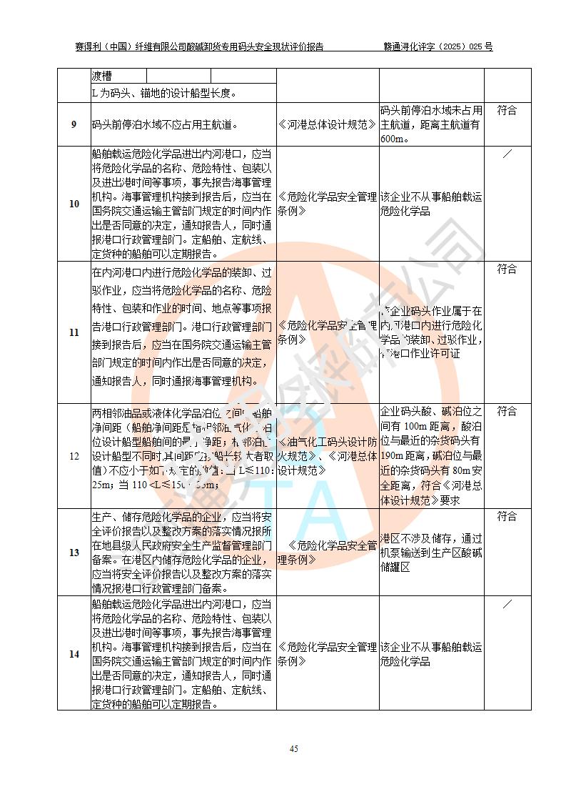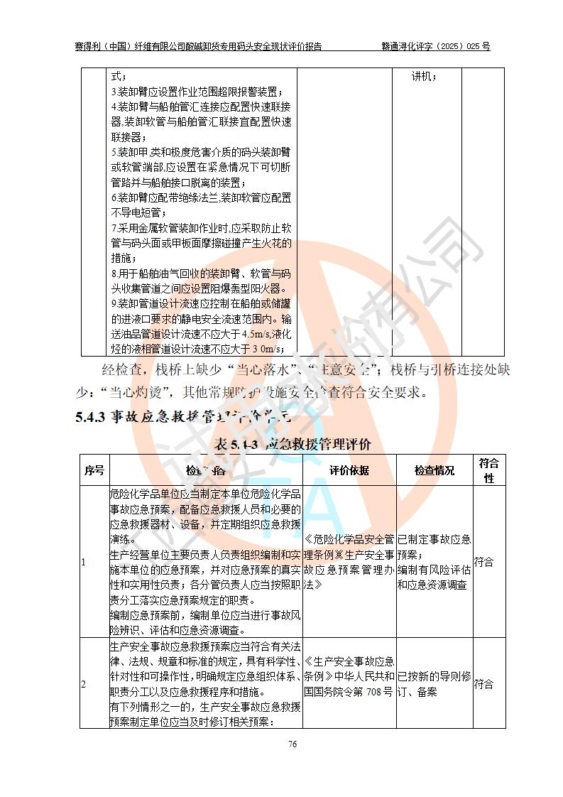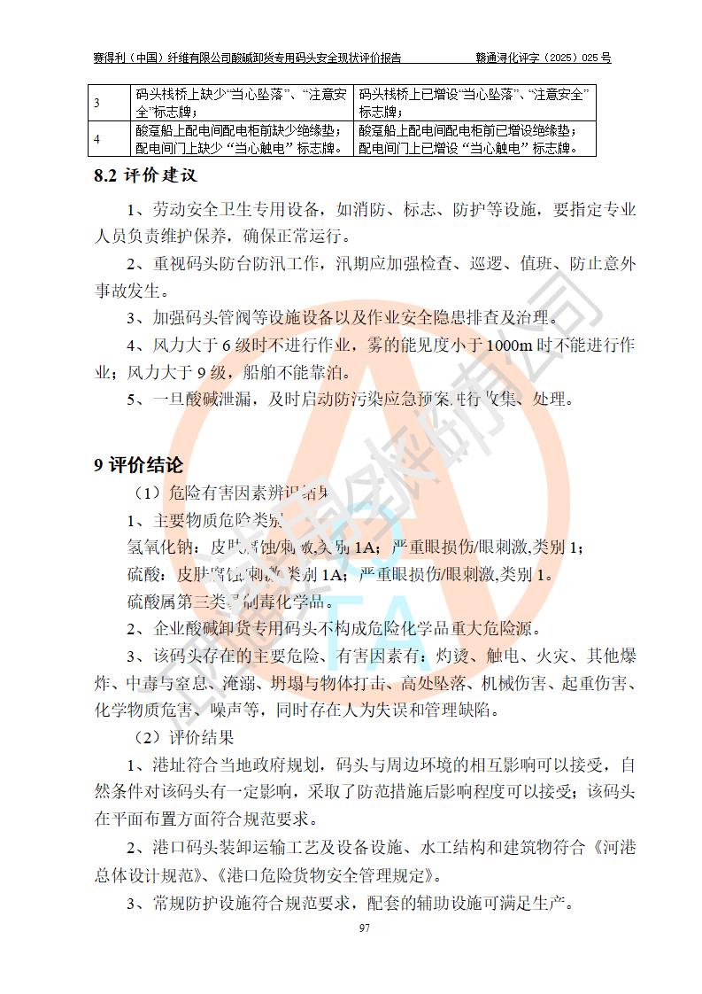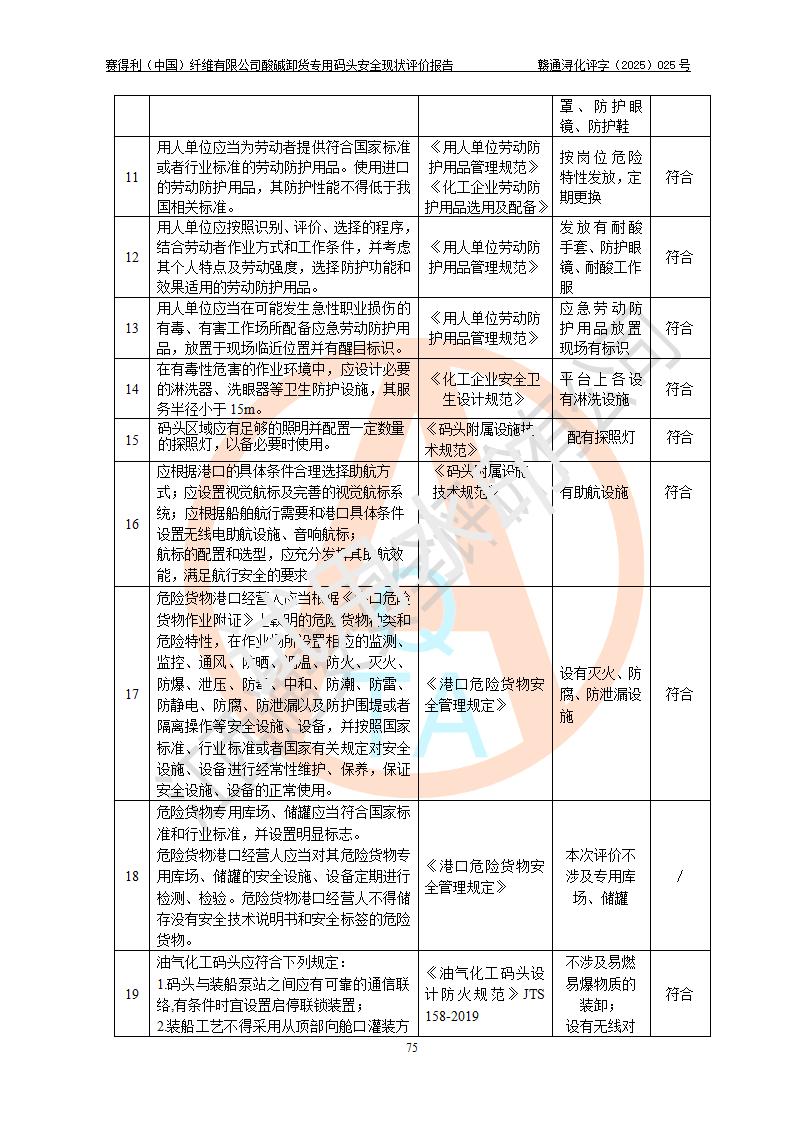 評價(jià)結(jié)論 | 經(jīng)評價(jià)組評價(jià),賽得利(中國)纖維有限公司酸堿卸貨**碼頭配套安全裝置、防護(hù)設(shè)施以及采取的安全管理措施符合**有關(guān)法規(guī)、標(biāo)準(zhǔn)、規(guī)范要求,符合《港口經(jīng)營管理規(guī)定》《港口危險(xiǎn)貨物安全管理規(guī)定》等規(guī)定的安全生產(chǎn)條件;酸堿卸貨**碼頭風(fēng)險(xiǎn)可控,可滿足危險(xiǎn)貨物港口作業(yè)的安全生產(chǎn)條件。 | |||||