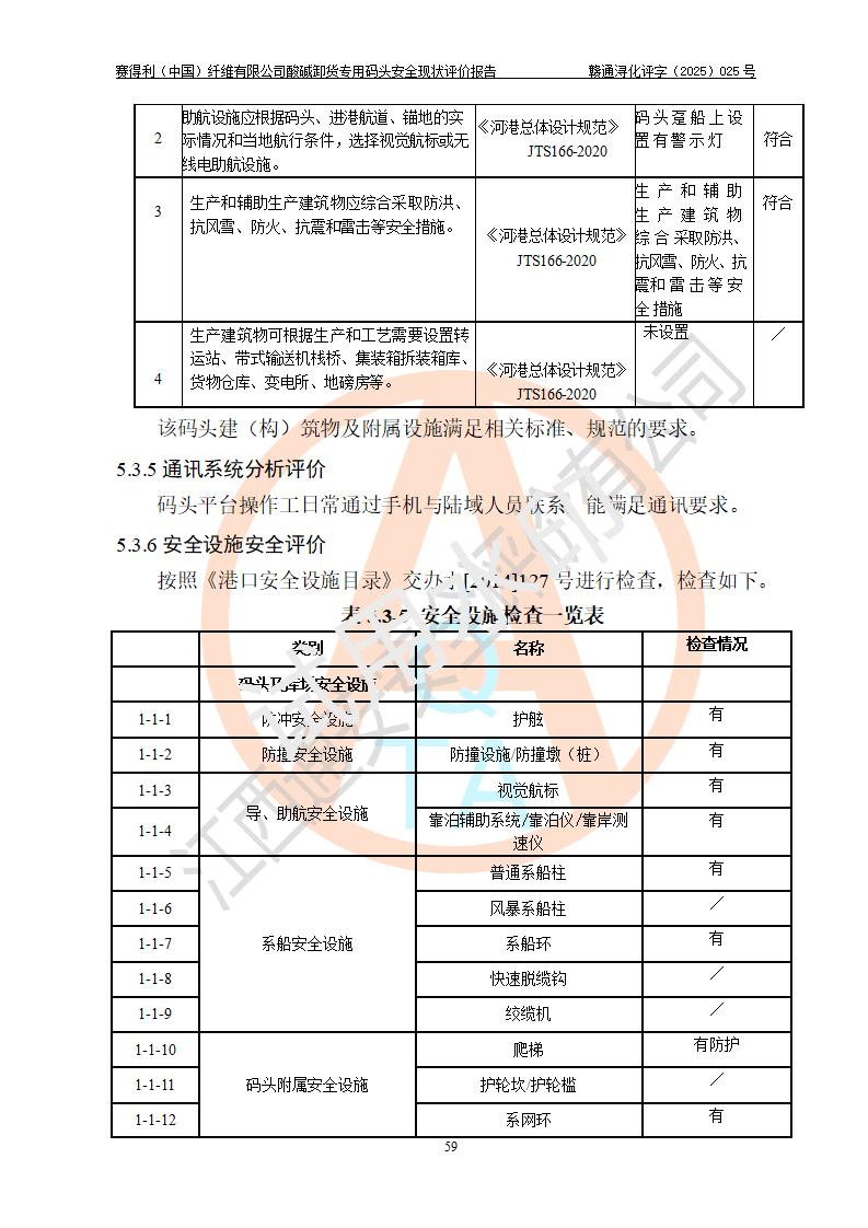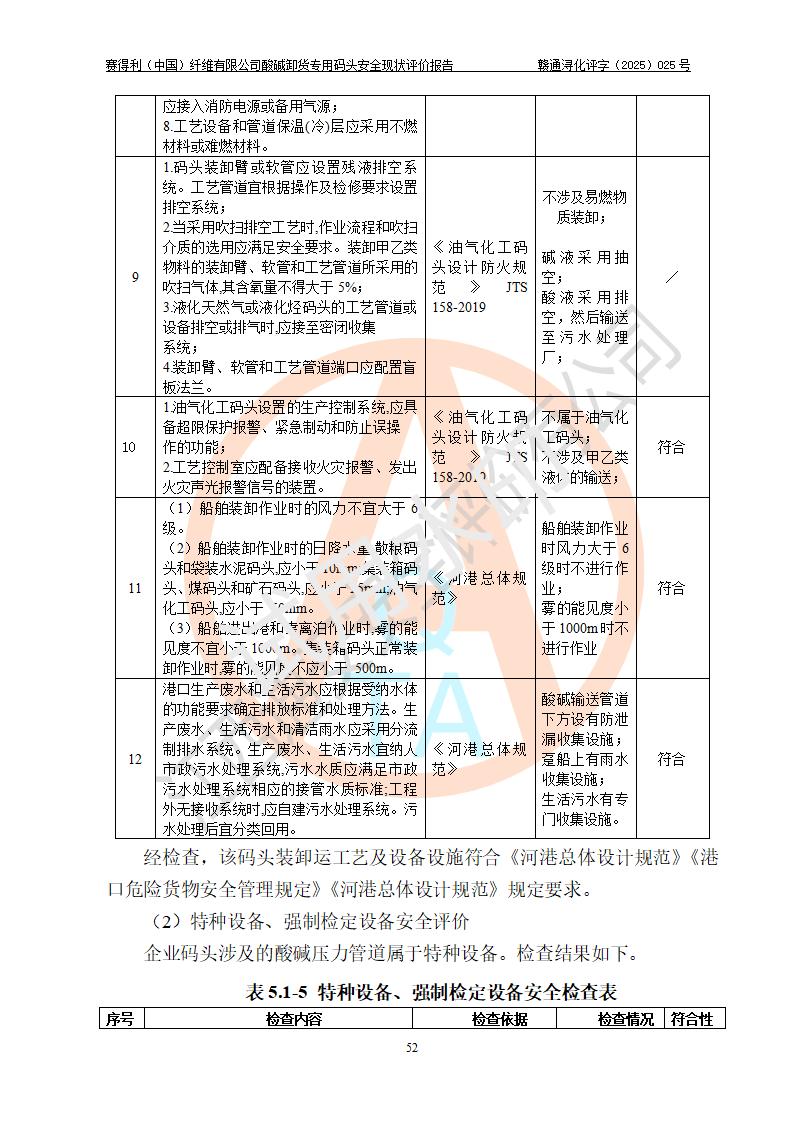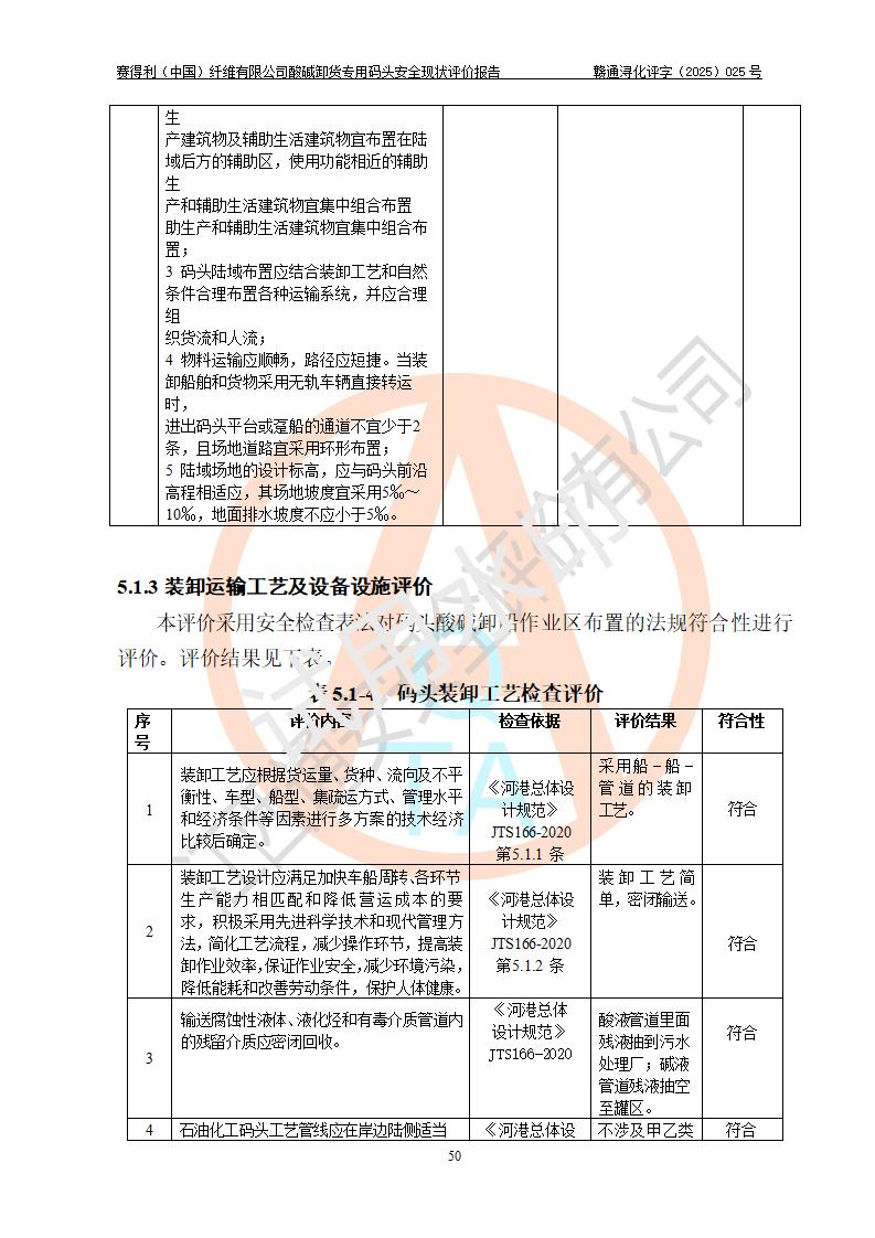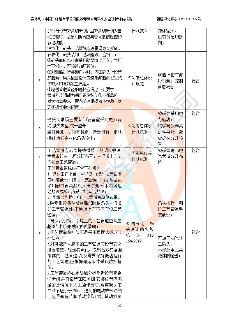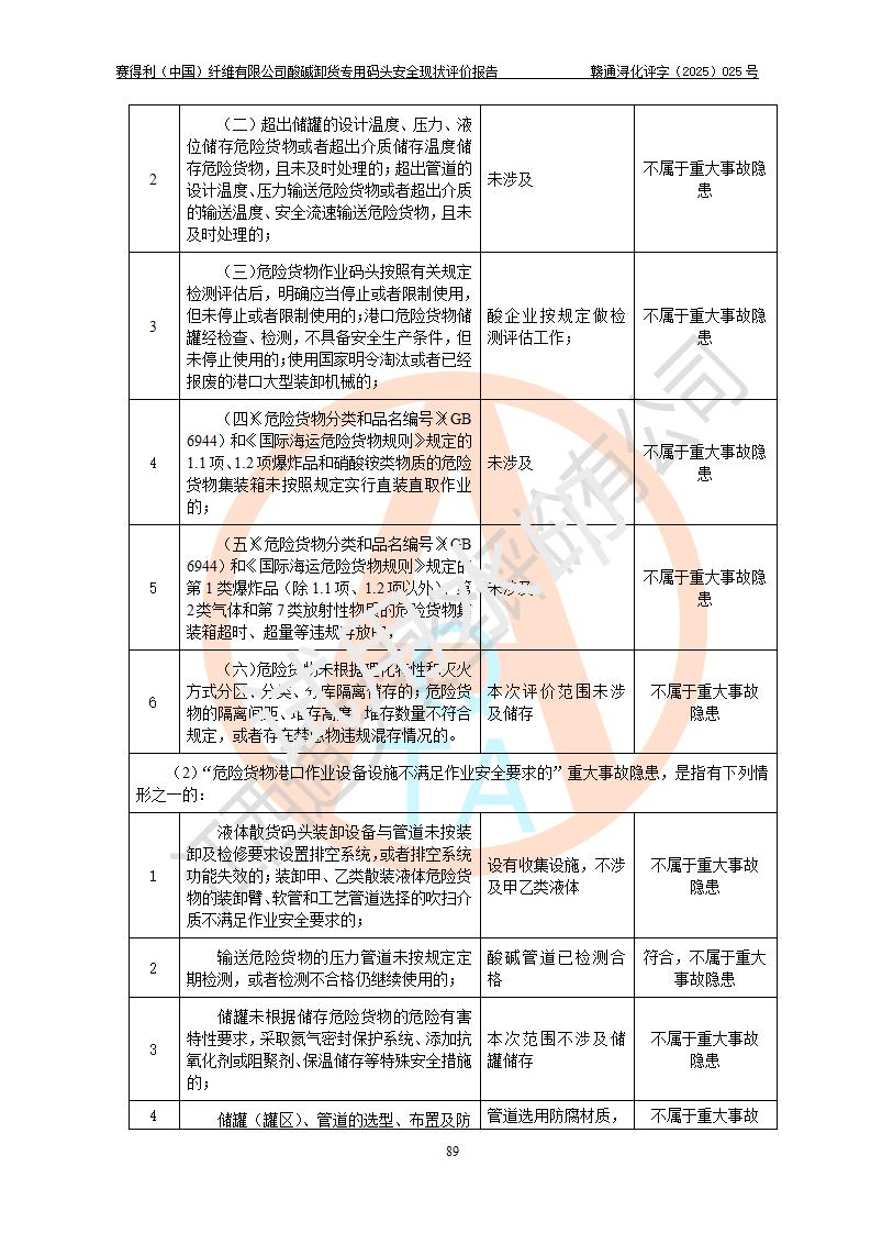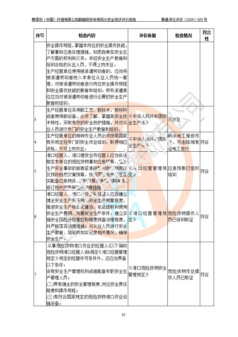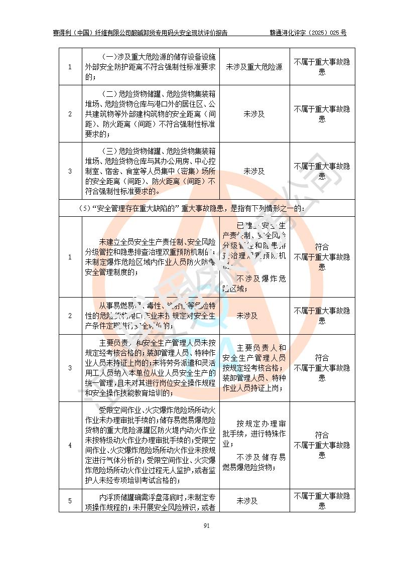 評價(jià)結(jié)論 | 經(jīng)評價(jià)組評價(jià),賽得利(中國)纖維有限公司酸堿卸貨**碼頭配套安全裝置、防護(hù)設(shè)施以及采取的安全管理措施符合**有關(guān)法規(guī)、標(biāo)準(zhǔn)、規(guī)范要求,符合《港口經(jīng)營管理規(guī)定》《港口危險(xiǎn)貨物安全管理規(guī)定》等規(guī)定的安全生產(chǎn)條件;酸堿卸貨**碼頭風(fēng)險(xiǎn)可控,可滿足危險(xiǎn)貨物港口作業(yè)的安全生產(chǎn)條件。 | |||||